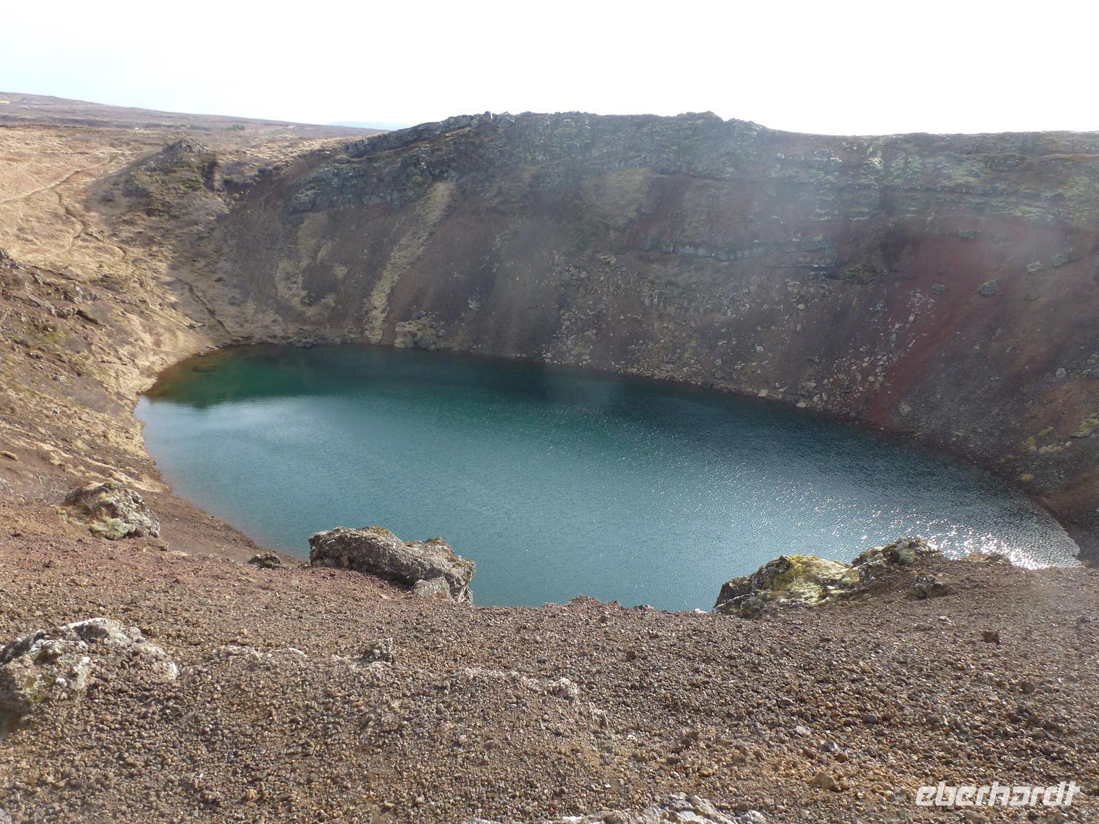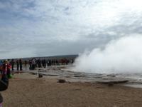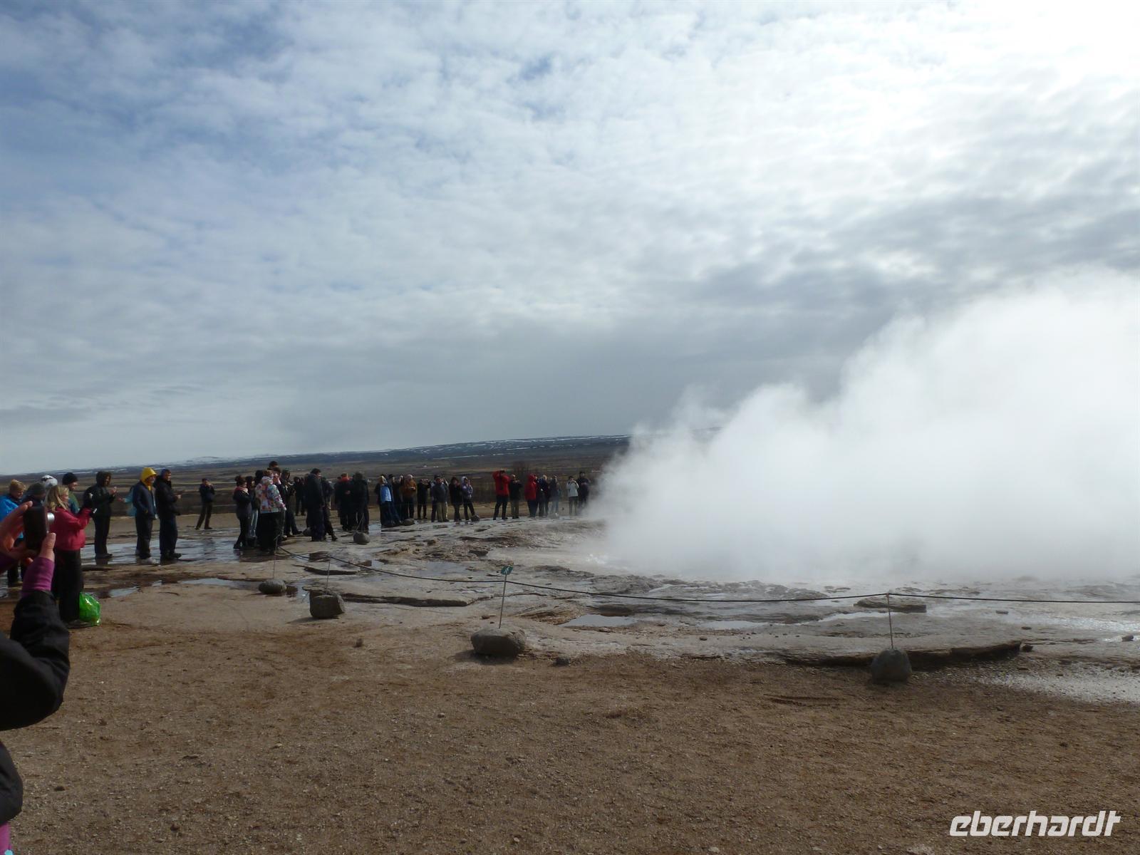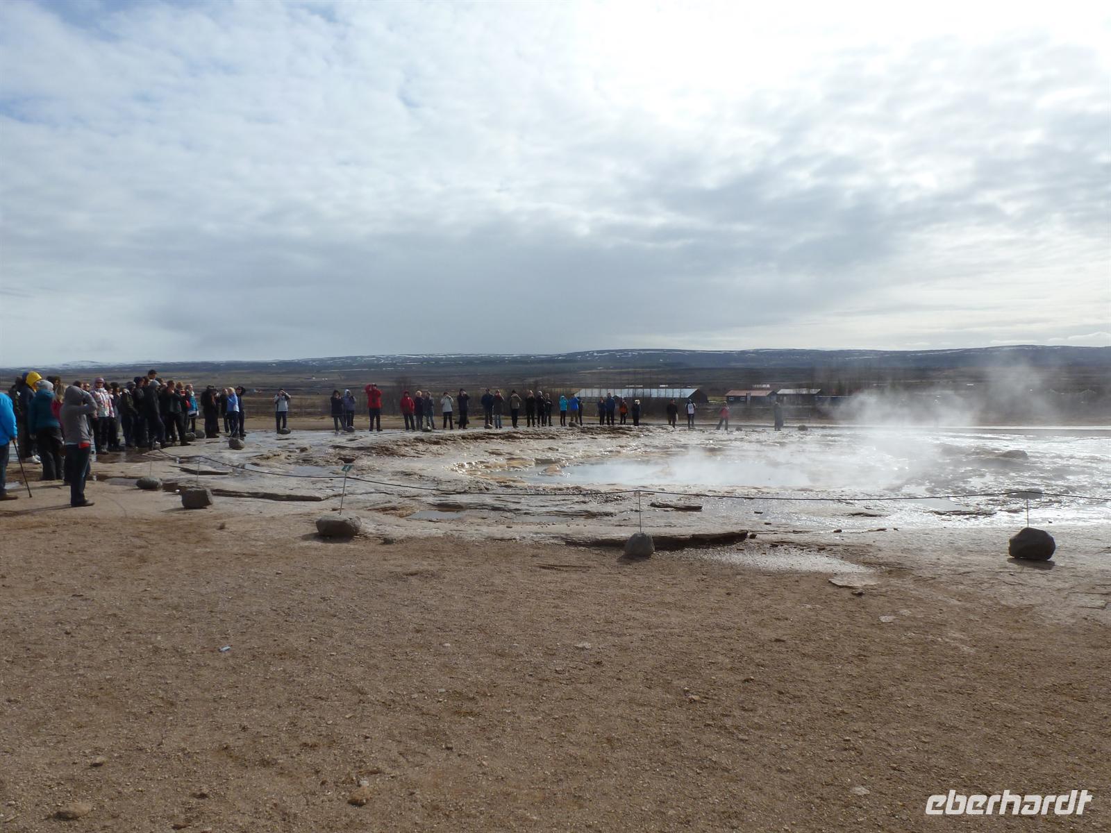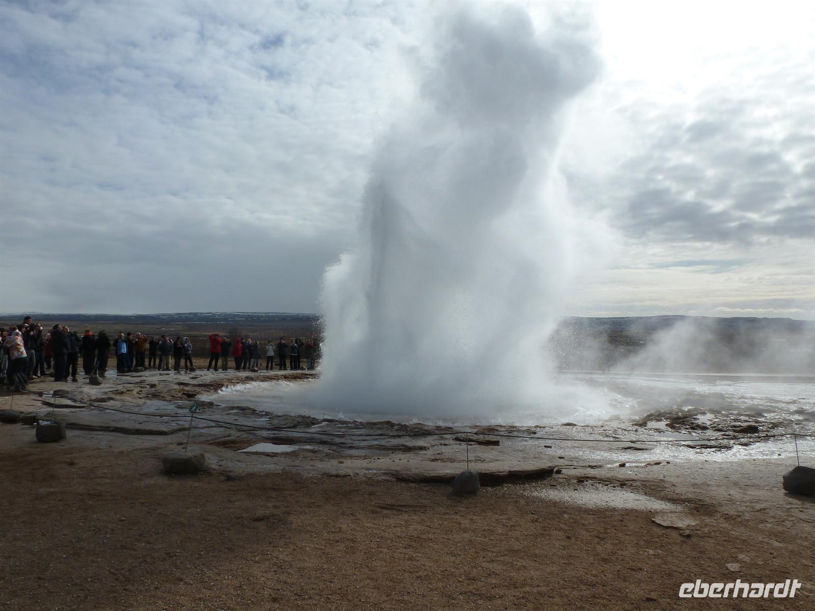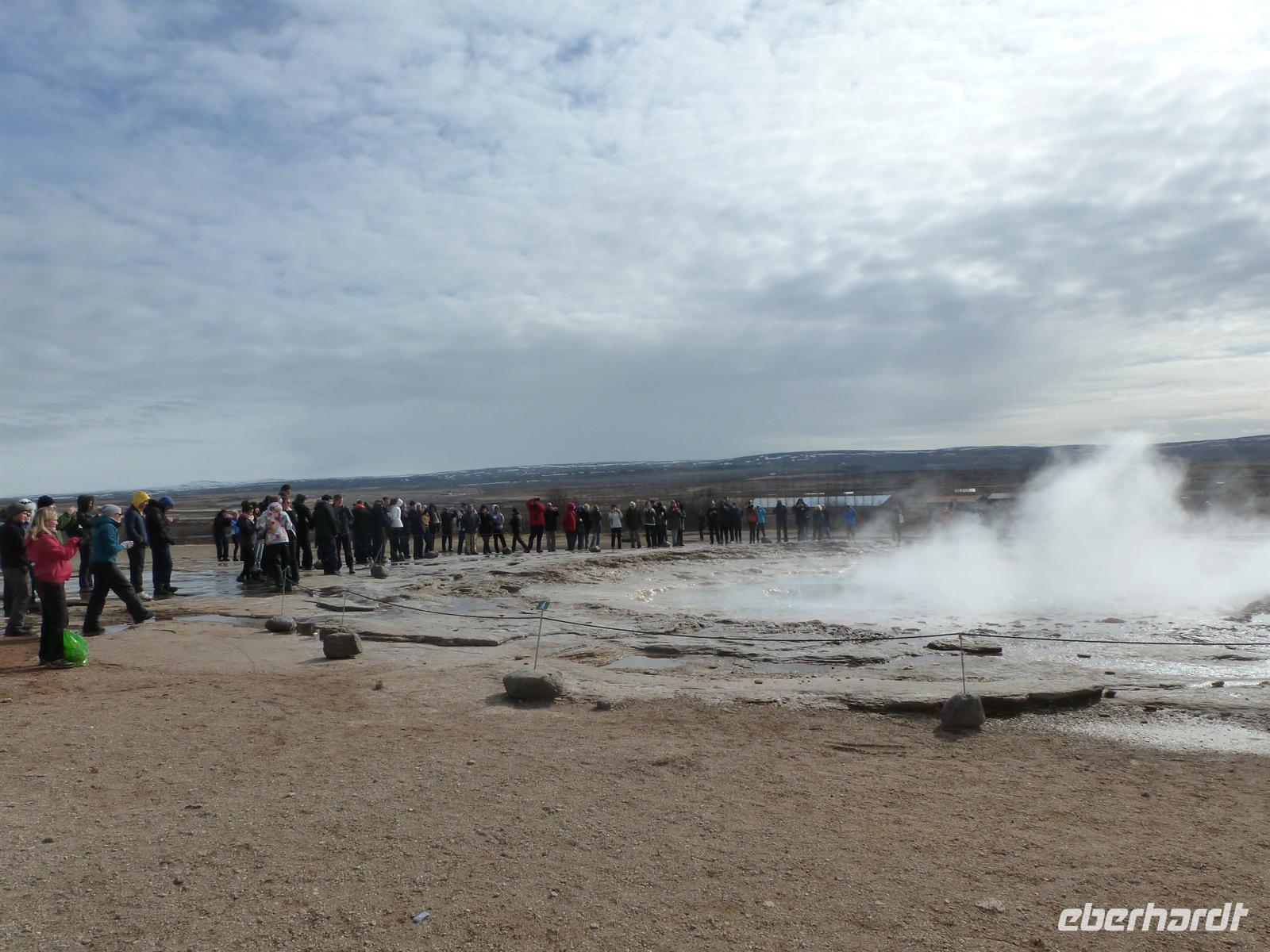 Der Donnerstag stand ganz im Zeichen des „Goldenen Kreis“. Vorher stoppten wir an einer künstlerischen Installation, Karlsminni, einer Gestaltung von Fels und Steinen in Bezugnahme auf die Tierkreiszeichen. Nach einen kurzen Stopp am Strand nahe von Eyrarbakki hielten wir am Kratersee Kerid. Im Geothermalgebiet Haukadalur konnten wir den Namensgeber aller Springquellen, den Geysir, sehen. Er hat sich momentan zur Ruhe gesetzt, dafür war sein kleiner Bruder, der Strokkur, umso aktiver. Den bestaunten wir und mit Geduld gelangen bei Sonnenschein schöne Fotos. Nun fuhren wir zum gewaltigen Wasserfall Gullfoss.