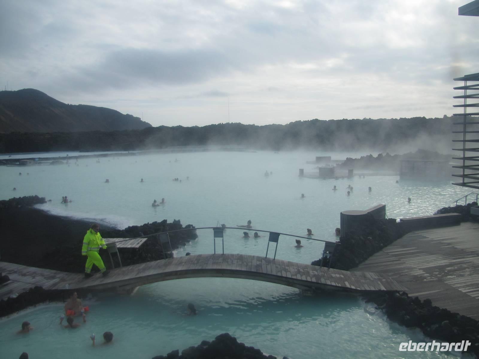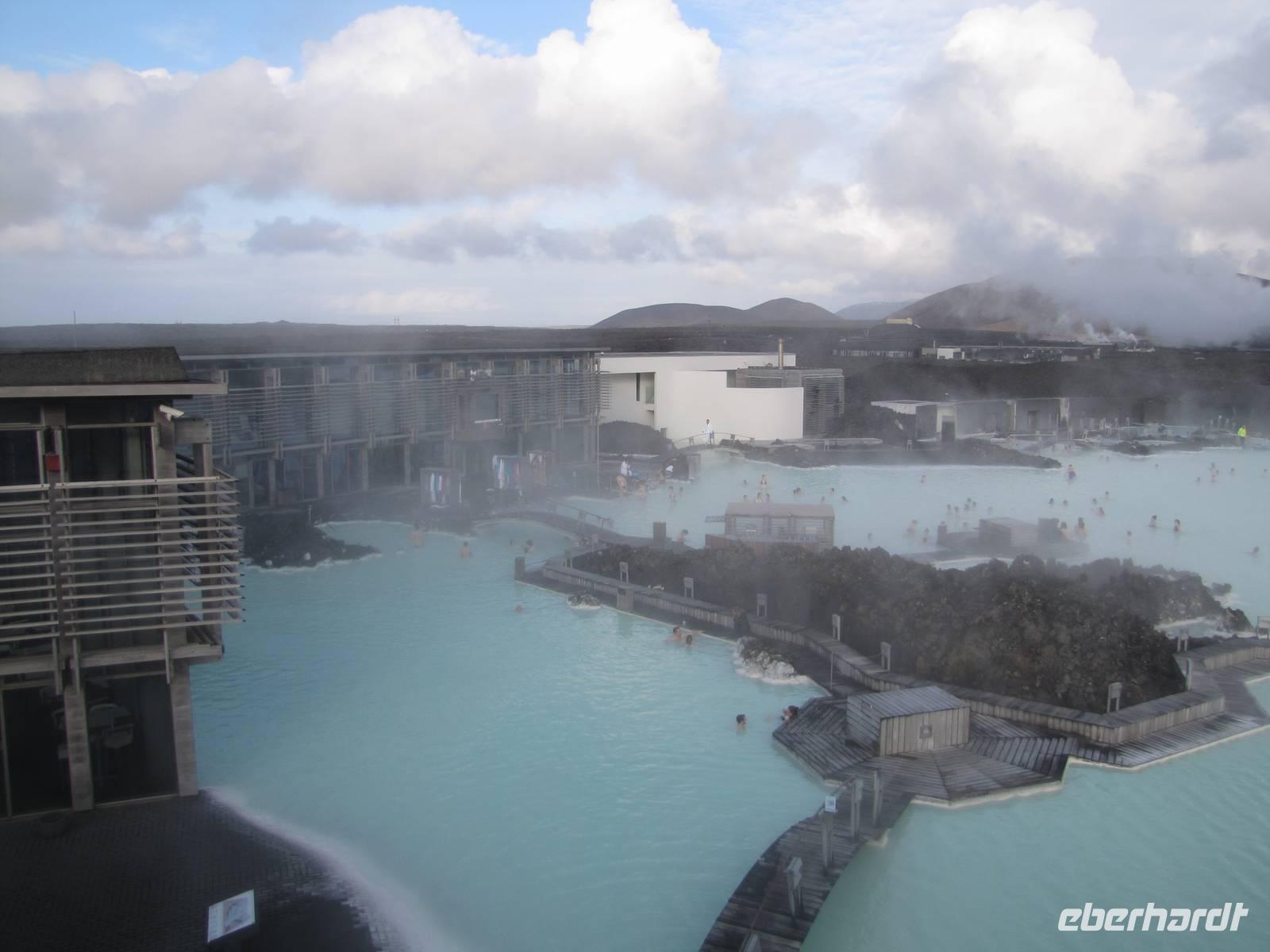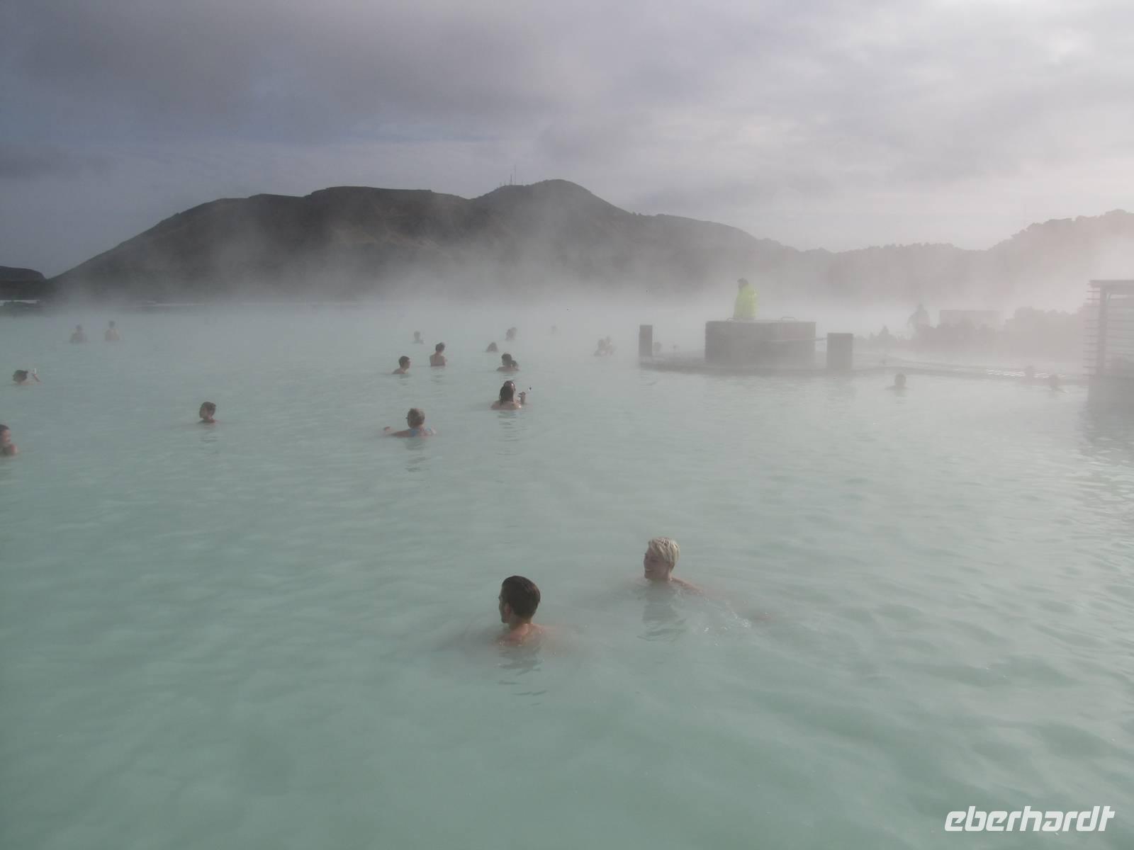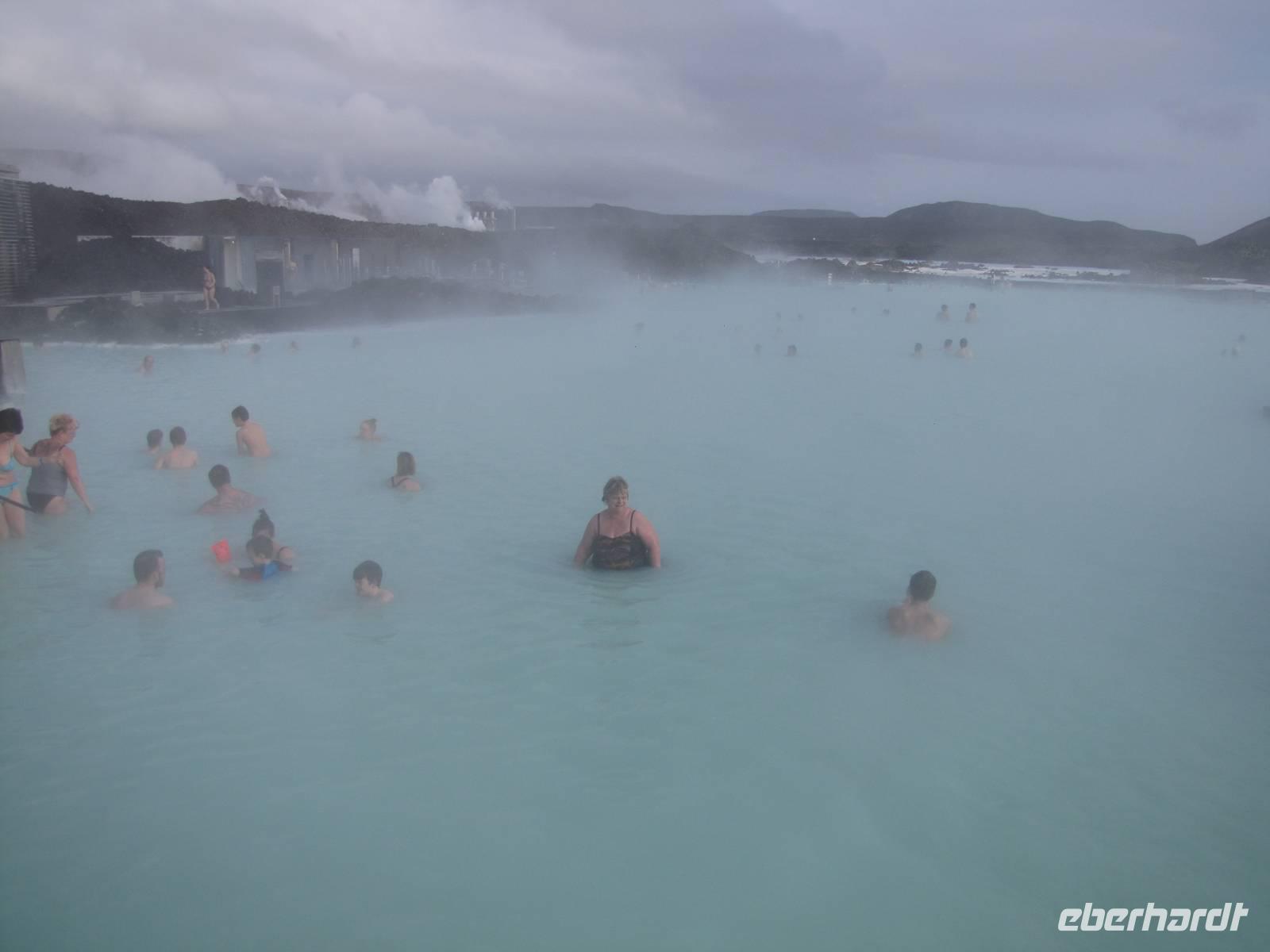 Anschließend besuchten wir die „Perlan", ein Warmwasserspeicher mit einer tollen Aussichtsplatform mit Blick über die ganze Stadt. Man konnte selbst die schneebedeckten Berge und die Umgebung von Reykjavik bestaunen. Danach ging es in Richtung Altstadt und Hafen, dort speisten einige von uns im Fischrestaurant „Seabaron". Viele von uns aßen zum ersten Mal in ihrem Leben Walfleisch. Nach einer leckeren Mittagspause fuhren wir in Richtung Blaue Lagune. Dort konnten wir in heißen Quellen baden und uns im Gesicht mit „Heilschlamm" einschmieren. Das Wetter wurde immer besser und die Regenwolken wurden ersetzt durch warme Sonnenstrahlen. Nach ca. 2 Stunden im warmen Wasser fühlten wir uns deutlich jünger, ganz wie Rosa es vorher erzählt hatte.