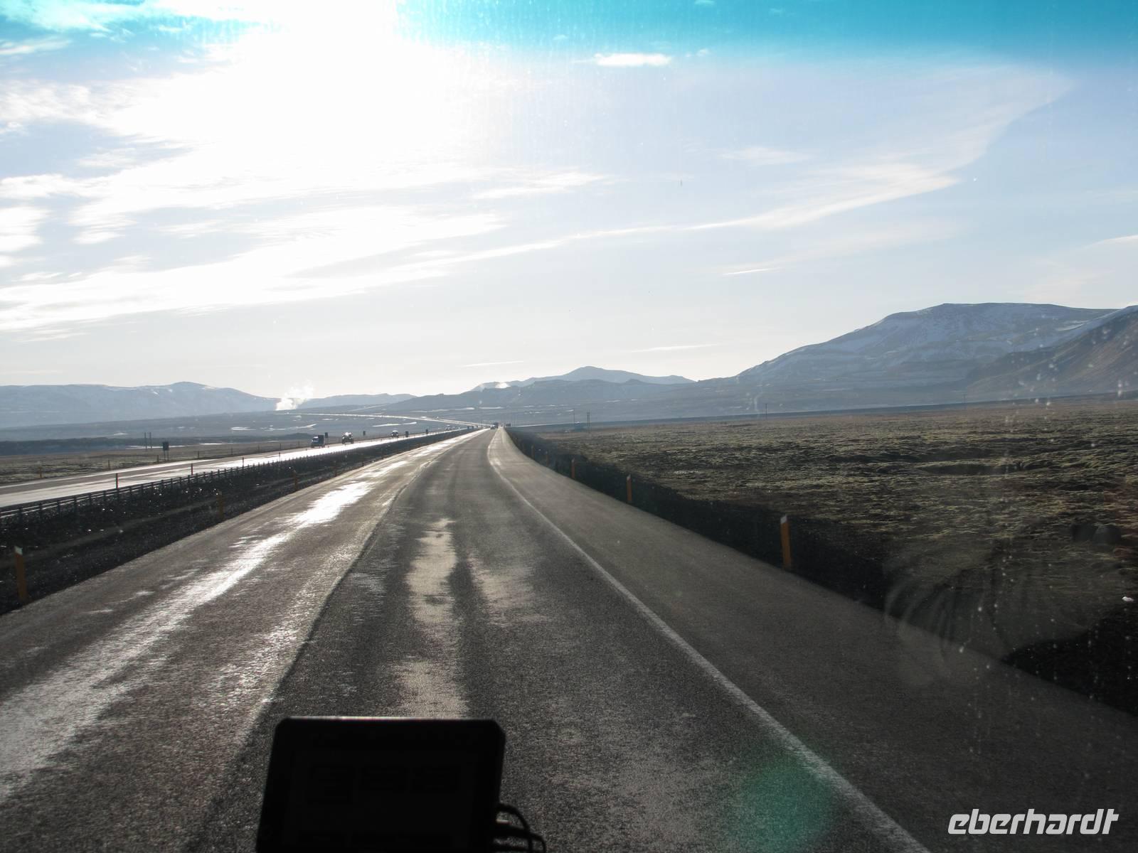 In Island angekommen erwartete uns schon unsere Reiseleiterin Rosa. Mit Ihr fuhren wir in Richtung Hotel Natur ca. 40min. Nachts war noch leichter Regen, der im Laufe des nächsten Tages jedoch abnahm.
