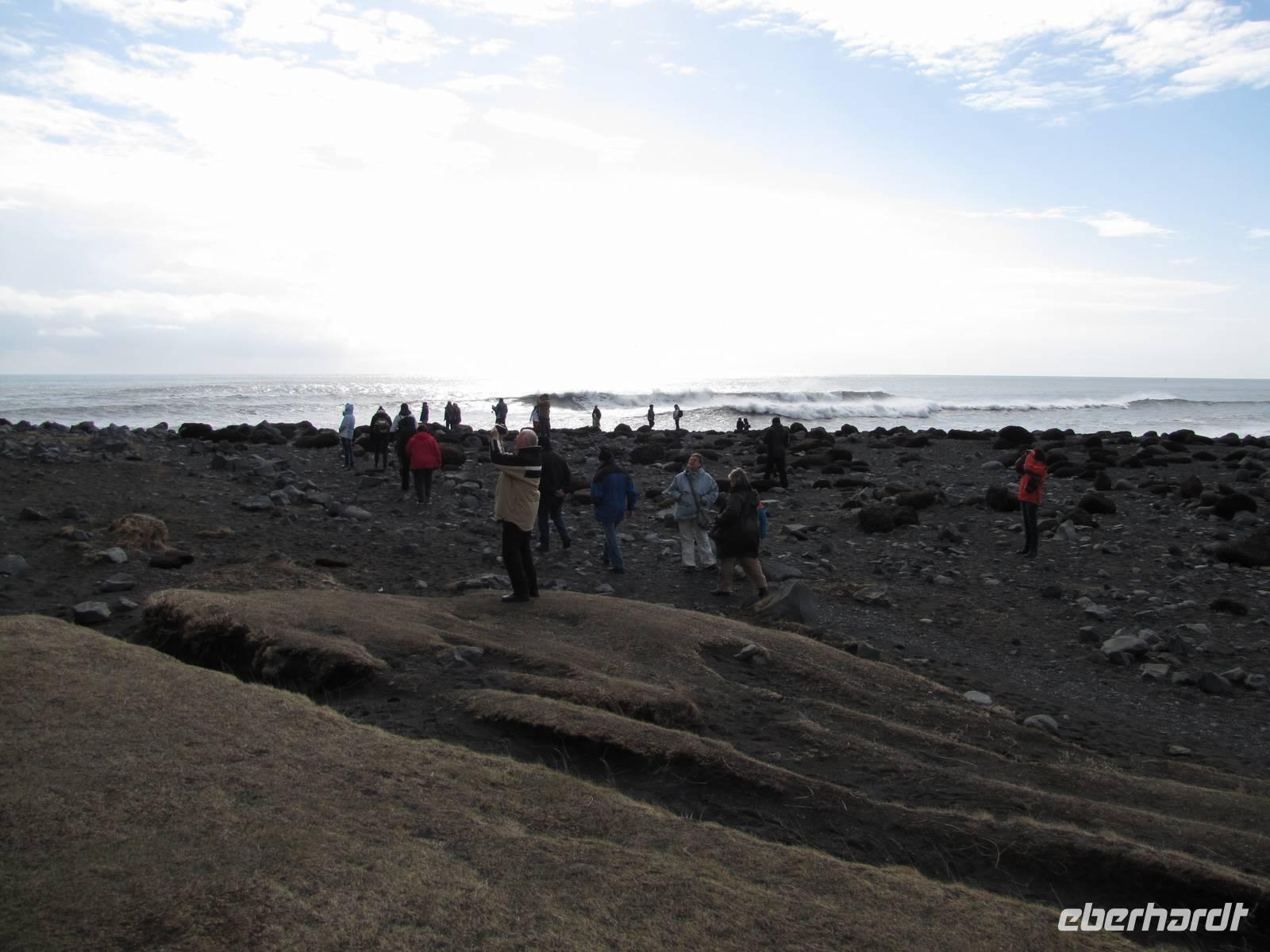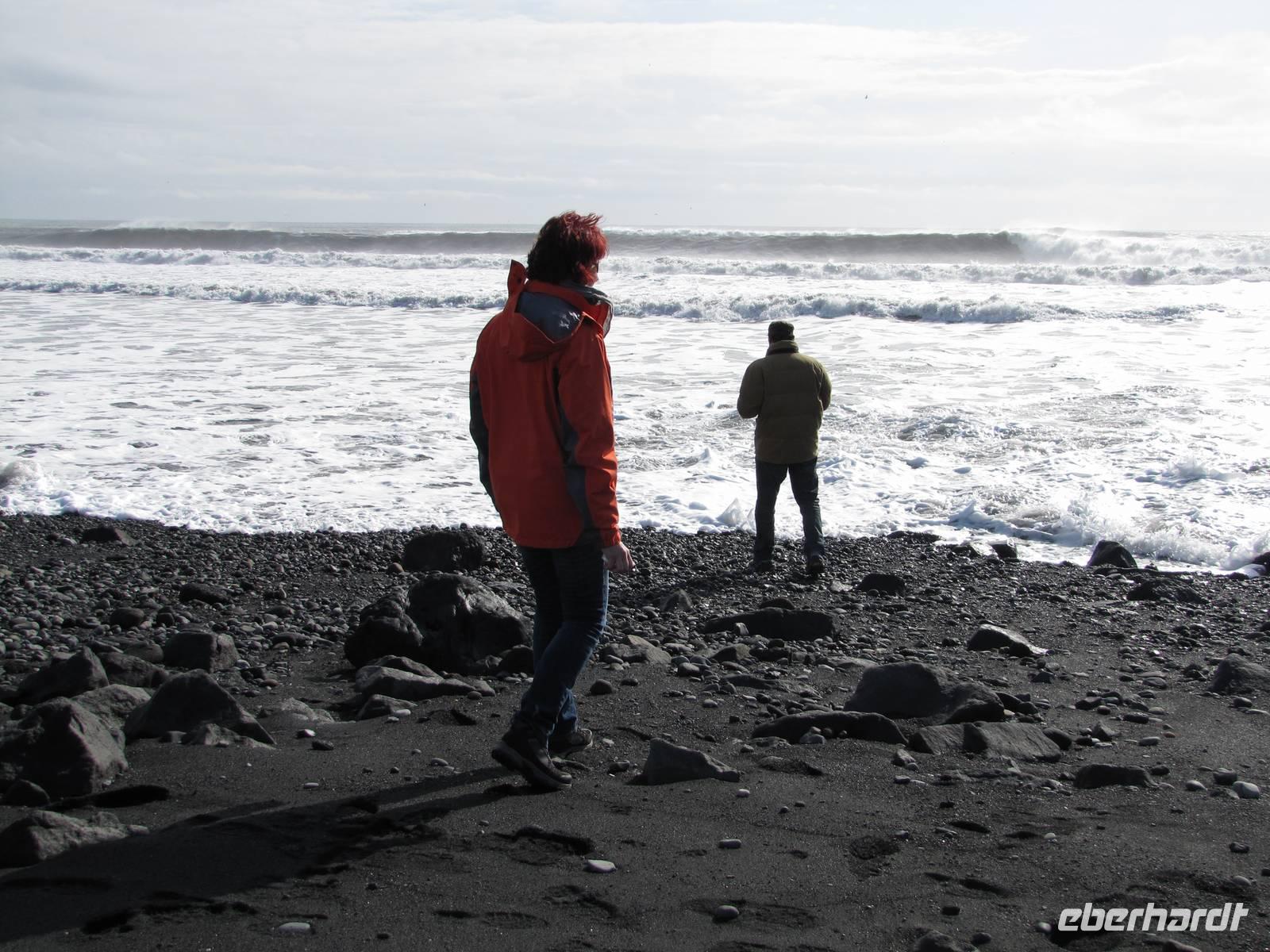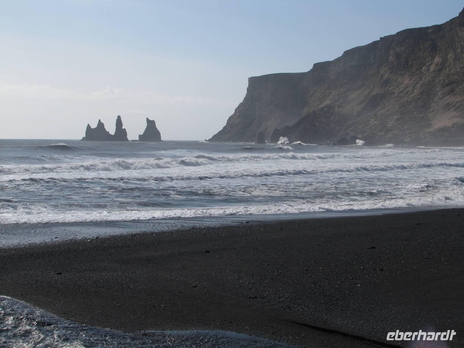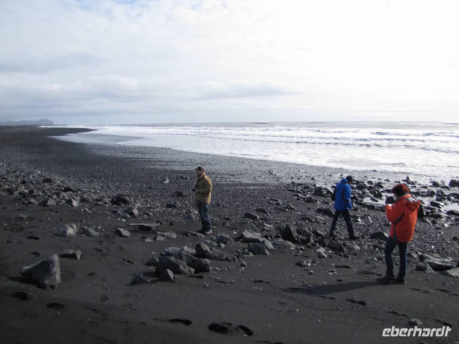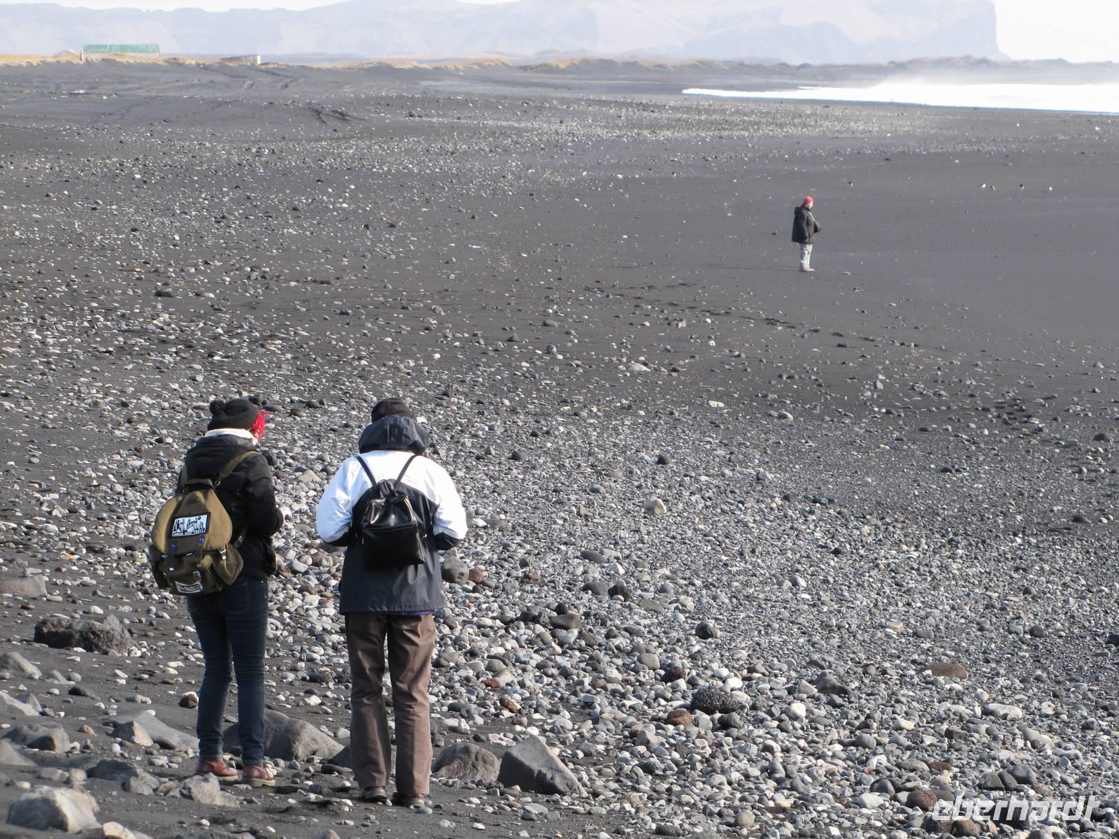 Zur Mittagspause hielten wir in Vik, einem kleinen Dorf direkt am Meer. Wir spazierten ca. 5min. zum schwarzen Sandstrand und blickten in südliche Richtung auf das Meer und auf den Golfstrom. Der Strand zählt laut einer amerikanischen Zeitschrift mit zu den schönsten Sandstränden der Welt. Wenn man hinter sich schaute konnte man die schneeweißen Berge sehen und vor sich die frische Meeresluft genießen, welch abwechslungsreiche Natur!