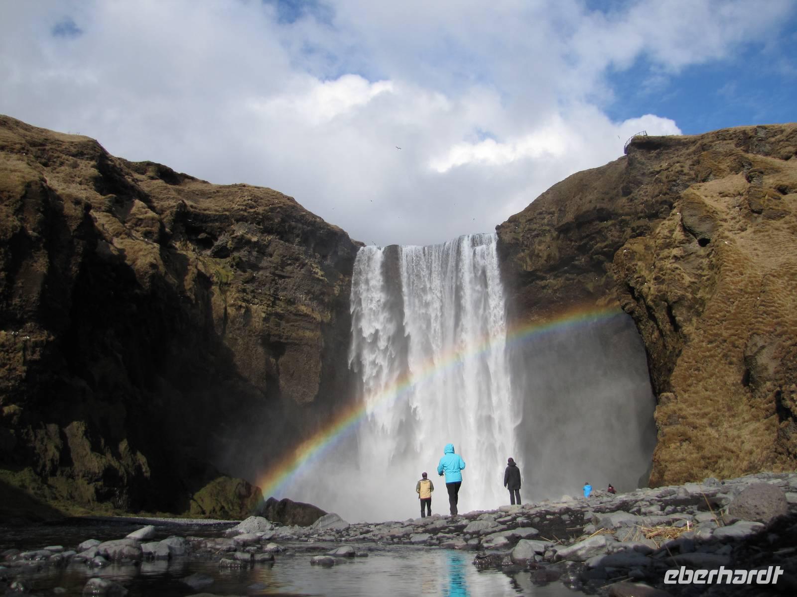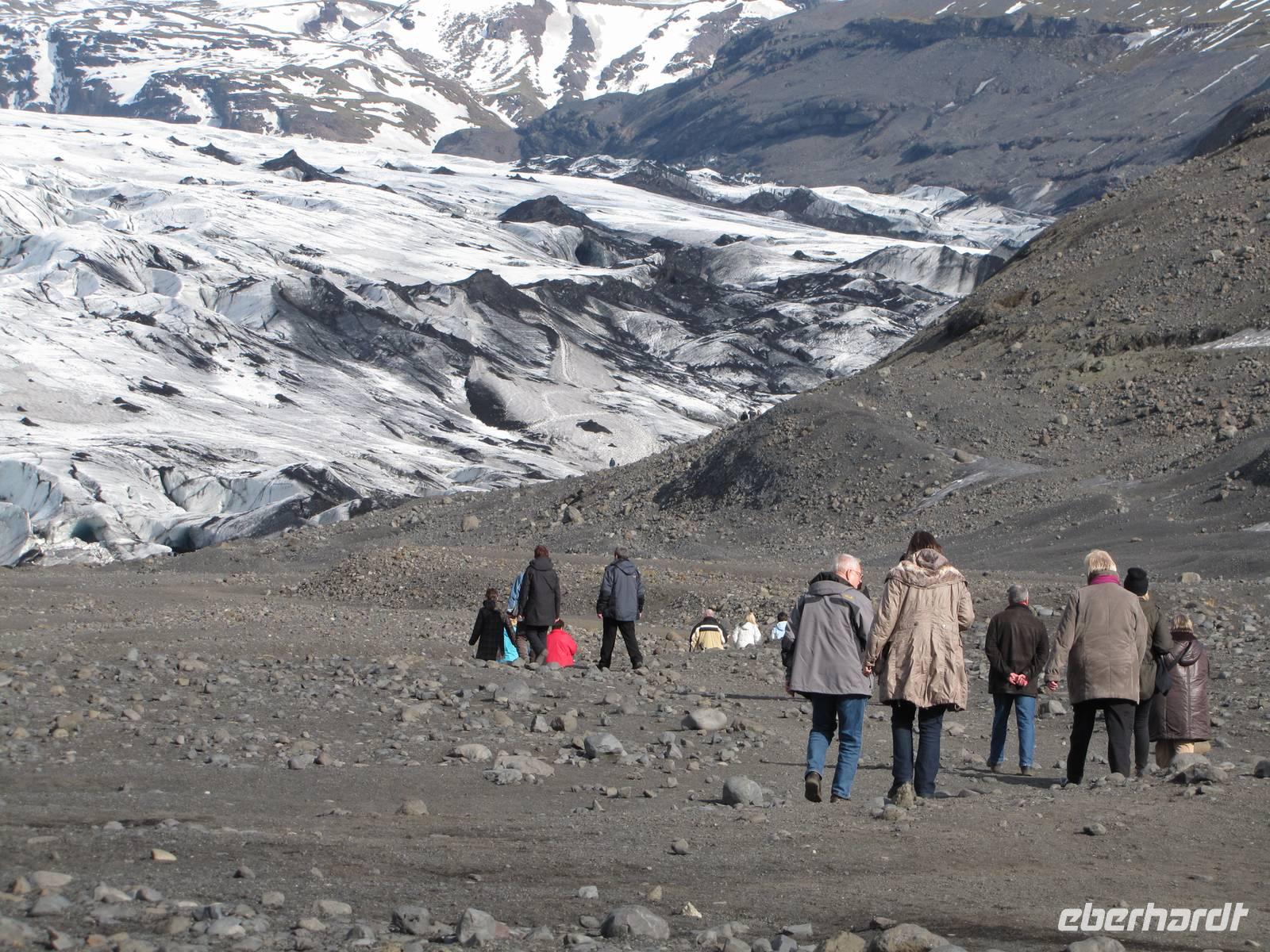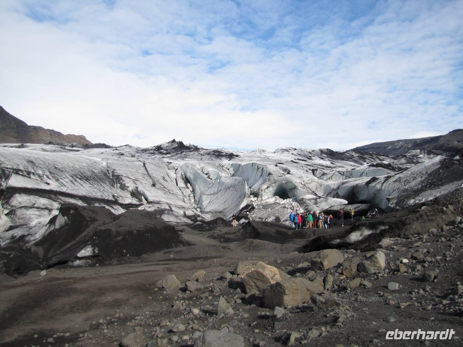 Nach der einstündigen Pause fuhren wir zum ersten großen Wasserfall. Die Fotomotive wurden immer besser als ein bunter Regenbogen sich vor dem Wasserfall auftürmte. Es war wie im Bilderbuch und teilweiße waren es in der Sonne sogar bis zu 15 Grad. Das nächste Highlight wartete nicht lange als wir zum Gletscher Solheimajökull fuhren. Wir spazierten ca. 20min zur Gletscherzunge und schossen ein weiteres tolles Gruppenfoto. Wir sahen wie auch auf Island das Gletschereis vor sich her schmilz. Rosa erzählte uns dass der Gletscher vor über 10 Jahren fast doppelt so groß gewesen sei. Leider war viel vom Gletscher mit grauer Vulkanasche vereint so dass der Fuß der Gletscherzunge stark mit grauem Schlamm verdeckt war. Wenn man jedoch etwas weiter hinein lief konnte man das blaue Eis sehen und fühlen. Zurück ging es wieder mit dem Bus über die Holperpiste, wo man stets anderen Fahrzeugen vorsichtig ausweichen musste. Auf der Heimfahrt besichtigten wir noch einen Wasserfall, bevor es wieder zurück zum Hotel ging. Abends konnte jeder individuell Essen gehen oder mit mir mitkommen in die Innenstadt von Reykjavik. Unser Bus fuhr uns bis zu einem der besten Restaurants der Stadt, wo selbst schon Tom Cruise gegessen haben soll. Wir aßen Fisch oder Lammfleisch und tranken isländisches Bier. Rückzu liefen wir in der Abendsonne von Reykjavik zurück zum Hotel.