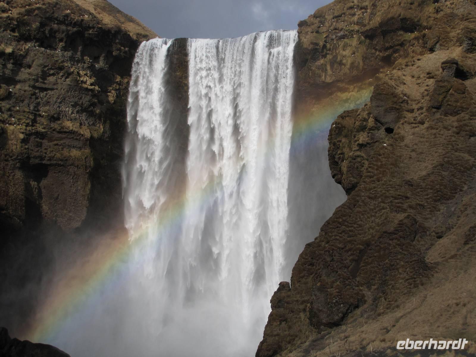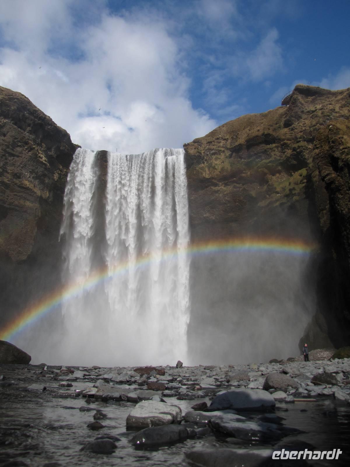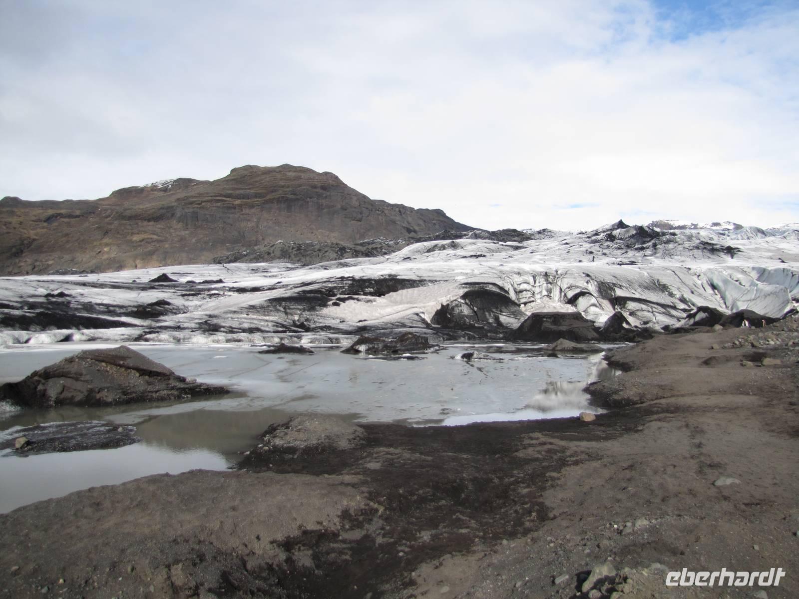 Nach der einstündigen Pause fuhren wir zum ersten großen Wasserfall. Die Fotomotive wurden immer besser als ein bunter Regenbogen sich vor dem Wasserfall auftürmte. Es war wie im Bilderbuch und teilweiße waren es in der Sonne sogar bis zu 15 Grad. Das nächste Highlight wartete nicht lange als wir zum Gletscher Solheimajökull fuhren. Wir spazierten ca. 20min zur Gletscherzunge und schossen ein weiteres tolles Gruppenfoto. Wir sahen wie auch auf Island das Gletschereis vor sich her schmilz. Rosa erzählte uns dass der Gletscher vor über 10 Jahren fast doppelt so groß gewesen sei. Leider war viel vom Gletscher mit grauer Vulkanasche vereint so dass der Fuß der Gletscherzunge stark mit grauem Schlamm verdeckt war. Wenn man jedoch etwas weiter hinein lief konnte man das blaue Eis sehen und fühlen. Zurück ging es wieder mit dem Bus über die Holperpiste, wo man stets anderen Fahrzeugen vorsichtig ausweichen musste. Auf der Heimfahrt besichtigten wir noch einen Wasserfall, bevor es wieder zurück zum Hotel ging. Abends konnte jeder individuell Essen gehen oder mit mir mitkommen in die Innenstadt von Reykjavik. Unser Bus fuhr uns bis zu einem der besten Restaurants der Stadt, wo selbst schon Tom Cruise gegessen haben soll. Wir aßen Fisch oder Lammfleisch und tranken isländisches Bier. Rückzu liefen wir in der Abendsonne von Reykjavik zurück zum Hotel.