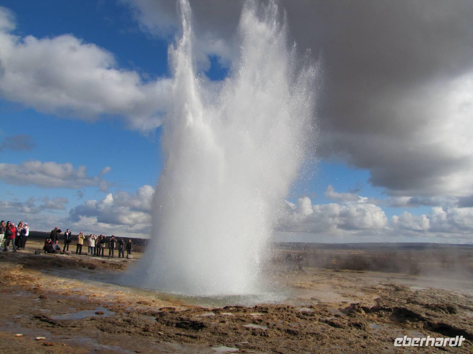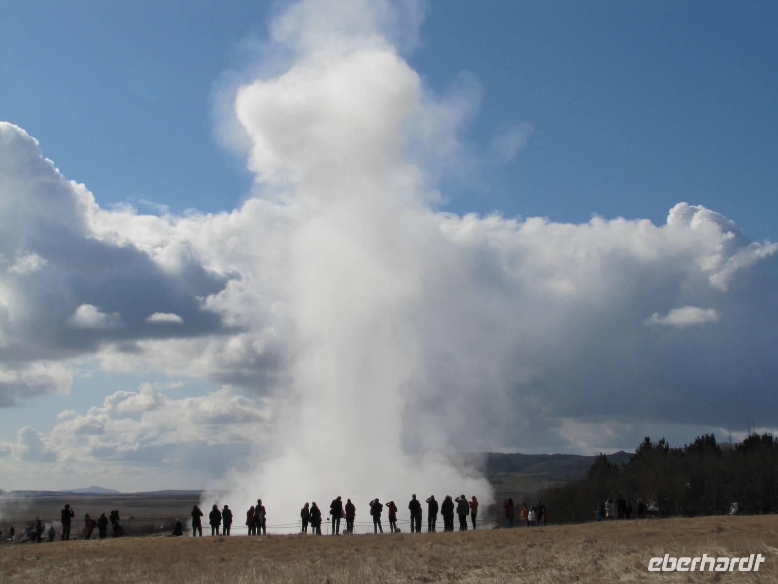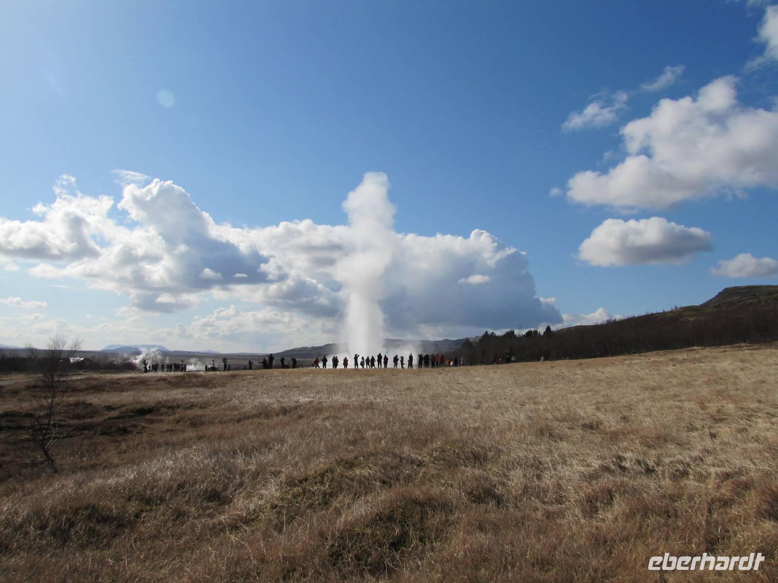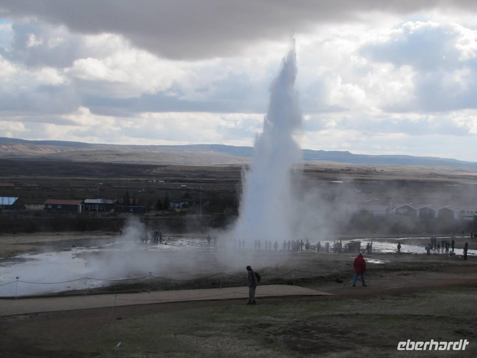An unserem vorletzten Tag ging es als erstes in den Thingvellir Nationalpark. Dort konnten wir bei einem ersten Fotostopp auf die Amerikanische und Eurasische Platte schauen. Dazwischen lag das „Niemandsland" mit tollen Seen und kleinen Flüssen. Das Wetter erreichte an diesem Tag seinen Höhepunkt, Sonne und blauer Himmel soweit das Auge reichte. Auf Island muss im Frühling keiner frieren! ;) Weiter ging es zum Gullfoss, zu Deutsch Goldener Wasserfall. Dort stürzten sich die Wassermassen über zwei Kaskaden hinab in die Tiefe. Es war ein imposanter Anblick! Nach einer einstündigen Mittagspause fuhren wir weiter zum nächsten großen Highlight unserer Reise, den größten und vielleicht schönsten Geysiren der Welt. Aller 5min. schoss eine gigantische Wasserfontäne mit heißem Wasser aus der Erde ca. 25 Meter in die Höhe. Wir staunten und versuchten tolle Fotos im richtigen Moment zu machen. Auch hier konnten wir in Ruhe eine Stunde lang das Schauspiel bestaunen. Zurück im Hotel erwartete und am Abend wieder ein tolles 3 Gänge Menü. Zum Abschluss gab es noch ein kleines Quiz bevor wir uns noch einmal auf den Weg zur Nordlichtbeobachtung machten. Wir fuhren alle zusammen mit dem Reisebus ca. 40min. in Richtung Keflavik und versuchten ein paar Nordlichter zu erhaschen. Einige male hatten wir kurz die Gelegenheit ein paar grüne Lichter zu erblicken. Leider immer nur sehr kurz. Dafür gab es zwischendurch etwas Brennivin Schnaps (Schwarzer Tod) zum wach bleiben und typisch isländischen Trockenfisch zum probieren. Bevor wir die Rückreise zum Hotel antraten verabschiedeten wir uns von Rosa und bedankten uns für die schönen Tage mit Ihr auf Island. Gegen 1.30Uhr erreichten wir wieder das Hotel.