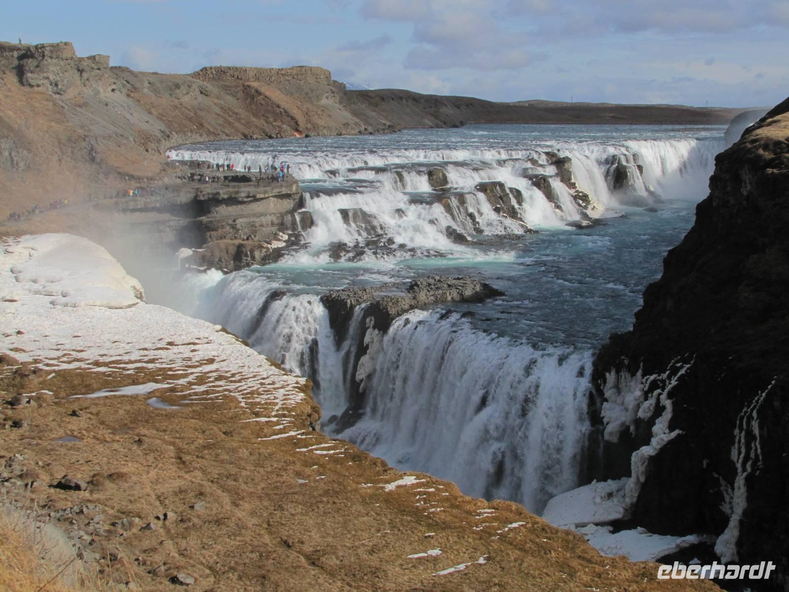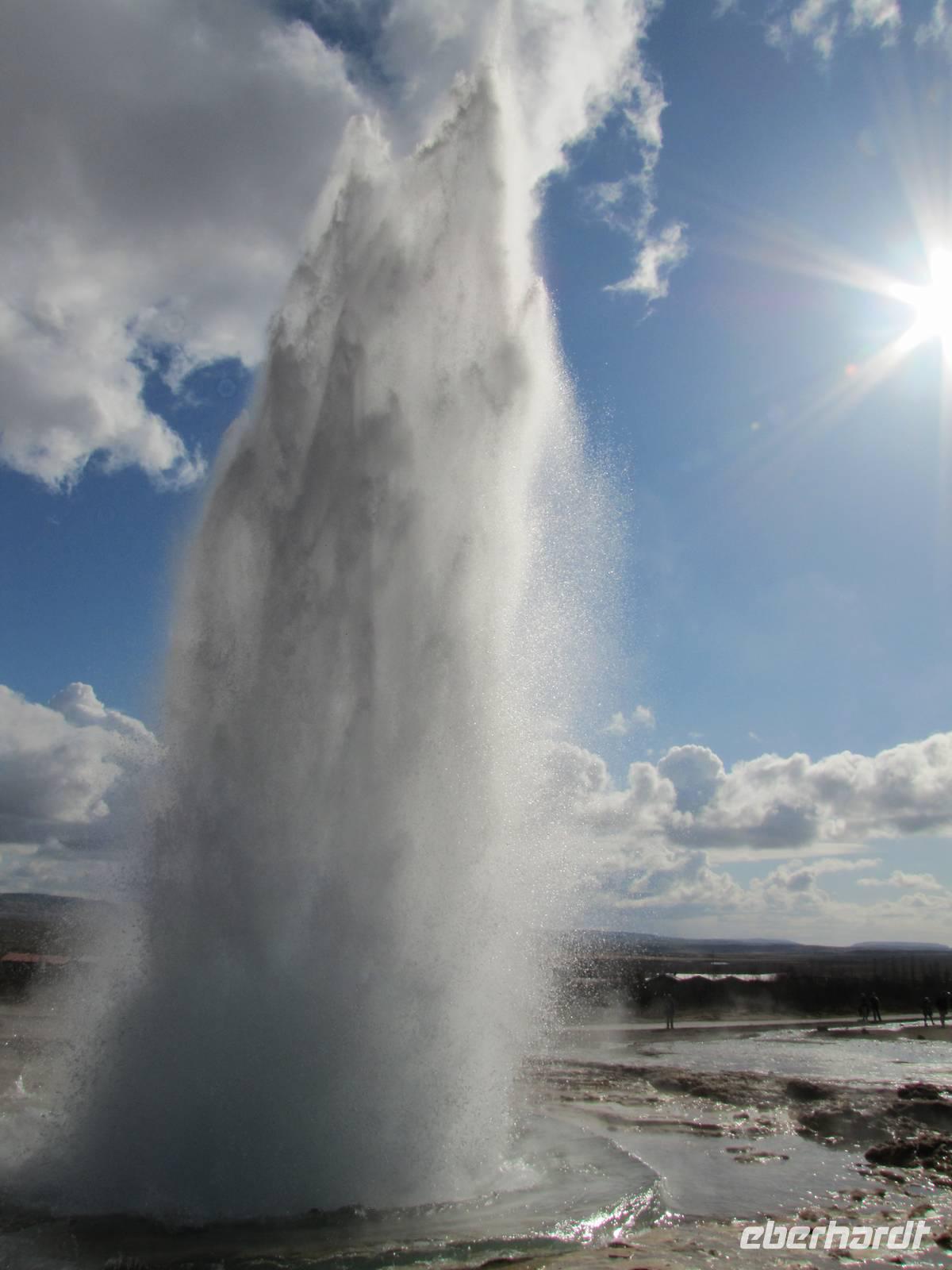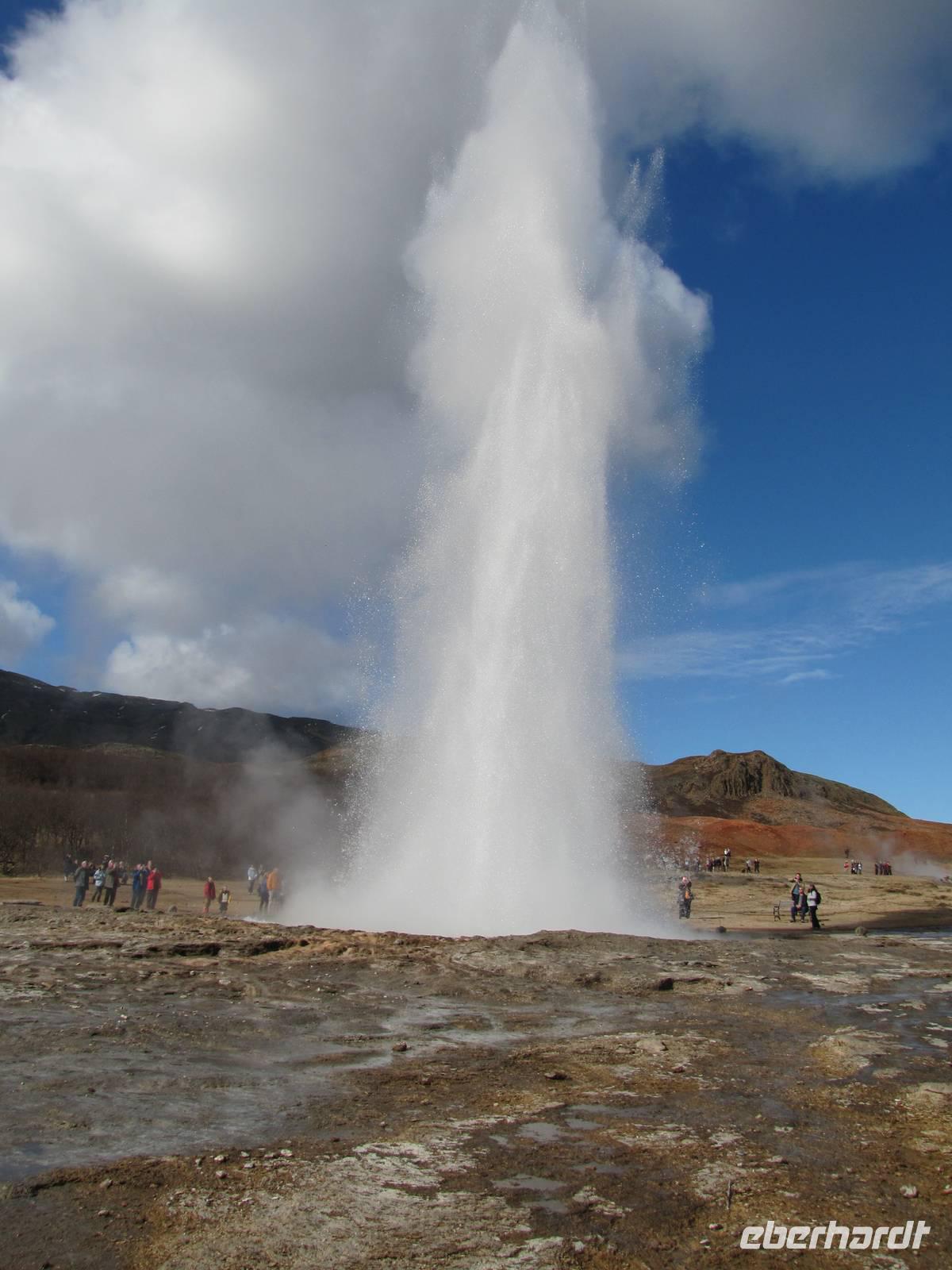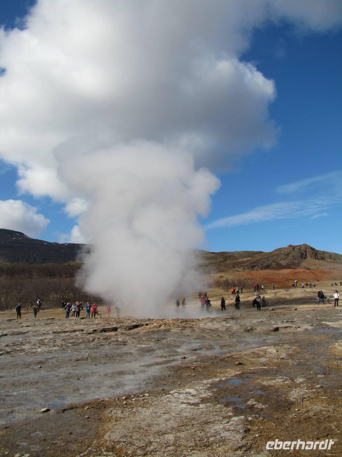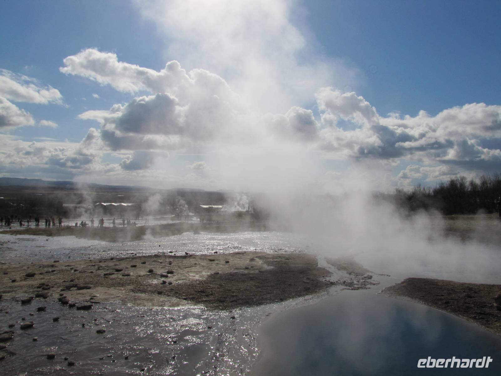 An unserem vorletzten Tag ging es als erstes in den Thingvellir Nationalpark. Dort konnten wir bei einem ersten Fotostopp auf die Amerikanische und Eurasische Platte schauen. Dazwischen lag das „Niemandsland" mit tollen Seen und kleinen Flüssen. Das Wetter erreichte an diesem Tag seinen Höhepunkt, Sonne und blauer Himmel soweit das Auge reichte. Auf Island muss im Frühling keiner frieren! ;) Weiter ging es zum Gullfoss, zu Deutsch Goldener Wasserfall. Dort stürzten sich die Wassermassen über zwei Kaskaden hinab in die Tiefe. Es war ein imposanter Anblick! Nach einer einstündigen Mittagspause fuhren wir weiter zum nächsten großen Highlight unserer Reise, den größten und vielleicht schönsten Geysiren der Welt. Aller 5min. schoss eine gigantische Wasserfontäne mit heißem Wasser aus der Erde ca. 25 Meter in die Höhe. Wir staunten und versuchten tolle Fotos im richtigen Moment zu machen. Auch hier konnten wir in Ruhe eine Stunde lang das Schauspiel bestaunen. Zurück im Hotel erwartete und am Abend wieder ein tolles 3 Gänge Menü. Zum Abschluss gab es noch ein kleines Quiz bevor wir uns noch einmal auf den Weg zur Nordlichtbeobachtung machten. Wir fuhren alle zusammen mit dem Reisebus ca. 40min. in Richtung Keflavik und versuchten ein paar Nordlichter zu erhaschen. Einige male hatten wir kurz die Gelegenheit ein paar grüne Lichter zu erblicken. Leider immer nur sehr kurz. Dafür gab es zwischendurch etwas Brennivin Schnaps (Schwarzer Tod) zum wach bleiben und typisch isländischen Trockenfisch zum probieren. Bevor wir die Rückreise zum Hotel antraten verabschiedeten wir uns von Rosa und bedankten uns für die schönen Tage mit Ihr auf Island. Gegen 1.30Uhr erreichten wir wieder das Hotel.