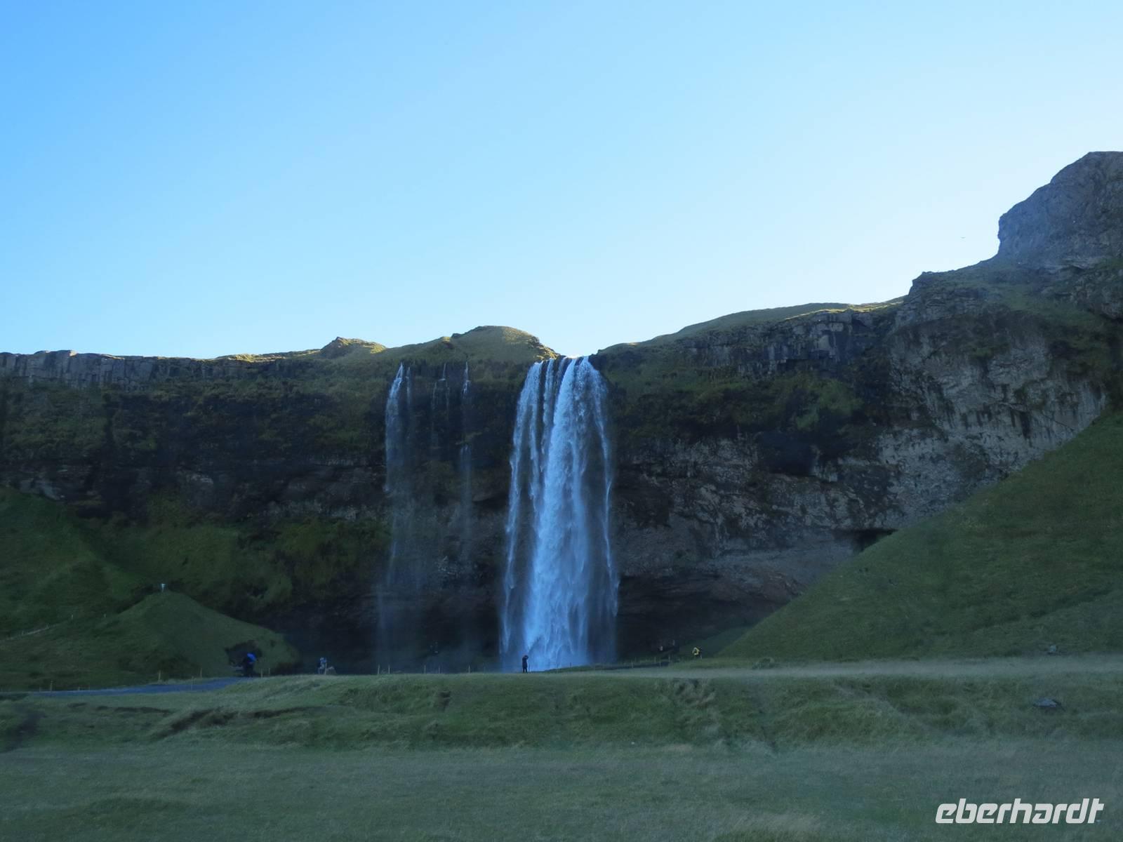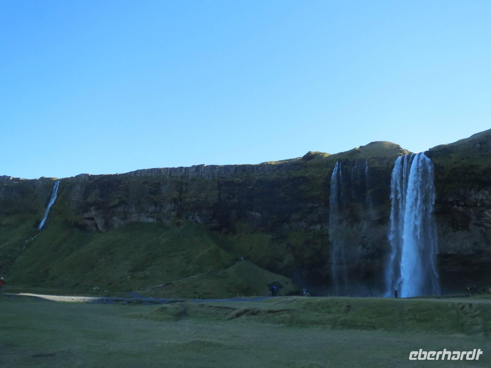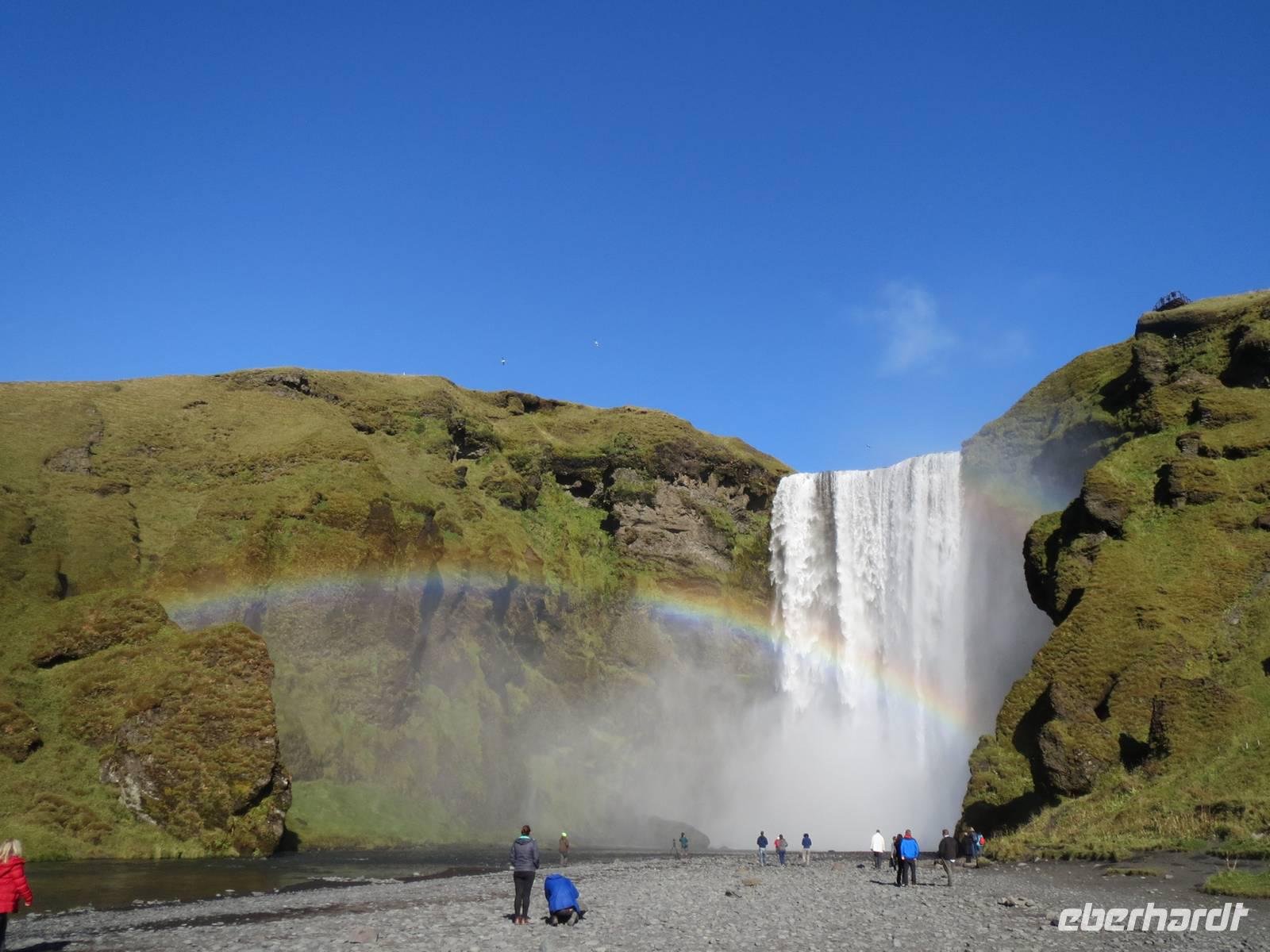 Der heutige Tag führte uns an die abenteuerliche Südküste von Reykjavík. Zunächst konnten wir an diesem Tag die noch tätigen Vulkane Hekla und Katla sehen, wie sie in der sagenhaften Landschaft eingebettet sind. Als ersten Wasserfall sahen wir an diesem Tag den Seljalandsfoss. Dieser Wasserfall liegt unterhalb des Eyjafjallajökull und stürzt sich 66 Meter in die Tiefe. Im Skógar-Museum konnten wir sehen, wie die Menschen früher gelebt und gearbeitet haben. Danach bestaunten wir den nächsten Wasserfall: Skógafoss. Dieser stürzt sich eine ehemalige Steilküste über eine Breite von 25 Meter 60 Meter in die Tiefe. Unsere Mittagspause verlebten wir im Küstenort Vík. Bei einem Spaziergang am tiefschwarzen Strand konnten wir noch einmal die Seele baumeln lassen. In der Ferne konnten wir kurz darauf die sagenumwobenen Felsnadeln „Reynisdrangar" bestaunen. Bei einer kleinen Gletscherwanderung wurden uns die Naturgewalten nochmals bewusst. Am Abend sahen wir im Besucherzenrtum der Farm Thoervaldseyri einen Film über den Vulkan Eyjafjallajökull, der 2010 die ganze Welt in Atem hielt. Abschließend genossen wir im Hotel unseren letzten gemeinsamen Abend bei einem gemütlichen Abendessen mit einem Glas Wein.
