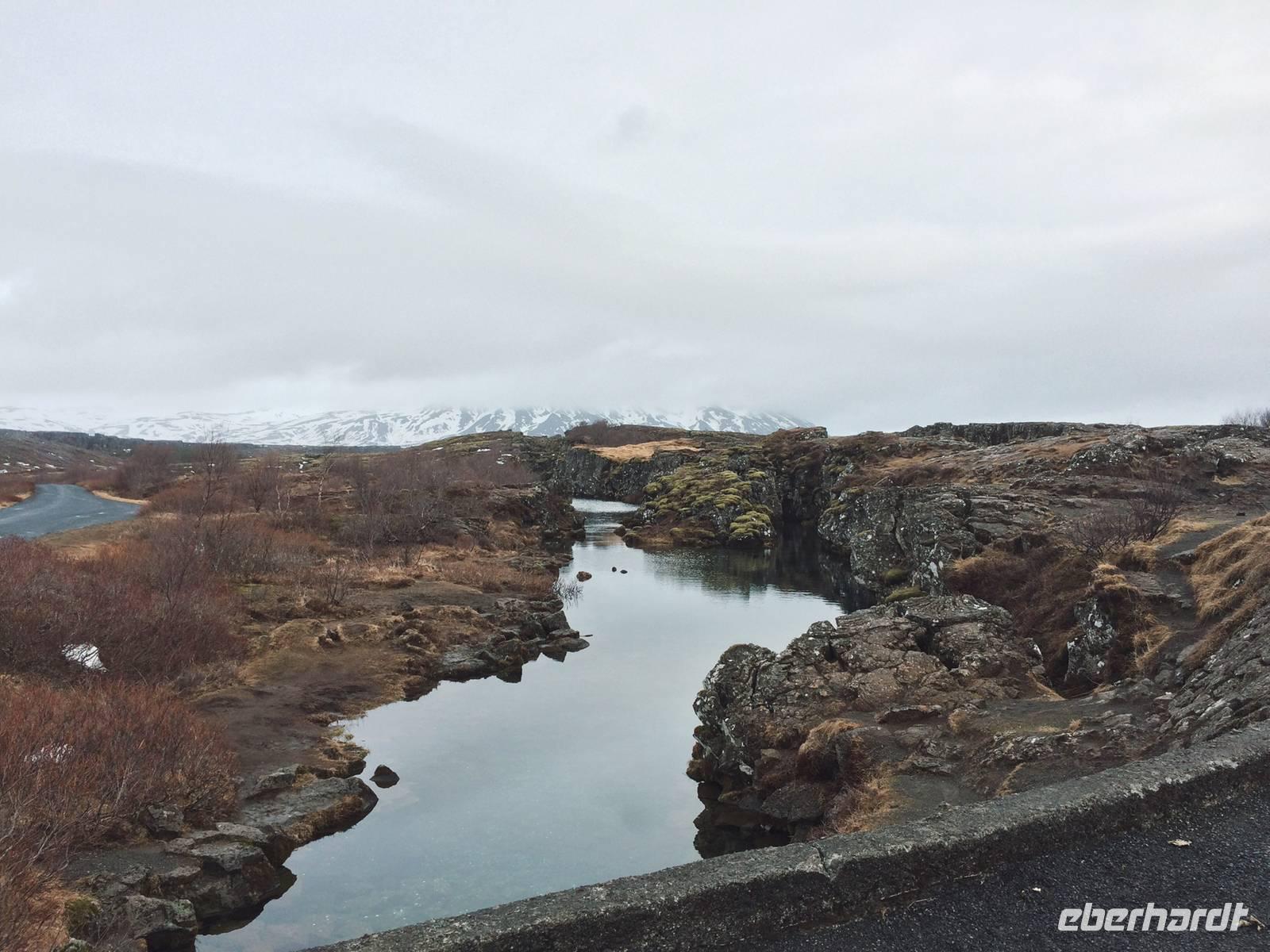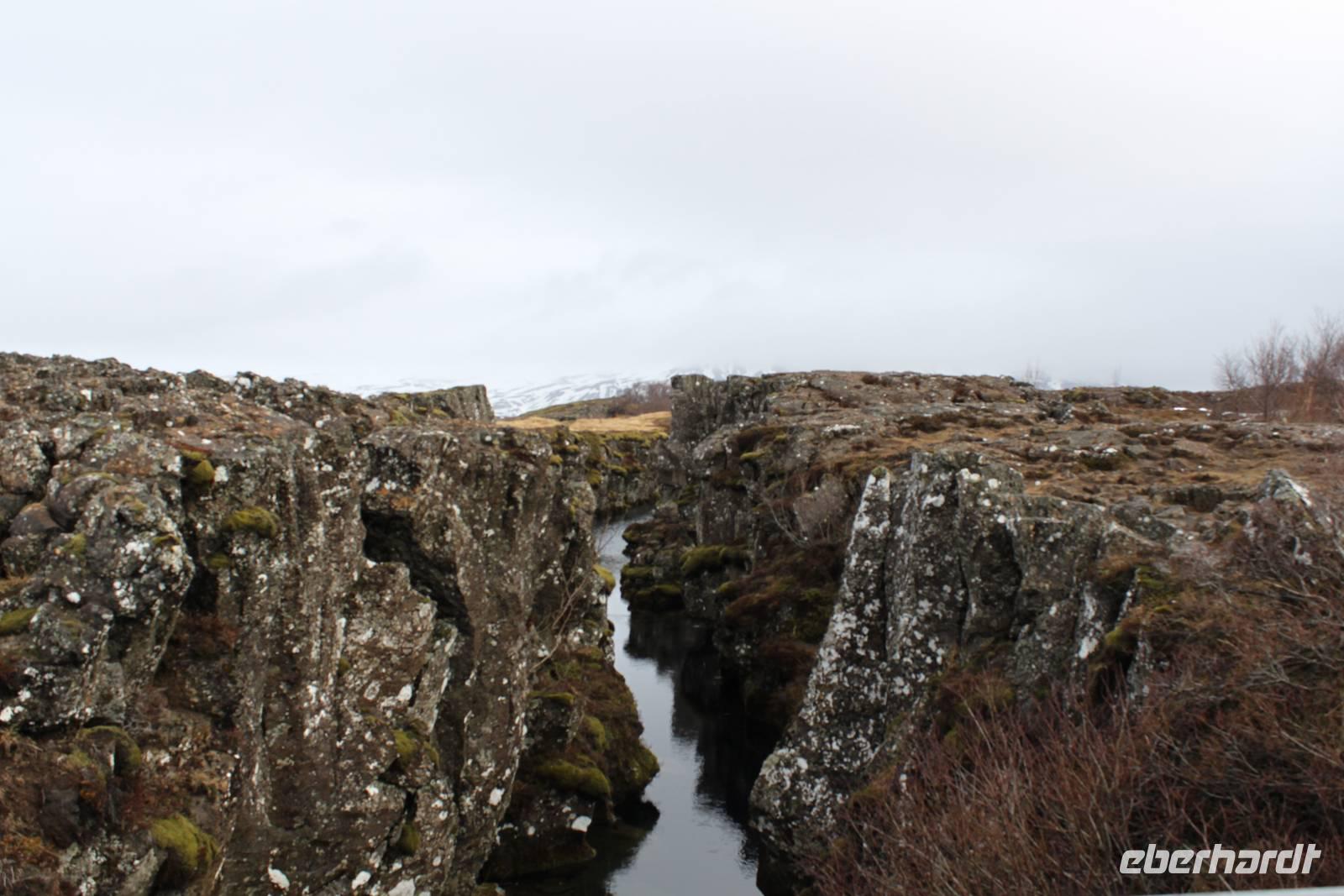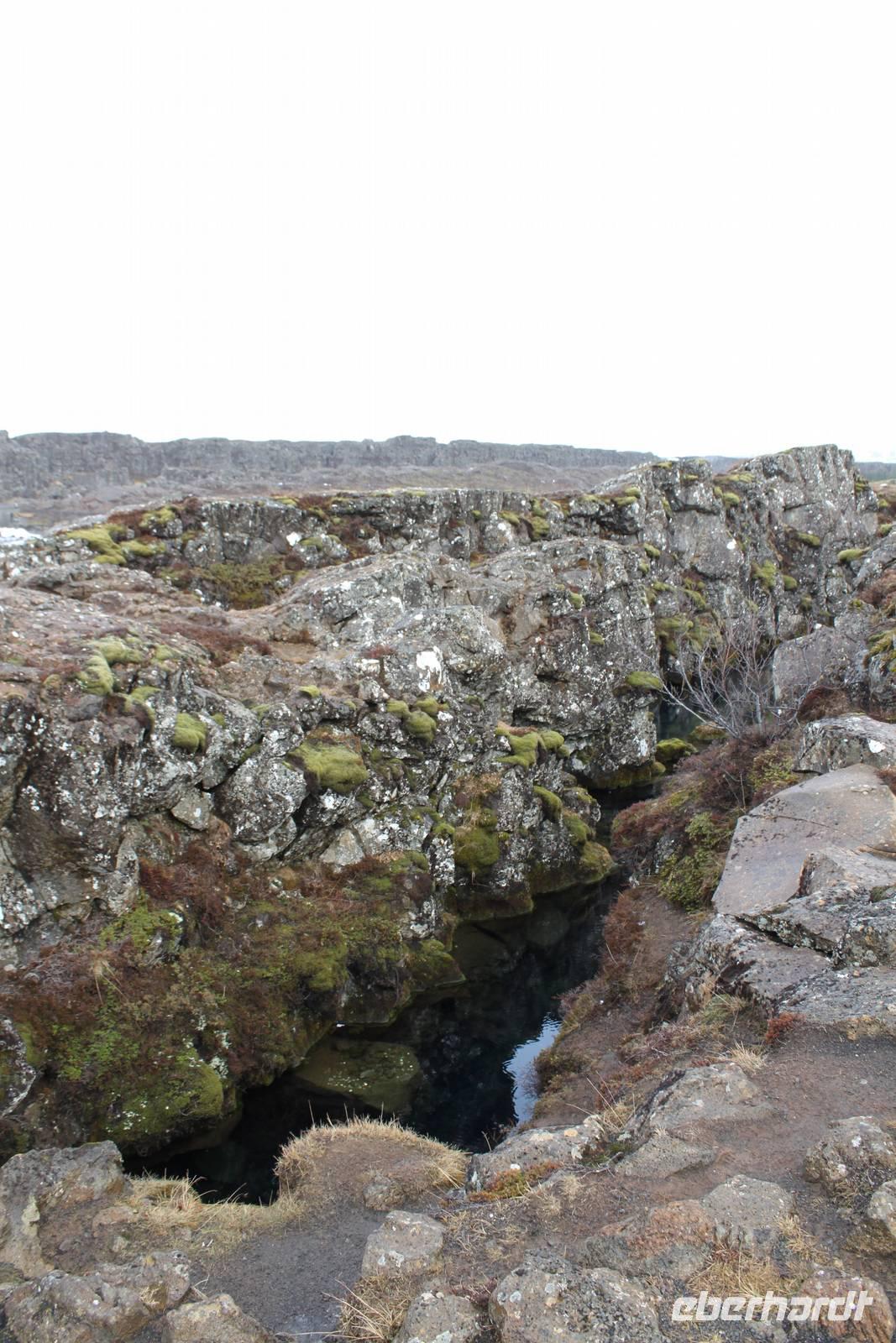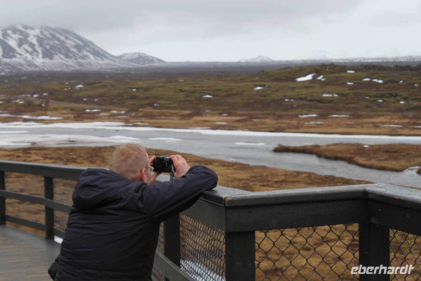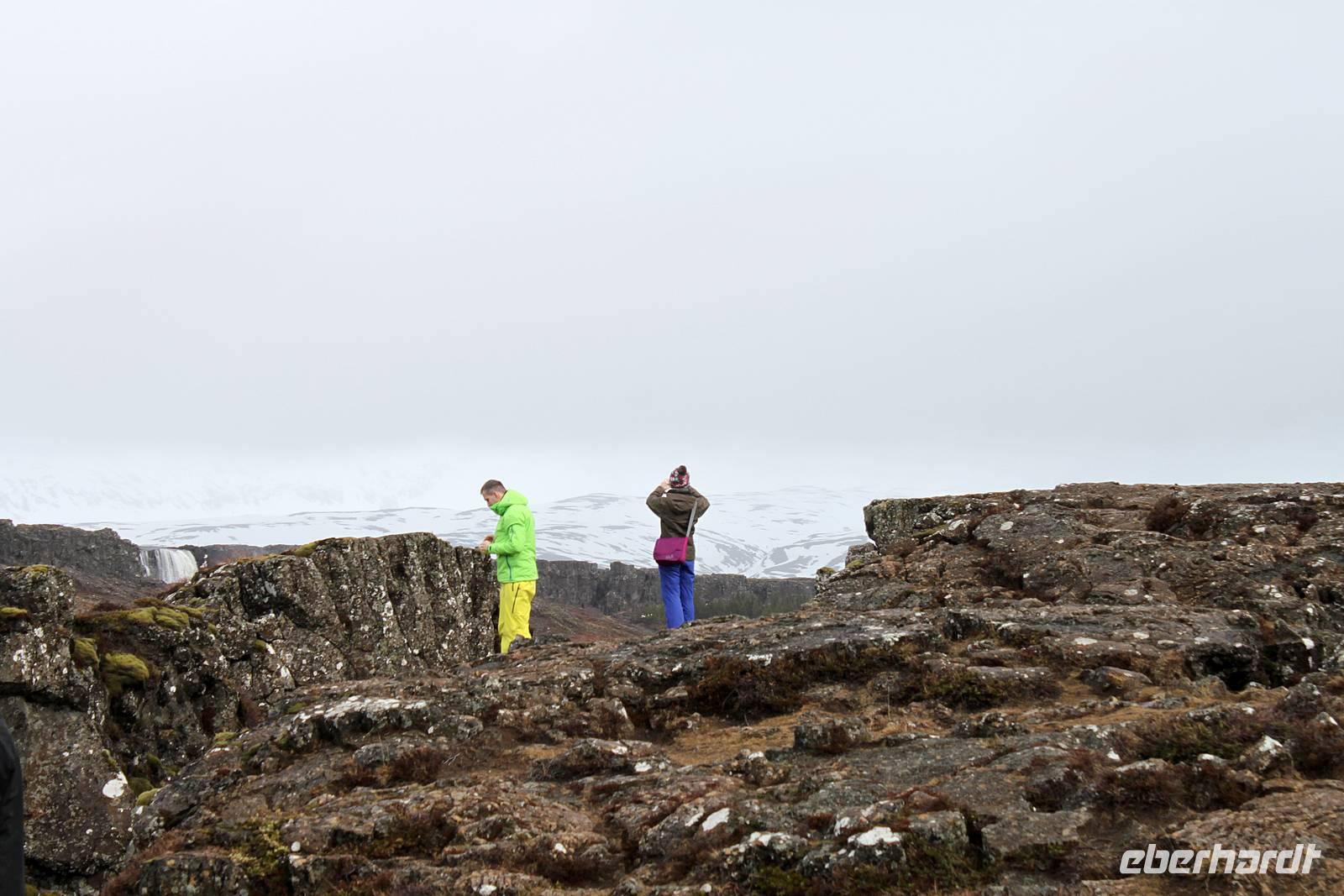 Zuerst hielten wir am Thingvallavatn bevor es uns in den Thingvellir Nationalpark zog. Hier treffen die eurasische und amerikanische Platte aufeinander und man kann die Ergebnisse des Auseinanderdriftens des Gesteins deutlich sehen.
