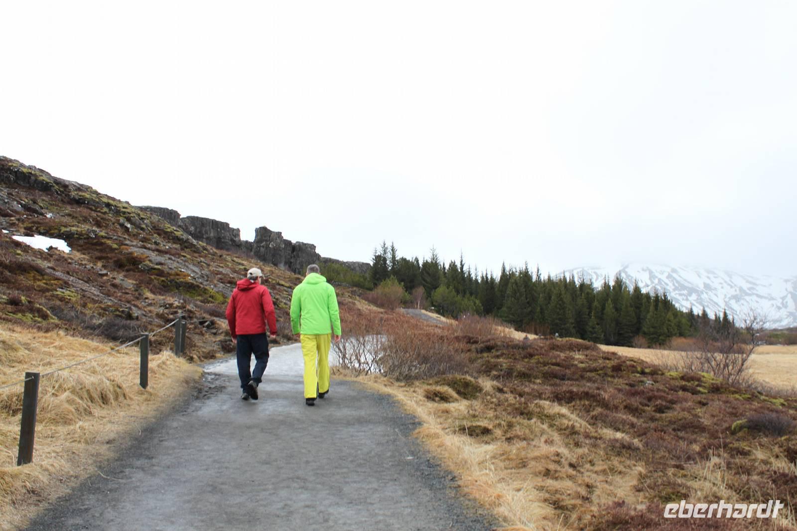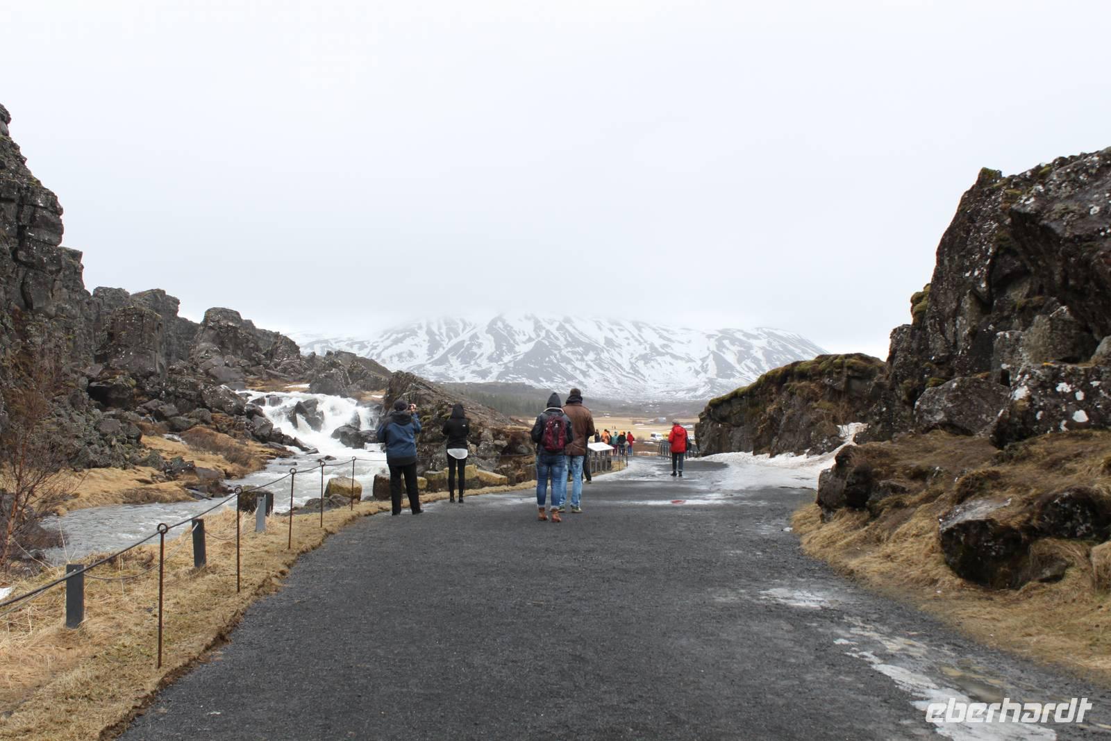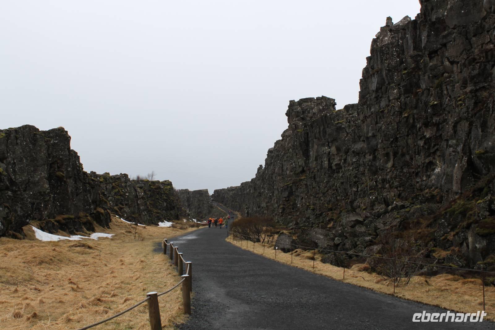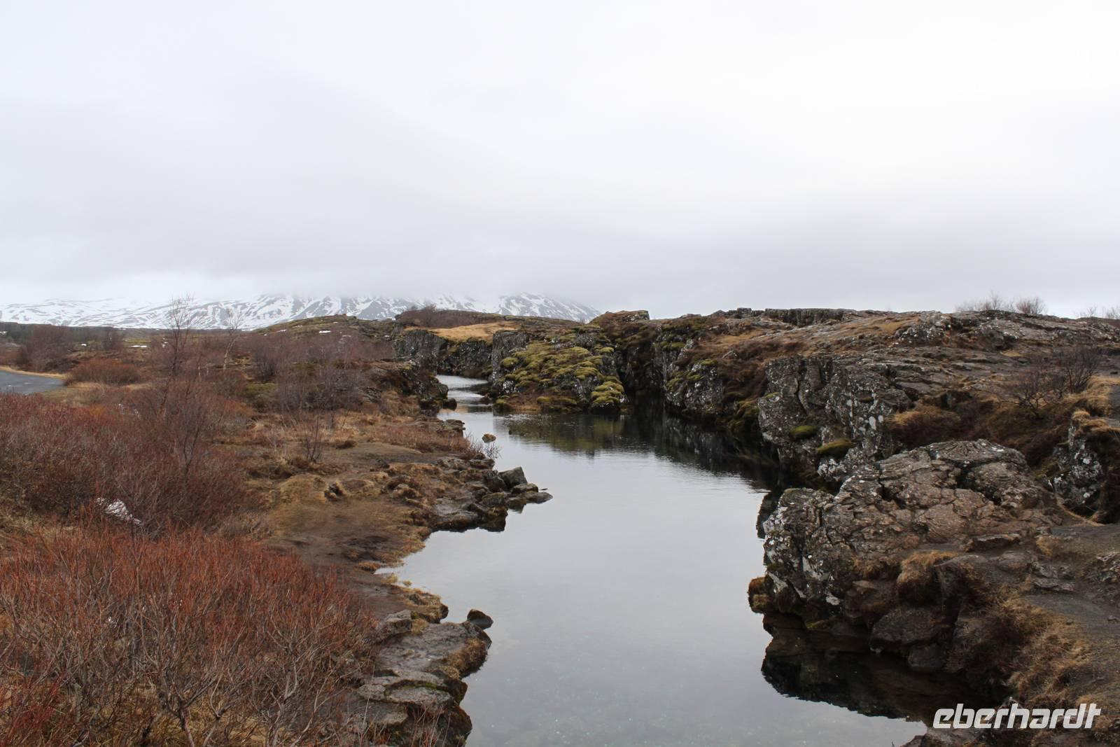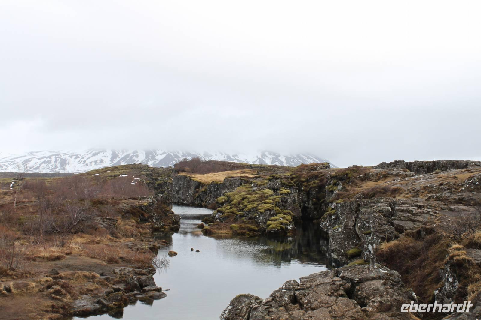 Zuerst hielten wir am Thingvallavatn bevor es uns in den Thingvellir Nationalpark zog. Hier treffen die eurasische und amerikanische Platte aufeinander und man kann die Ergebnisse des Auseinanderdriftens des Gesteins deutlich sehen.