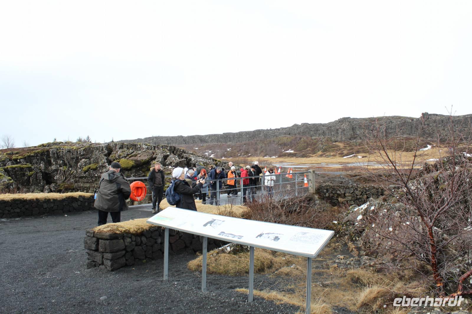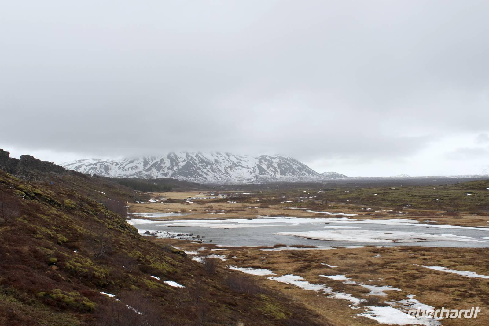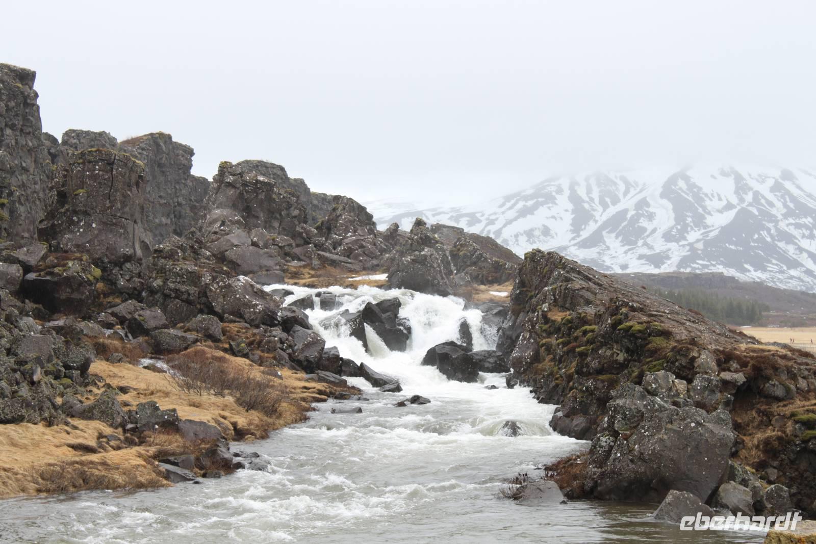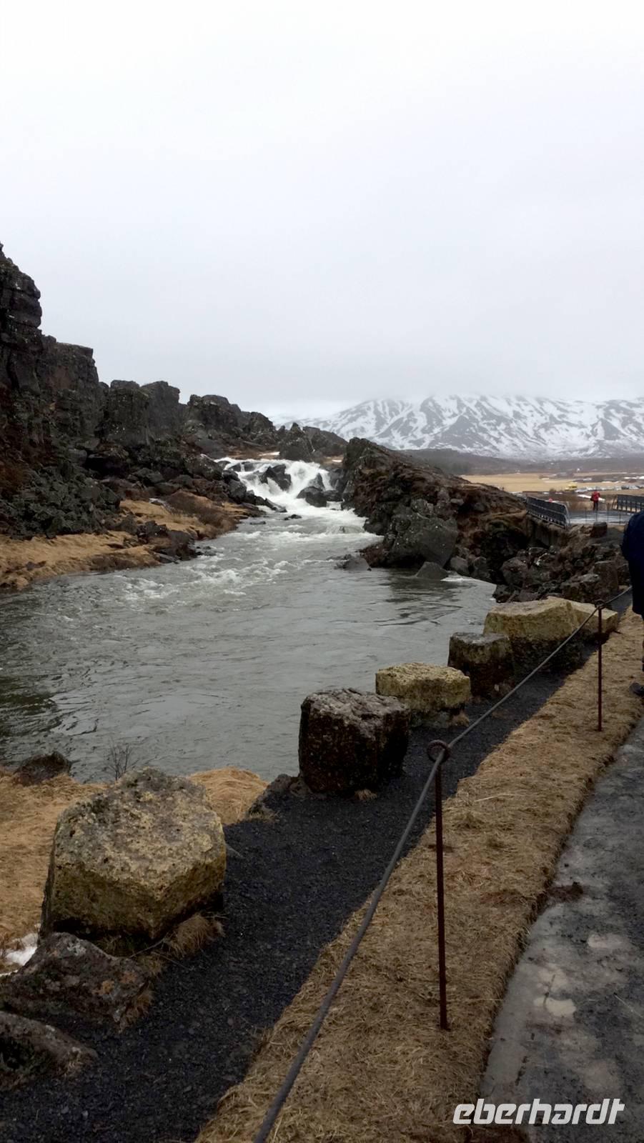 Zuerst hielten wir am Thingvallavatn bevor es uns in den Thingvellir Nationalpark zog. Hier treffen die eurasische und amerikanische Platte aufeinander und man kann die Ergebnisse des Auseinanderdriftens des Gesteins deutlich sehen.