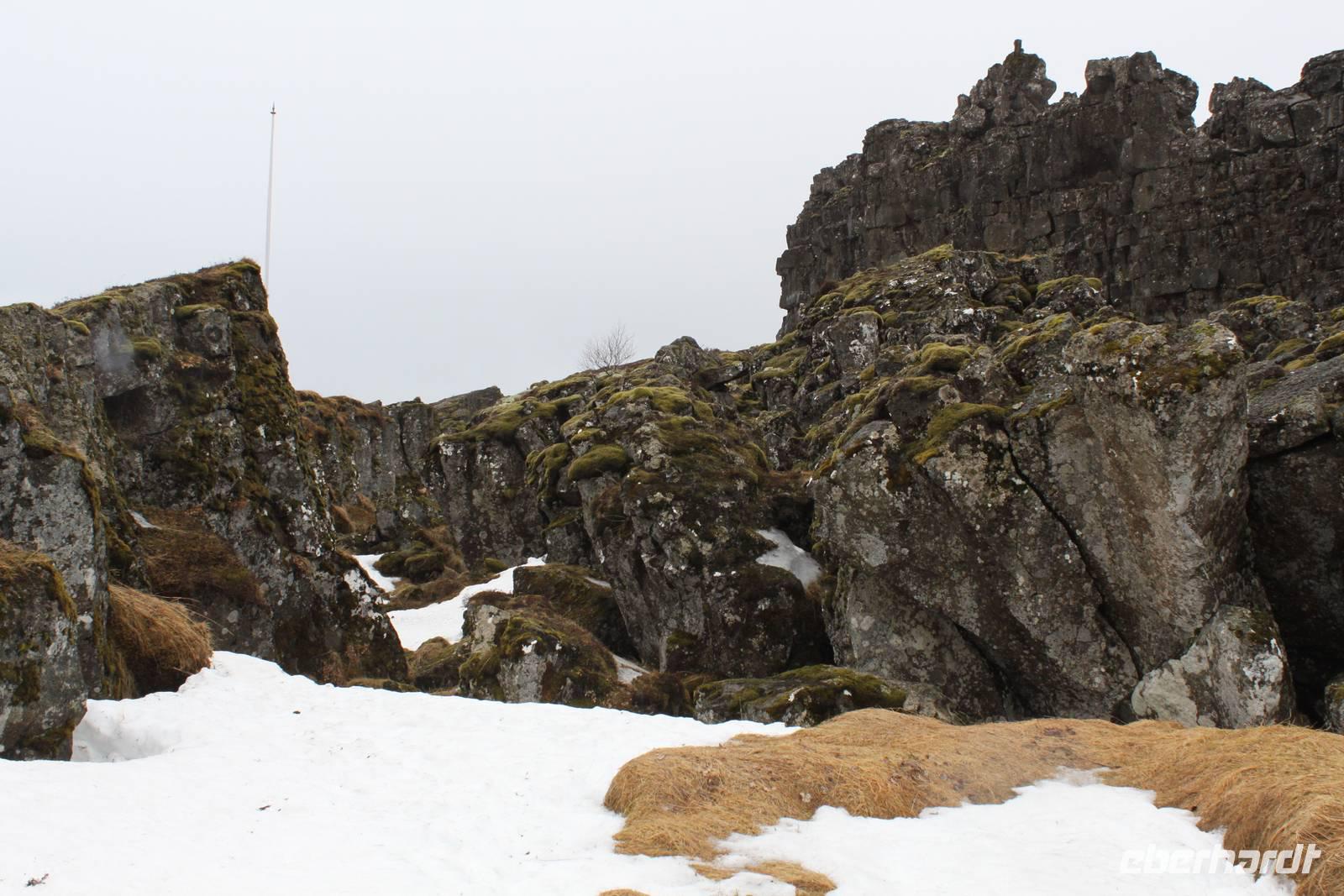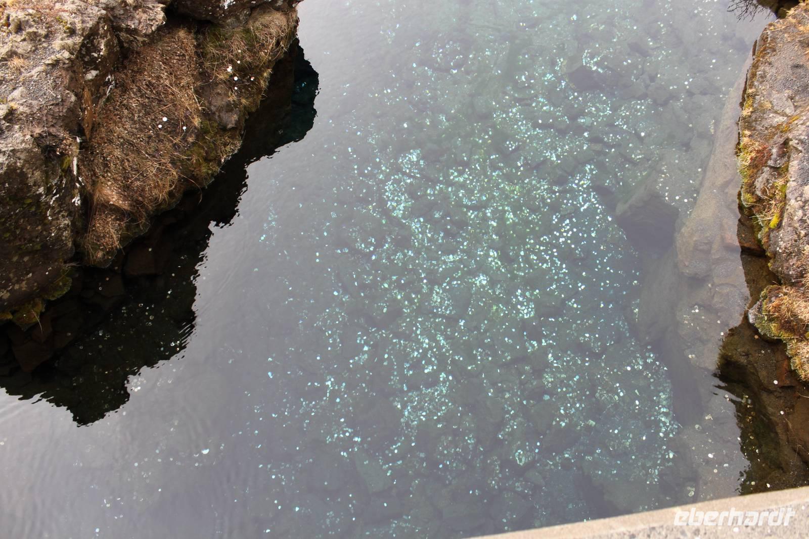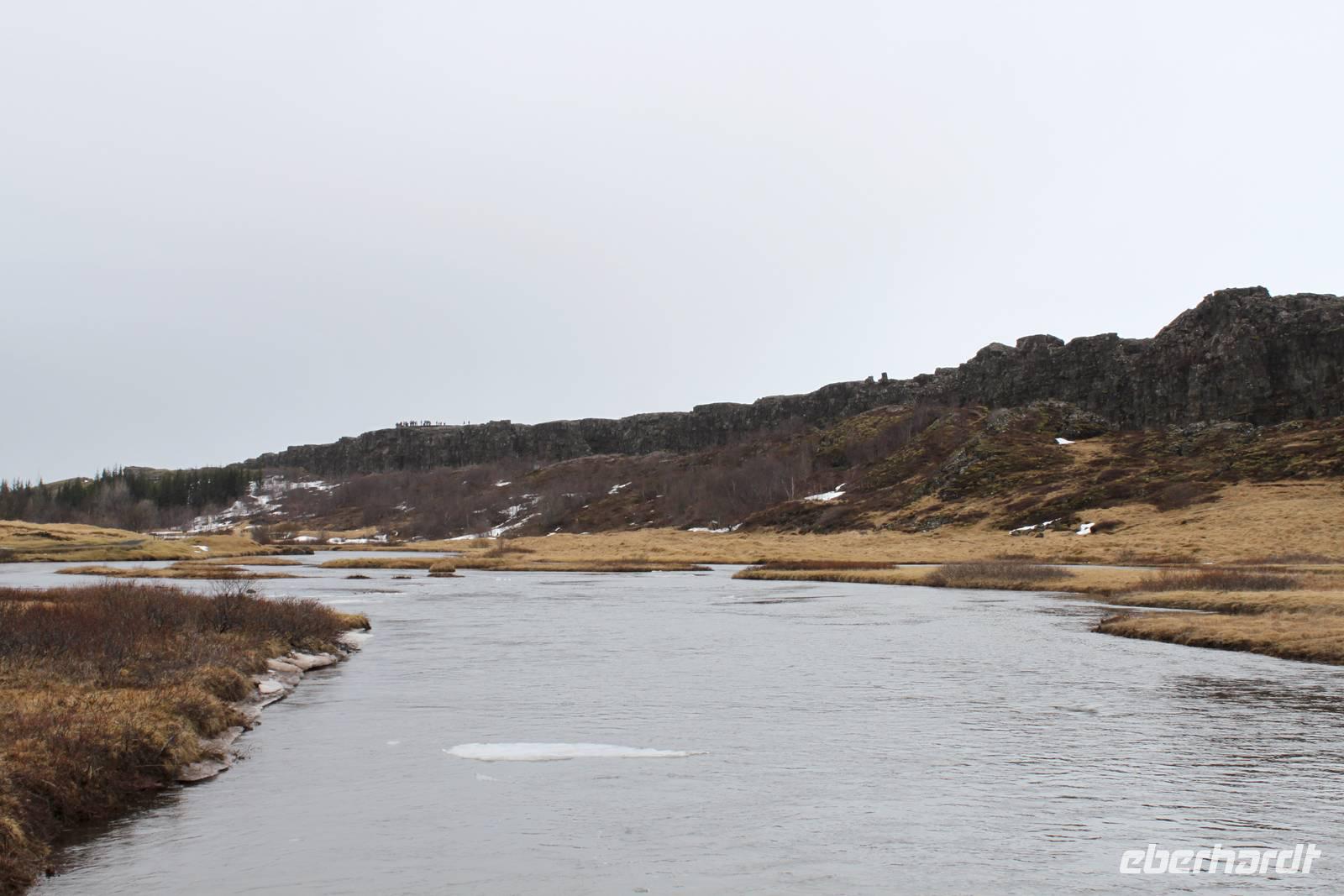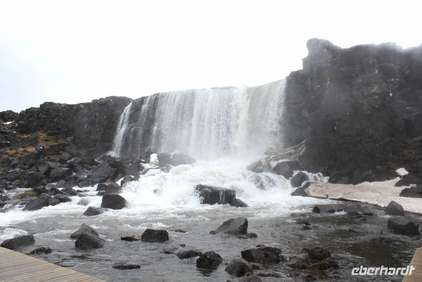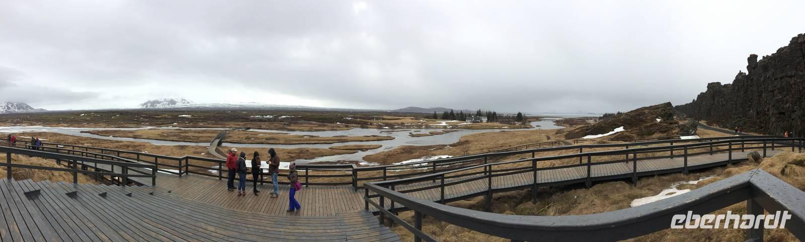 Zuerst hielten wir am Thingvallavatn bevor es uns in den Thingvellir Nationalpark zog. Hier treffen die eurasische und amerikanische Platte aufeinander und man kann die Ergebnisse des Auseinanderdriftens des Gesteins deutlich sehen.