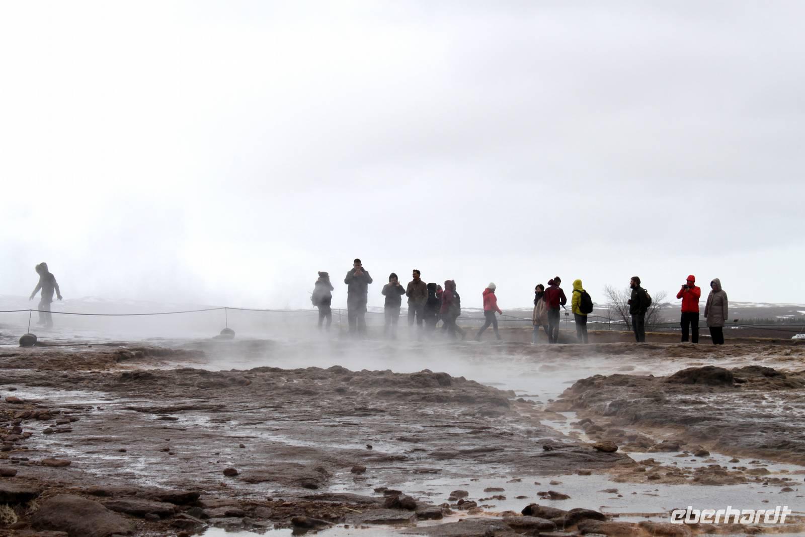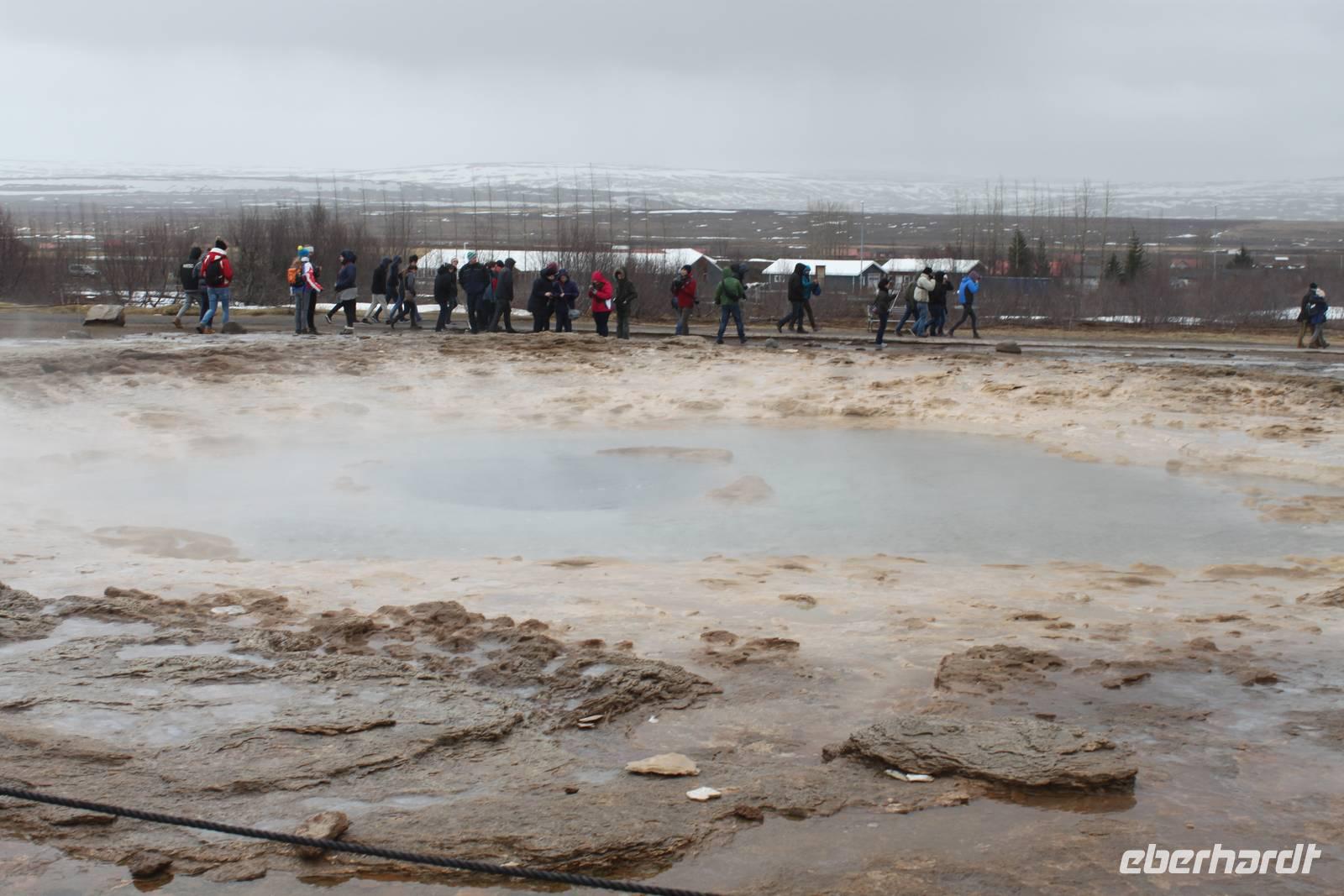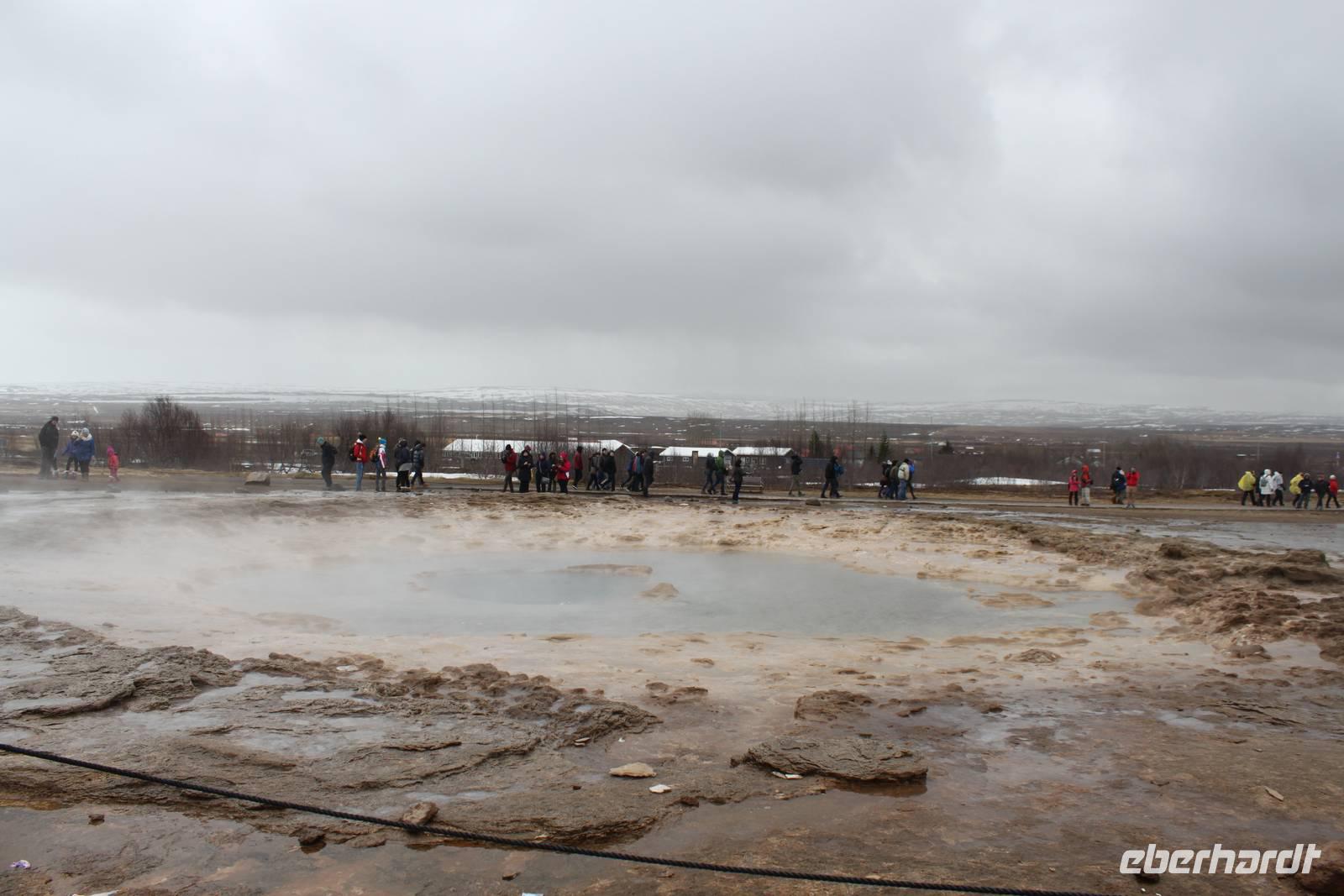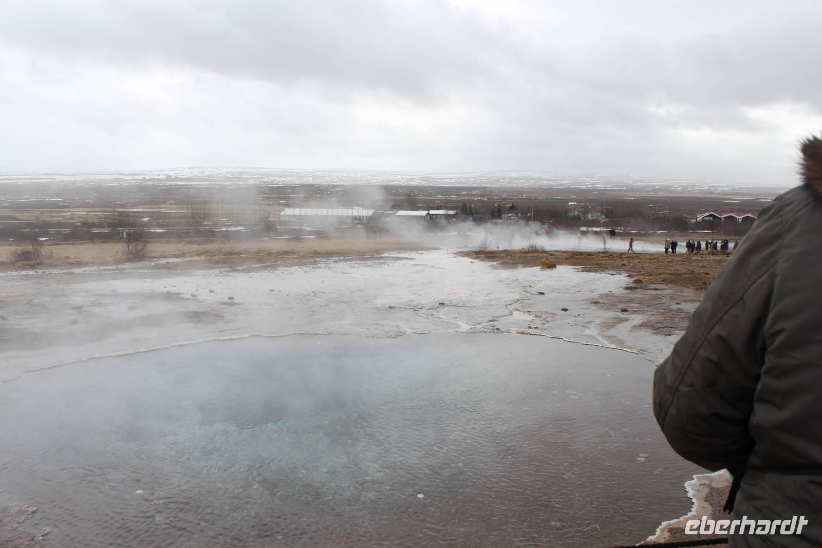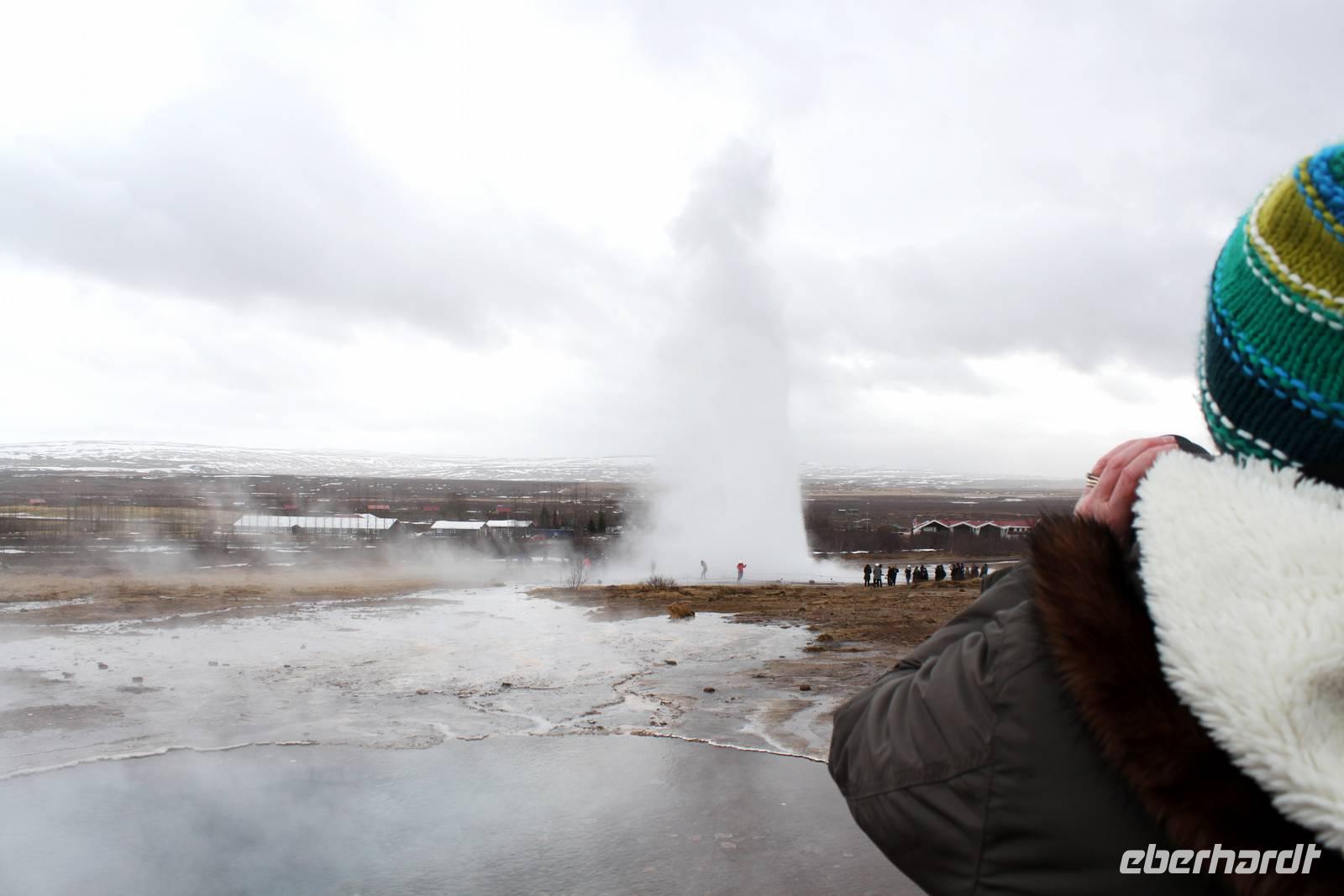 Danach bestaunten wir den Geysir, der allen Springquellen den Namen gegeben hat. Sein kleiner Bruder Strokkur ist aber sehr viel aktiver und zeigte uns ein paar mal seine Kraft.