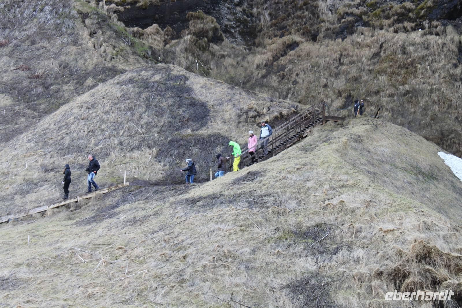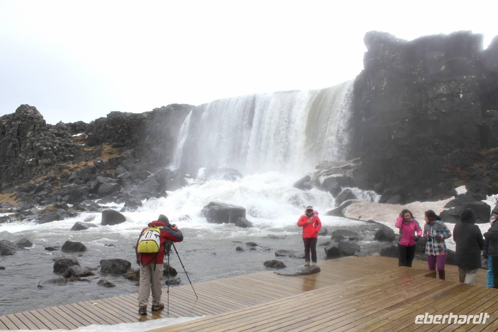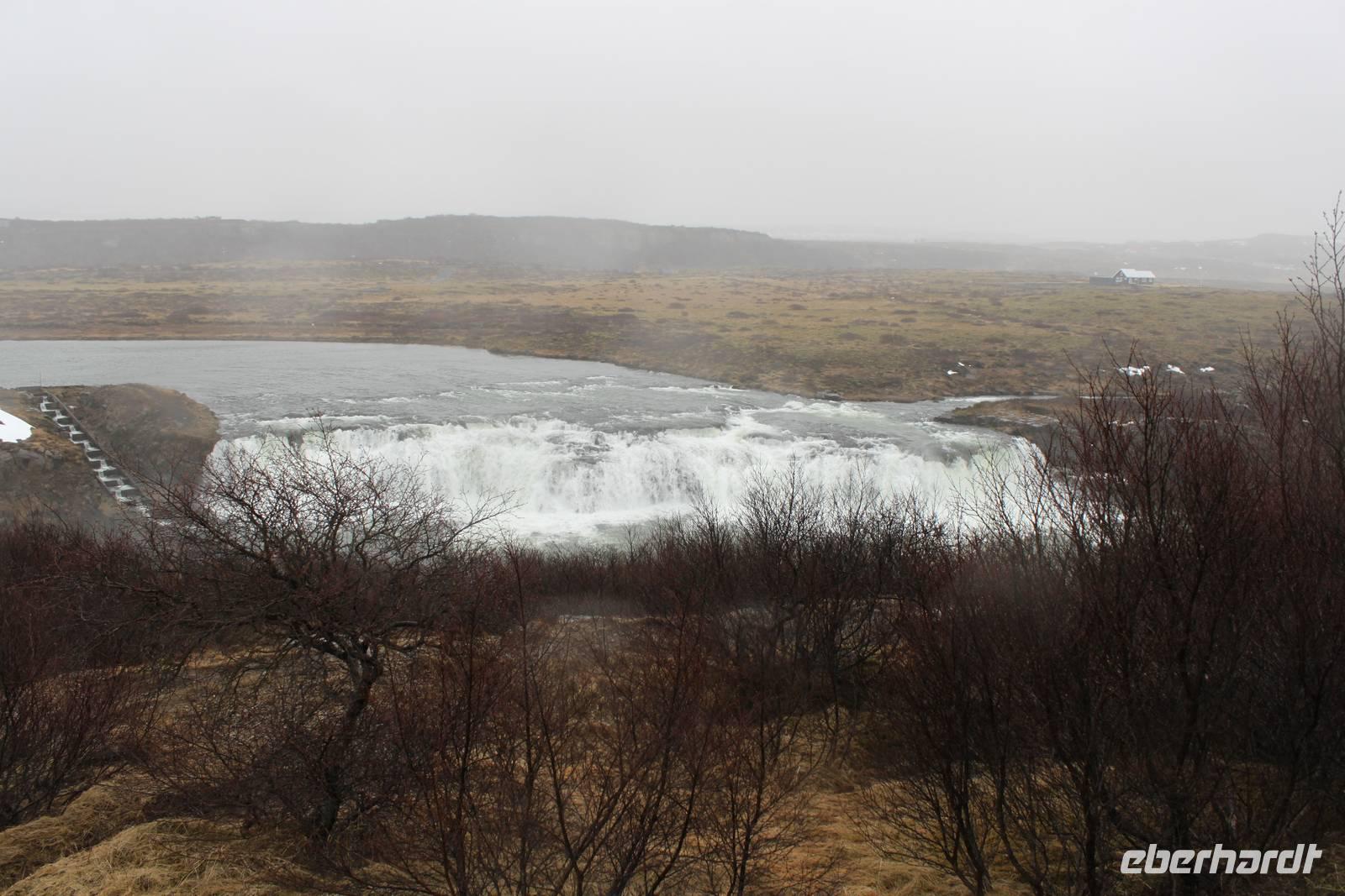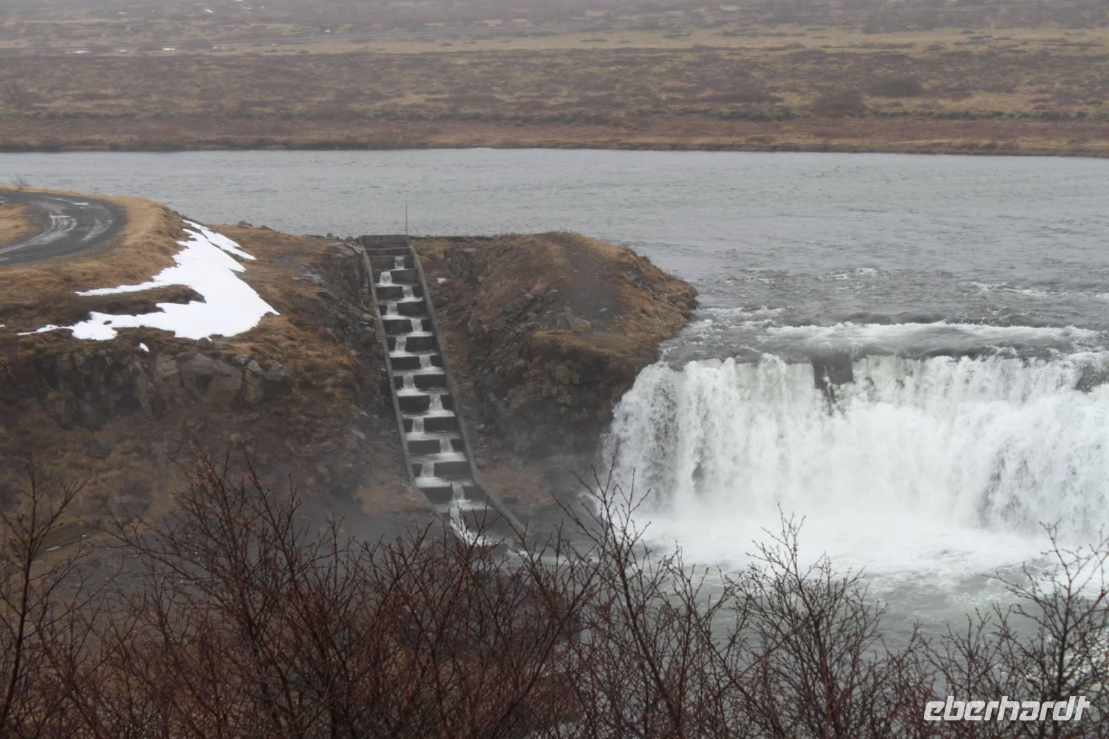 Auf dem Rückweg machte Halldór noch einen kleinen Abstecher zum Wasserfall Faxi. Das besondere an ihm ist, dass auf seiner linken Seite eine Lachstreppe gebaut ist, auf der die Fische hinaufspringen können.