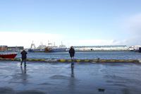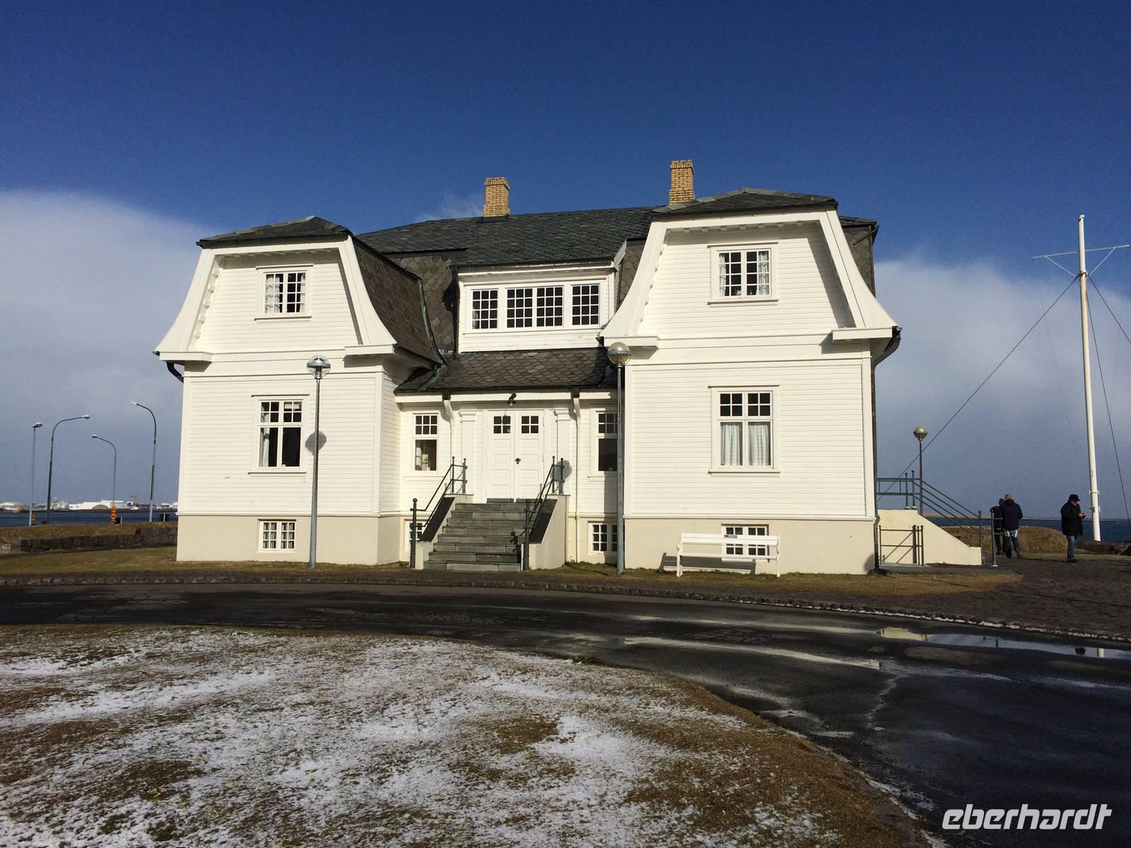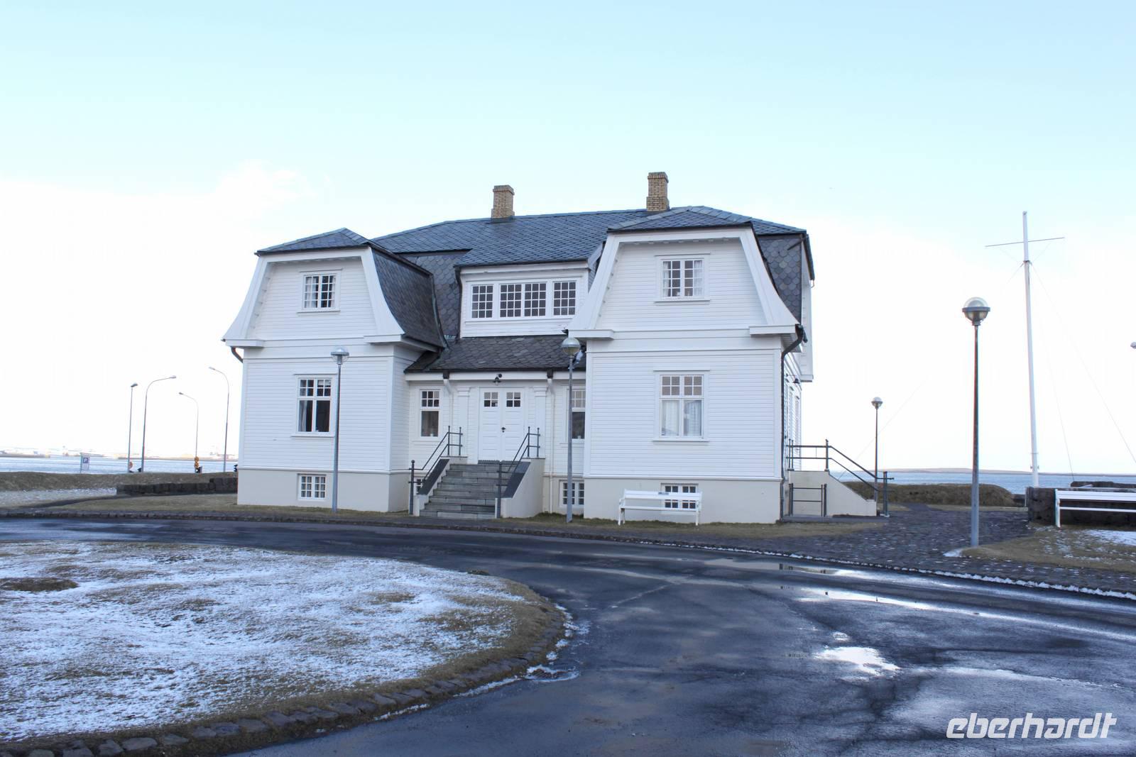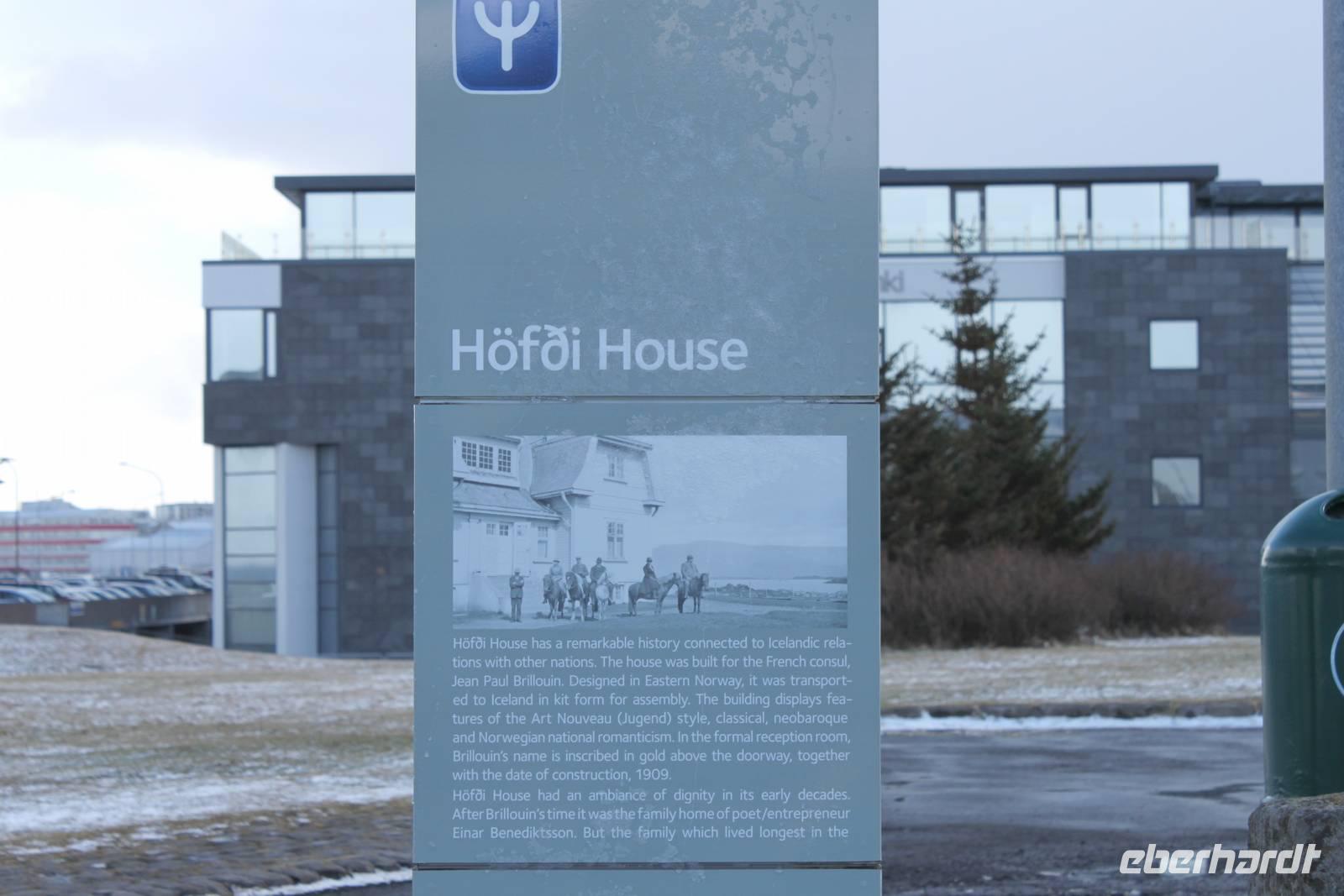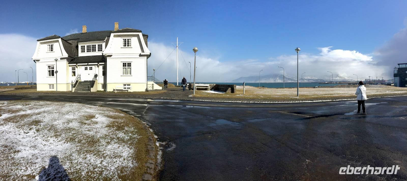 Eine wunderschöne Aussicht über Reykjavík bot sich uns vom "Perlan". Von diesem Warmwasserspeicher kann man über die gesamte Stadt sehen, allerdings war es so windig, dass es schwer war uns auf den Beinen zu halten, geschweige denn den Fotoapparat still zu halten. Ein paar schöne Fotos sind uns trotzdem gelungen. Die für heute geplante Walsafari konnte aufgrund des Windes leider nicht stattfinden, also suchten wir eine Alternative. Zunächst ging es aber erst einmal weiter zum Höfdi, wo im Oktober 1986 ein Gipfeltreffen zwischen Michail Gorbatschow und dem US-Präsidenten Ronald Reagan stattgefunden hat.