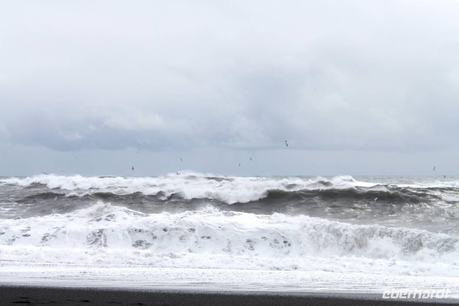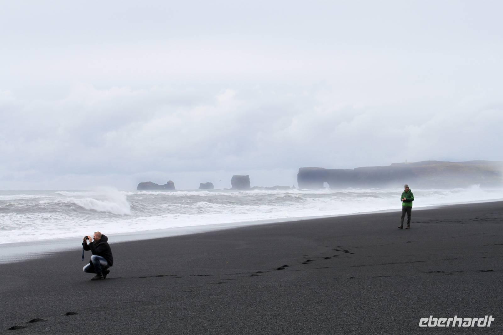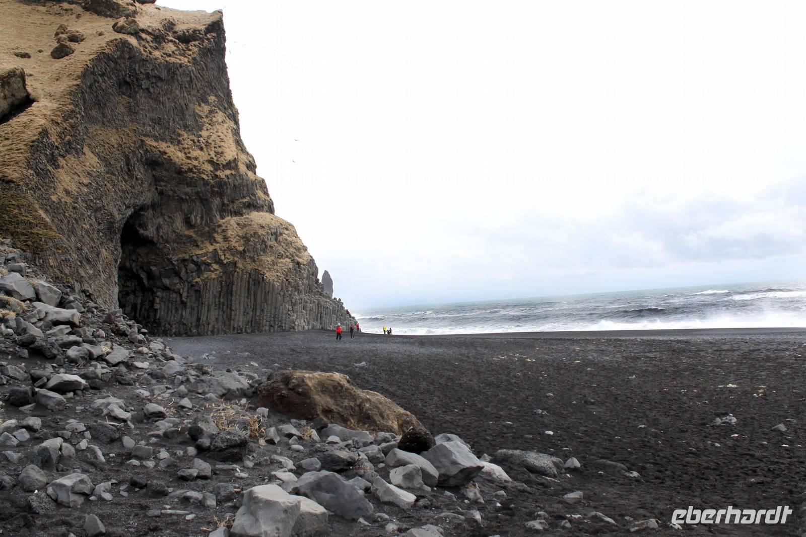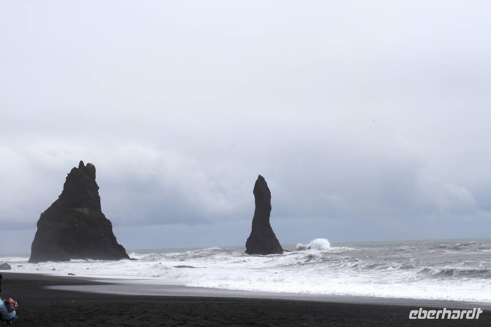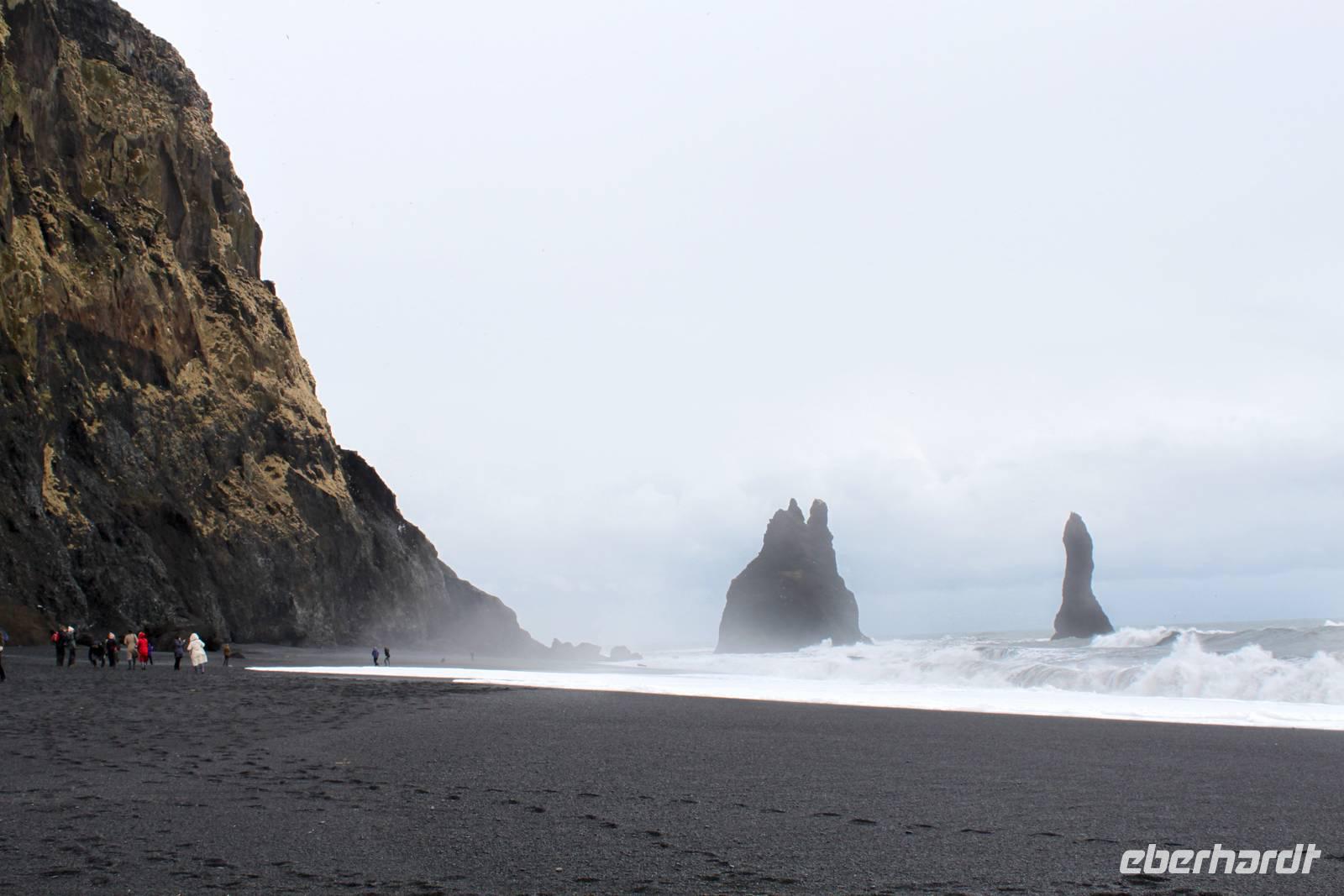 An diesem Tag besuchten wir Islands Südküste. Der Eyjafjallajökull, der 2010 für großes Aufsehen sorgte, war unser erstes Ziel für ein schnelles Foto. An einem Rastplatz habe ich vorher Trockenfisch gekauft, den wir auf der Fahrt zum Sólheimajökull probieren. Er schmeckt besser als gedacht, wird aber sich nicht unser Leibgericht. Der Sólheimajökull ist eine etwa zehn Kilometer lange Gletscherzunge die uns alle beeindruckt hat. Mittags hielten wir im kleinen Örtchen Vík und stärkten uns bevor es weiter zum schwarzen Sandstrand ging. Das Meer tobte und man musste darauf achten, dass man genügend Abstand zum unberechenbaren Wasser hielt. Der etwas andere Strand strotzte mit seinen hohen Felsen nur so vor Schönheit.
