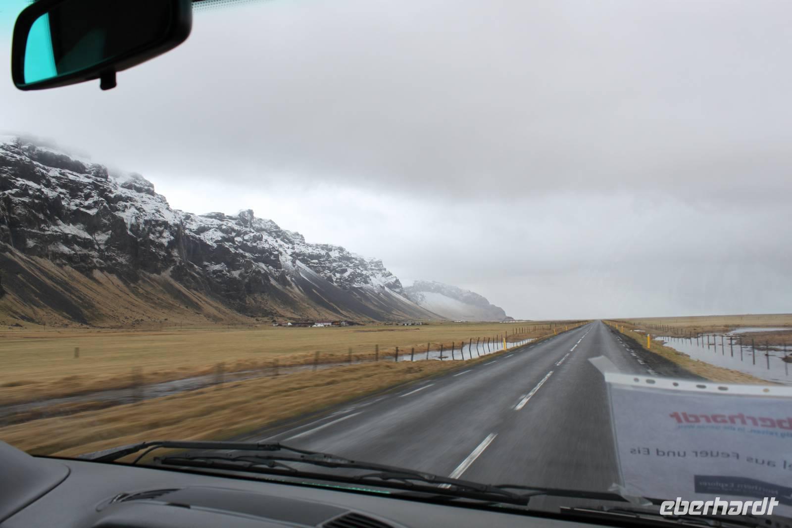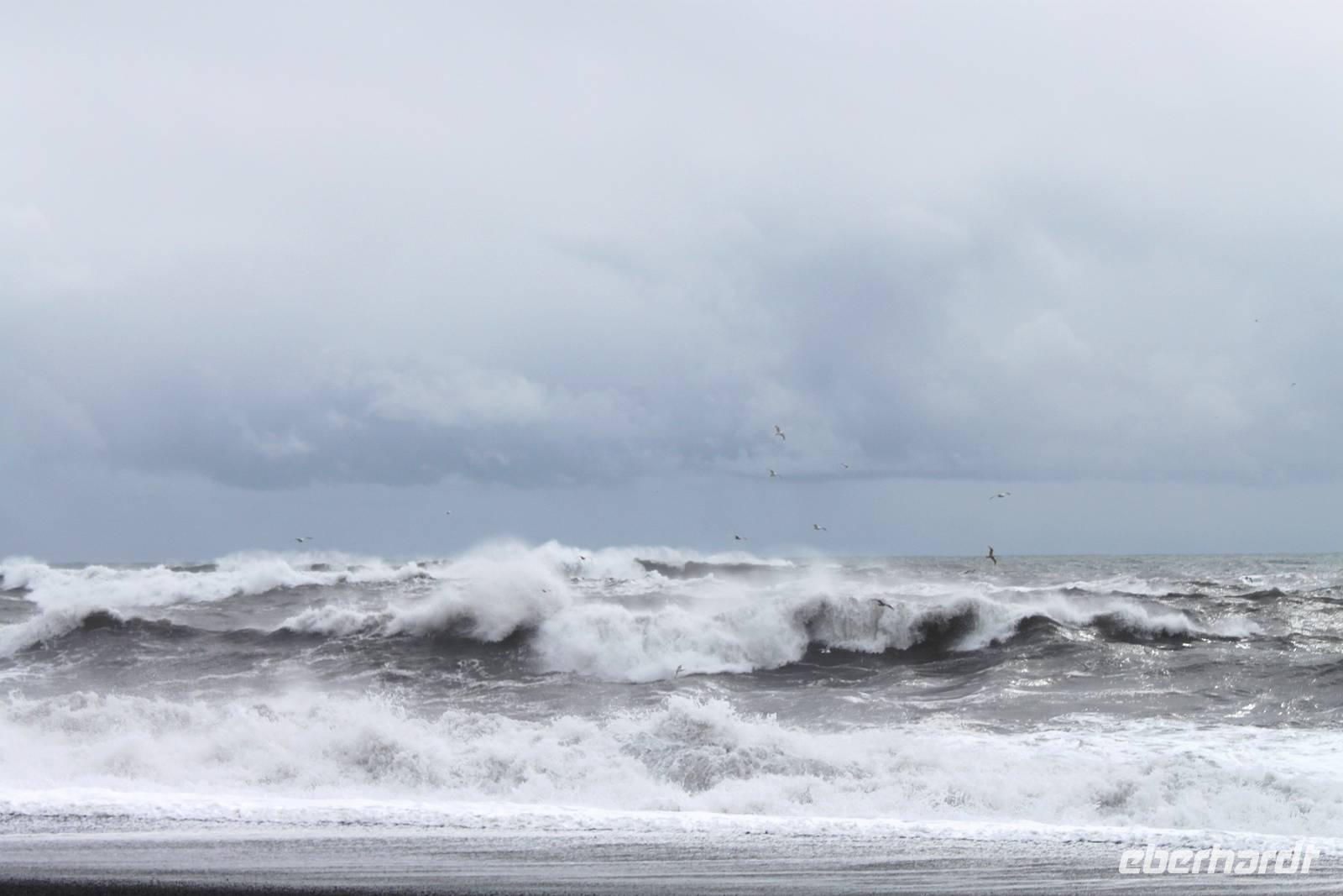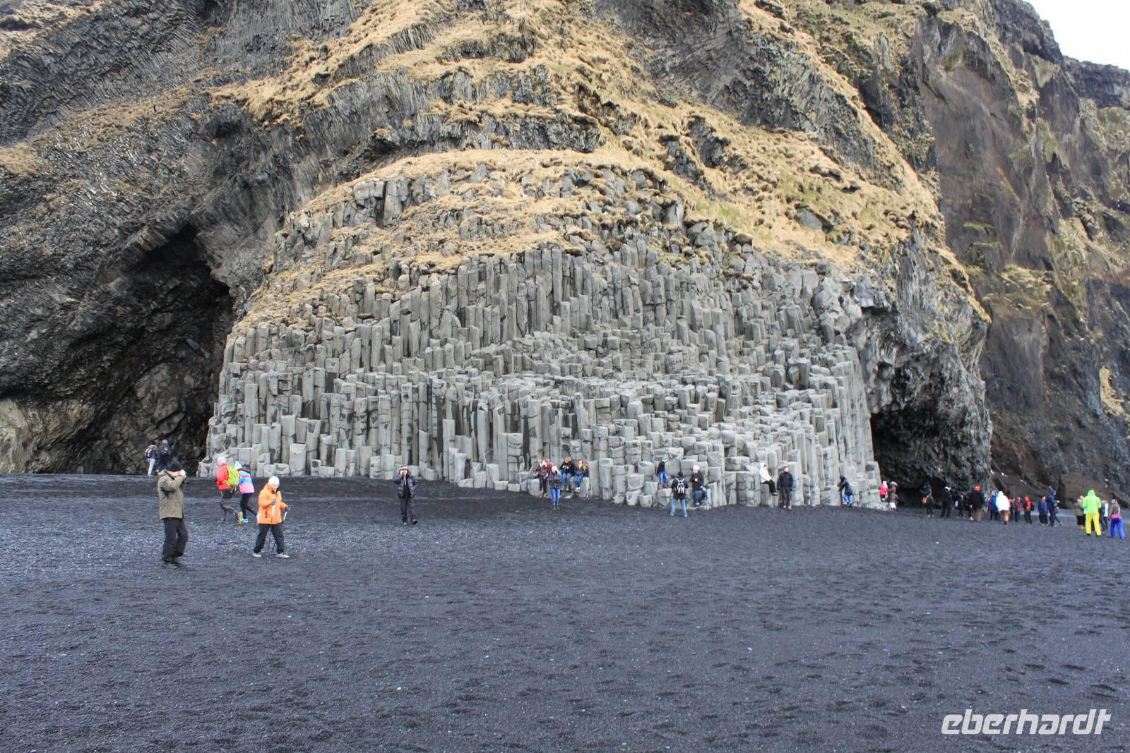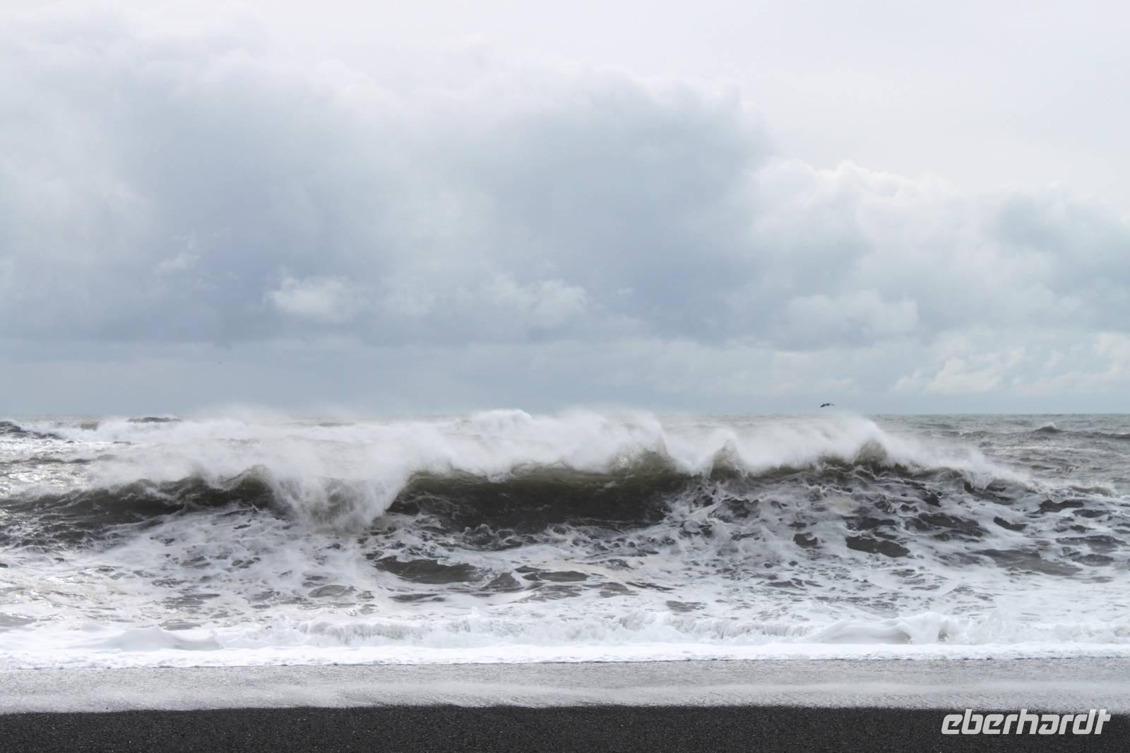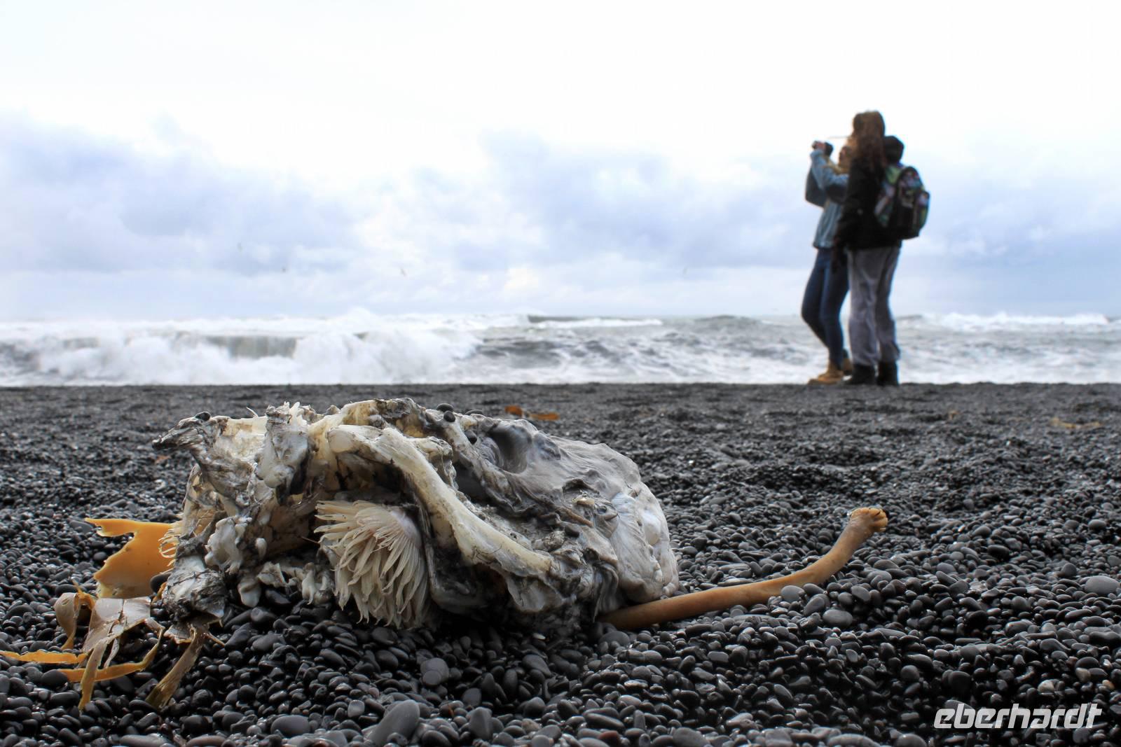 An diesem Tag besuchten wir Islands Südküste. Der Eyjafjallajökull, der 2010 für großes Aufsehen sorgte, war unser erstes Ziel für ein schnelles Foto. An einem Rastplatz habe ich vorher Trockenfisch gekauft, den wir auf der Fahrt zum Sólheimajökull probieren. Er schmeckt besser als gedacht, wird aber sich nicht unser Leibgericht. Der Sólheimajökull ist eine etwa zehn Kilometer lange Gletscherzunge die uns alle beeindruckt hat. Mittags hielten wir im kleinen Örtchen Vík und stärkten uns bevor es weiter zum schwarzen Sandstrand ging. Das Meer tobte und man musste darauf achten, dass man genügend Abstand zum unberechenbaren Wasser hielt. Der etwas andere Strand strotzte mit seinen hohen Felsen nur so vor Schönheit.