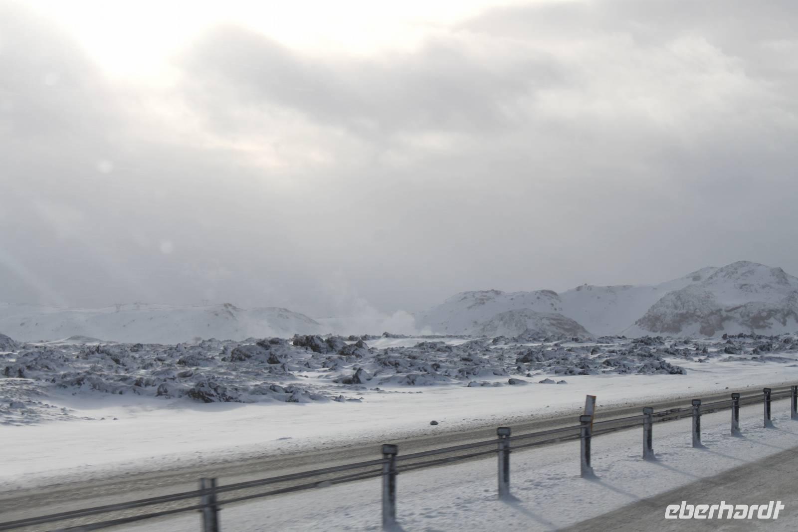 Das hellblaue Wasser kann man schon am Straßenrand sehen, bevor man überhaupt das Gelände der Lagune betritt. Einige entspannten sich im warmen Thermalwasser und andere nutzten die Zeit zum kleinen Spaziergang um die mondähnliche Landschaft aus Lavagestein zu erkunden.