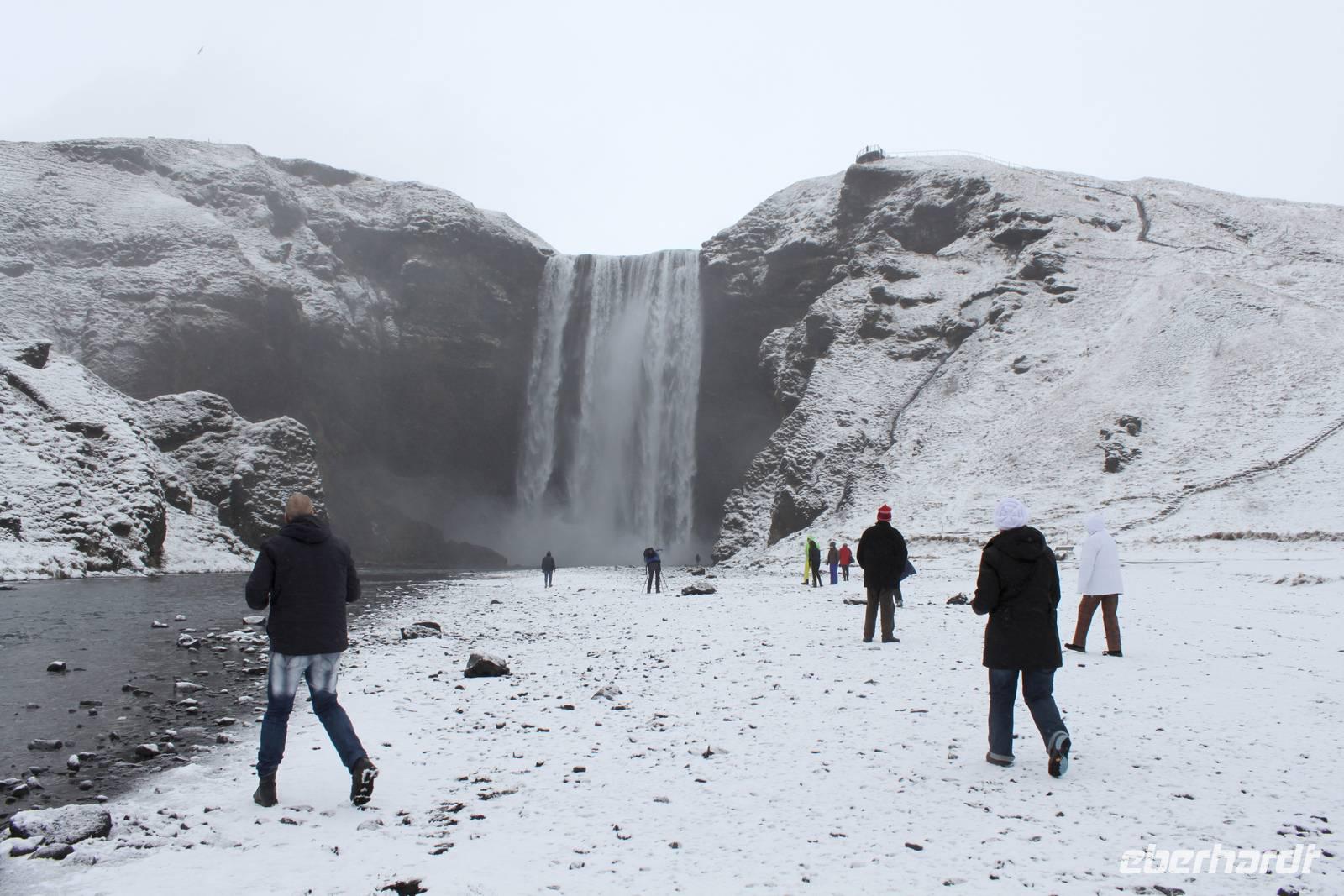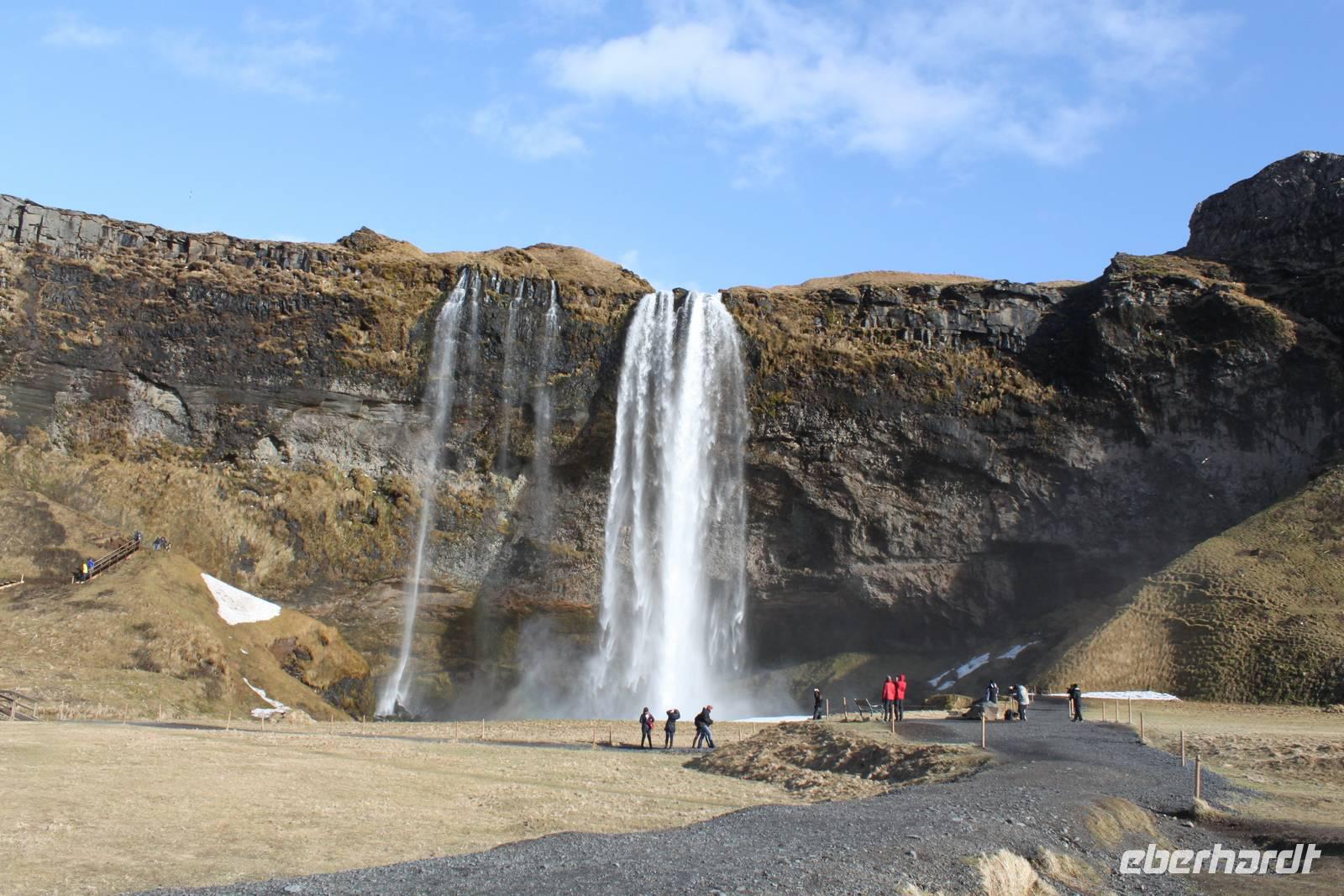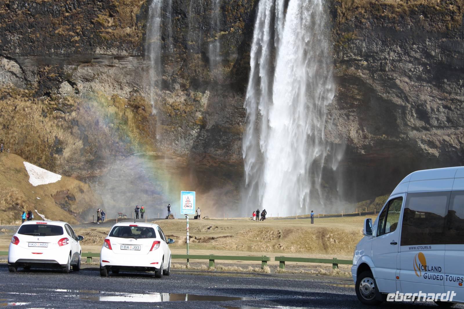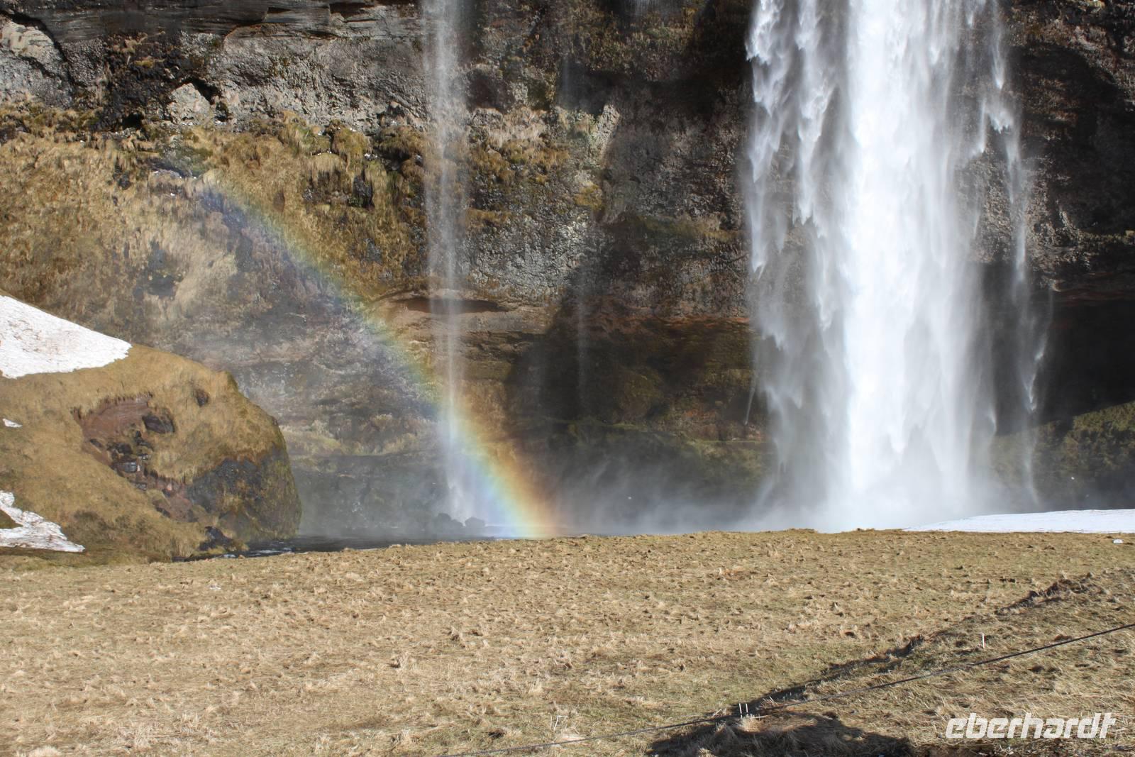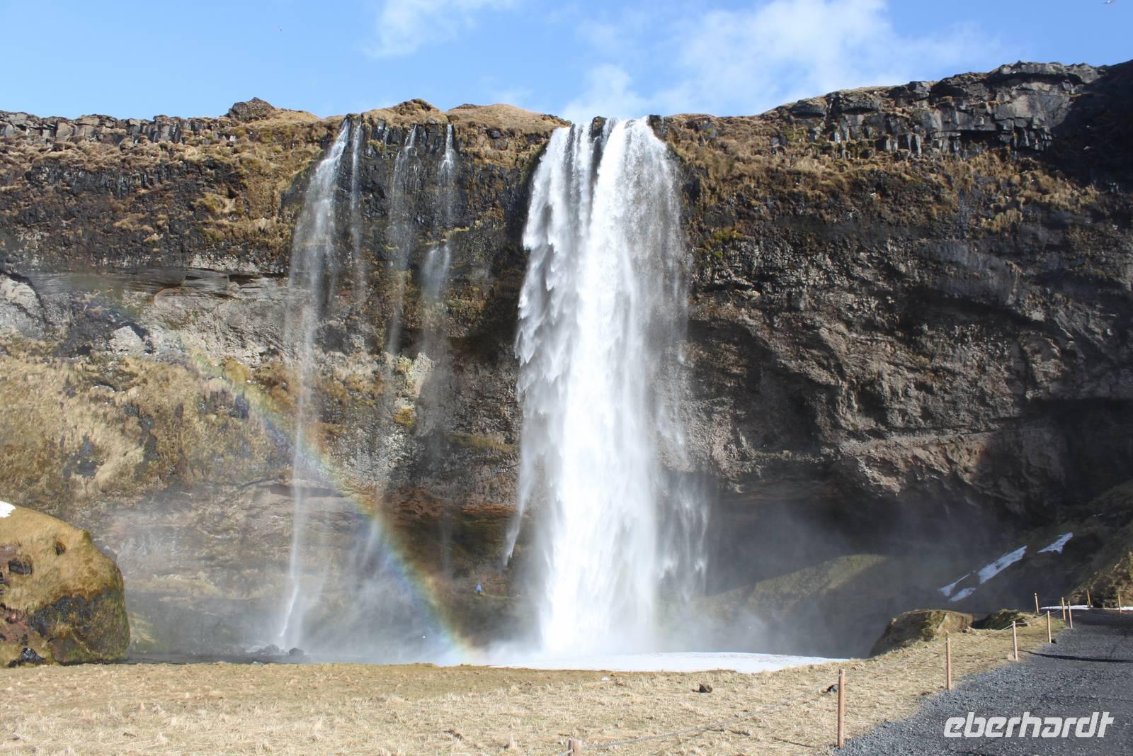 Wieder am Eyjafjallajökull zog es uns ins Thorvaldseyri Besucherzentrum, wo wir uns den kurzen Dokumentarfilm über die Familie, die am Fuß des Vulkans wohnt, ansahen. Gefasst von der Geschichte ging es wieder in den Bus und zum letzten Naturspektakel - dem Seljalandsfoss. Mittlerweile hat es aufgehört zu schneien und so zierte ein Regenbogen die Wassermassen die in die Tiefe stürzten.