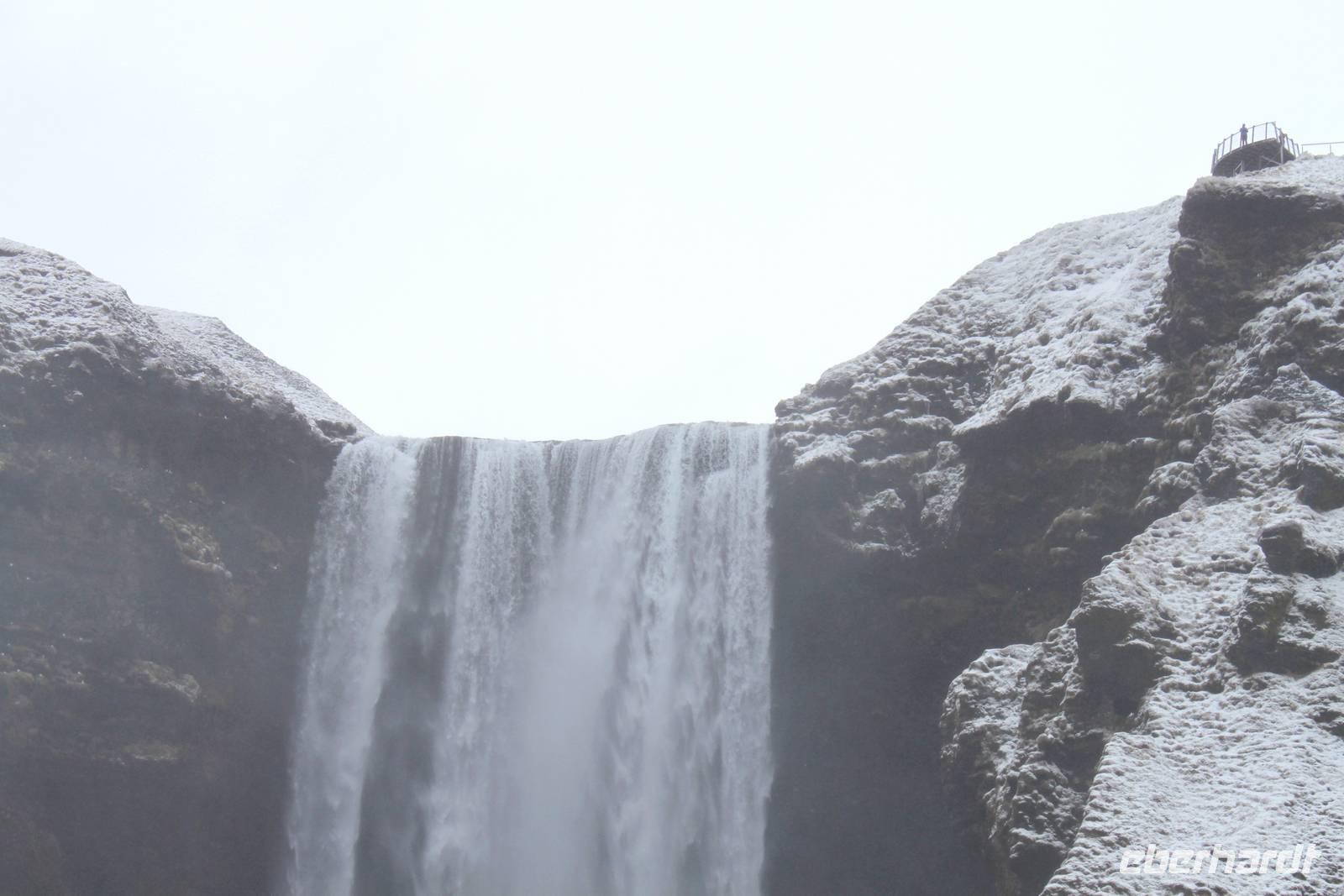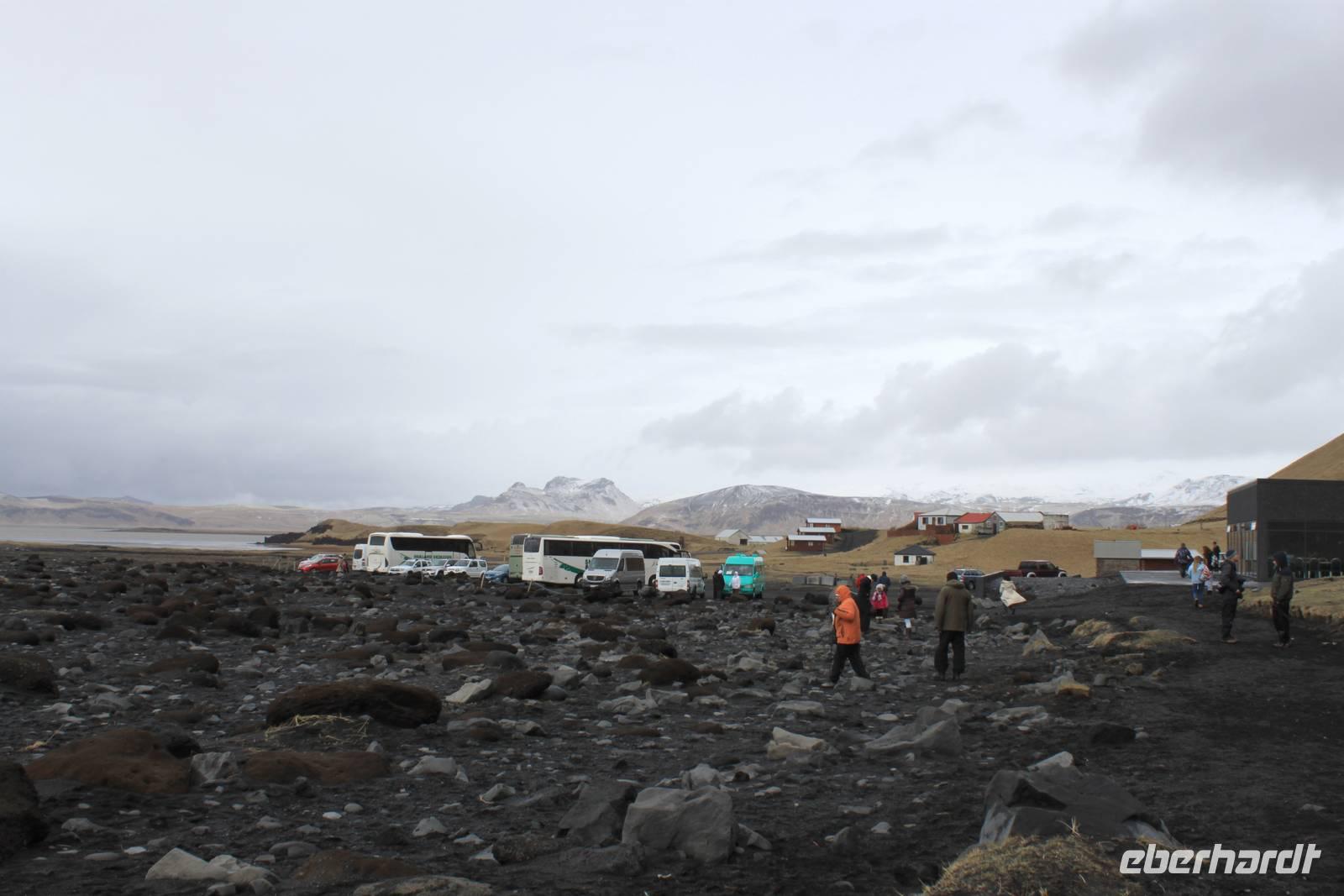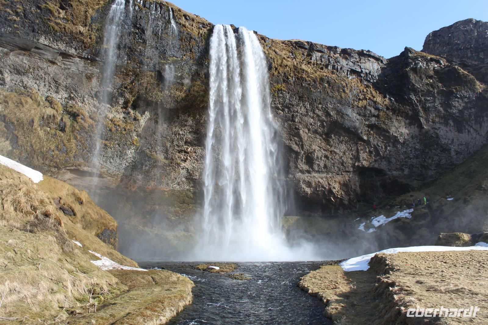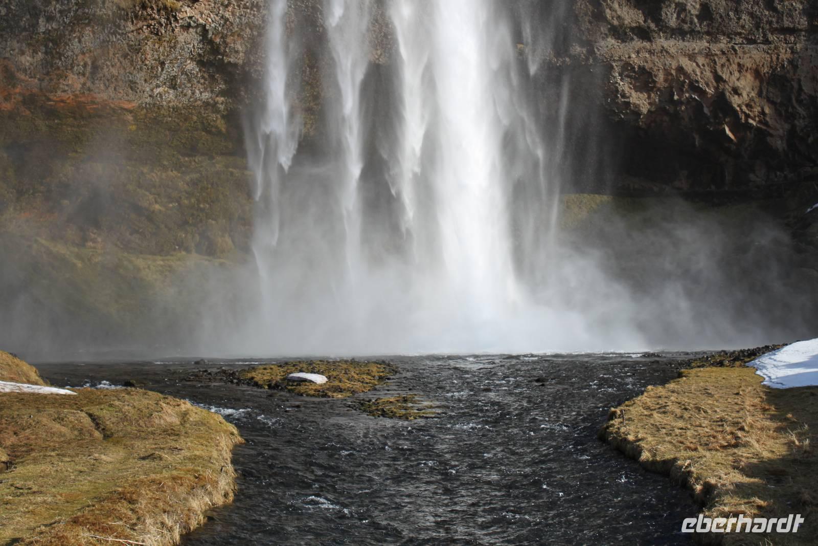 Wieder am Eyjafjallajökull zog es uns ins Thorvaldseyri Besucherzentrum, wo wir uns den kurzen Dokumentarfilm über die Familie, die am Fuß des Vulkans wohnt, ansahen. Gefasst von der Geschichte ging es wieder in den Bus und zum letzten Naturspektakel - dem Seljalandsfoss. Mittlerweile hat es aufgehört zu schneien und so zierte ein Regenbogen die Wassermassen die in die Tiefe stürzten.