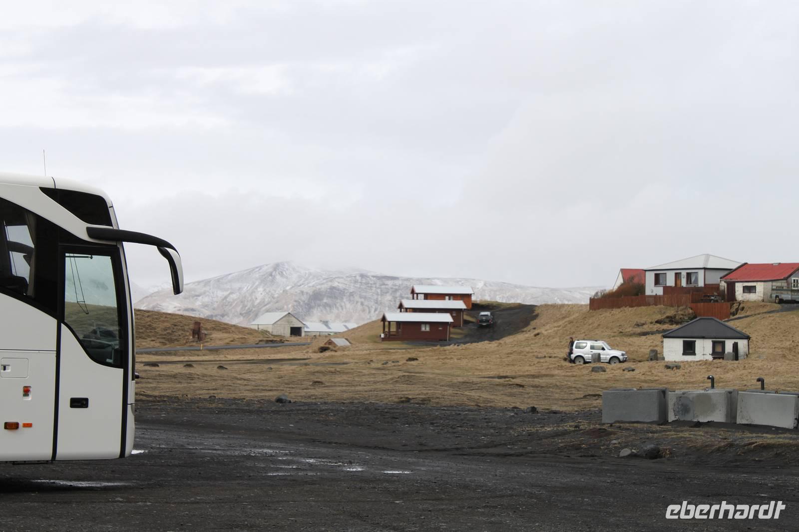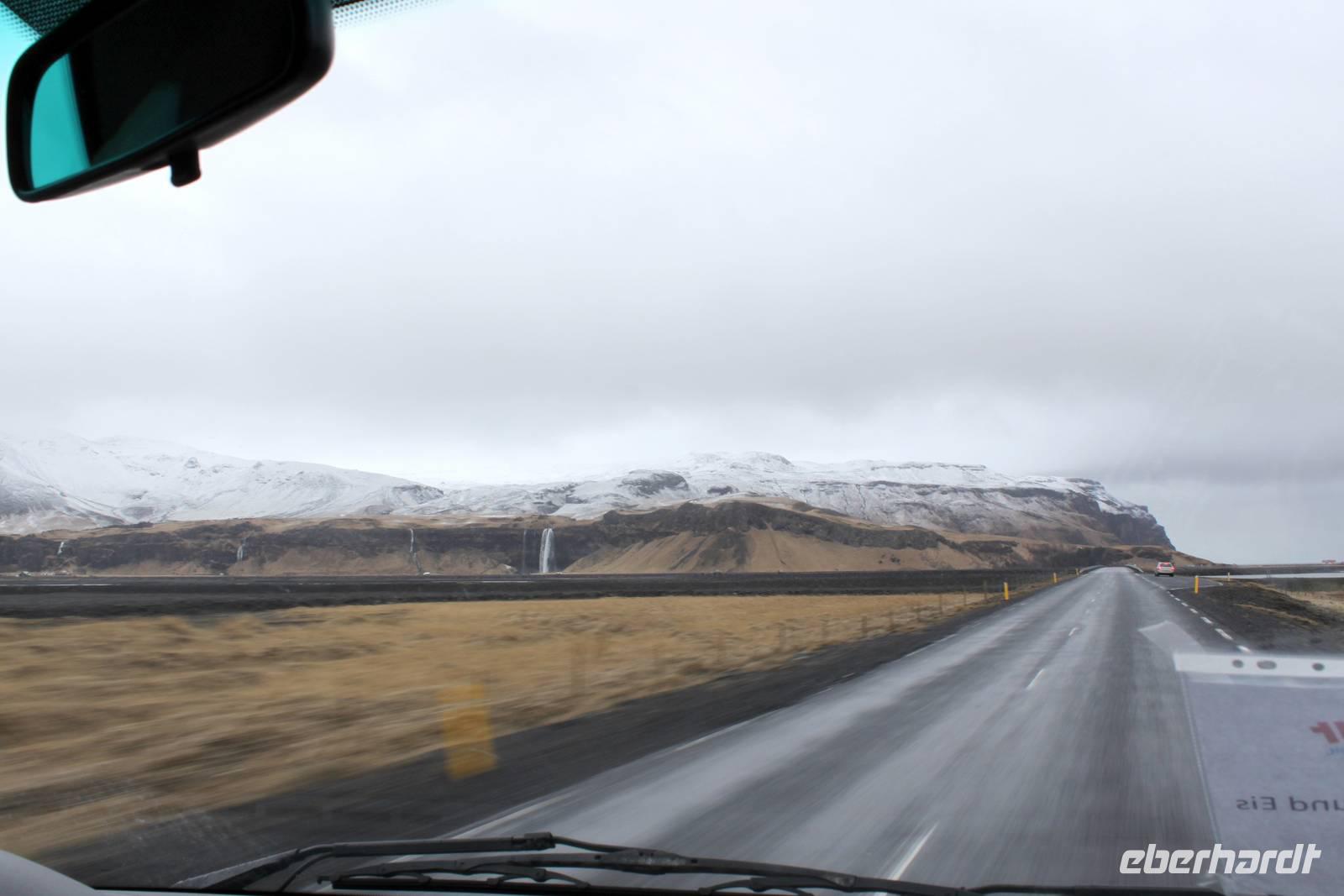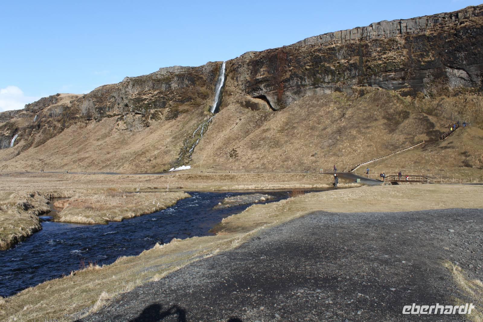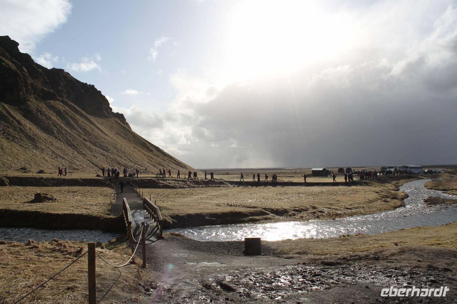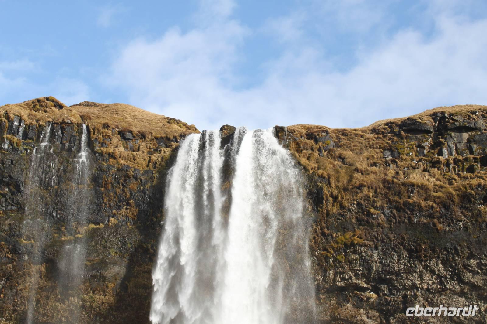 Wieder am Eyjafjallajökull zog es uns ins Thorvaldseyri Besucherzentrum, wo wir uns den kurzen Dokumentarfilm über die Familie, die am Fuß des Vulkans wohnt, ansahen. Gefasst von der Geschichte ging es wieder in den Bus und zum letzten Naturspektakel - dem Seljalandsfoss. Mittlerweile hat es aufgehört zu schneien und so zierte ein Regenbogen die Wassermassen die in die Tiefe stürzten.