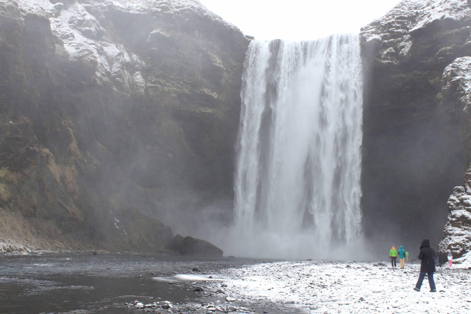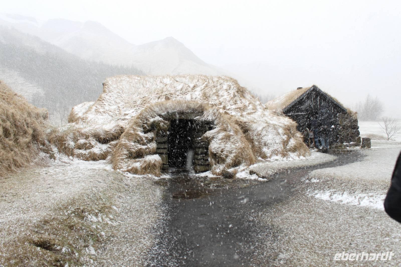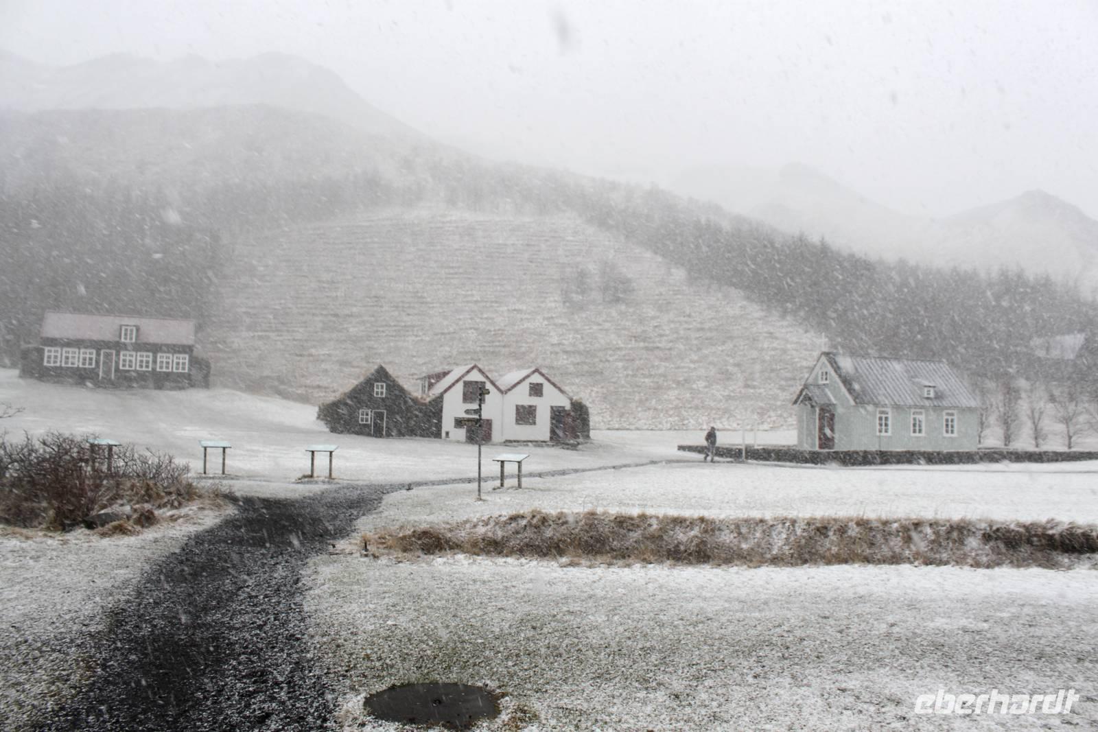 Im Heimatmuseum Skógafoss erhielten wir eine kurze aber interessante Führung auf Deutsch und erkundeten danach das große Gelände drinnen und draußen auf eigene Faust. Das Wetter hat wieder umgeschlagen und so fing es plötzlich an zu schneien. Am Skógafoss angekommen ließ uns der atemberaubende Wasserfall die Kälte vergessen.