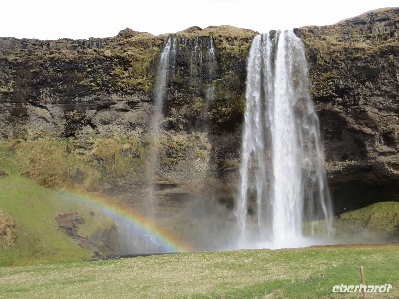 Letzter Stopp für heute war der Seljalandsfoss. Da es wieder kurz geregnet hatte und als wir ausstiegen die Sonne schien, konnten wir diesen Wasserfall mit einem wunderbaren Regenbogen erleben. Wir verkosteten einen Brennevin, den typischen Kümmelschnaps und etwas Trockenfisch, bevor wir uns auf den Rückweg nach Reykjavik begaben.