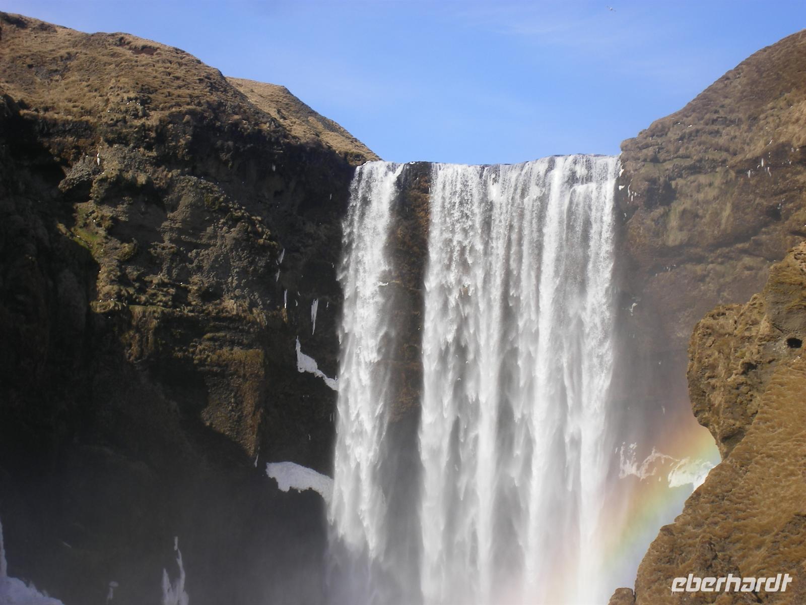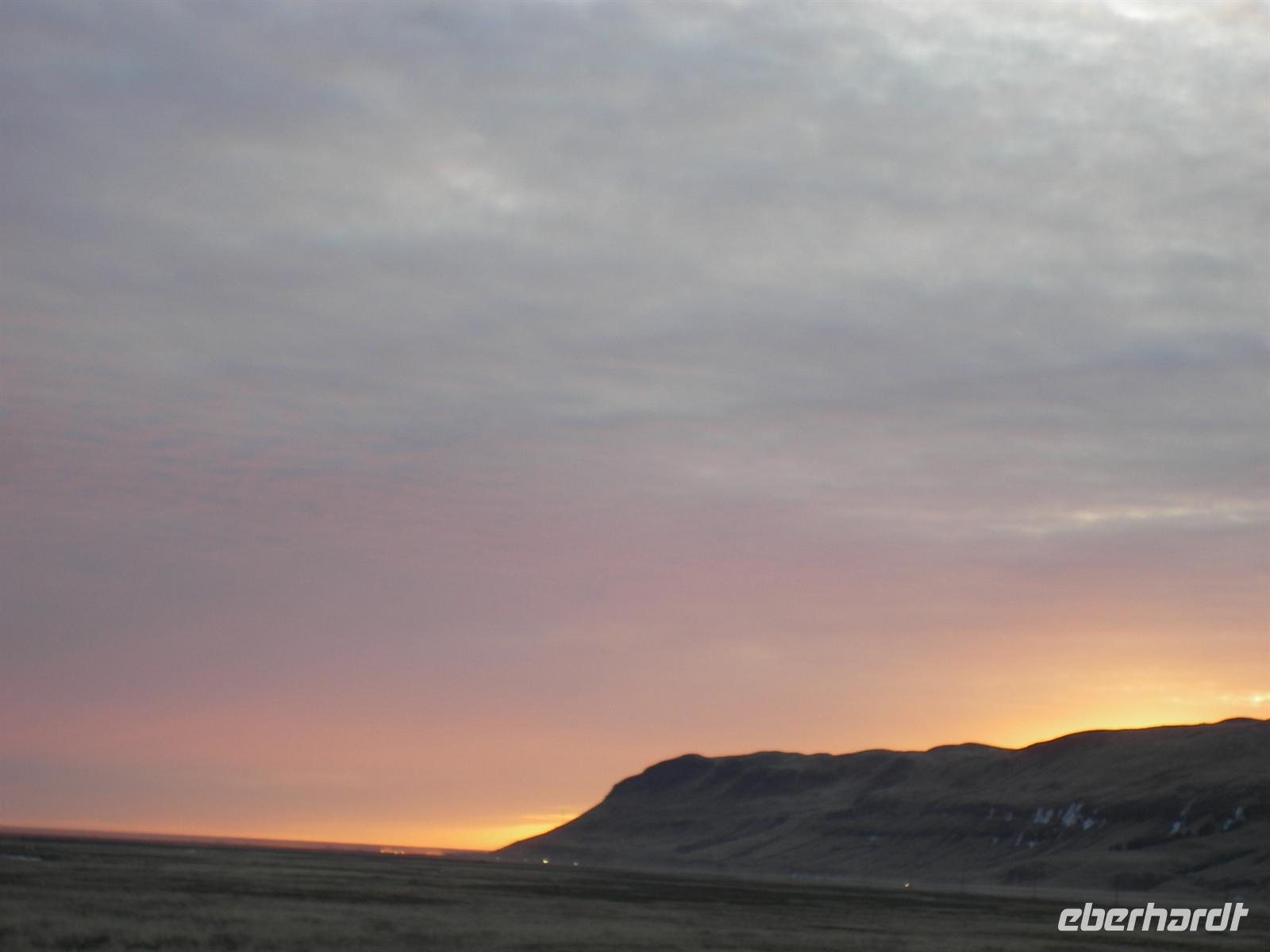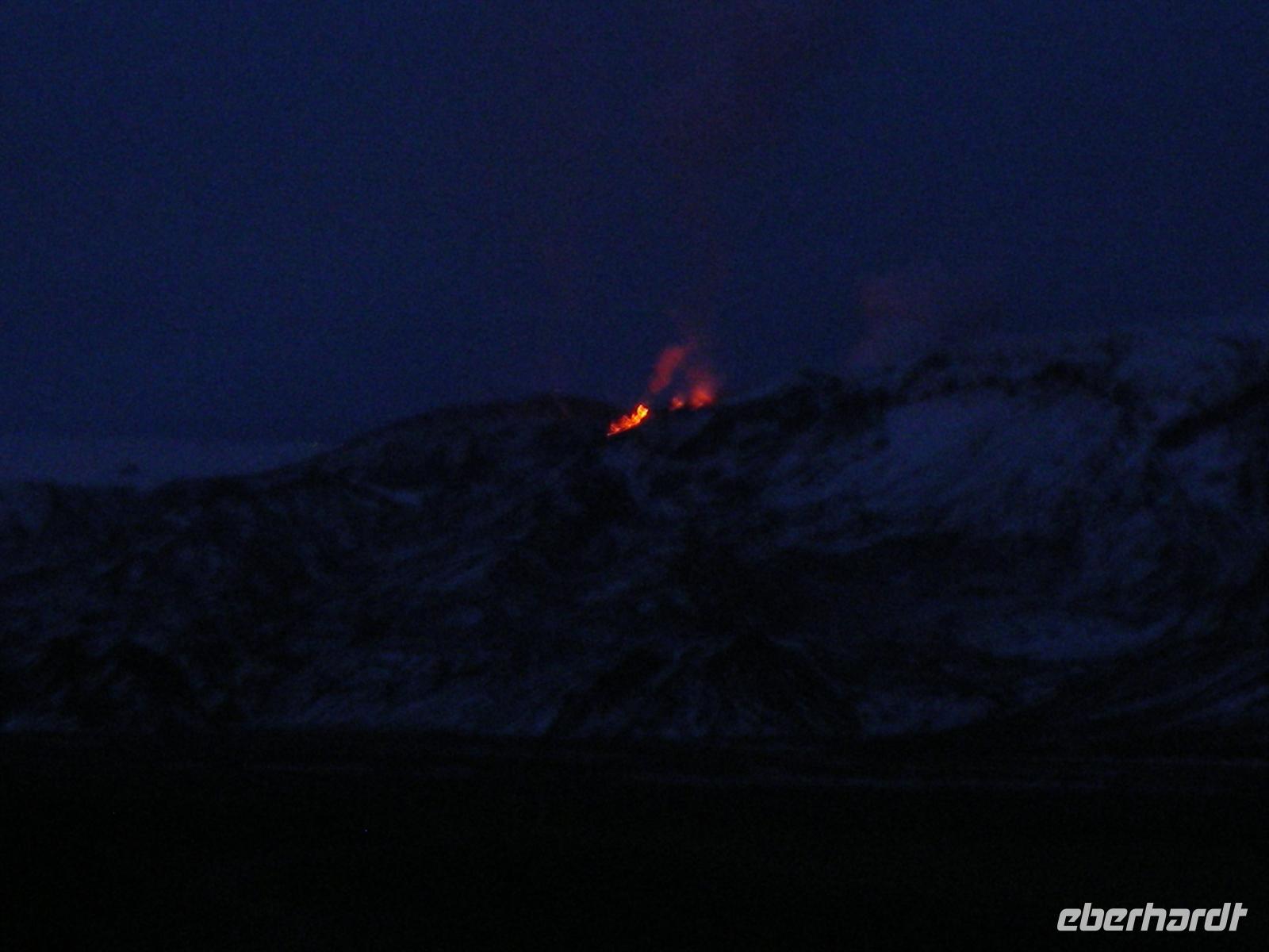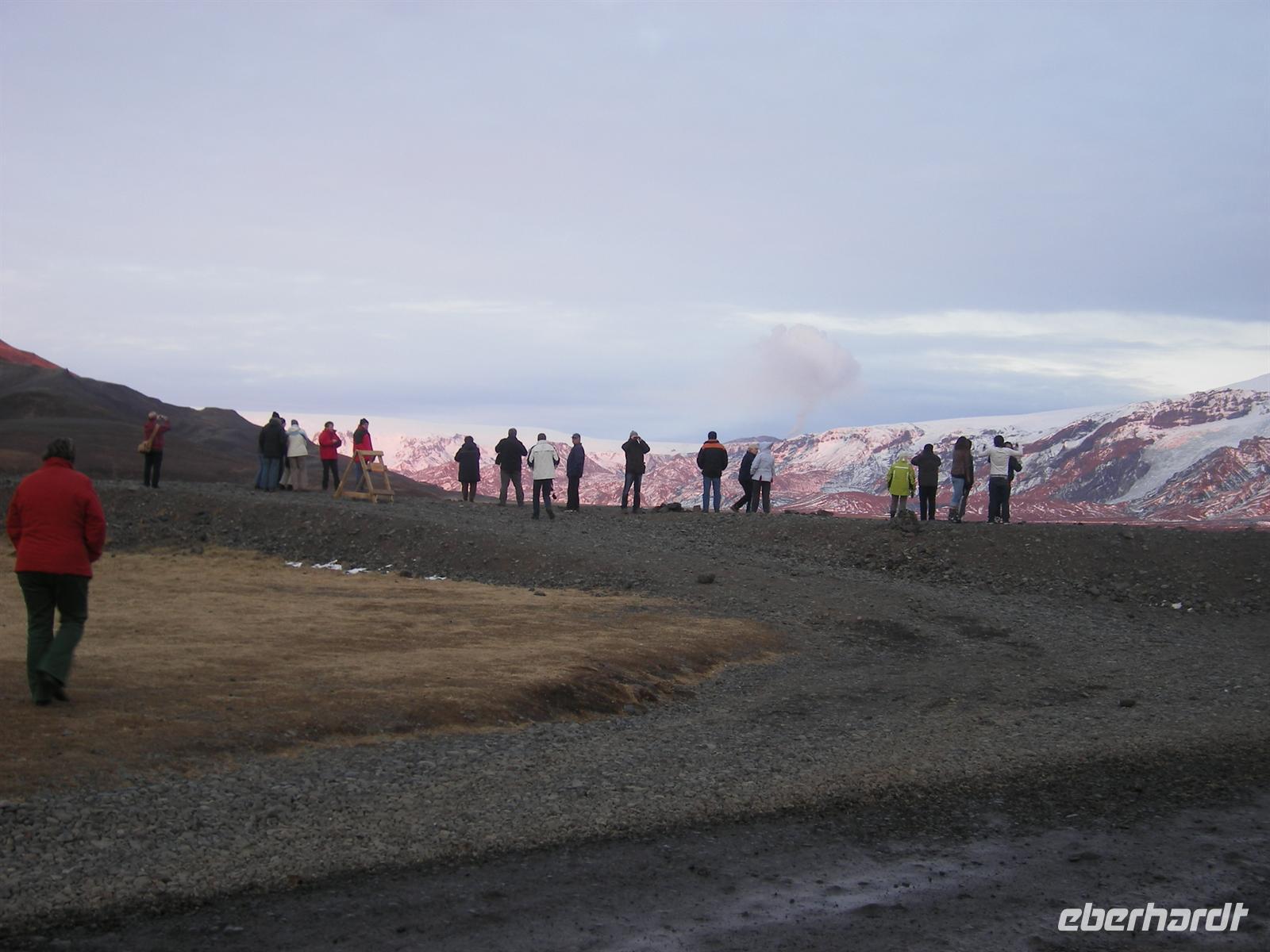 Gigantische Wassermassen strömen in die Tiefe und da die Sonne sehr gut stand sahen wir auch noch einen wunderschönen Regenbogen. Da einige Wochen bevor wir nach Island flogen, der Vulkan ausbrach und viele Vulkaninteressierte in unsere Gruppe waren, wollten wir natürlich den Vulkan sehen, wann sieht man so was schon mal wieder? Nach langem diskutieren mit der örtlichen Reiseleitung fiel uns doch noch eine Lösung ein, dass wir den Vulkan besichtigen können. Eigentlich sollten wir gegen 18.30 Uhr die Heimreise antreten, aber wir warteten bis 19.30 Uhr auf unser Raststätte, die wir bereits am morgen angefahren haben um gemeinsam mit anderen Bussen zum Vulkan zu fahren. Die Gäste die an diesem Zusatzausflug nicht teilnehmen wollten wurden mit einem kleinen Bus abgeholt und zurück in das Hotel gebracht. So trafen wir gegen 20.15 Uhr am Vulkan ein, ganz dunkel war es noch nicht, so konnte man die gigantische Lava noch nicht sehen. Je dunkler es wurde desto mehr sah man, da es sehr kalt war und wir gern noch eine besser Sicht auf den Vulkan haben wollten beschlossen einige Gäste und ich ein kleinen Spaziergang Richtung Vulkan zu machen. Dieser dauerte pro Strecke ca. 45 Minuten. Wir stiegen auf einen kleinen Berg, von dort aus hatte man eine wunderbare Sicht auf den Vulkan, da einige Gäste noch ein Fernglas mitgebracht hatten konnte man beim hindurchschauen sehr gut beobachten wie die Lava immer wieder nach oben spritzte. Dies war wirklich ein einmaliger Zusatzausflug der sich sehr gelohnt hat. Gegen 22.00 Uhr fuhren wir zu unserem Hotel zurück. Die Fahrt dauerte noch mal über 2 Stunden, danach fielen alle erschöpft vom vielen Laufen und von den vielen Eindrücken ins Bett.