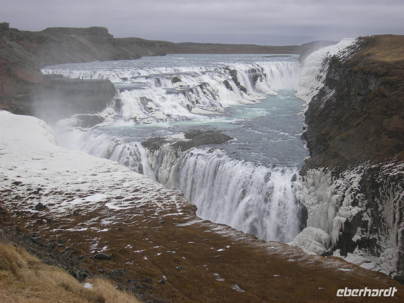 Gestärkt vom Frühstück fuhren wir 09.30 Uhr nach Pingvellir. Hier befindet sich die Nahtstelle zwischen eurasischer und amerikanischer Kontinentalplatte. Die Platten bewegen sich jährlich um 1 cm in jede Richtung. Im dazugehörigen Informationszentrum erhielten wir noch wichtige Details über die Plattenbewegung. Anschließend fuhren wir nach unten um von dort die einmalige Landschaft zu fotografieren. Weiter ging unsere Fahrt nach Gullfoss, dem wohl bekanntesten Wasserfall Islands.