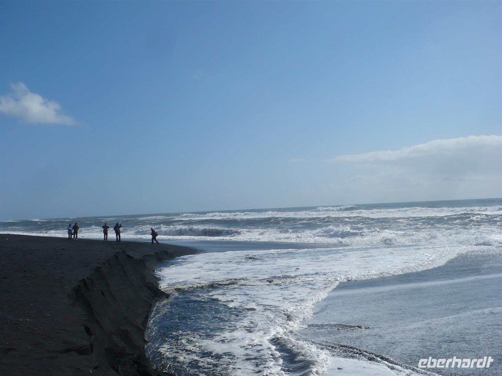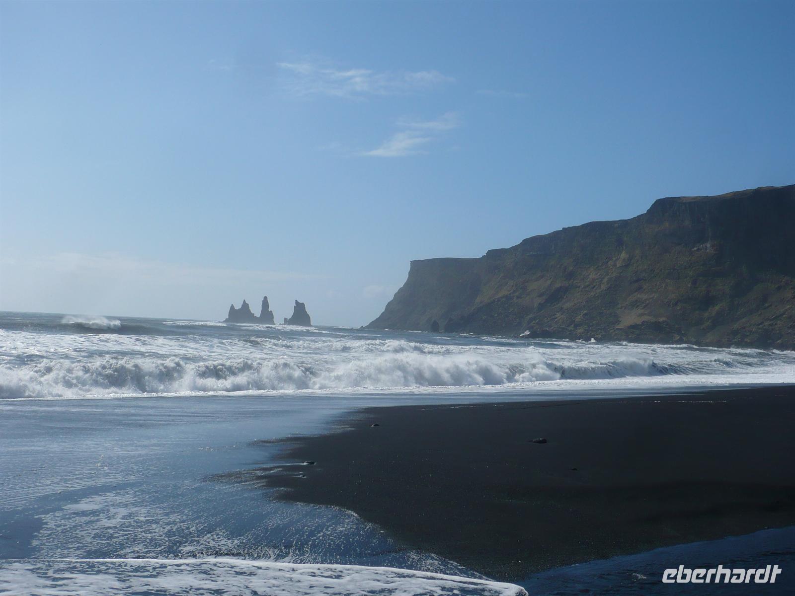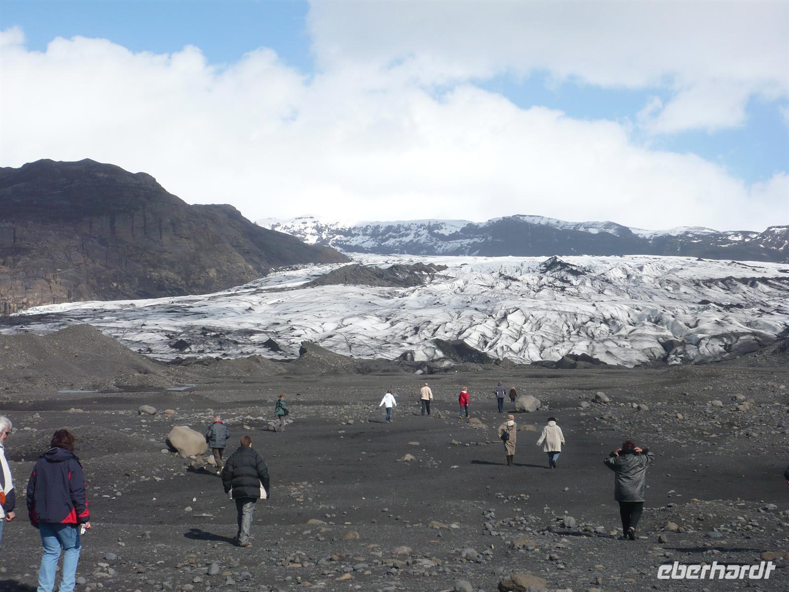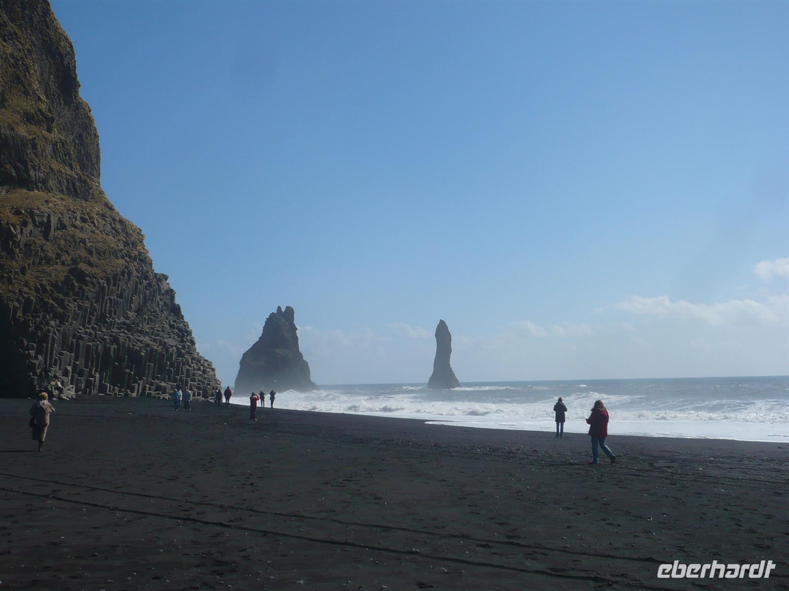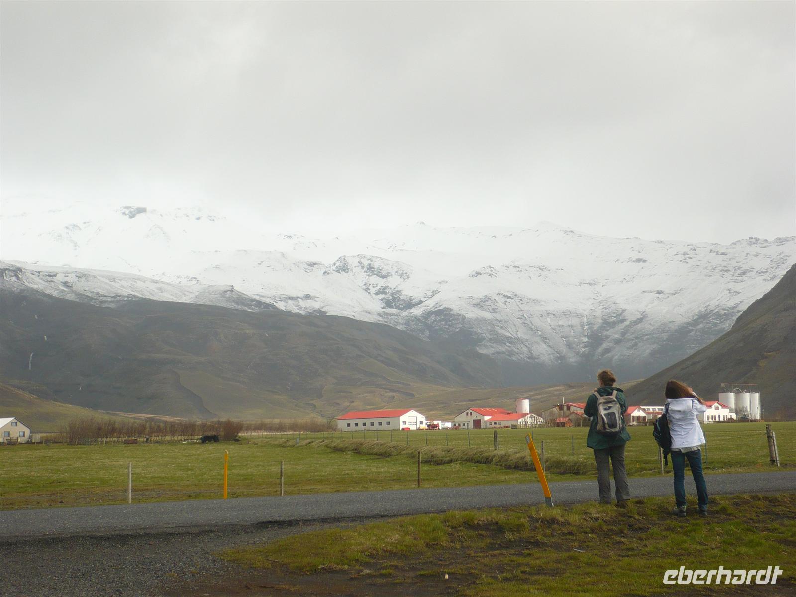 Voller Vorfreude starteten wir in diesen Tag mit einem guten Frühstück. Während der Fahrt zur Südküste Islands erzählte uns Rosa isländische Sagas. Unser erster Stopp ist am Besuchermuseum des Eyjafjallajökull. Hier wird in einem bewegendem Kurzfilm die Geschichte einer Bauernfamilie erzählt, die den Ausbruch des Vulkanes am 20. März 2011 hautnah miterlebt haben. Zur Mittagszeit erreichten wir dann das Städtchen Vik. Hier hatten wir das erste mal die Gelegenheit durch den schwarzen Lava Strand am Meer entlang zu spazieren. Doch der schöne Strandabschnitt wurde noch übertrumpft. Als wir uns nur ein paar Kilometer von der südlichsten Stadt Islands entfernten, eröffnete sich uns ein traumhafter Blick auf einen der schönsten Strände der Welt. Der Strand bei Dyrholaey (Türlochinsel) zeichnet sich durch seine schroffen Felsformationen wie die schwarzen Felsnadeln aus. Die Legende berichtet, dass Trolle ein Schiff ans Land bringen wollten, leider missglückte Ihnen dies und so worden sie versteinert. Am Nachmittag besuchten wir dann, dass Sógar-Museums. Historische Lehmhütten und eine interessante Ausstellung ließen uns in die Vergangenheit der Insel blicken. Auf unserer Rückfahrt hielten wir an den beeindruckenden Wasserfällen Skógafoss und Seljalandsfoss.