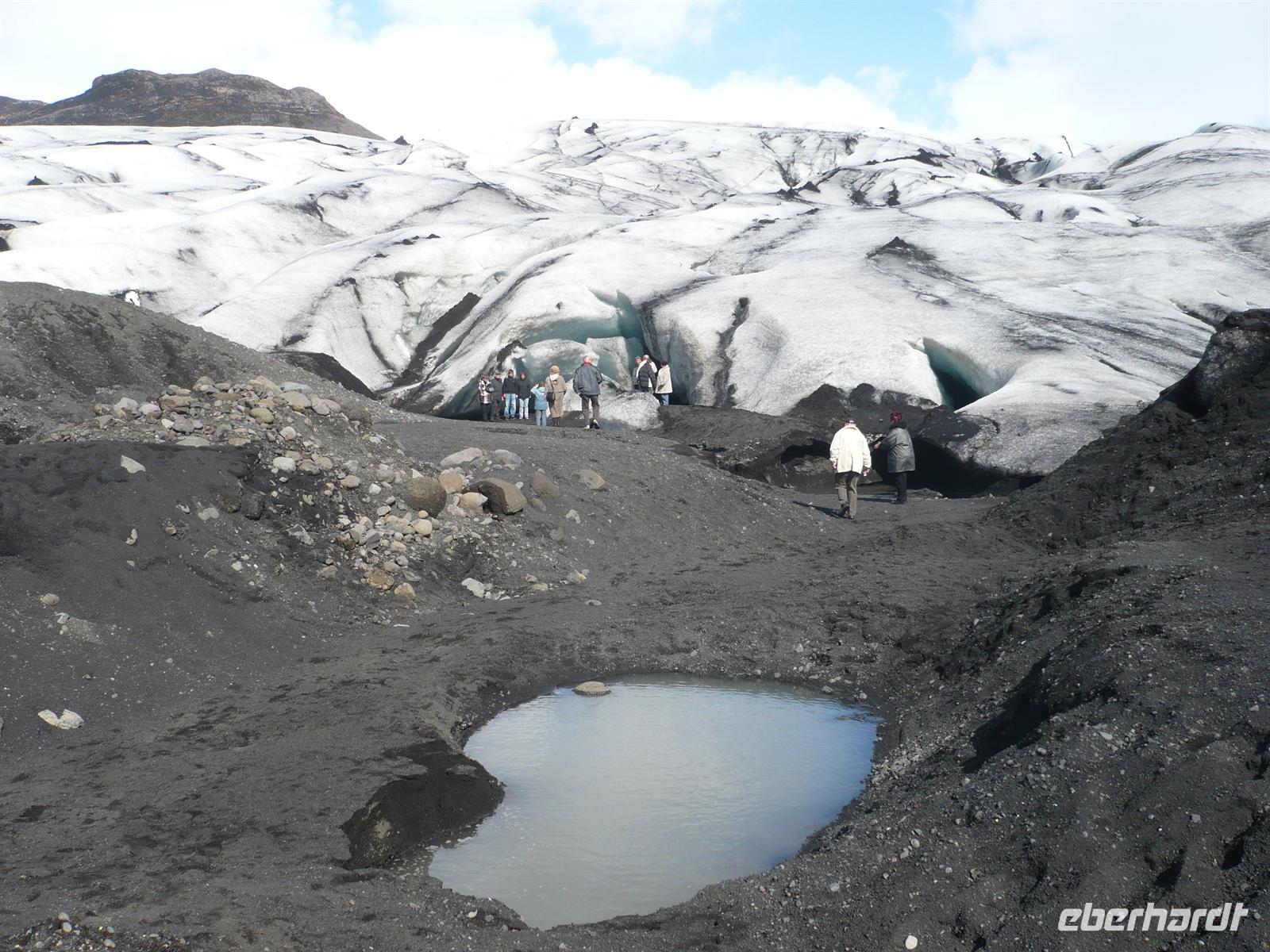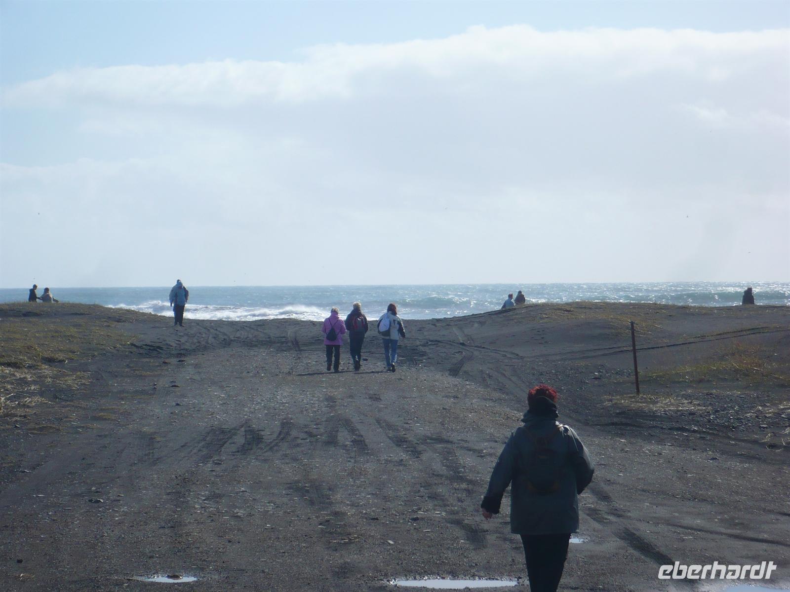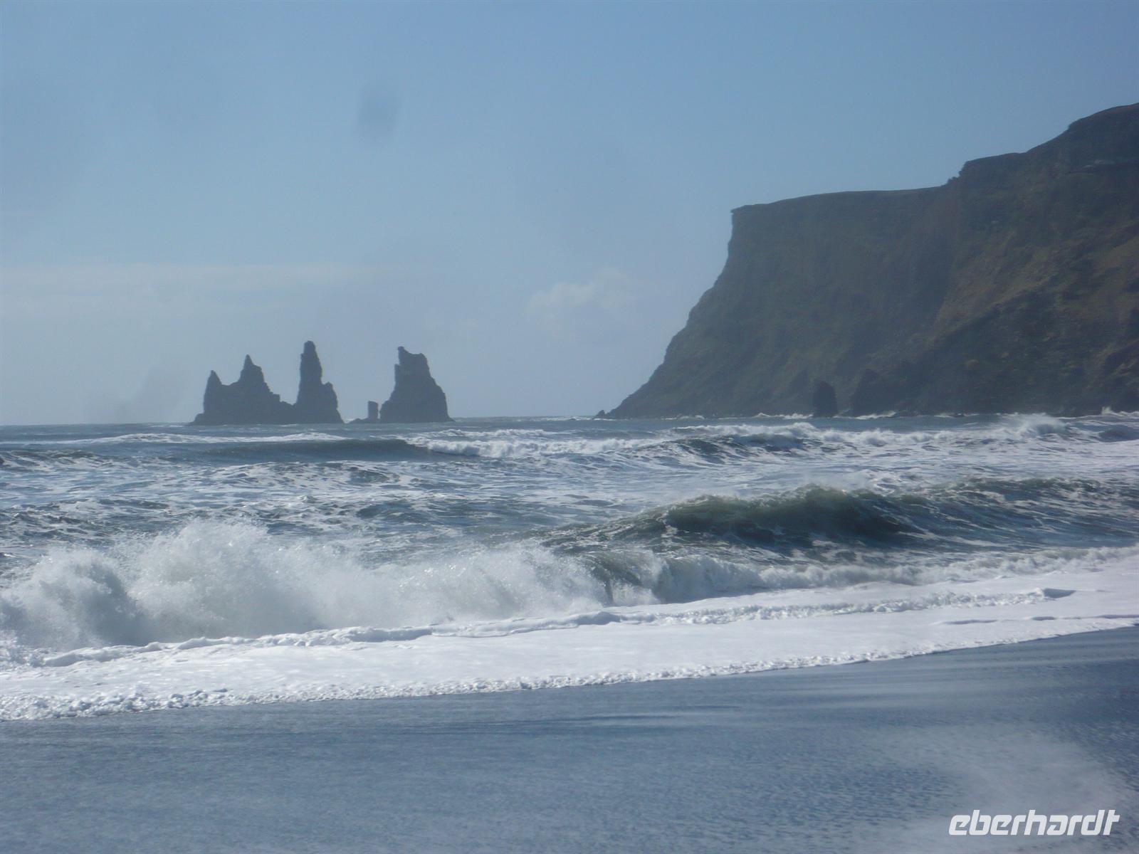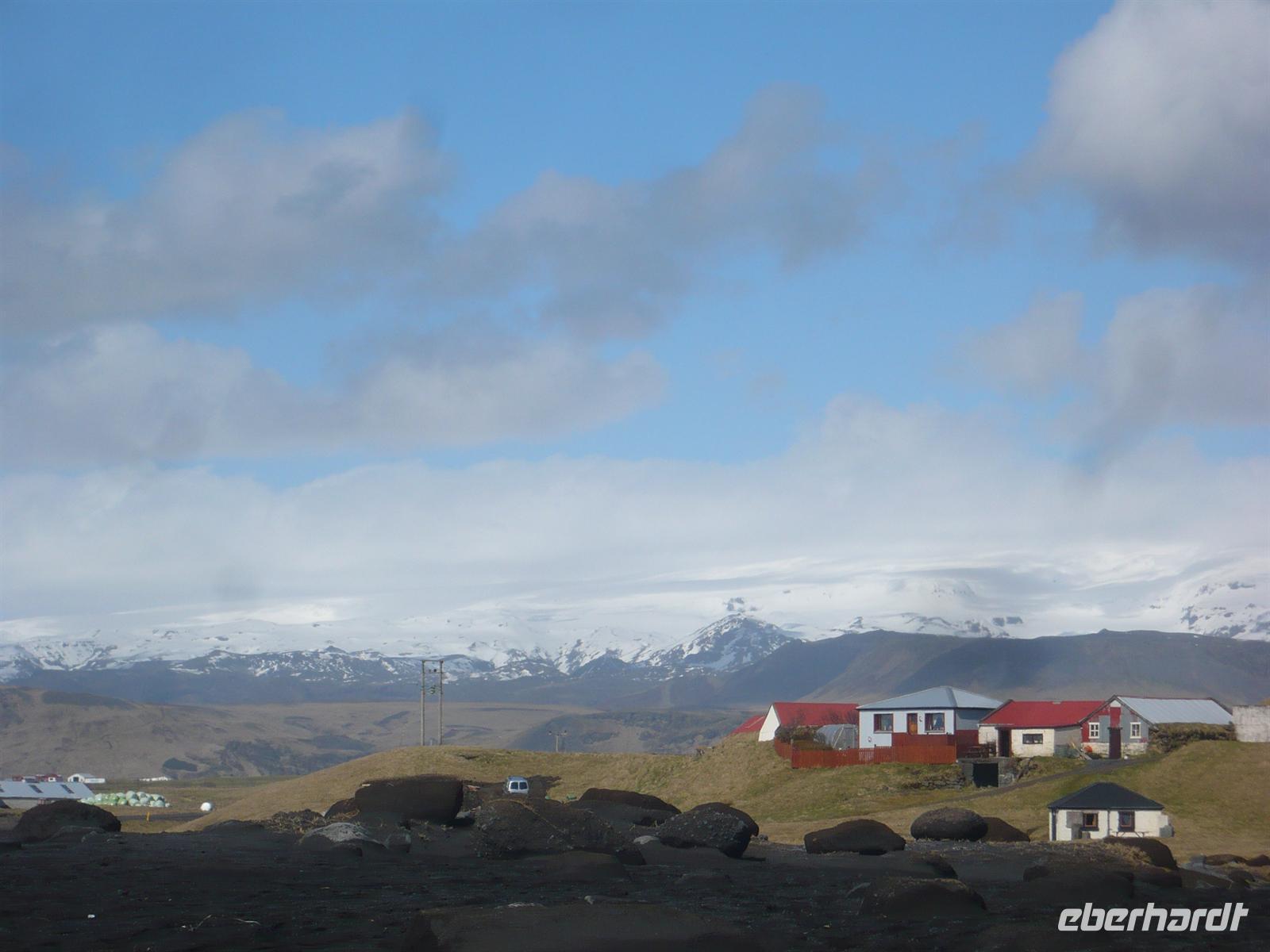Voller Vorfreude starteten wir in diesen Tag mit einem guten Frühstück. Während der Fahrt zur Südküste Islands erzählte uns Rosa isländische Sagas. Unser erster Stopp ist am Besuchermuseum des Eyjafjallajökull. Hier wird in einem bewegendem Kurzfilm die Geschichte einer Bauernfamilie erzählt, die den Ausbruch des Vulkanes am 20. März 2011 hautnah miterlebt haben. Zur Mittagszeit erreichten wir dann das Städtchen Vik. Hier hatten wir das erste mal die Gelegenheit durch den schwarzen Lava Strand am Meer entlang zu spazieren. Doch der schöne Strandabschnitt wurde noch übertrumpft. Als wir uns nur ein paar Kilometer von der südlichsten Stadt Islands entfernten, eröffnete sich uns ein traumhafter Blick auf einen der schönsten Strände der Welt. Der Strand bei Dyrholaey (Türlochinsel) zeichnet sich durch seine schroffen Felsformationen wie die schwarzen Felsnadeln aus. Die Legende berichtet, dass Trolle ein Schiff ans Land bringen wollten, leider missglückte Ihnen dies und so worden sie versteinert. Am Nachmittag besuchten wir dann, dass Sógar-Museums. Historische Lehmhütten und eine interessante Ausstellung ließen uns in die Vergangenheit der Insel blicken. Auf unserer Rückfahrt hielten wir an den beeindruckenden Wasserfällen Skógafoss und Seljalandsfoss.