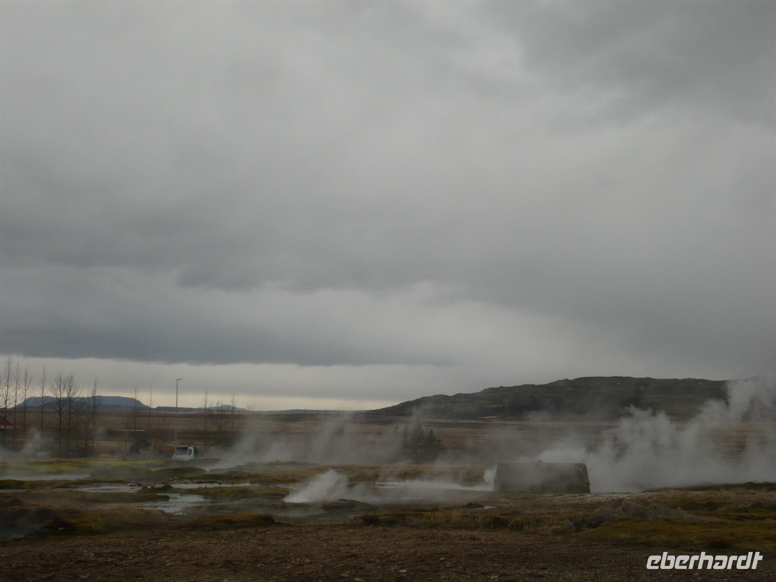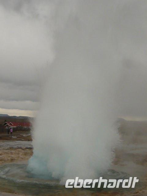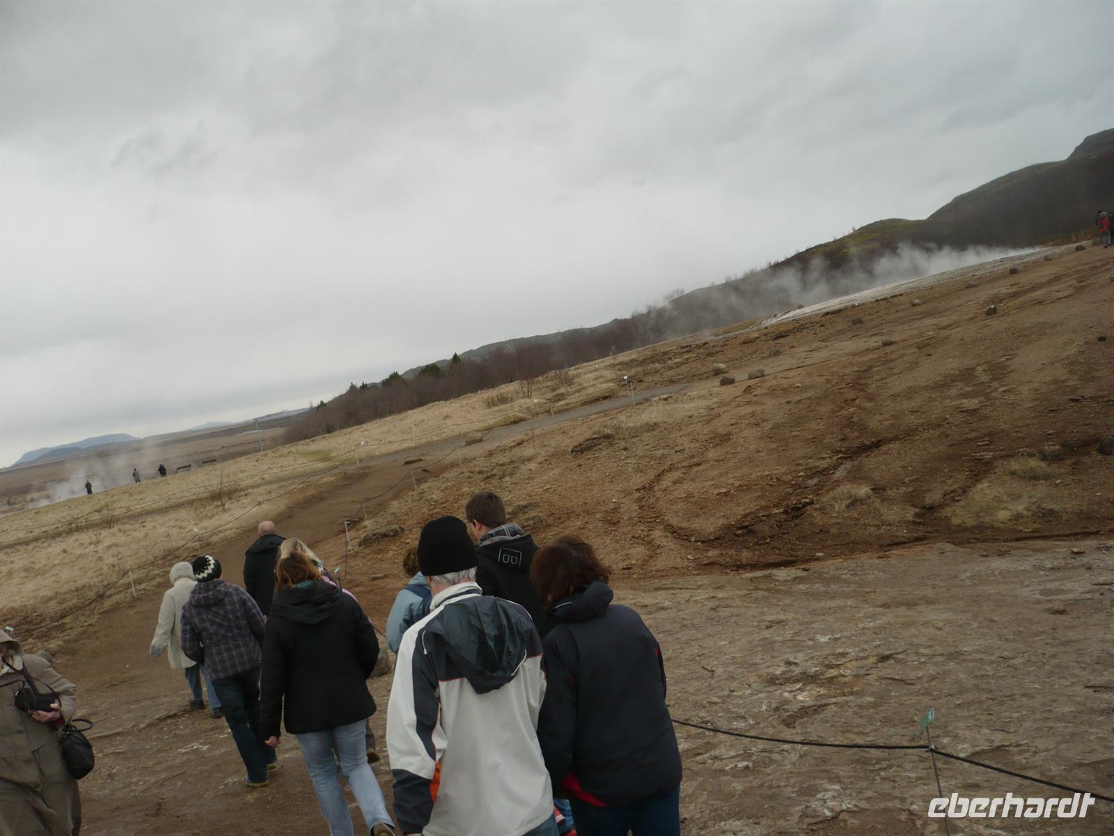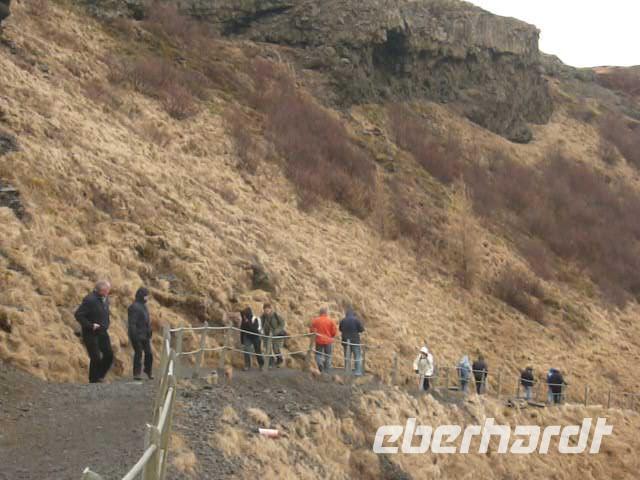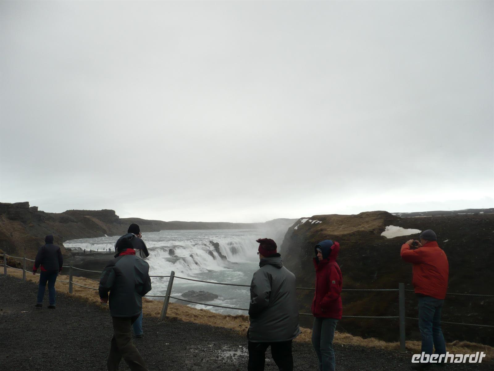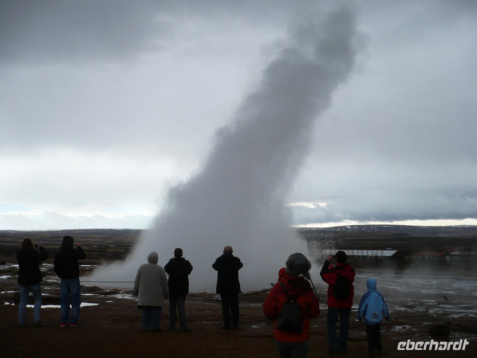 An diesem Tag erwartete uns „das“ Island aus Feuer und Eis. Heiße Quellen gibt es auf Island so einige, doch die wohl bekannteste ist der große Geysir, der Namensgeber für alle natürlichen Fontänen der Welt. Über ein dampfendes Warmwasserfell spazierten wir zum Geysir der in regelmäßigen Abständen ausbrach. Am Mittag erreichten wir dann den Goldenen Wasserfall „Gullfoss“, einer der schönsten, aber sicher der bekannteste Wasserfall Islands. Das Wasser fällt in 2 Kaskaden jeweils 90 Grad in eine Schlucht. Entlang des Thingvallavatn Sees fuhren wir weiter. Thingvellir ist sowohl ein Nationalpark, als auch die historischste Stätte auf Island. Hier wurde das Zusammenleben der Isländer geregelt, wurden die Gesetze beschlossen und Gericht (Thing) gehalten. Hier wurde 1944 die Republik Island ausgerufen. Von der Eurasischen Platte fuhren wir auf die Amerikanische Platte, denn im Nationalpark driften die Kontinentalplatten jährlich 2 Zentimeter auseinander und bilden ein Niemandsland. Ein Gläschen Brennevin und typischen Trockenfisch wärmte unsere Gemüter nach diesem verregneten Tag wieder auf. Am Abend hielt man noch eine besonders schöne Überraschung für uns bereit. Wir wurden mit Sandwichs und einem guten Glas Rotwein oder Isländischen Bier begrüßt und in den Kinosaal des Hotels gelotst. Der Film über Island zeigte uns noch mal all die schönen Naturspektakel die wir erleben durften, aber auch das, was wir in den wenigen Tagen nicht erleben konnten, aber auf unsere nächsten Island Reise unbedingt noch sehen müssen.
