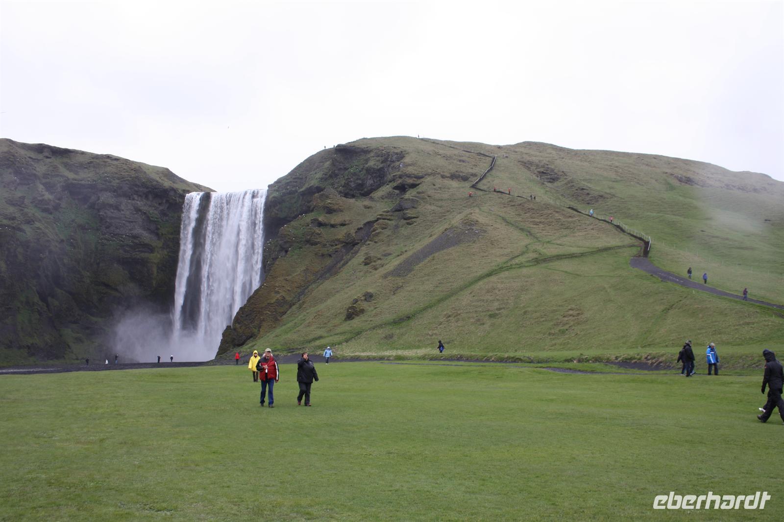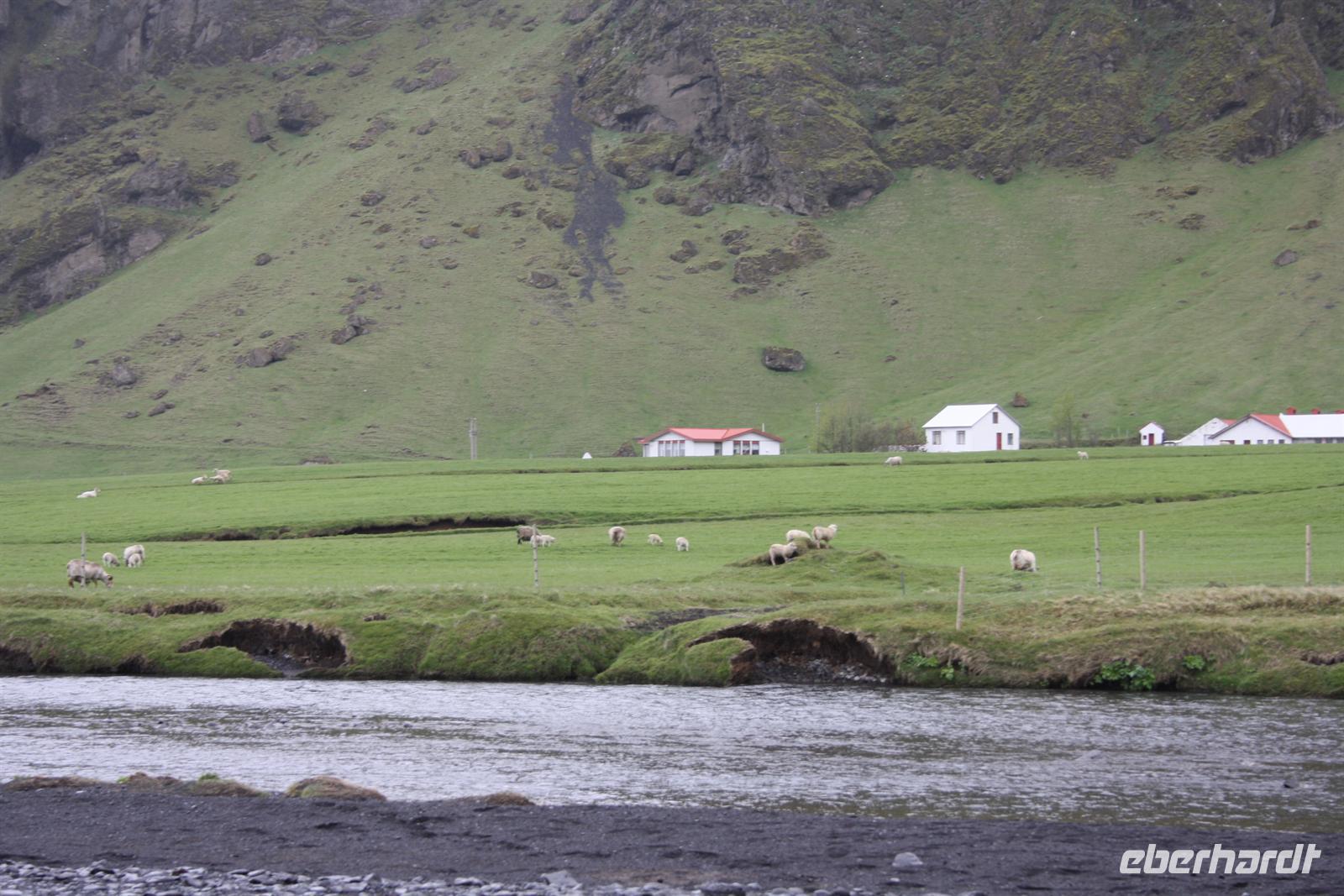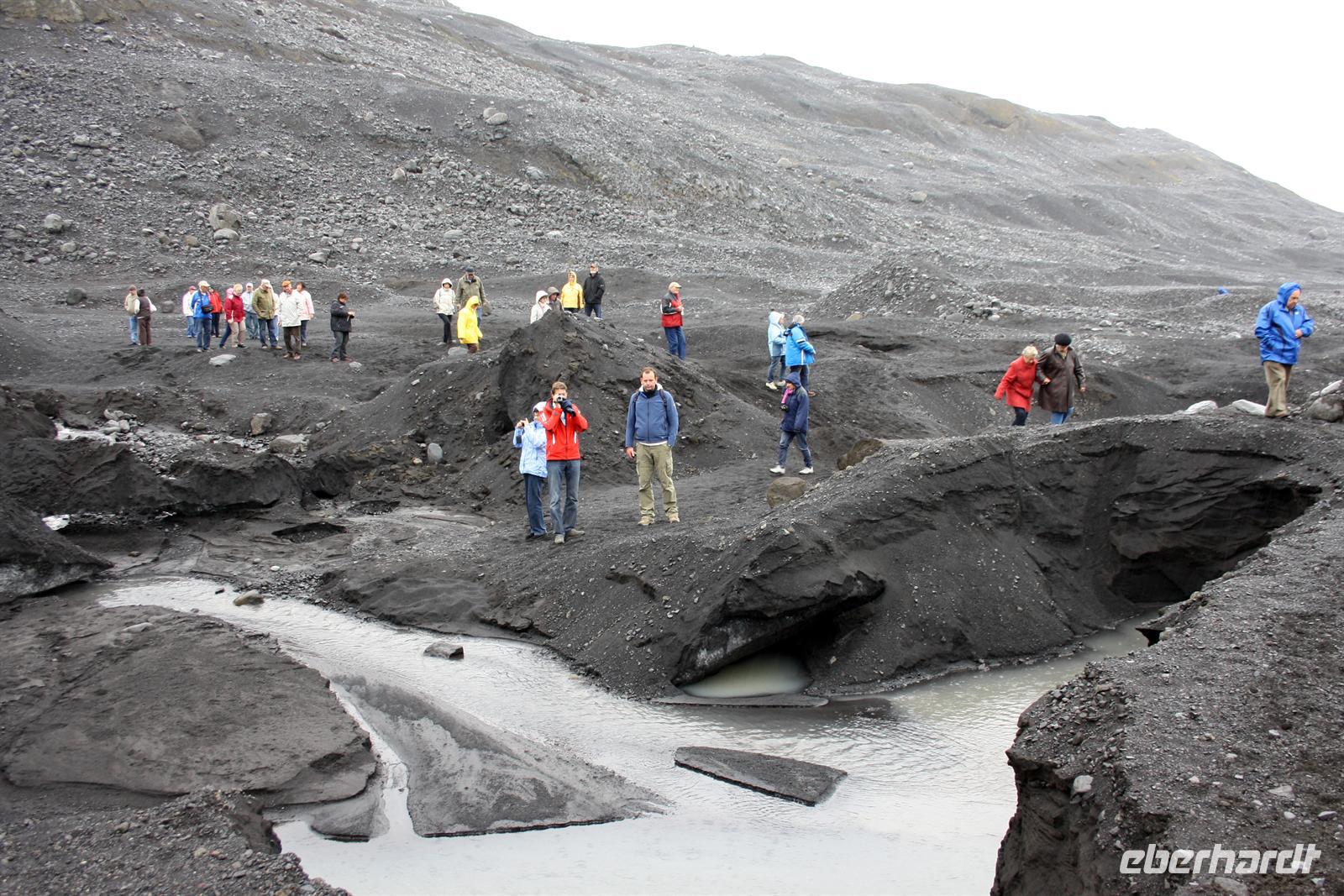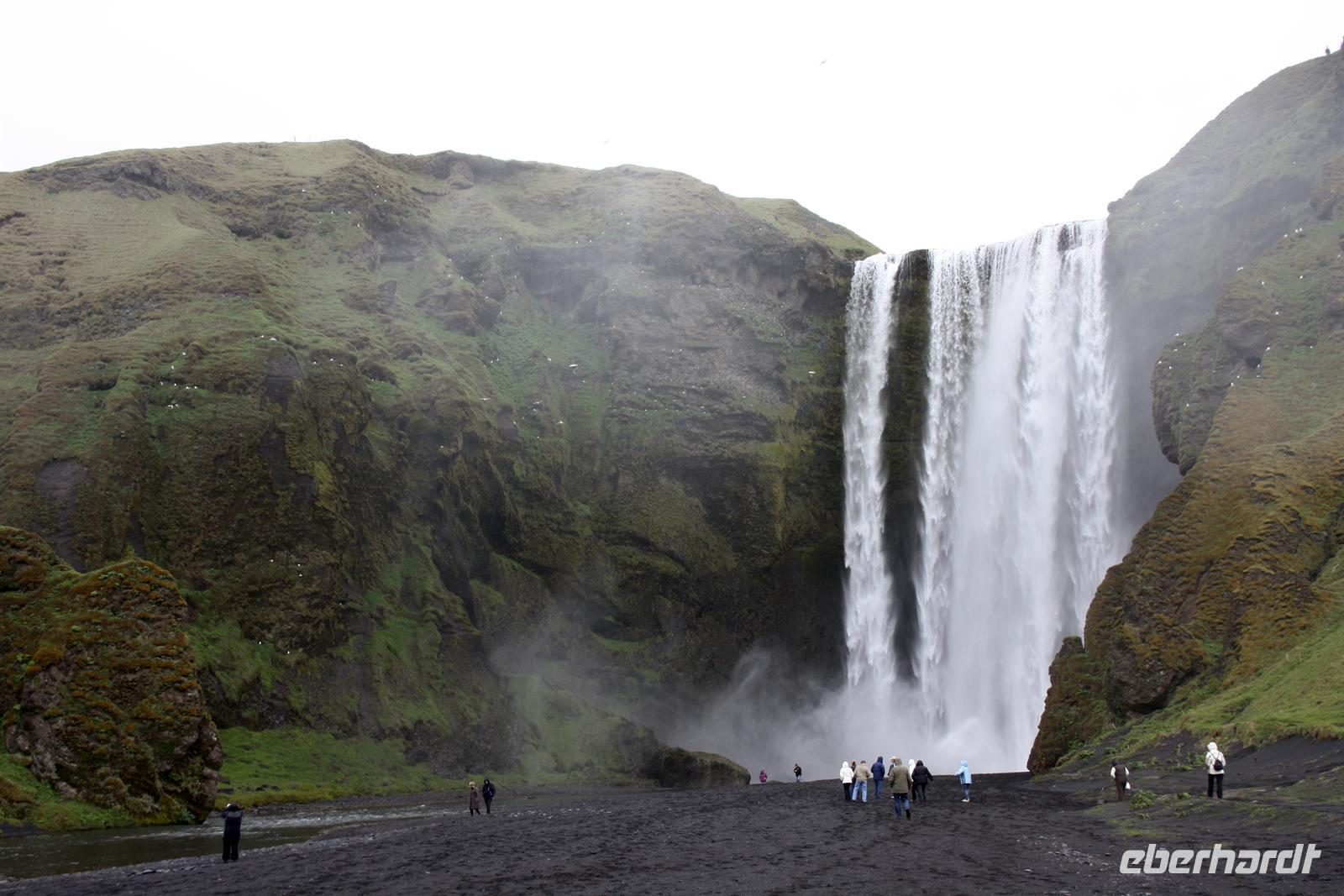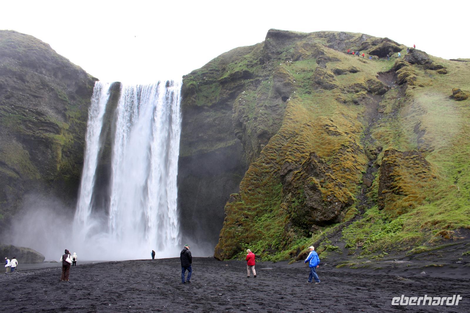 Der Mittwoch stand dann ganz im Zeichen der Südküste Islands. Vorbei an einem Kraftwerk ging es in Richtung Eyjafjallajökull, dem Vulkan-Übeltäter von 2010. In einem Besucherzentrum dokumentierte eine Bauernfamilie die Zeit danach. Sehr bewegend und anschaulich war der Film, das Ausmaß der Aschewolke und des Ausbruchs wurde uns nun umso deutlicher. Anschließend ging es weiter nach Vík, wo wir Mittagsrast machten, die Wollangebote erkundeten und den Strand mit dem schwarzen Sand begutachteten.