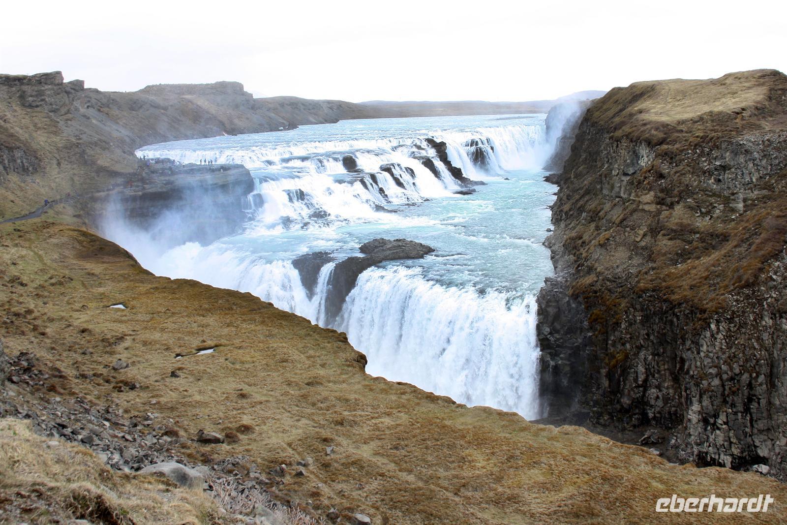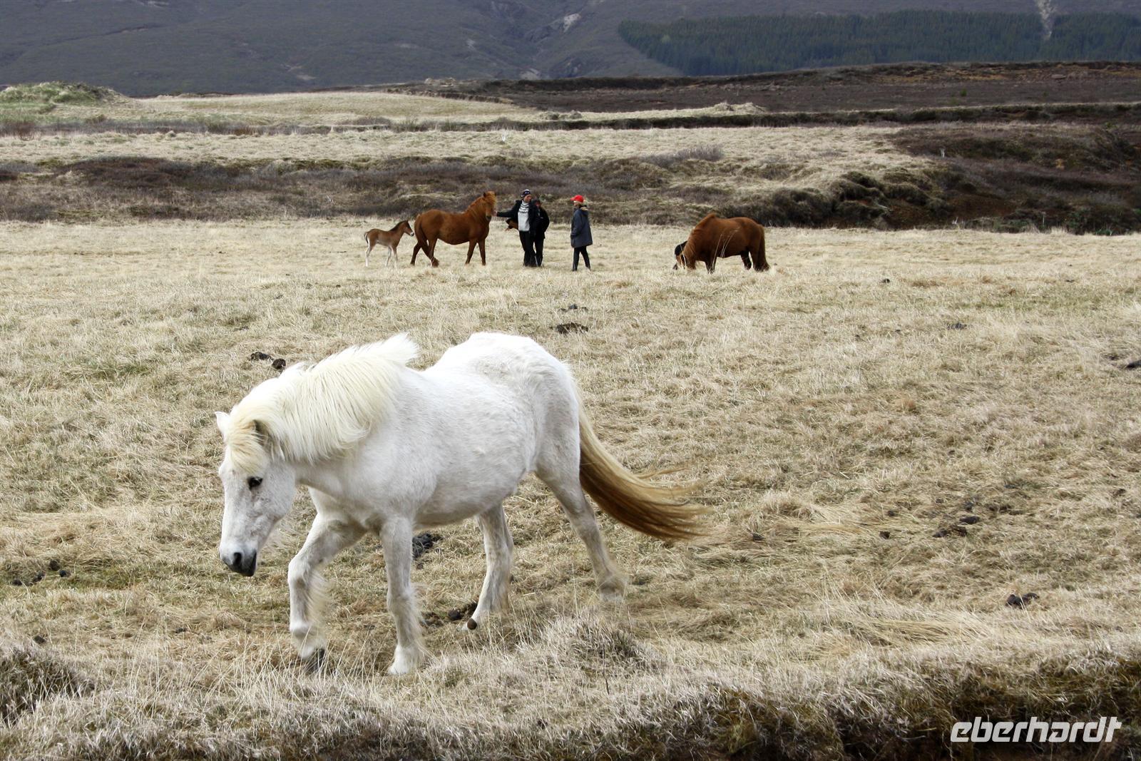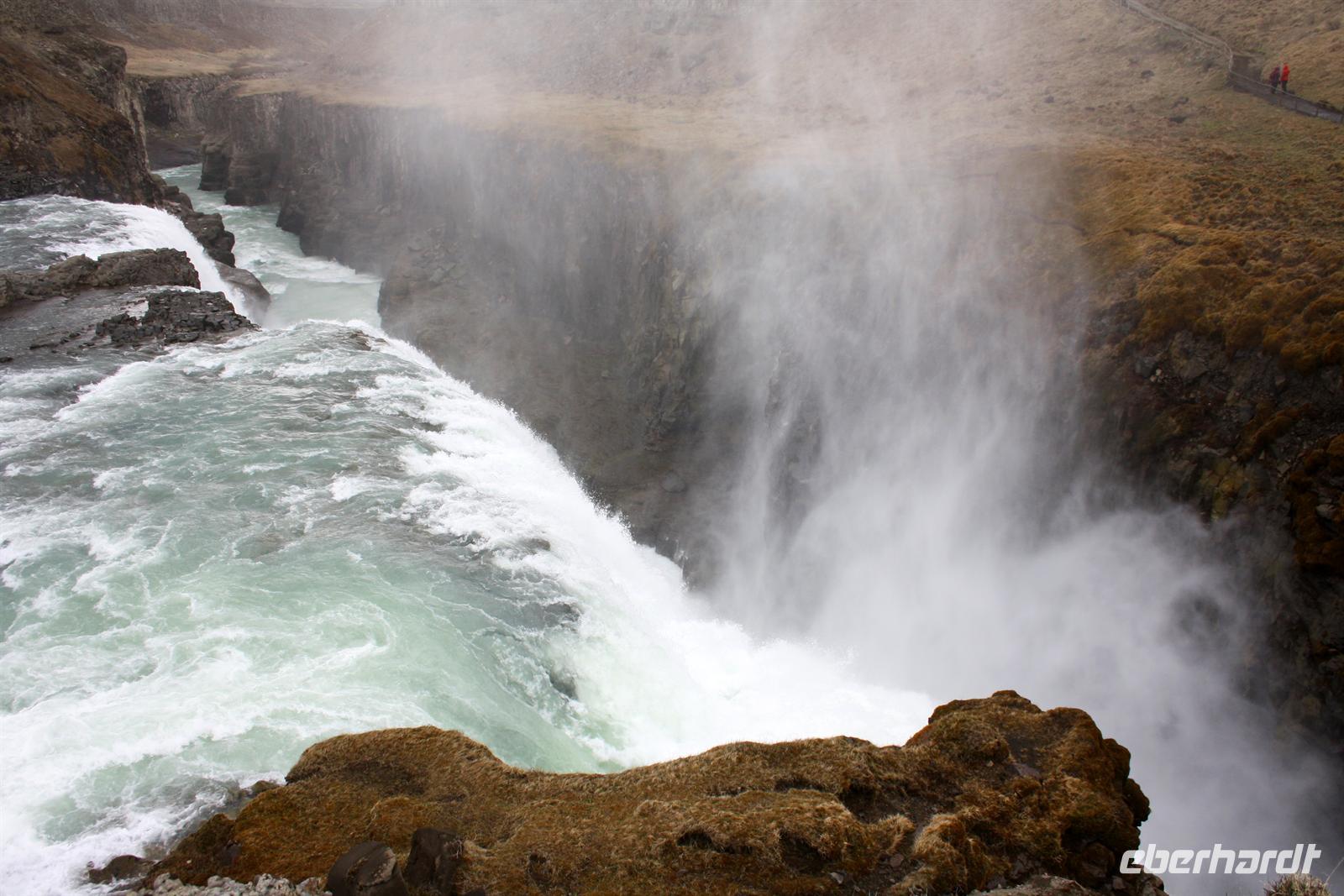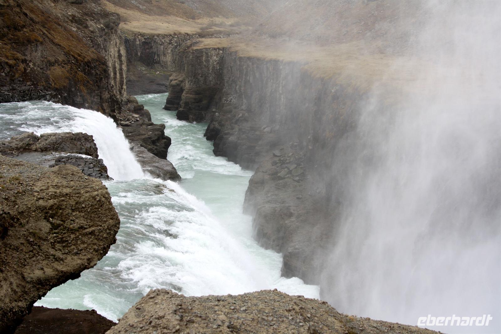 Vorbei an vielen dampfenden Löchern wartete die nächste heiße Quelle namens Cafeteria auf uns. Gut gestärkt von Suppe, Sandwich & Co. ging es weiter zum spektakulären Gullfoss. Wirklich atemberaubend und sehenswert! Viele Fotos später (Wasser, Wasser, Wasser!!!) fuhren wir mit dem Bus Richtung Thingvellir-Nationalpark und hielten unterwegs noch bei den tollen Island-Pferden, eine wirklich schöne Rasse und super Fotomotiv!