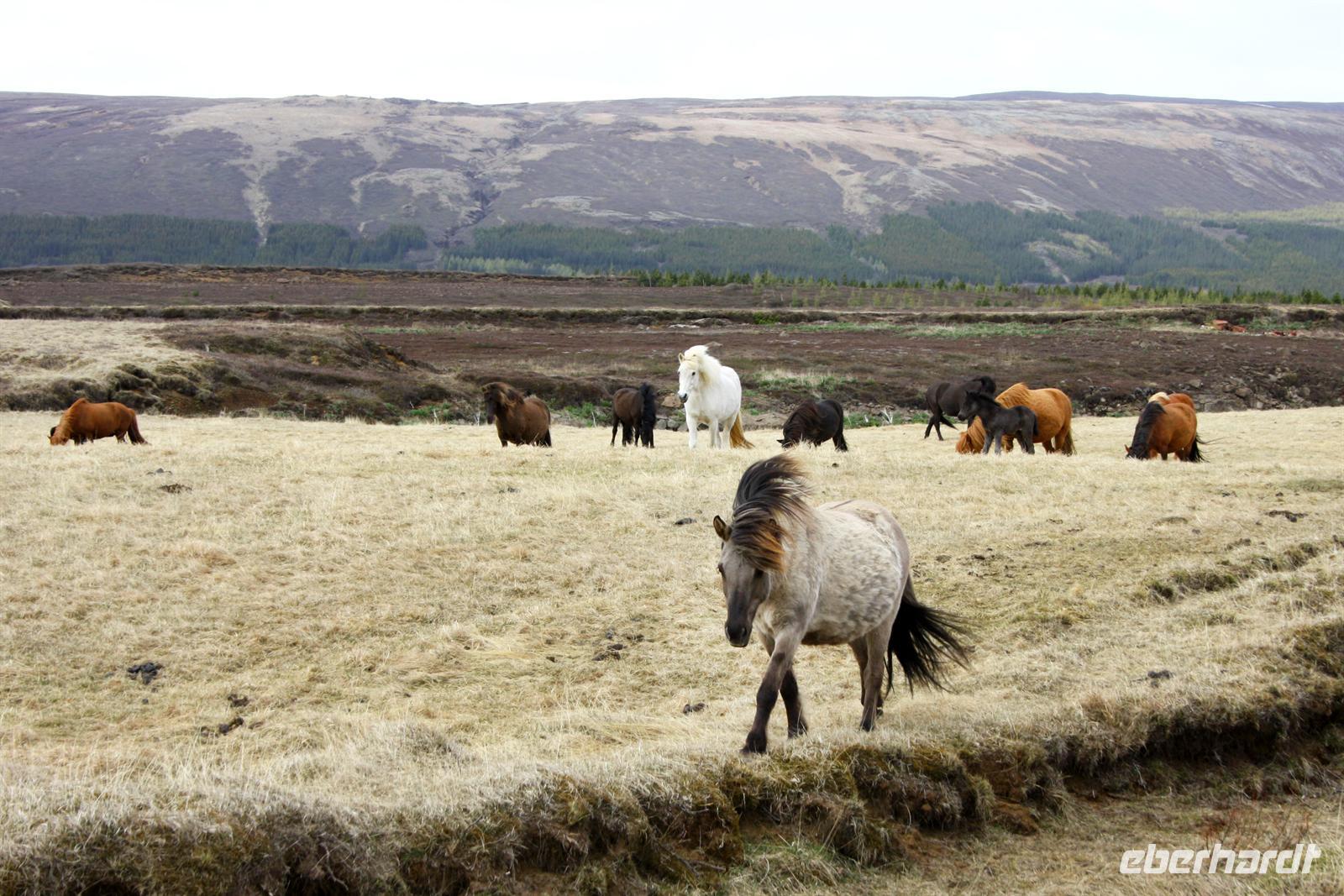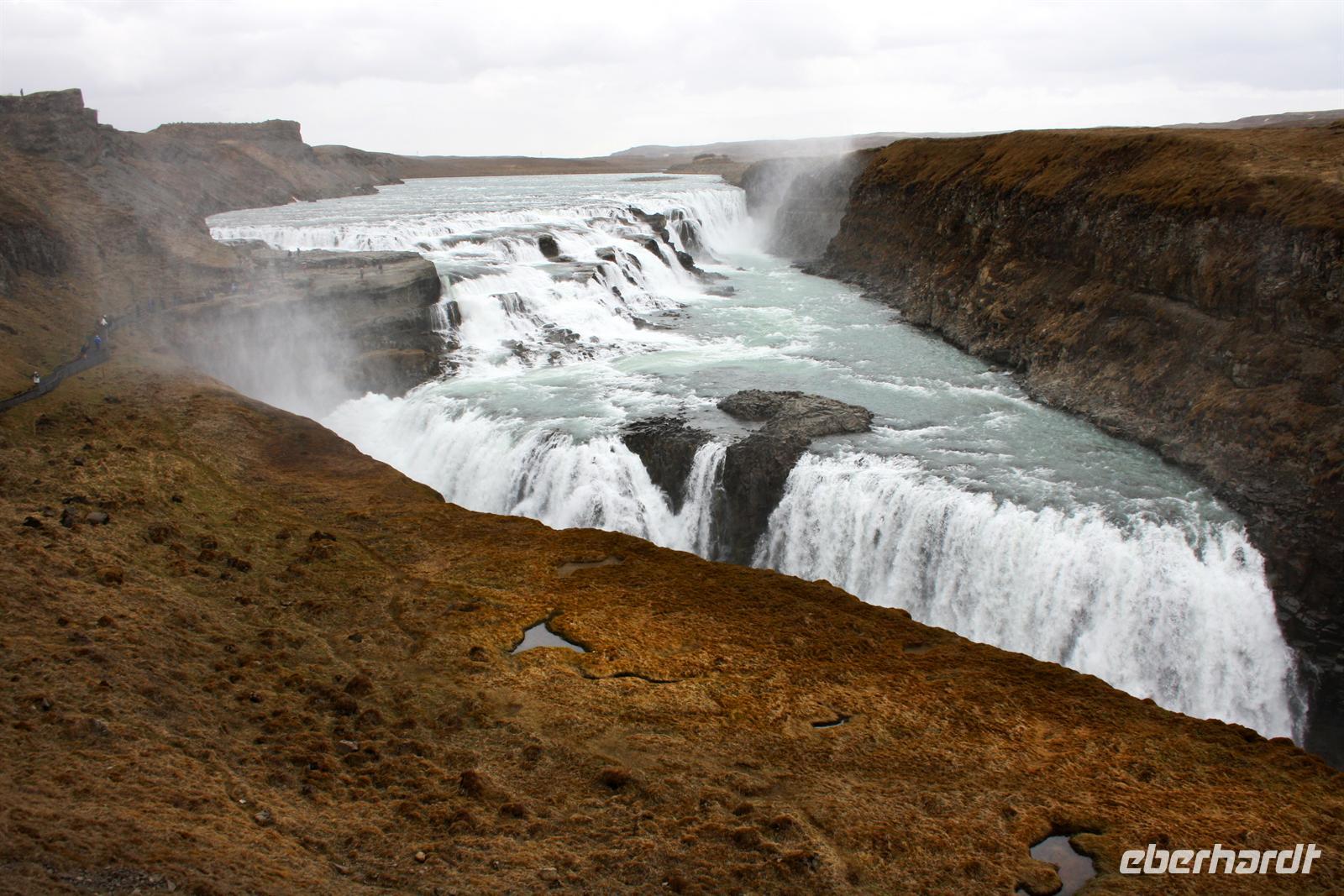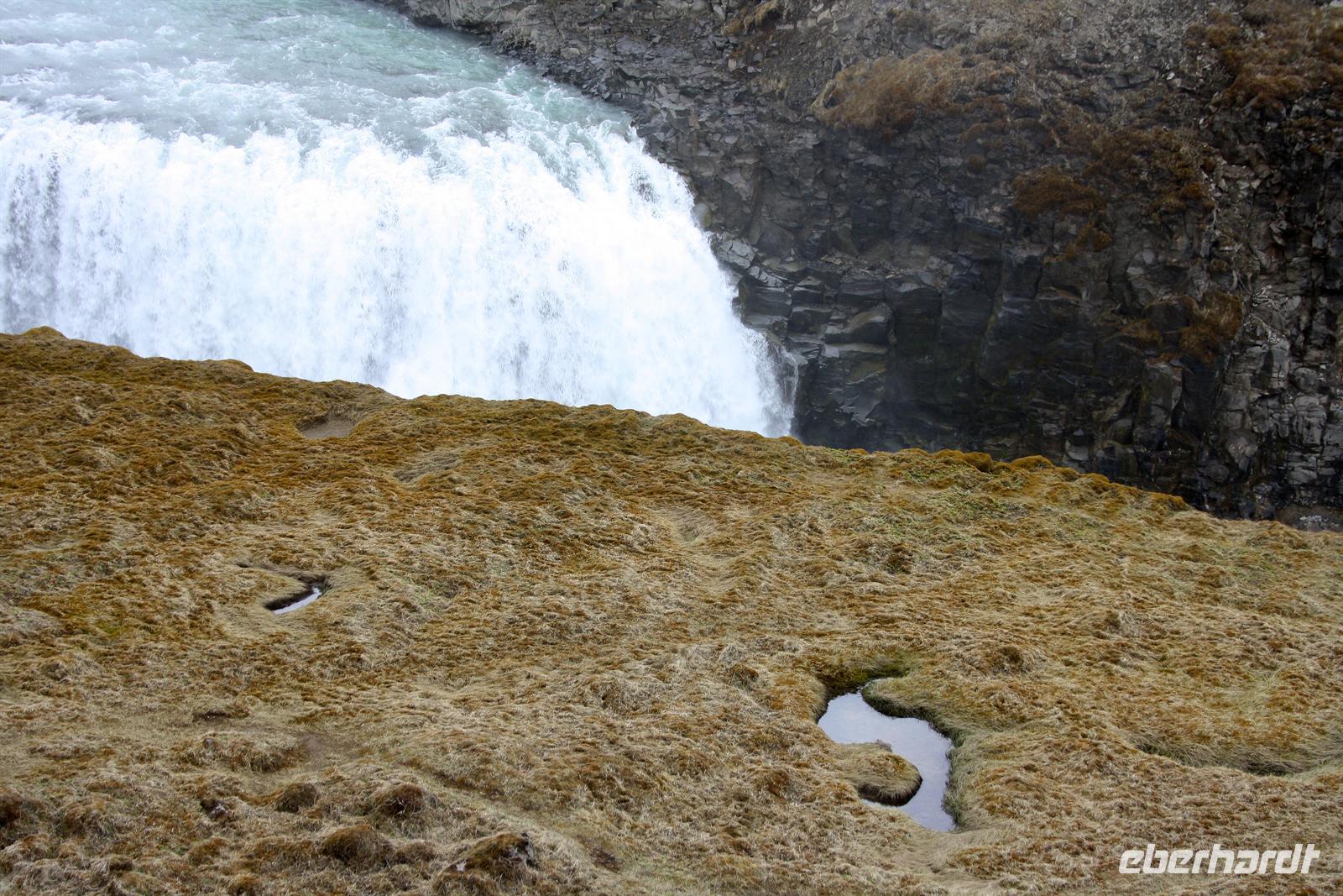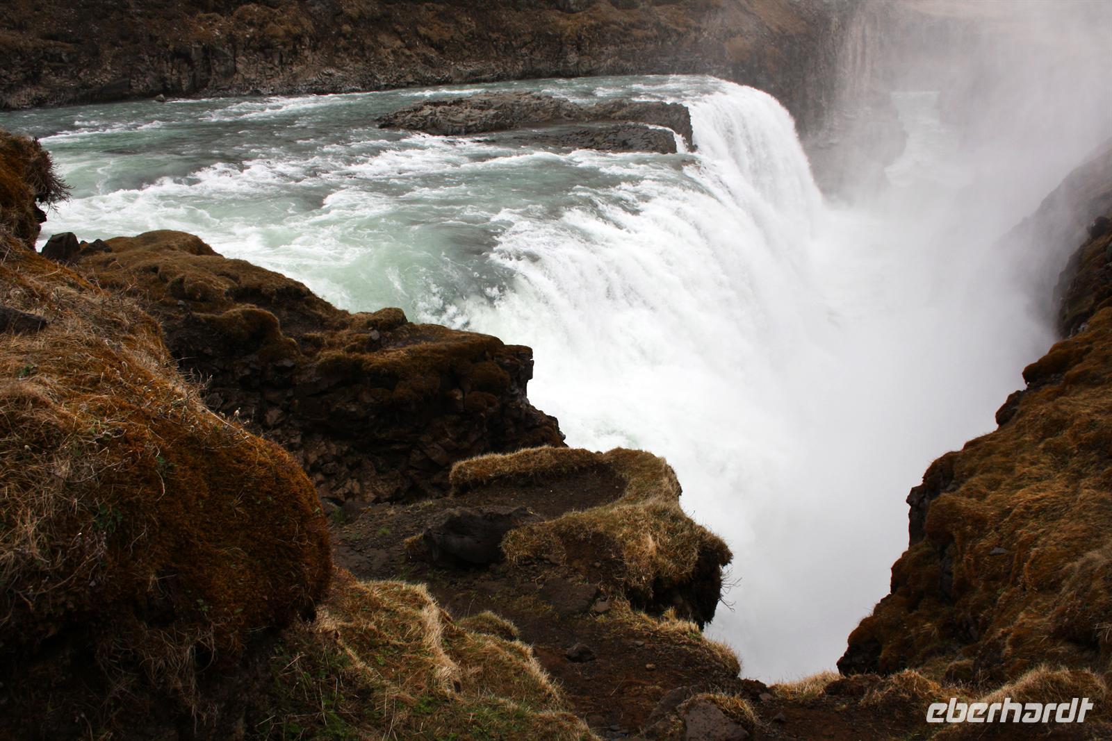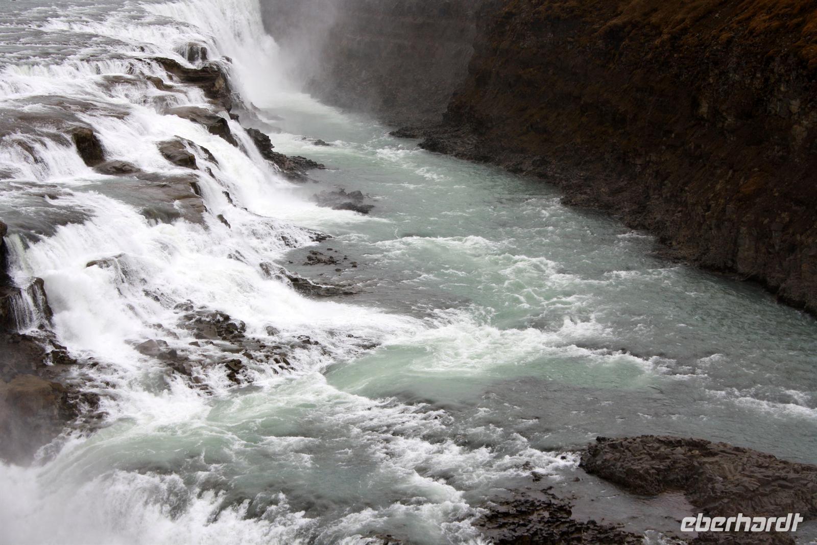 Vorbei an vielen dampfenden Löchern wartete die nächste heiße Quelle namens Cafeteria auf uns. Gut gestärkt von Suppe, Sandwich & Co. ging es weiter zum spektakulären Gullfoss. Wirklich atemberaubend und sehenswert! Viele Fotos später (Wasser, Wasser, Wasser!!!) fuhren wir mit dem Bus Richtung Thingvellir-Nationalpark und hielten unterwegs noch bei den tollen Island-Pferden, eine wirklich schöne Rasse und super Fotomotiv!