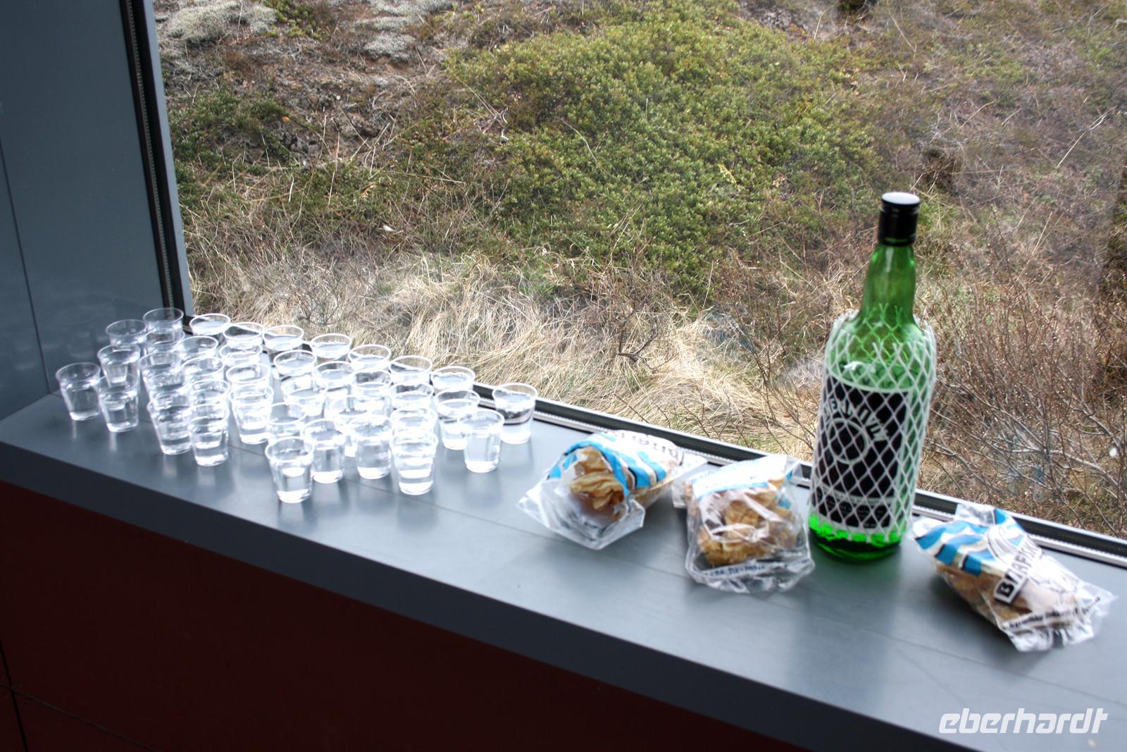 Alle sahen noch einen Film dazu, in der Zeit bereitete ich draußen auf dem überdachten Fensterbrett kleine Becher mit Brennivin (Kartoffelschnaps mit Kümmelaroma) und Trockenfisch vor. Man, das stinkt vielleicht im Rucksack, nicht nachmachen!