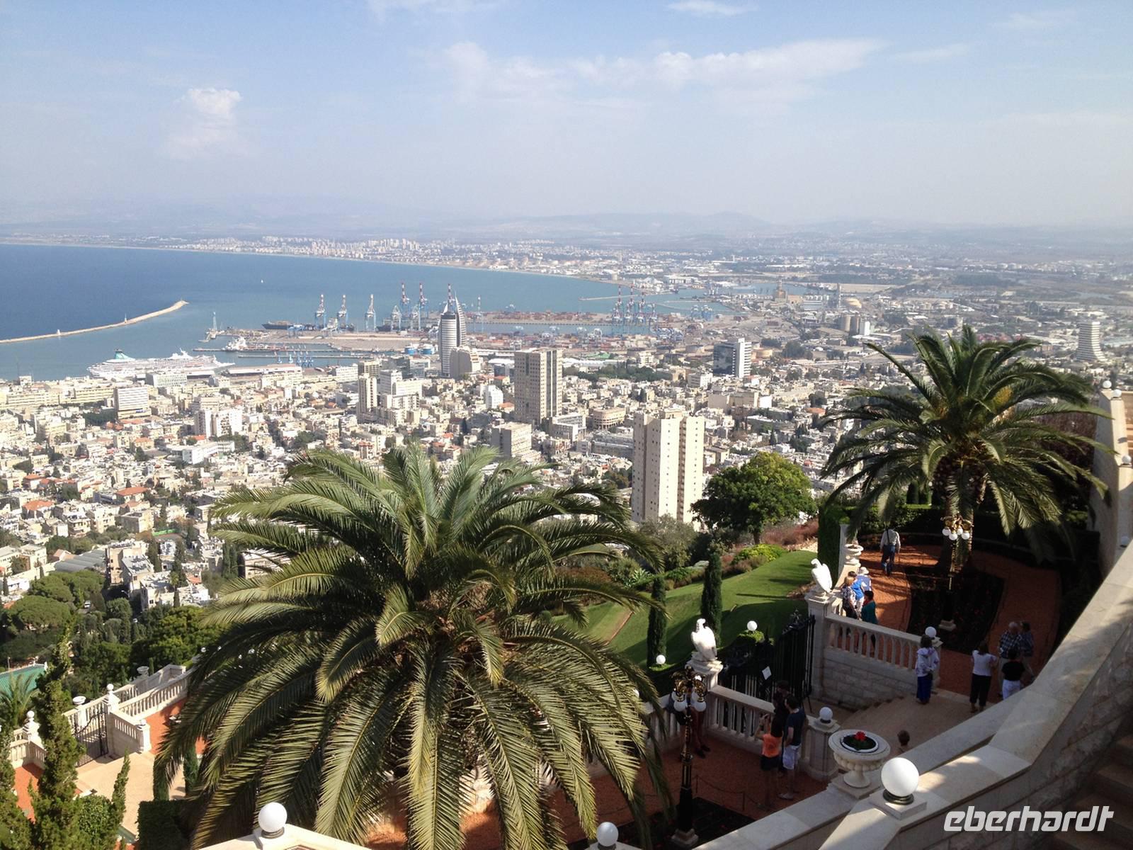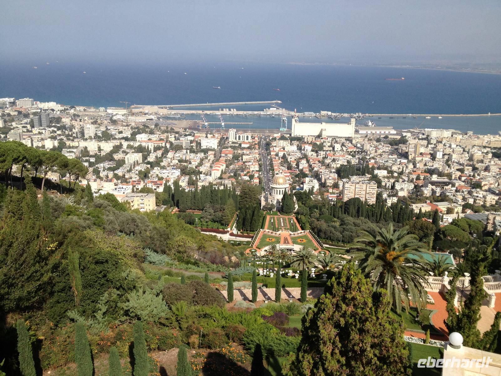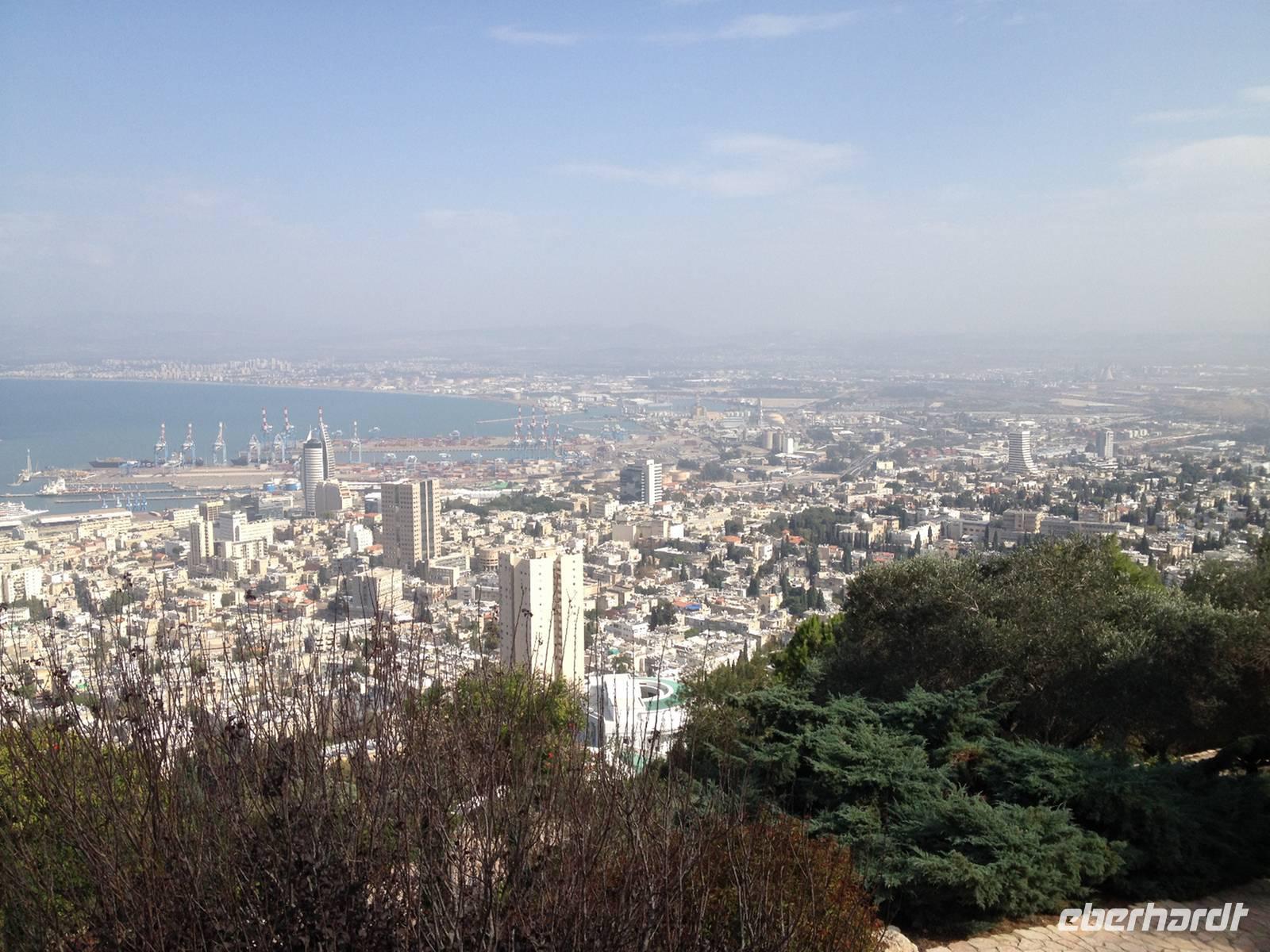 Nach wenigen Minuten Busfahrt weiter in Richtung Norden erreichten wir Haifa. Israels drittgrößte Stadt (270.000 Einwohner) und Zentrum der IT-Branche erstreckt sich an einer sichelförmigen Bucht weit über die Hänge des Berges Karmel. Jüdische und arabische Israelis leben hier friedlich nebeneinander und somit wird dieser Stadt ein besonderer Charme verliehen. Haifa ist schlichtweg bezaubernd und wird nicht umsonst als schönste Stadt Israels betrachtet. Durch den Hafen ist Haifa Israels Tor zur Welt. 90% der Im- und Exporte werden hier abgewickelt.