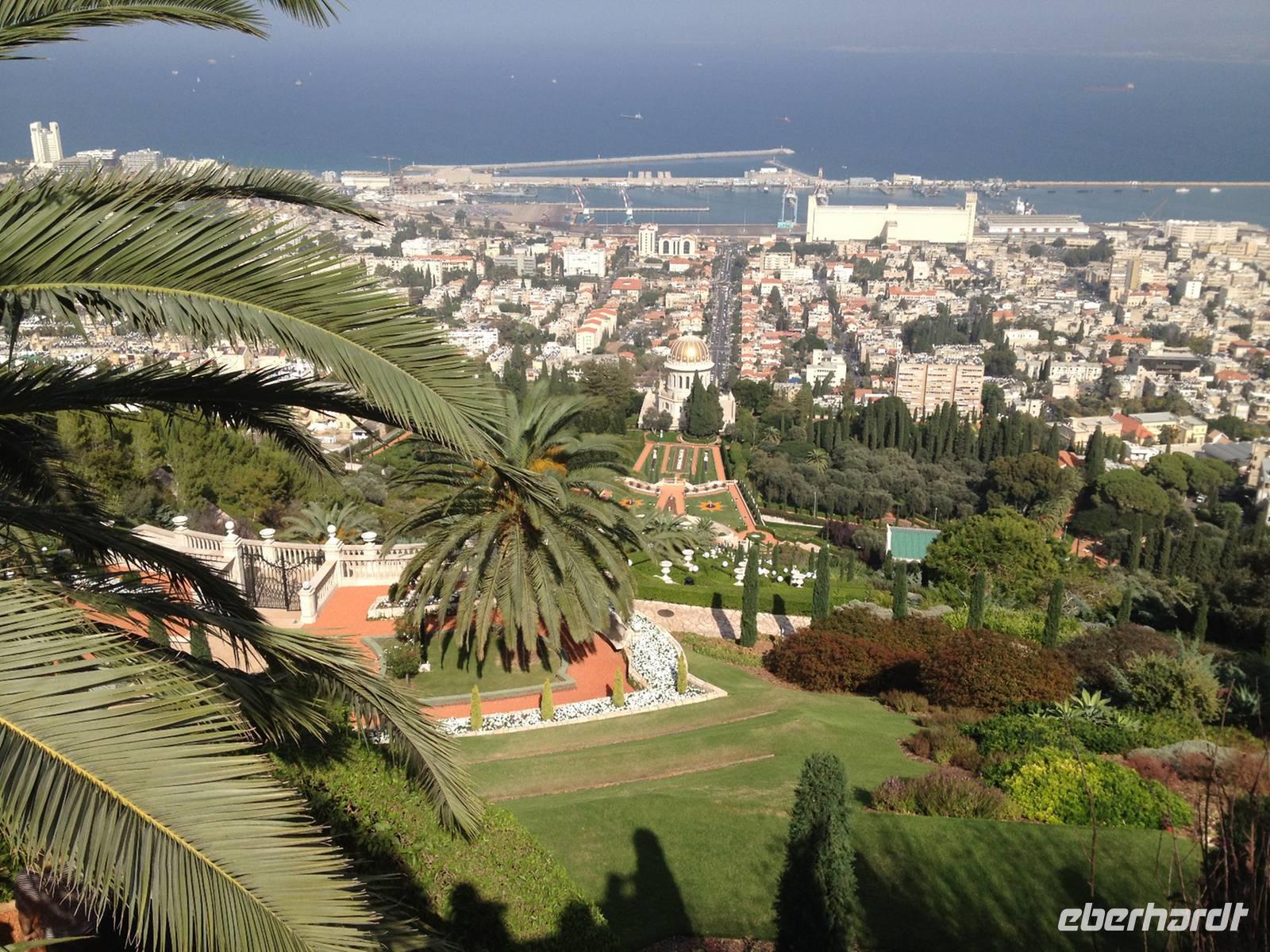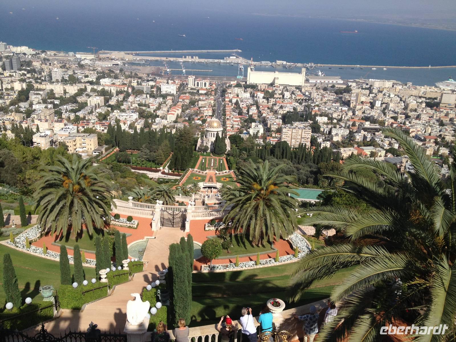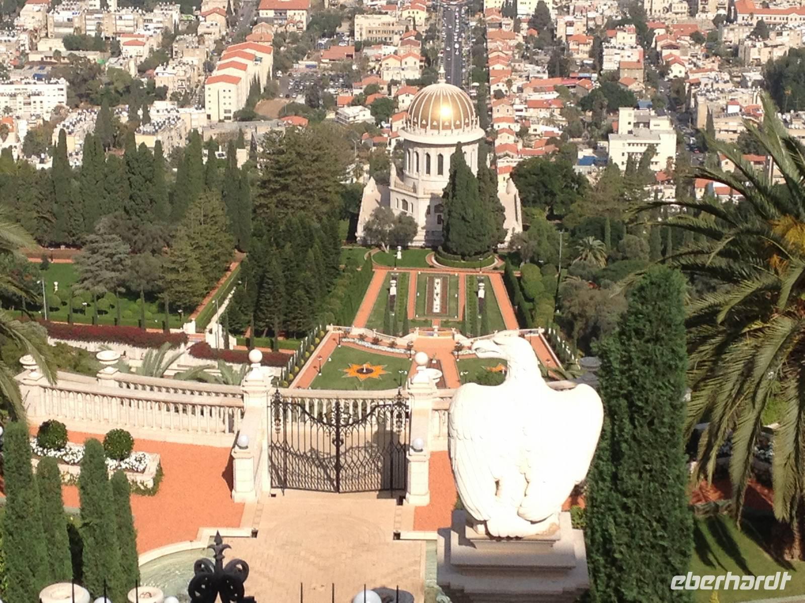 David und Busfahrer Said brachten uns zum wohl bestens Aussichtspunkt hoch über der Stad - zu den Bahai'i-Gärten. Die kunstvoll gepflegten Bahai'i-Gärten sind ein Meisterwerk der Gartengestaltung und Landschaftsarchitektur. Hier haben die Bahai'i ihr Weltzentrum errichtet. Doch warum ausgerechnet in Haifa? Der Bahaismus ist eine im 19. Jahrhundert gegründete universale Religion, die ursprünglich auf den Babaismus, eine 1844 in Persien begründete Abspaltung vom schiitischen Islam, zurückgeht. Der Gründer Baha Ullah (pers. „Glanz Gottes") kam Ende des 19. Jahrhunderts auf seiner Wanderung ins Exil auch nach Haifa und Akko. Beeindruckt vom Karmel-Berg in Haifa, war er vom Wunsch beseelt, dort die Gebeine des Bab, des Religionsstifters der Babi-Religion, beizusetzen, was zwanzig Jahre später in einem zuvor errichteten Mausoleum auch tatsächlich geschah. Darüber wurde ein prachtvoller Tempel errichtet, der seither als Weltzentrum der Bahai'i-Religion gilt.