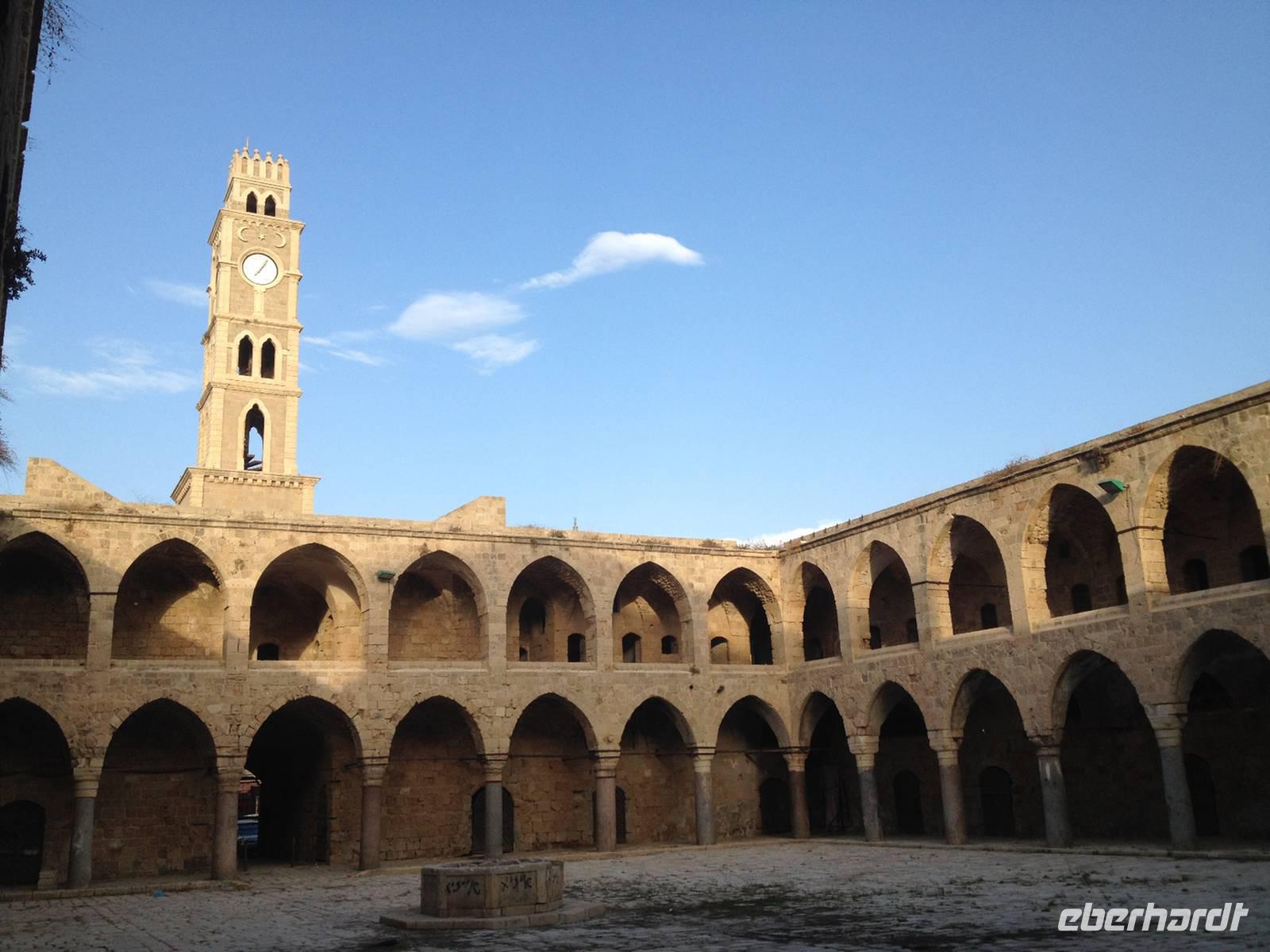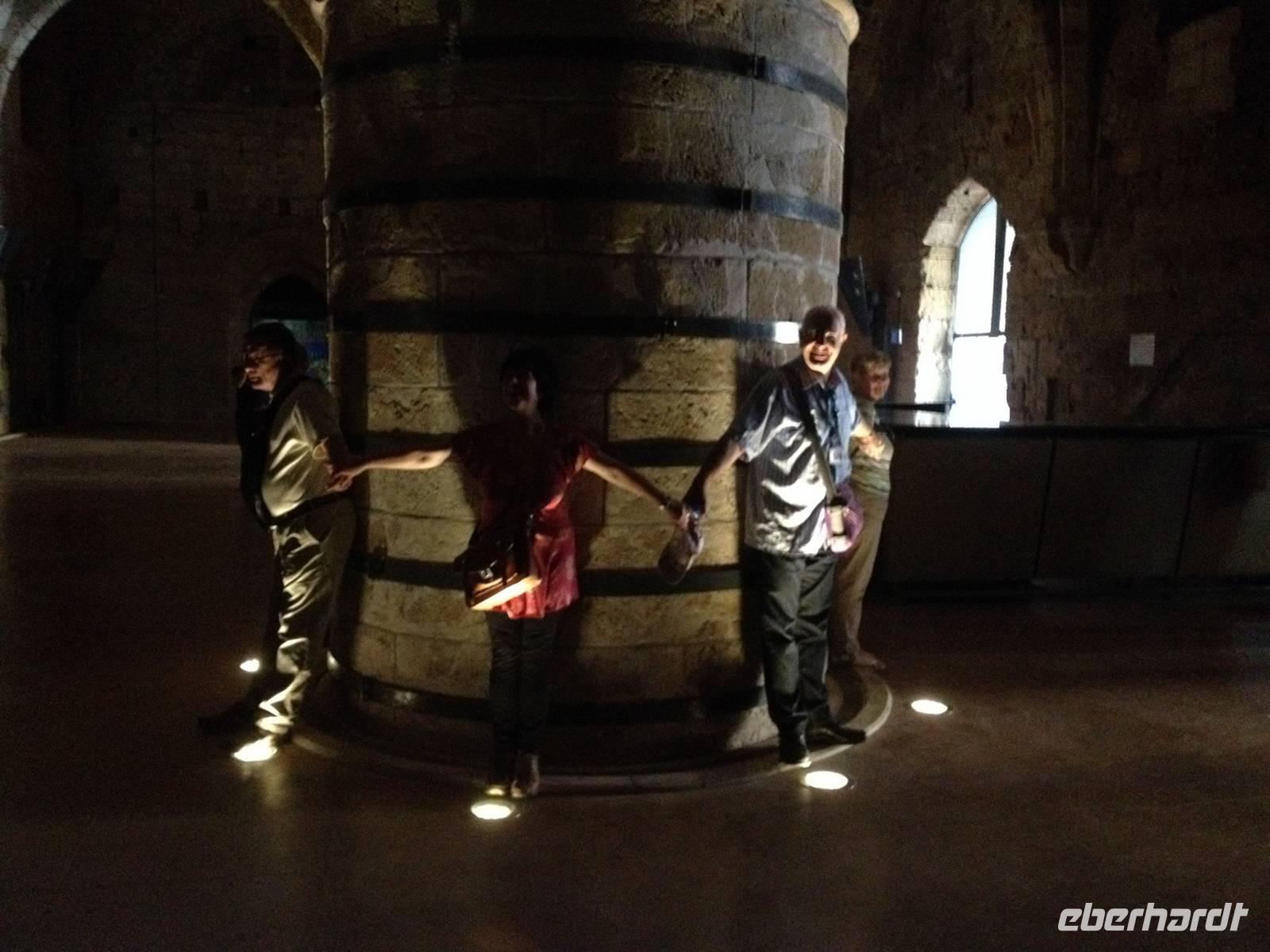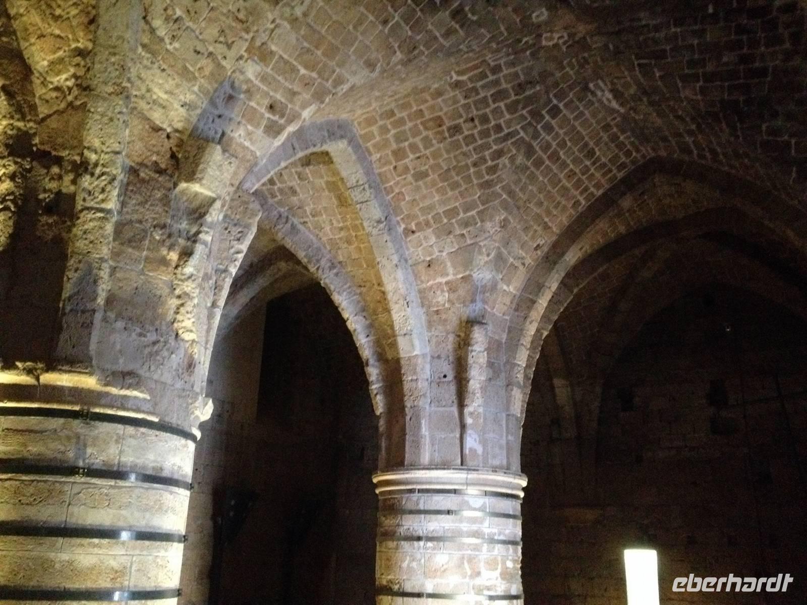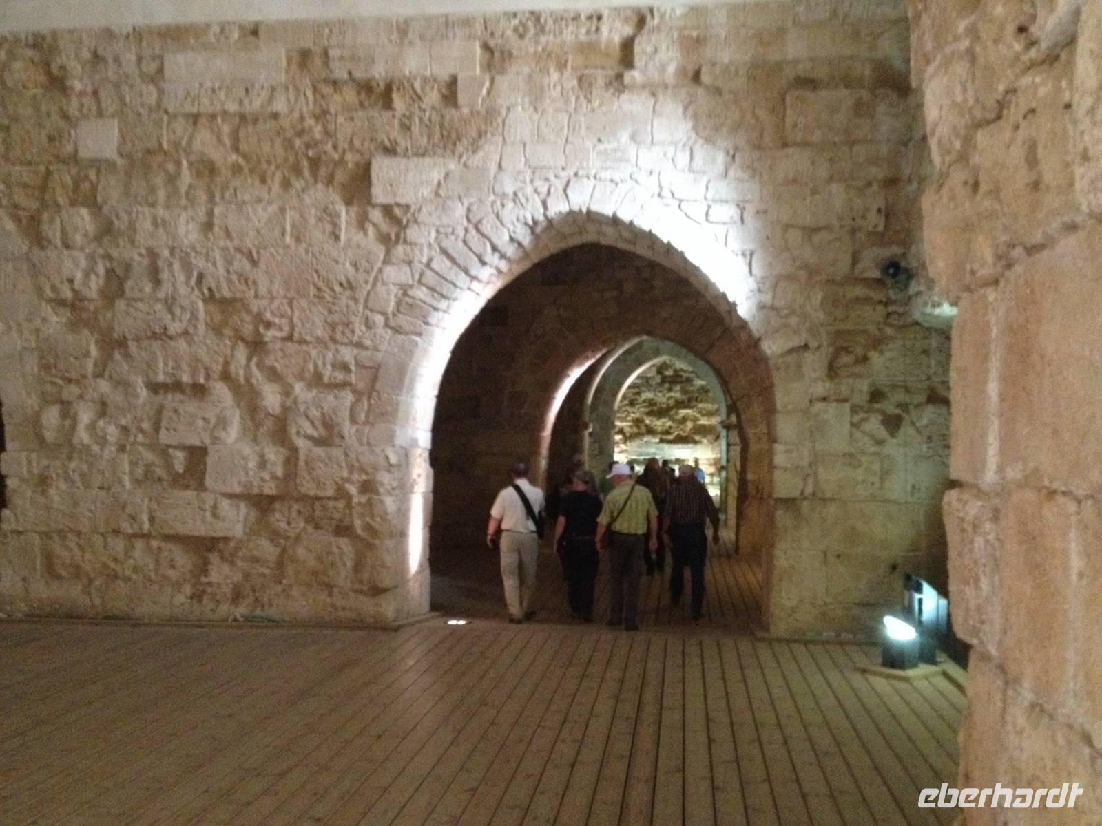 Beeindruckt vom tollen Rundblick über die Stadt setzten wir unsere Reise in Richtung Akko fort. Nur 22 km sind es von Haifa bis in die UNESCO-Weltkulturerbestadt Akko, die wir natürlich ausführlich besichtigten. In der charmanten historischen Altstadt konnte man das seltene Gefühl genießen, die Zeit sei stehen geblieben. Nach dem Mittagessen bekamen wir erst einmal wieder einen kurzen Einführungsfilm, der uns zurück in die Vergangenheit brachte. Der Höhepunkt war natürlich die unterirdische Kreuzfahrerstadt, die sich 8 m unter dem heutigen Straßenniveau befindet. Sie diente ab dem 12. Jahrhundert den Rittern des Johanniterordens als Hauptquartier. Wir wandelten durch die Gänge und kamen zum wohl schönsten Raum - dem Speisesaal, dessen massive, 12 m hohe Pfeiler die Gewölbe stützen. Nun konnten wir uns vorstellen, wie prächtig diese Stadt einst ausgesehen haben muss.
