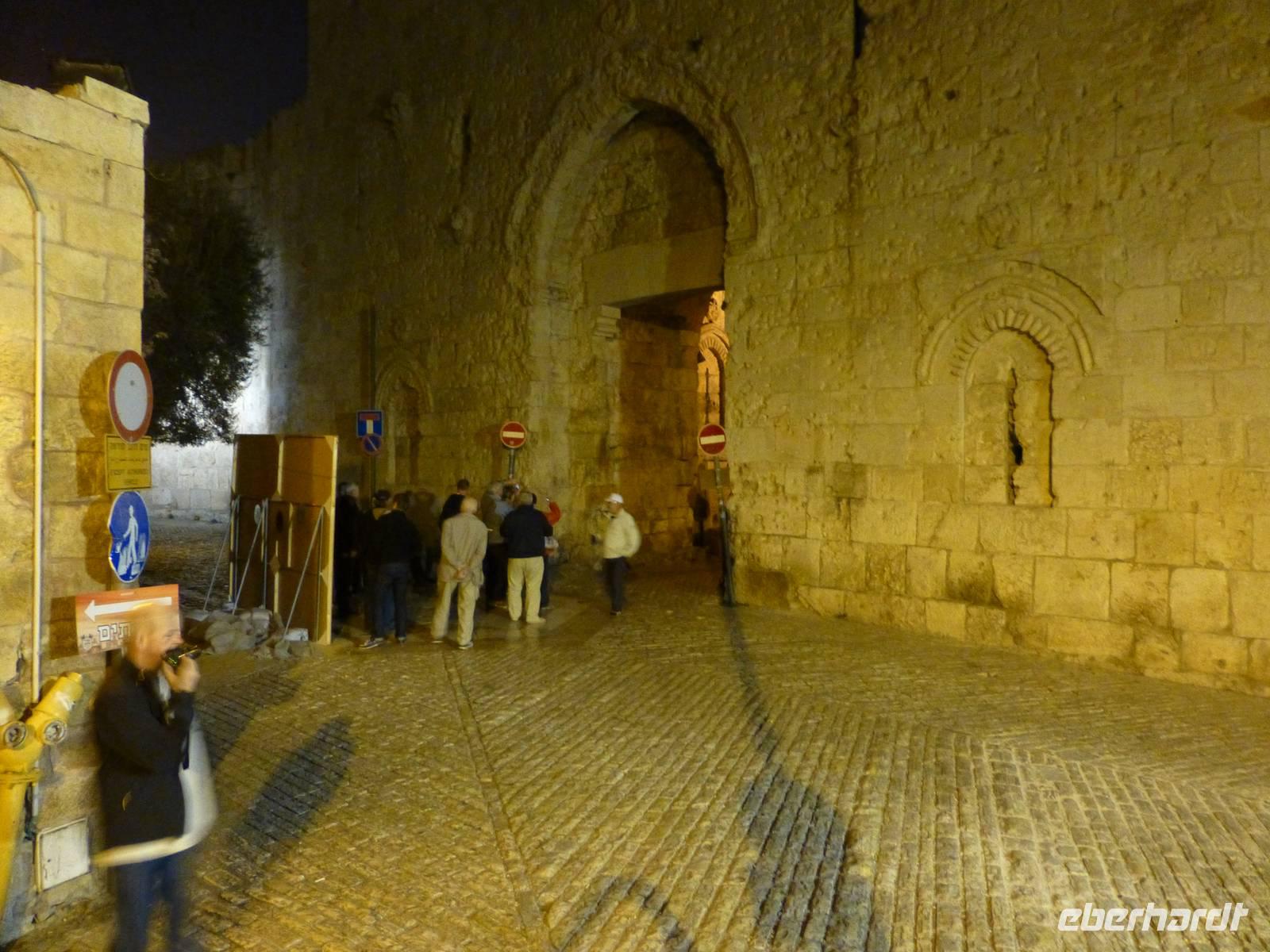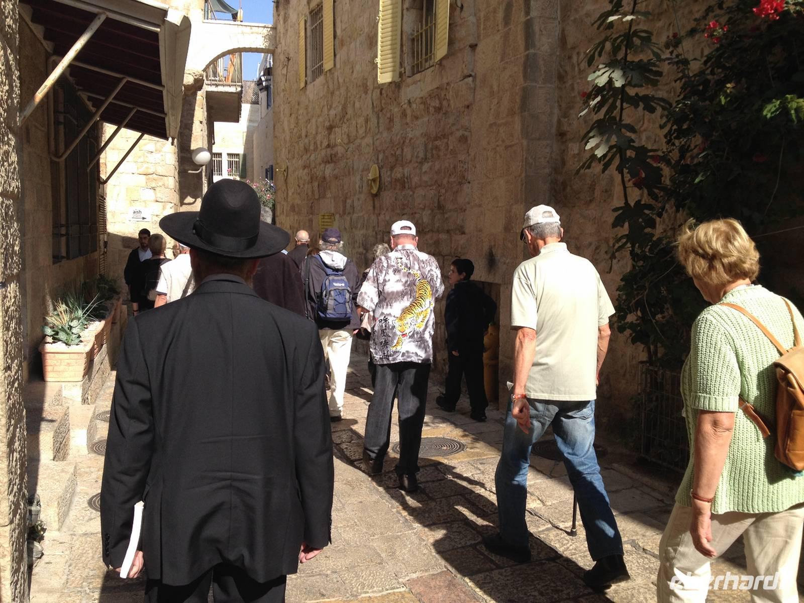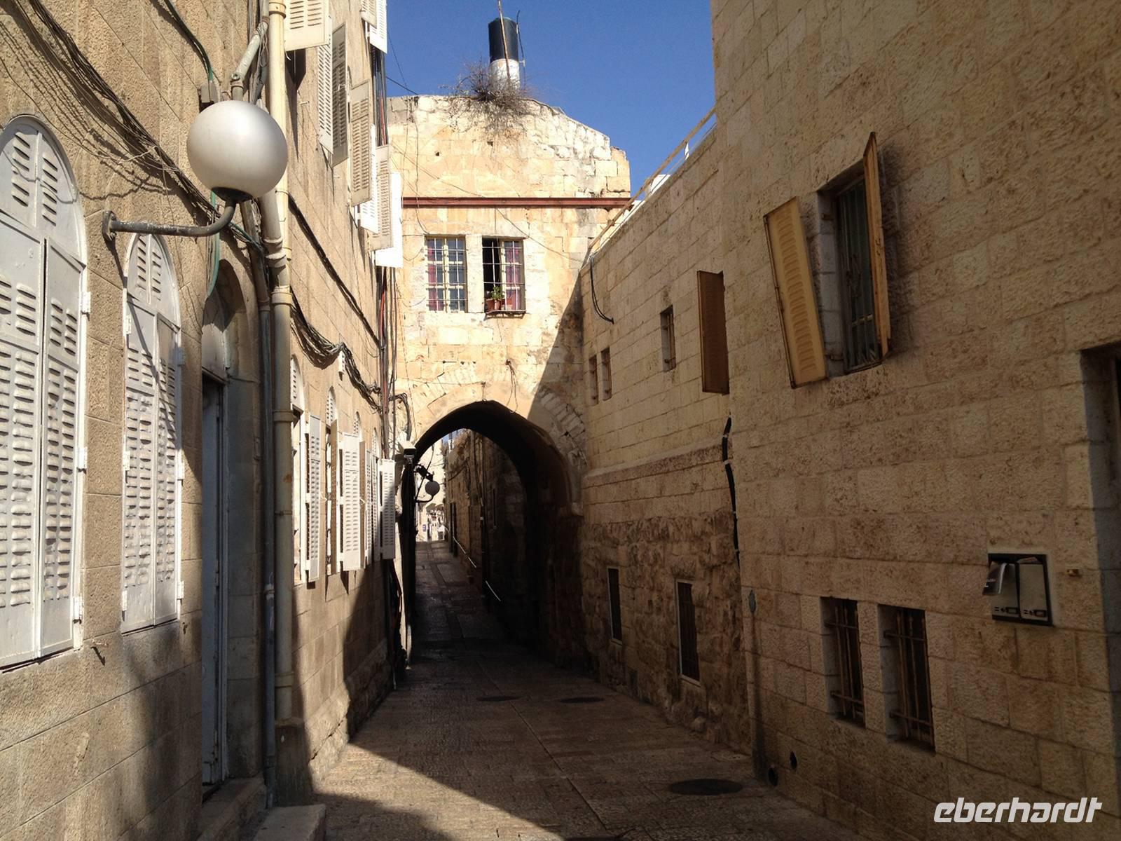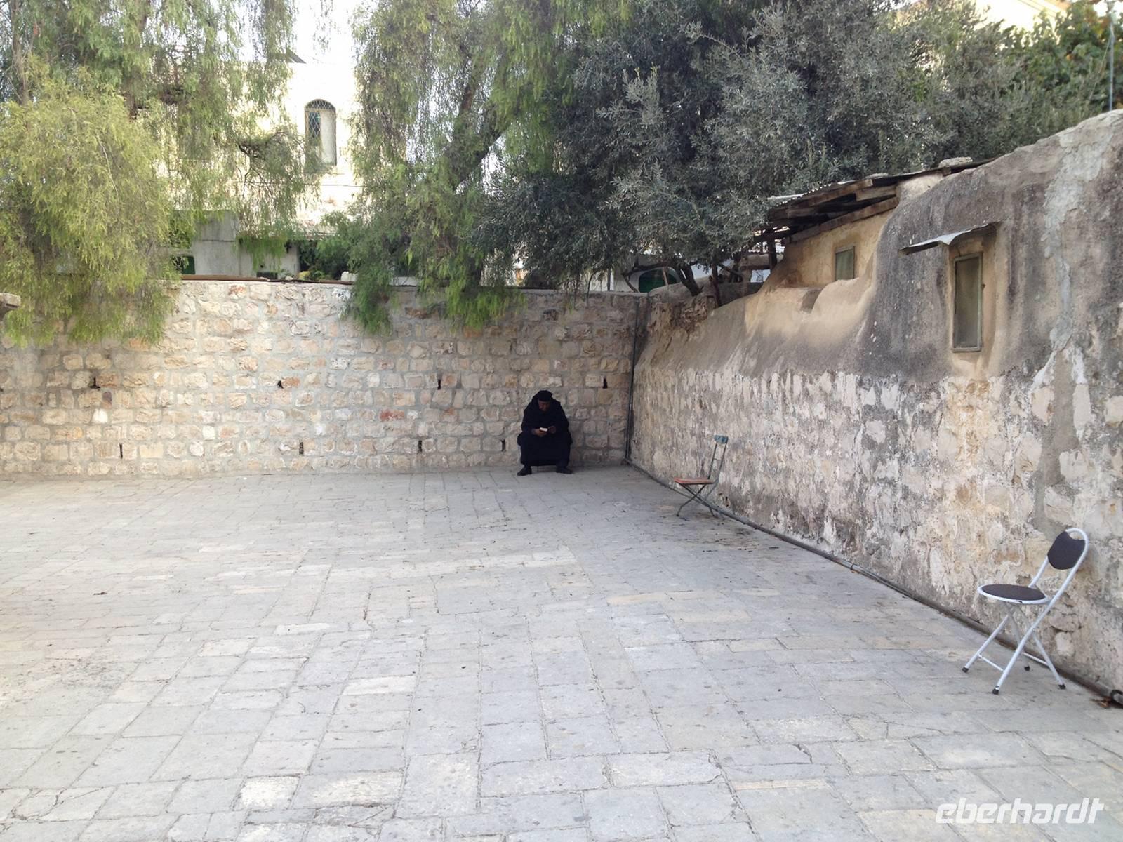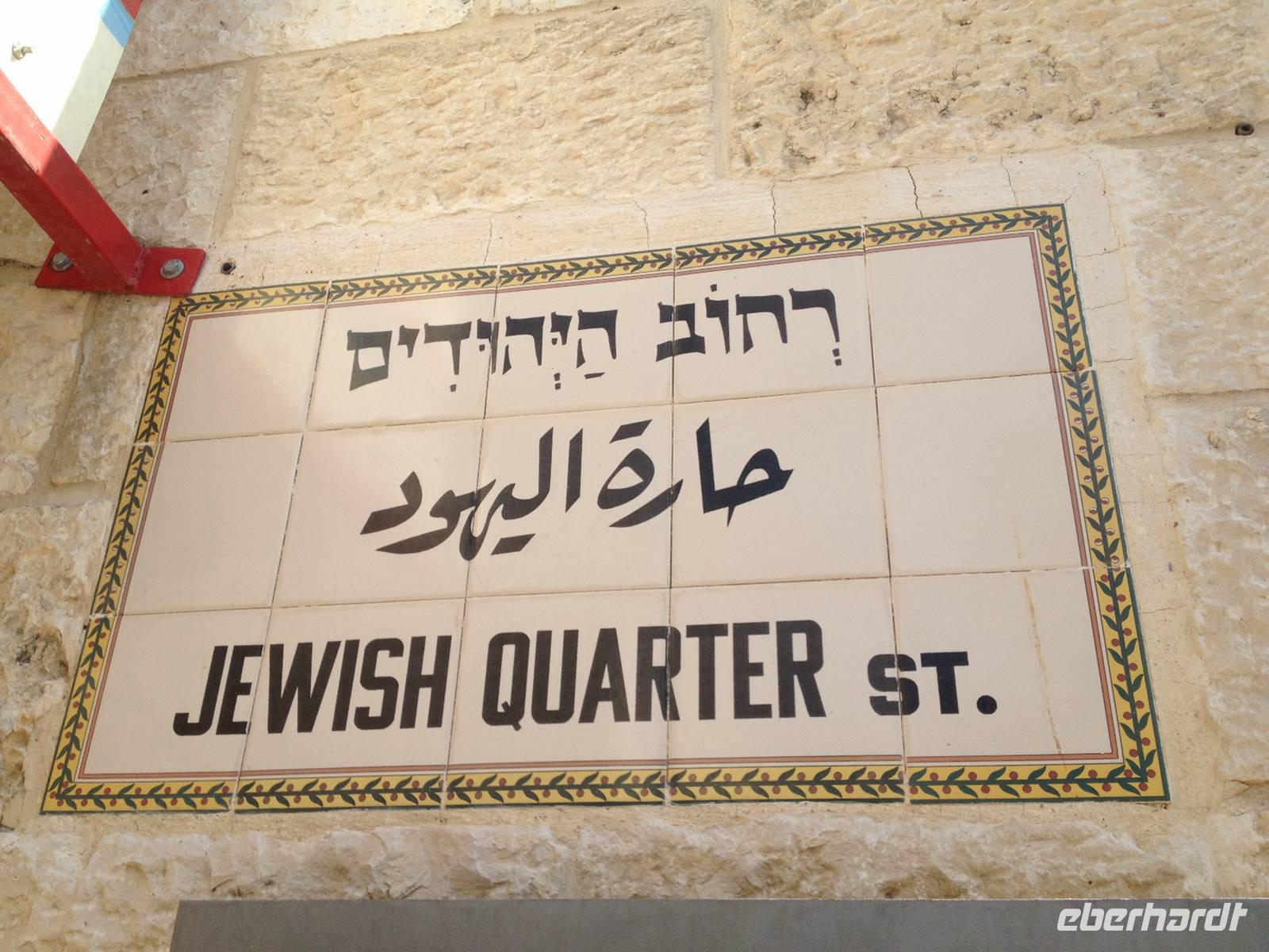 Durch das Zionstor, welches seit dem Unabhängigkeitskrieg 1948 Spuren heftiger Schießereien aufweist, erreichen wir das Armenische Viertel, eine kleine Stadt mit ca. 1300 armenischen Familien innerhalb der Stadtmauer. Wir schlenderten eine Meter durch das Viertel und erreichten das Jüdische Viertel, welches den südöstlichen Teil der Altstadt einnimmt. Etwa 900 jüdische Familien leben heute in diesem Viertel, das ein Musterbeispiel für die durchdachte und einfühlsame Wiederherstellung einer historischen Altstadt darstellt. Durch offene Fenster hörten wir die Stimmen von Kindern, Jugendlichen und Erwachsenen, die in spärlich eingerichteten Talmudschulen, ganz traditionell in schwarz gekleidet, den Talmud studieren. Wir fühlten uns in eine andere Zeit versetzt.