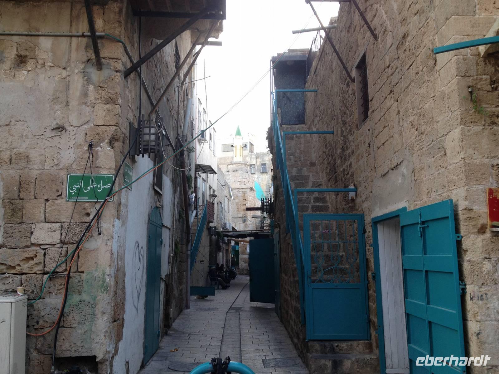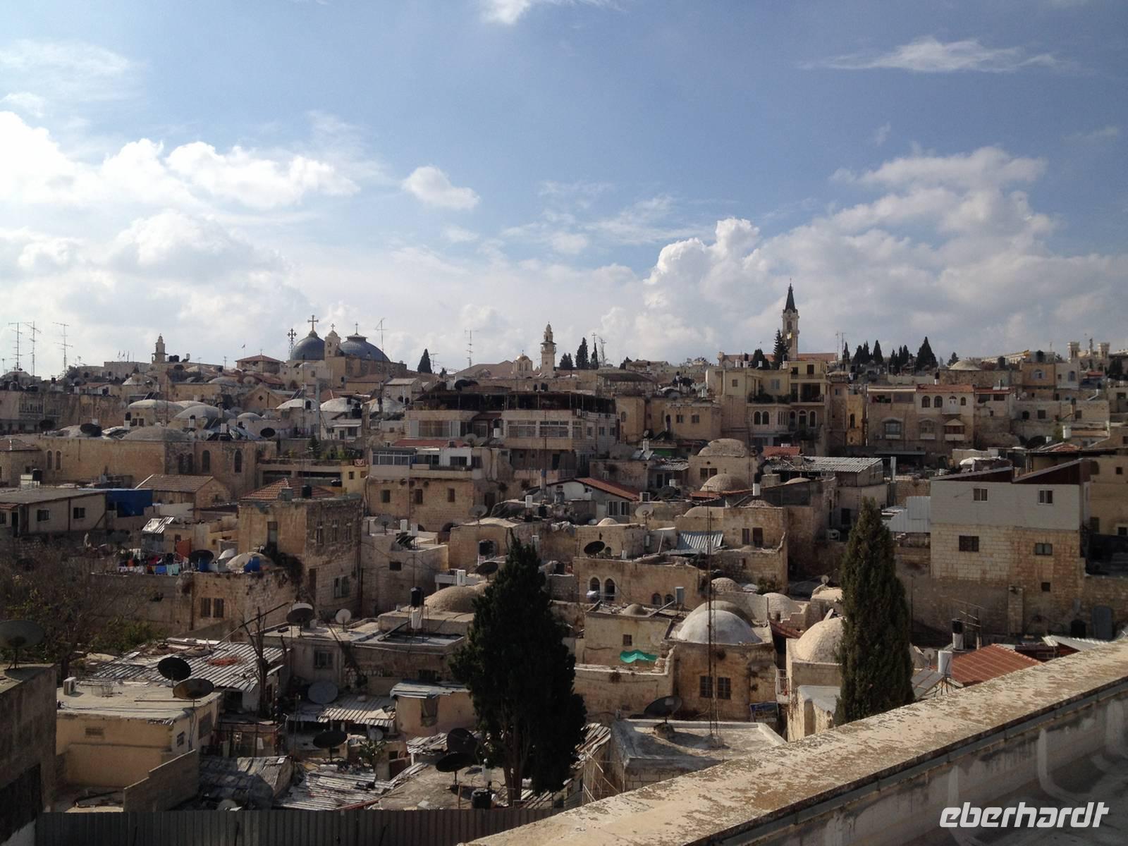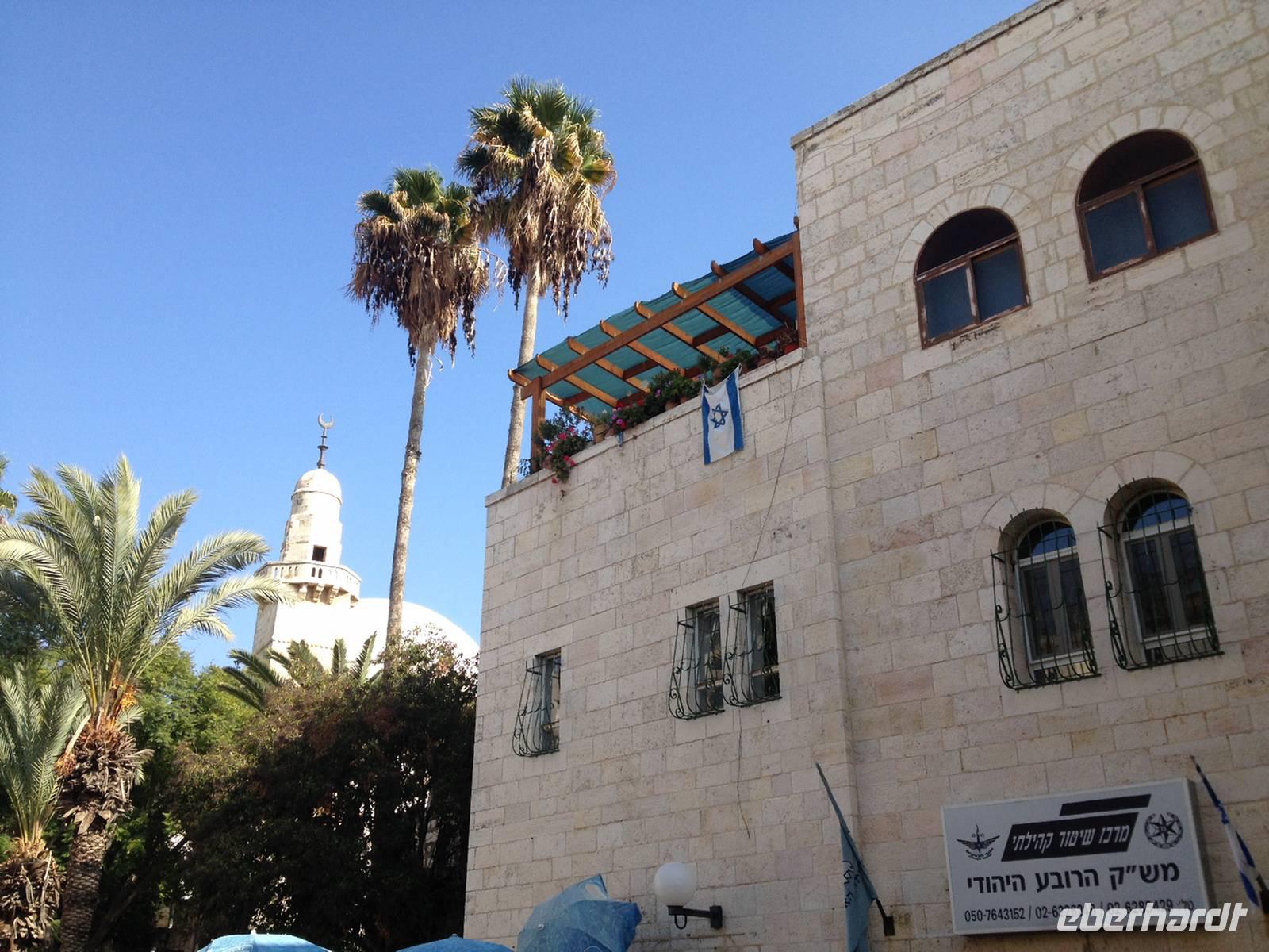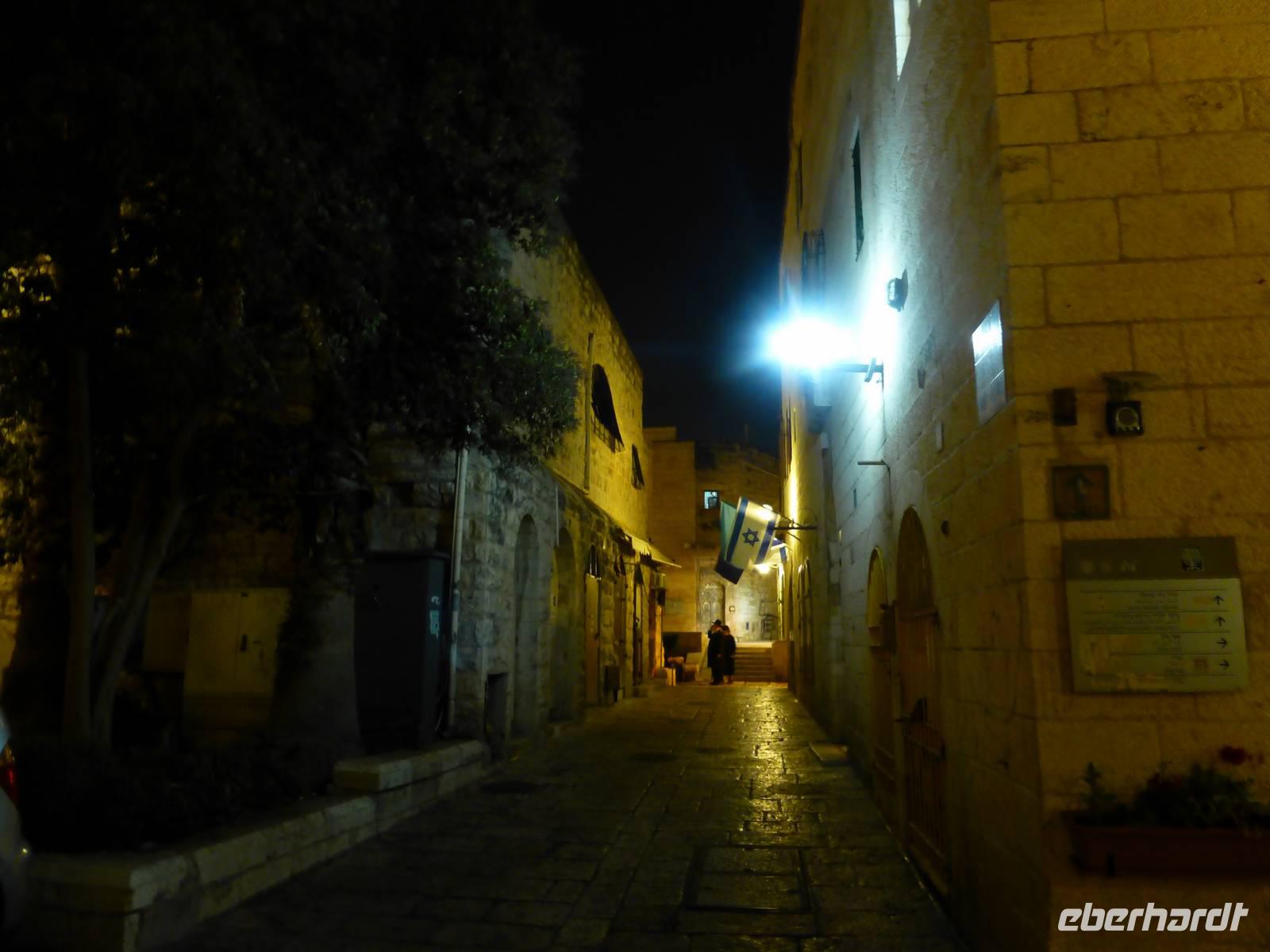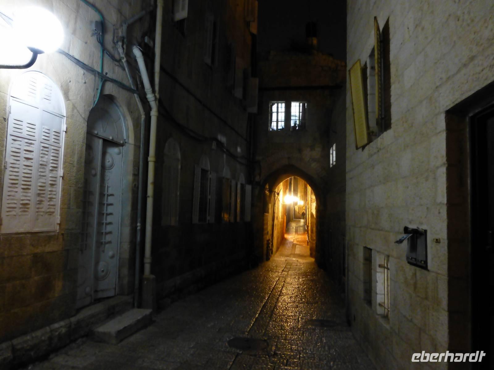 Durch das Zionstor, welches seit dem Unabhängigkeitskrieg 1948 Spuren heftiger Schießereien aufweist, erreichen wir das Armenische Viertel, eine kleine Stadt mit ca. 1300 armenischen Familien innerhalb der Stadtmauer. Wir schlenderten eine Meter durch das Viertel und erreichten das Jüdische Viertel, welches den südöstlichen Teil der Altstadt einnimmt. Etwa 900 jüdische Familien leben heute in diesem Viertel, das ein Musterbeispiel für die durchdachte und einfühlsame Wiederherstellung einer historischen Altstadt darstellt. Durch offene Fenster hörten wir die Stimmen von Kindern, Jugendlichen und Erwachsenen, die in spärlich eingerichteten Talmudschulen, ganz traditionell in schwarz gekleidet, den Talmud studieren. Wir fühlten uns in eine andere Zeit versetzt.
