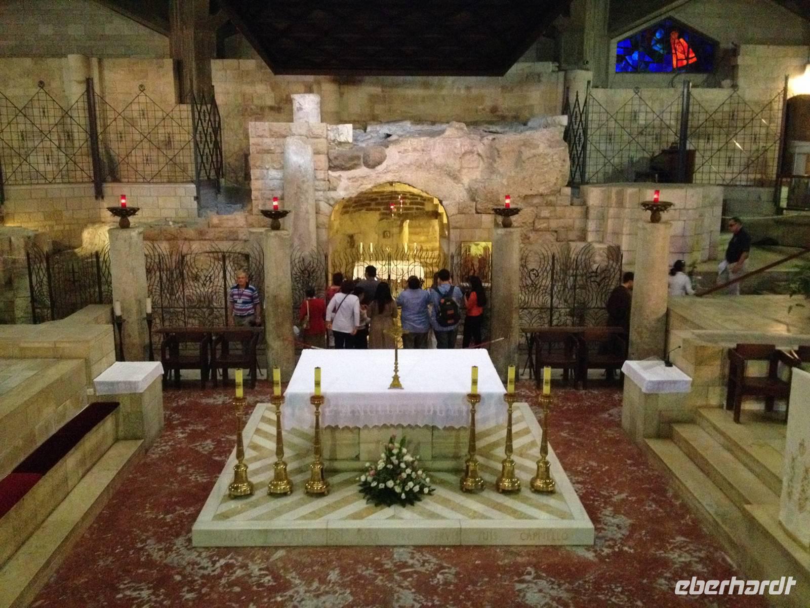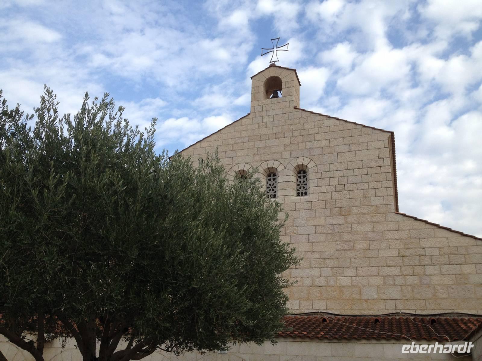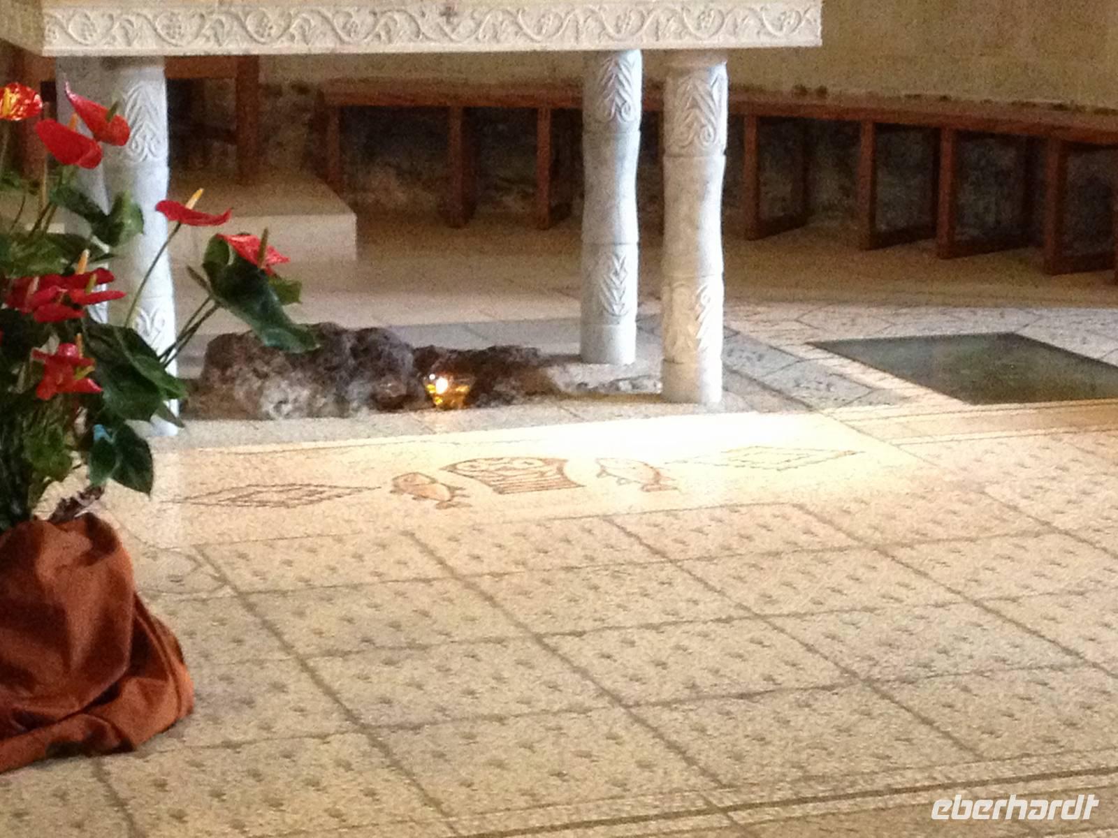 Frisch gestärkt besuchten wir die Kirche der Brotvermehrung (sie gehört den deutschen Benediktinern) in Tabgha, die zusammen mit der St.-Peterskapelle an Schlüsselereignisse der christlichen Kirchengeschichte erinnert. Zwar ist die Kirche selbst nicht aus Jesu Zeiten, doch der Stein unter dem Altar hat eine besondere, historische Bedeutung: Darauf soll Jesus die Fische und Brote gelegt, die nach Seinem Dankgebet auf so wunderbare Weise vermehrt wurden, sodass 5.000 Männer und dazu Frauen und Kinder satt wurden.