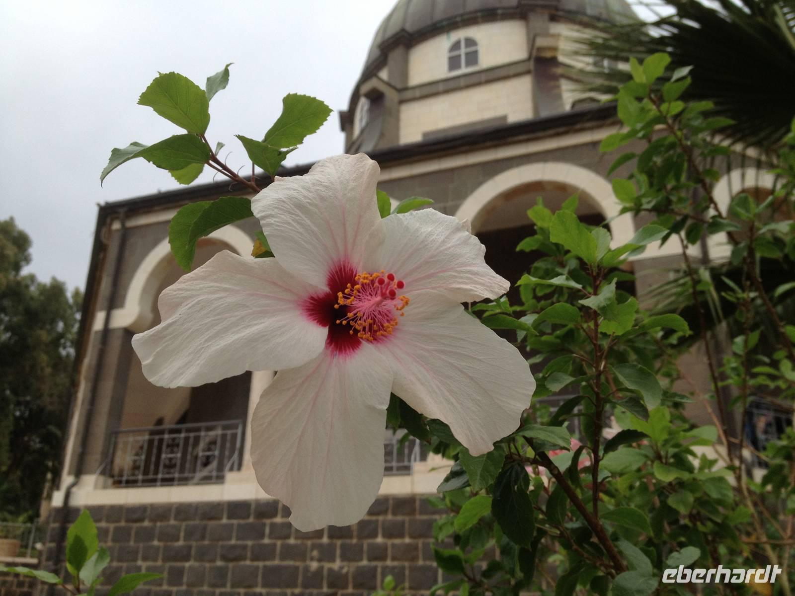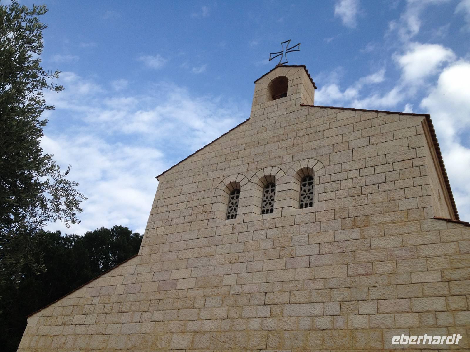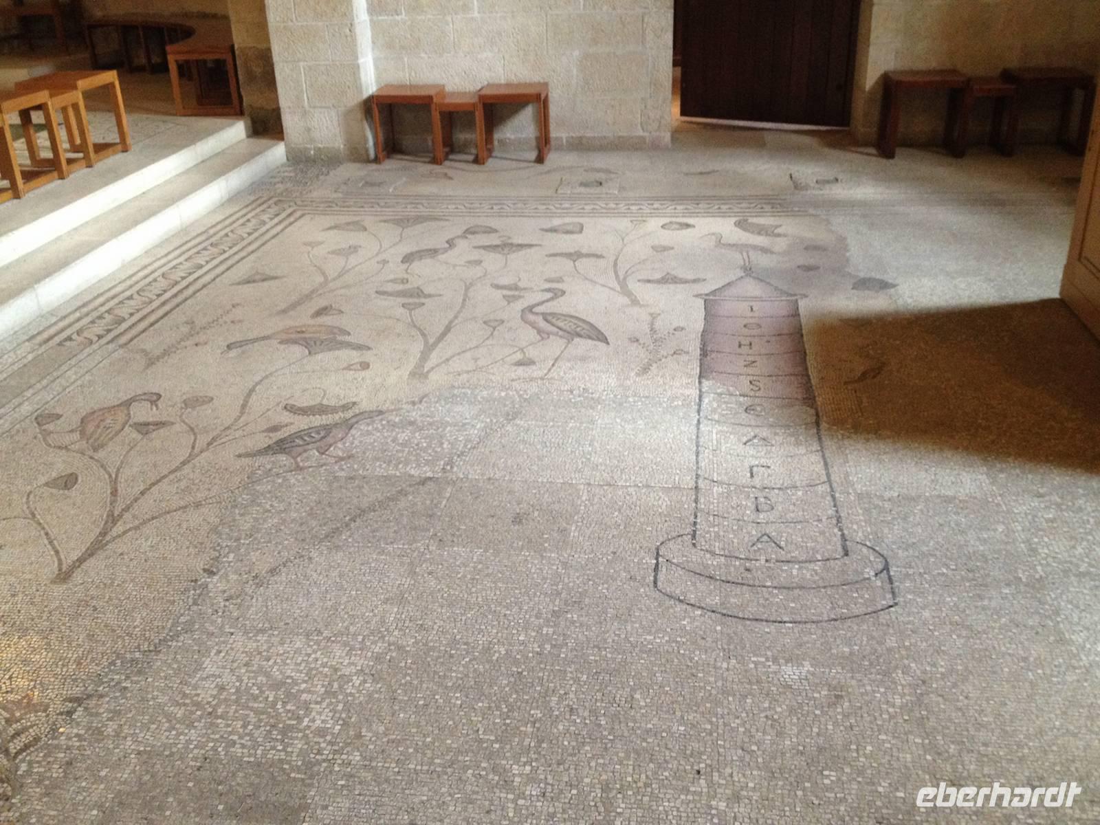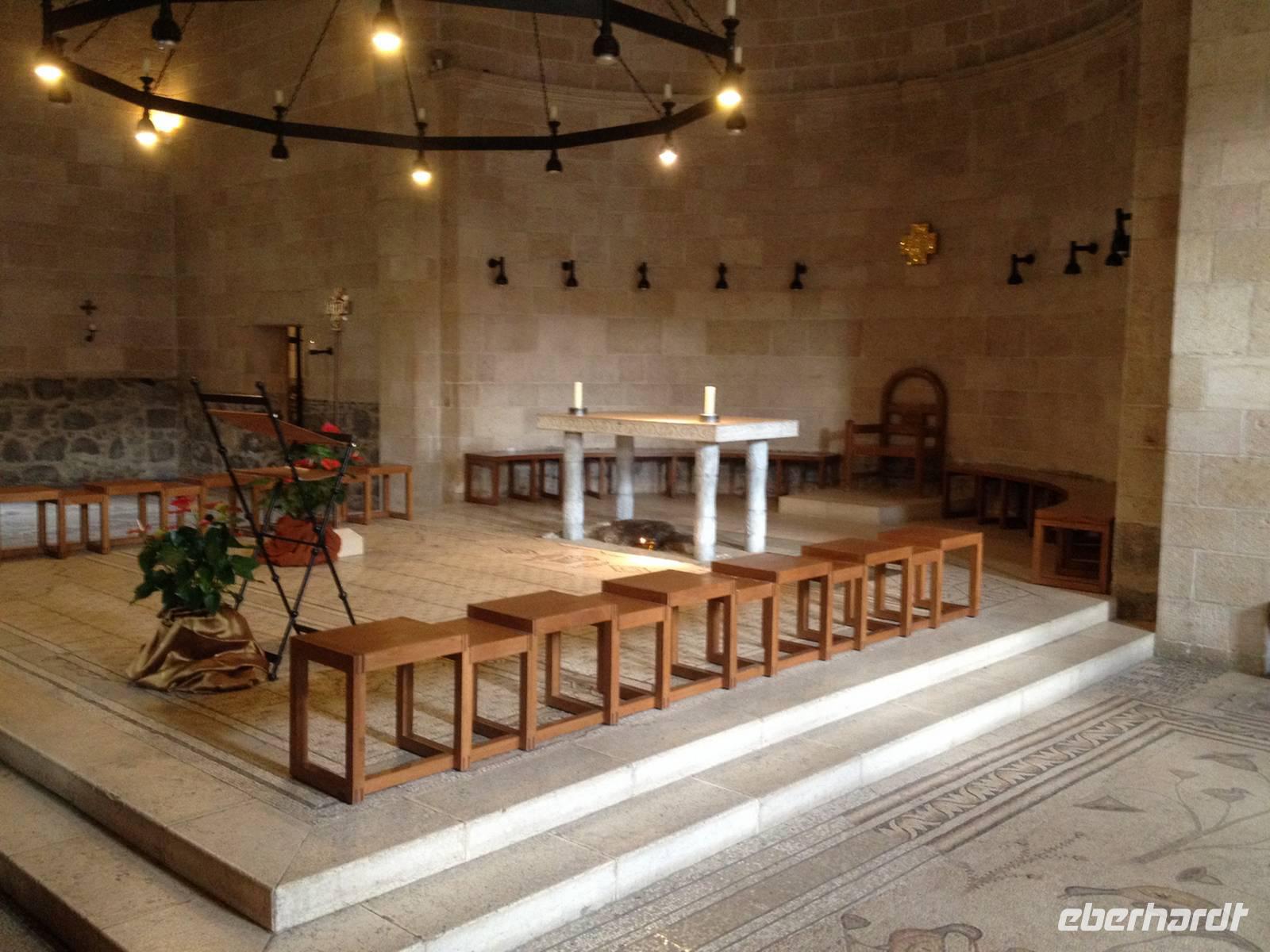 Frisch gestärkt besuchten wir die Kirche der Brotvermehrung (sie gehört den deutschen Benediktinern) in Tabgha, die zusammen mit der St.-Peterskapelle an Schlüsselereignisse der christlichen Kirchengeschichte erinnert. Zwar ist die Kirche selbst nicht aus Jesu Zeiten, doch der Stein unter dem Altar hat eine besondere, historische Bedeutung: Darauf soll Jesus die Fische und Brote gelegt, die nach Seinem Dankgebet auf so wunderbare Weise vermehrt wurden, sodass 5.000 Männer und dazu Frauen und Kinder satt wurden.