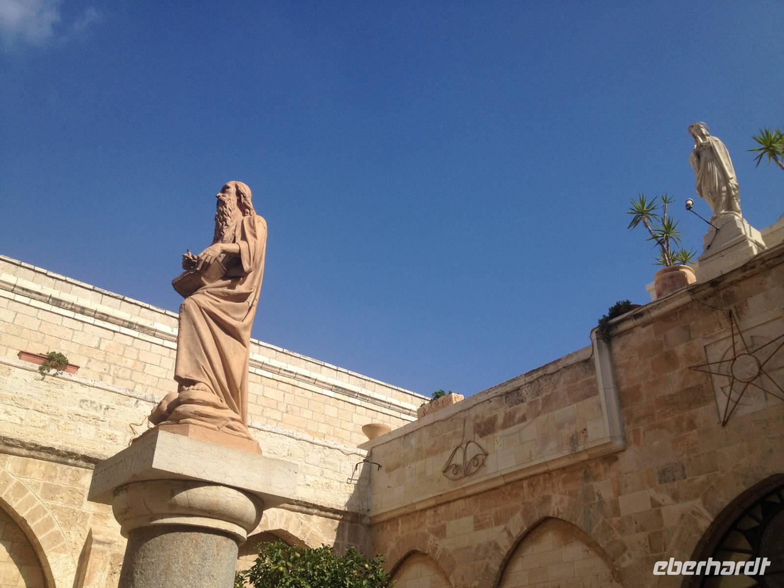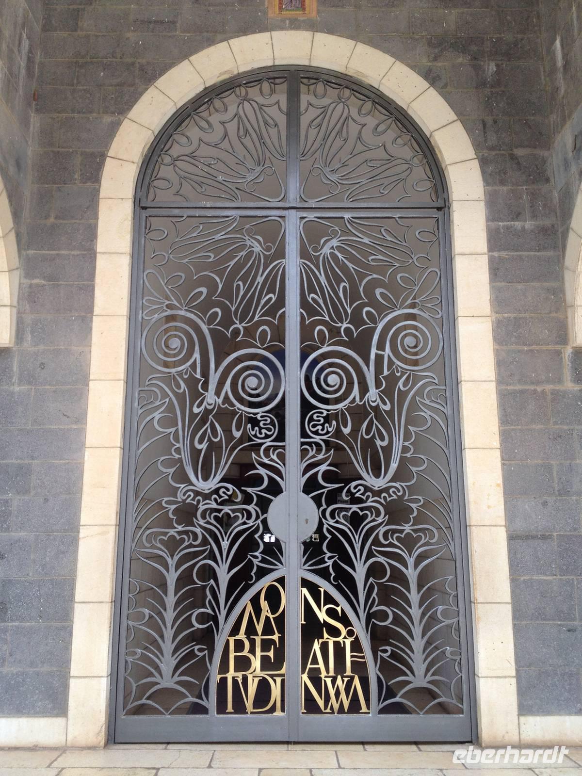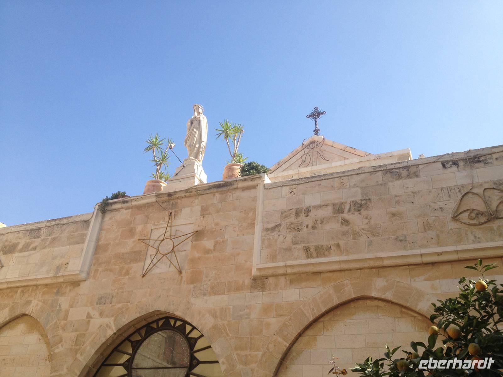 Das Highlight ist die Verkündigungskirche, die aus zwei übereinanderliegenden Kirchen besteht. Im Kreuzgang erblickten wir reich verzierte Mauern mit Wandmosaiken aus aller Welt. Vor dem Betreten der Kirche sahen wir an den großen Bronzeportalen einige Schlüsselszenen des Christentums und des Lebens von Jesu: Sündenfall, Taufe, Bergpredigt, Kreuzigung und Auferstehung.