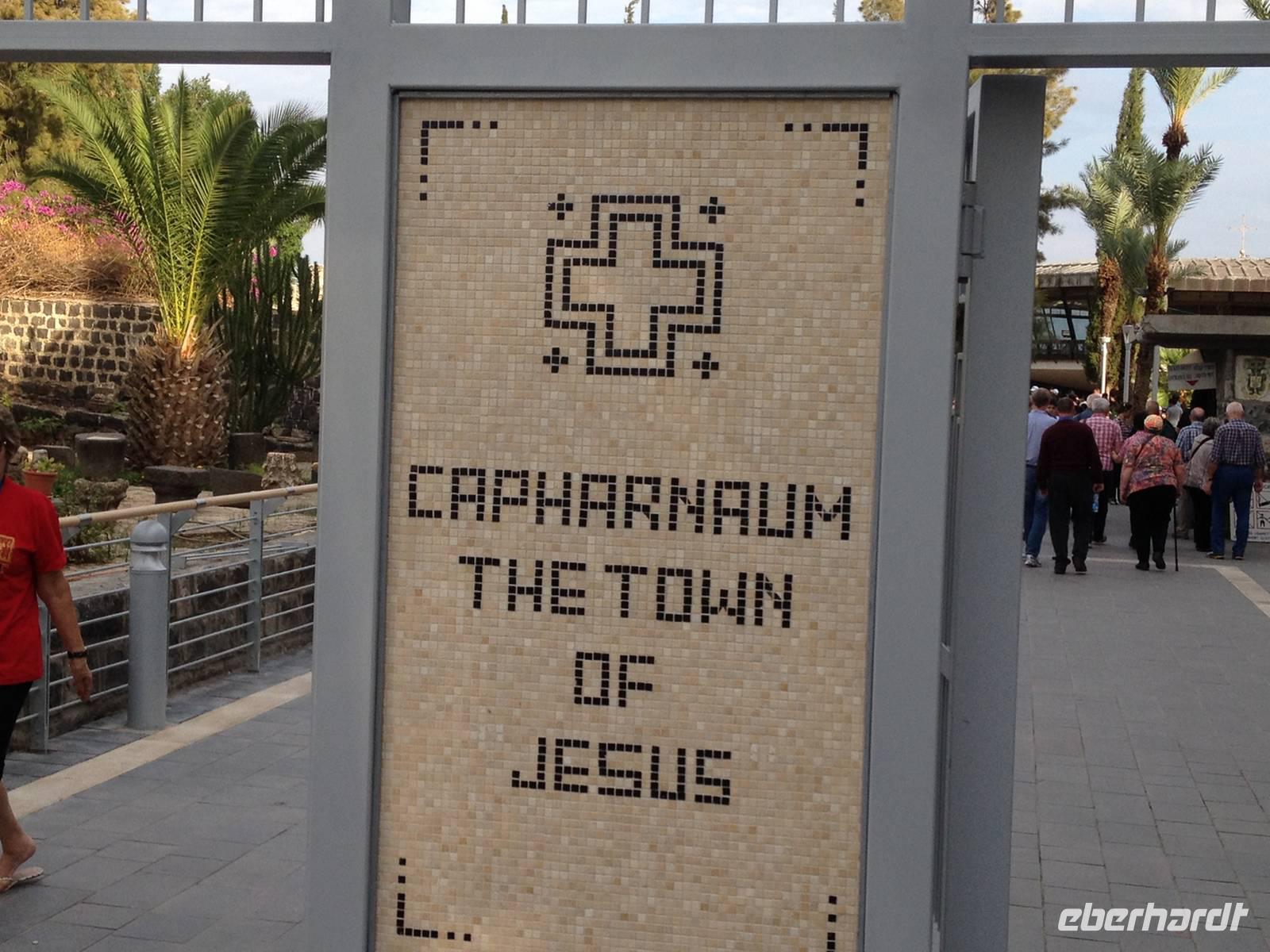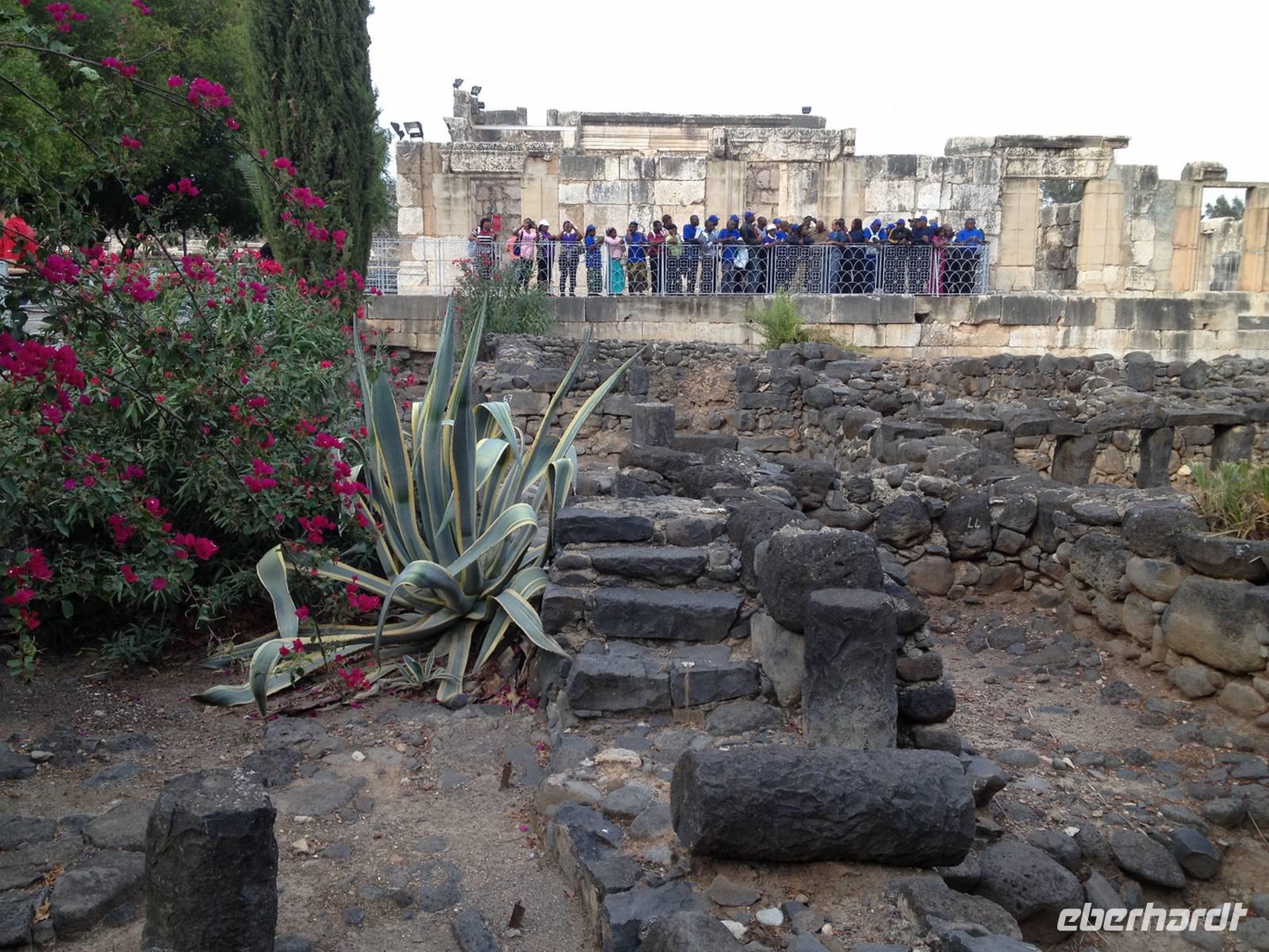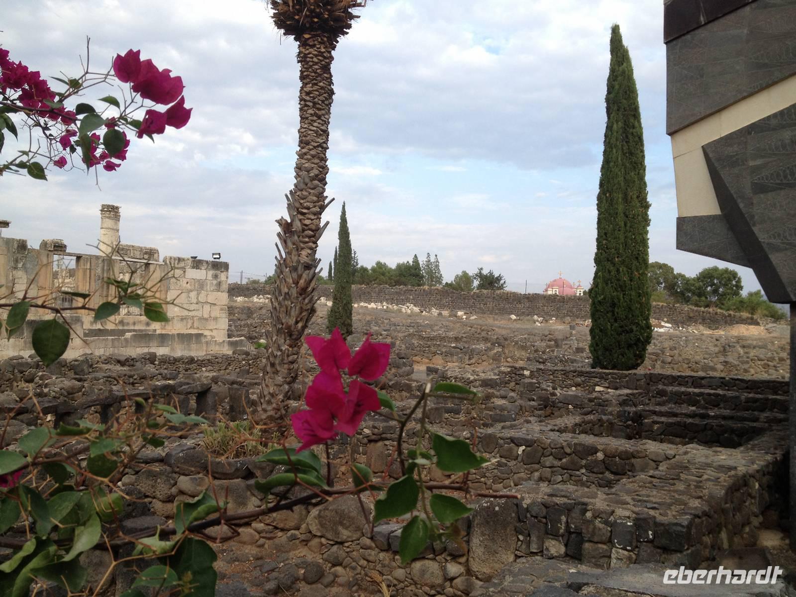 Ein weiterer, wichtiger Bezugspunkt der biblischen Geschichte ist Kapernaum. 1000 Jahre lang war Kapernaum vergessen, bis es 1838 von dem amerikanischen Archäologen und Massada-Entdecker Edward Robinson wiedergefunden wurde. Heute leben hier nur noch Mönche eines Franziskanerklosters und Brüder einer griech.-orthodoxen Gemeinde, deren roter Kuppelbau ins Auge sticht. Hier lebte Jesus nicht nur einige Zeit, sondern er tadelte auch die Bürger mit scharfen Worten. Nach seiner Kreuzigung und der Zerstörung des Tempels in Jerusalem, flüchteten viele Juden nach Kapernaum und es entwickelte sich eine Gemeinde mit blühendem Handel und Fischfang.