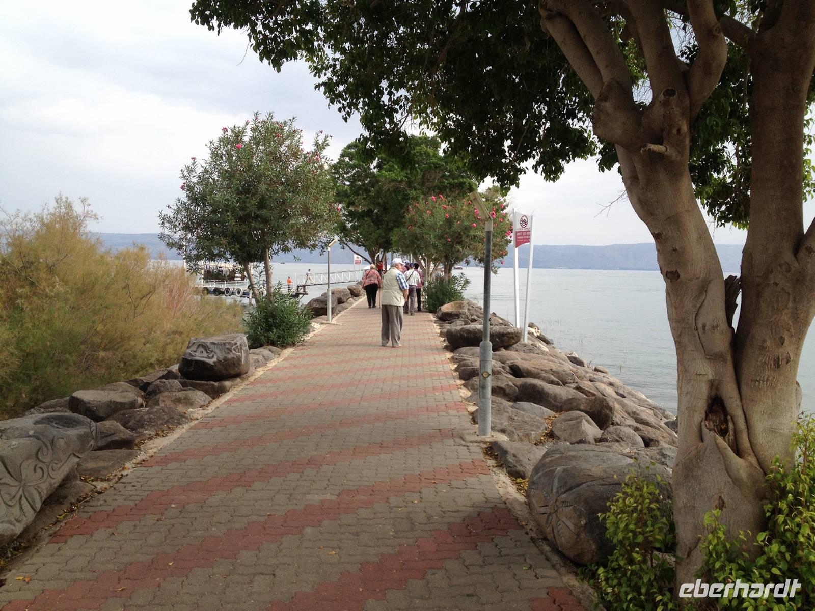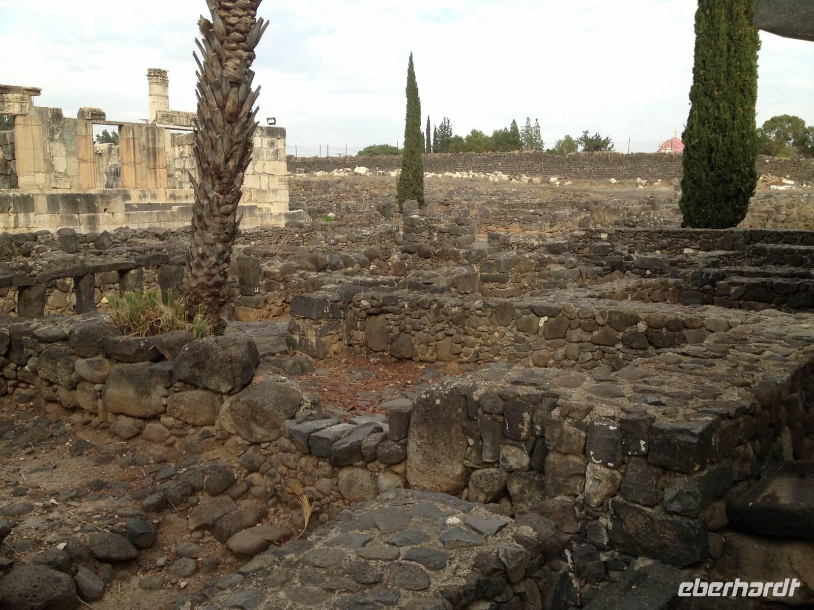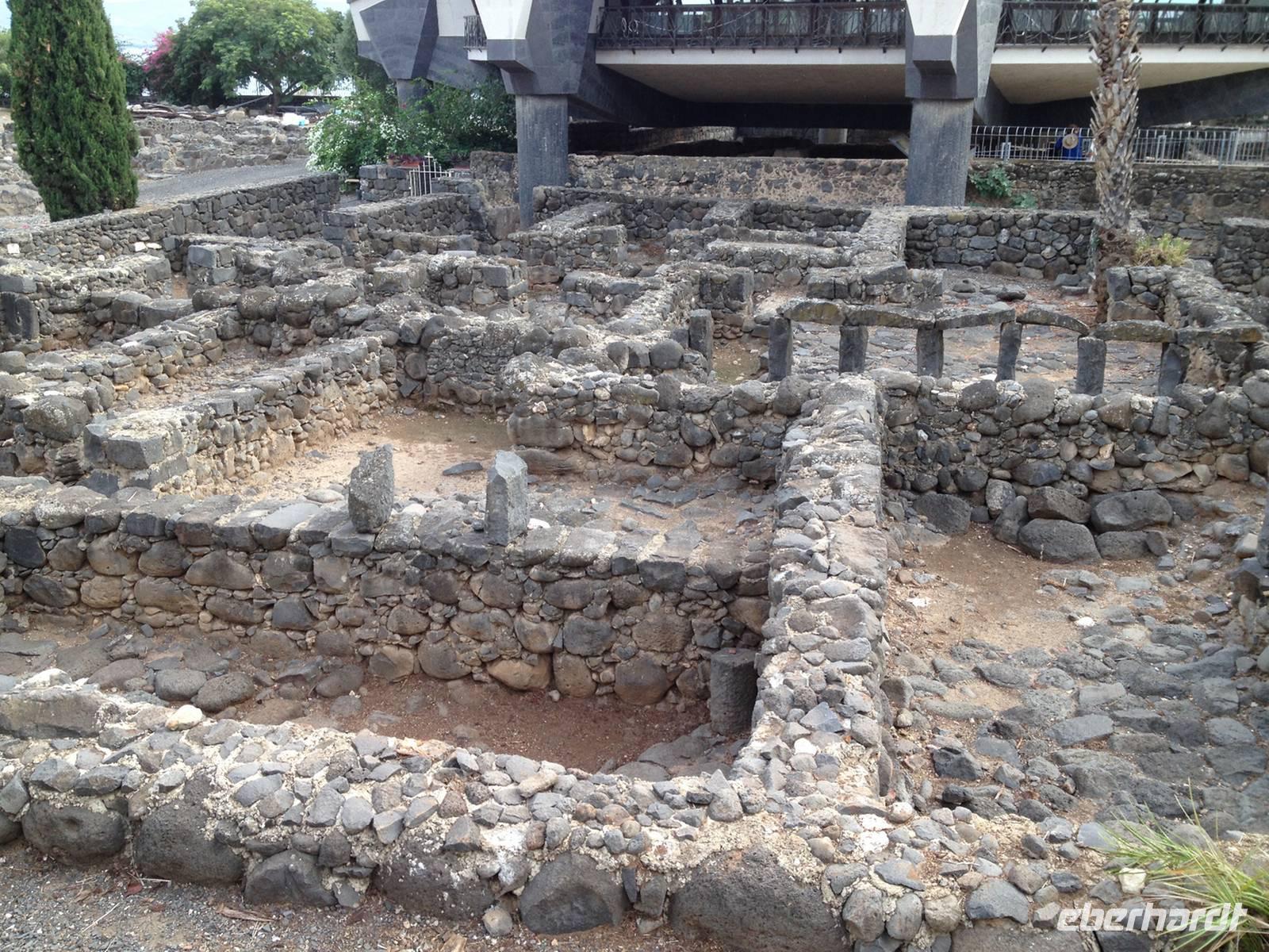 Ein weiterer, wichtiger Bezugspunkt der biblischen Geschichte ist Kapernaum. 1000 Jahre lang war Kapernaum vergessen, bis es 1838 von dem amerikanischen Archäologen und Massada-Entdecker Edward Robinson wiedergefunden wurde. Heute leben hier nur noch Mönche eines Franziskanerklosters und Brüder einer griech.-orthodoxen Gemeinde, deren roter Kuppelbau ins Auge sticht. Hier lebte Jesus nicht nur einige Zeit, sondern er tadelte auch die Bürger mit scharfen Worten. Nach seiner Kreuzigung und der Zerstörung des Tempels in Jerusalem, flüchteten viele Juden nach Kapernaum und es entwickelte sich eine Gemeinde mit blühendem Handel und Fischfang.