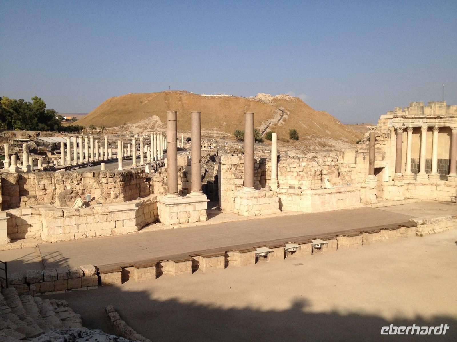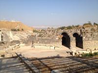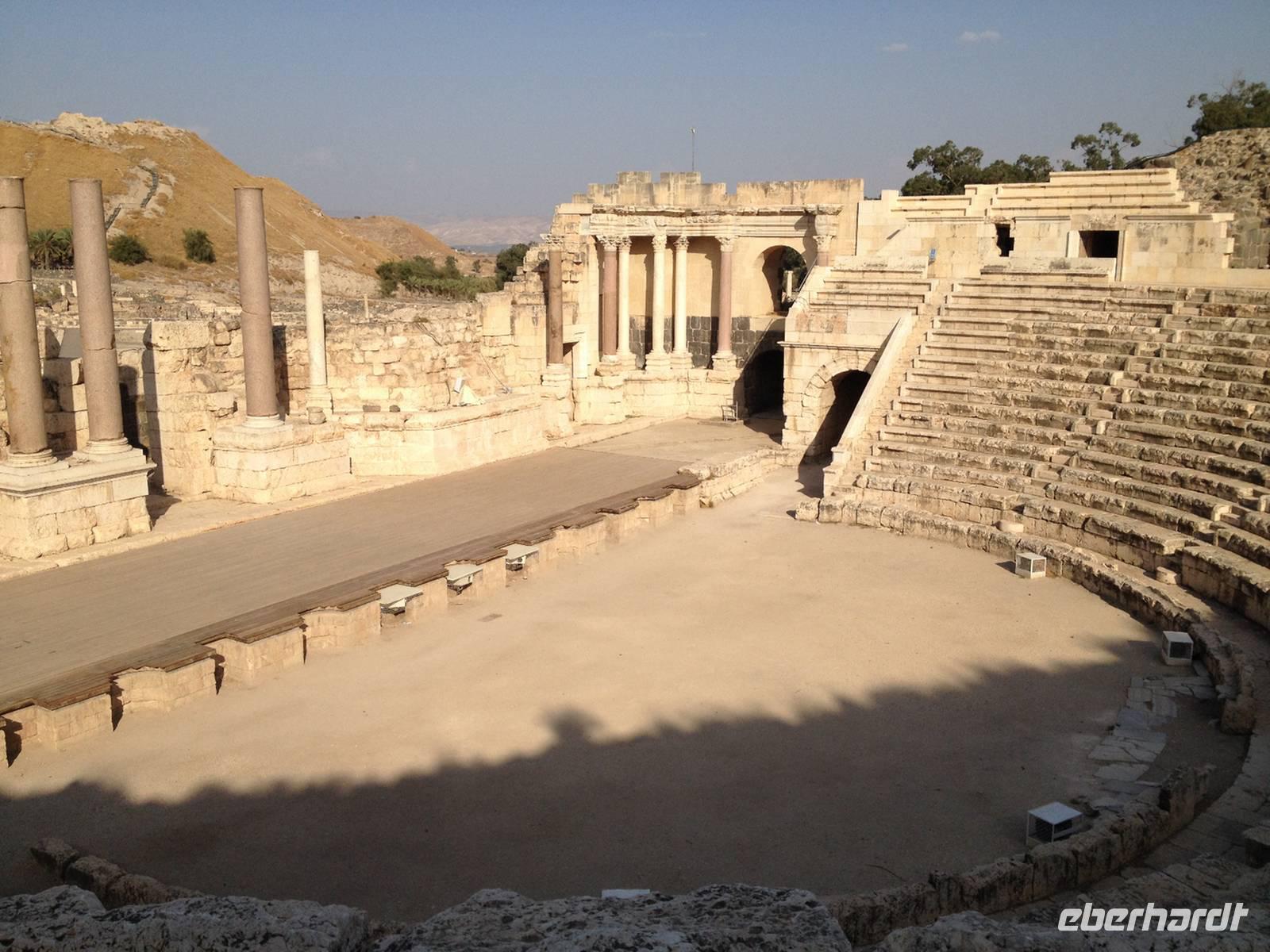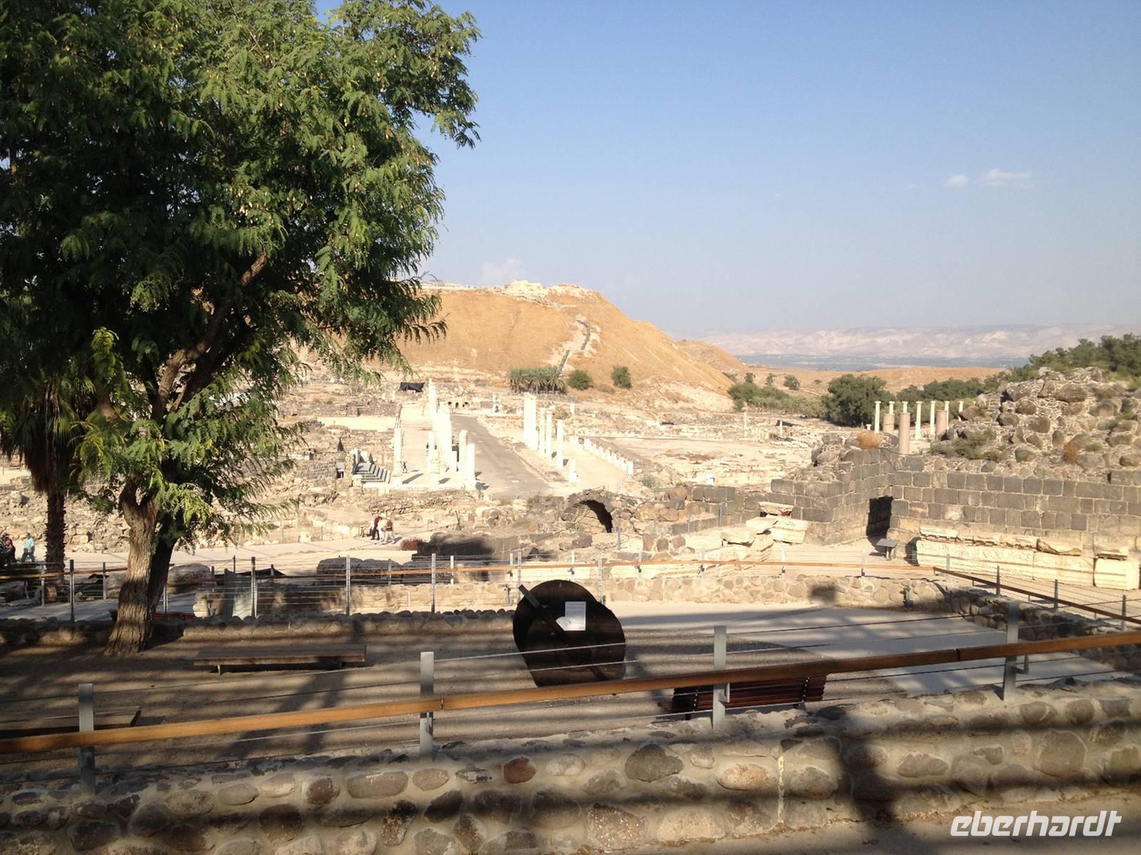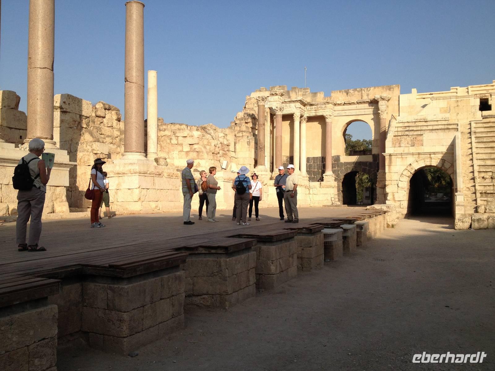 Nach der Mittagspause, bei der wir wieder leckeres Shawarma mit Fleisch oder Falafel probierten, reiseten wir in Richtung Beit She'an - Israels wichtigste Ausgrabungsstätte, in der bisher die Überreste von über 20 Städten gefunden wurden. Dies ist der Ort, über den ein jüdisches Sprichwort sagt, wenn das Paradies in Israel liege, dann sei Beit She'an die Eingangspforte. Und genau davon überzeugten wir uns bei einem interessanten Rundgang mit David. Während des Rundgangs mit zahlreichen Geschichten und Anekdoten begeisterten uns die Palladiusstraße, eine prächtige römische Kolonnadenstraße mit der Pflasterung aus Basaltstein, die im Fischgrätenmuster verlegt waren. Weiterhin ließen wir uns von den sehr gut erhaltenen Bauwerken wie das Römische Theater, das Römische Badehaus und natürlich das mächtige Amphitheater beeindrucken.