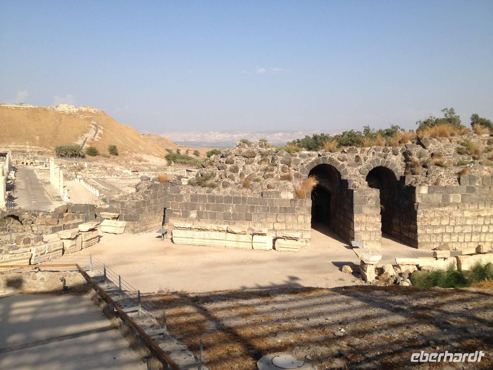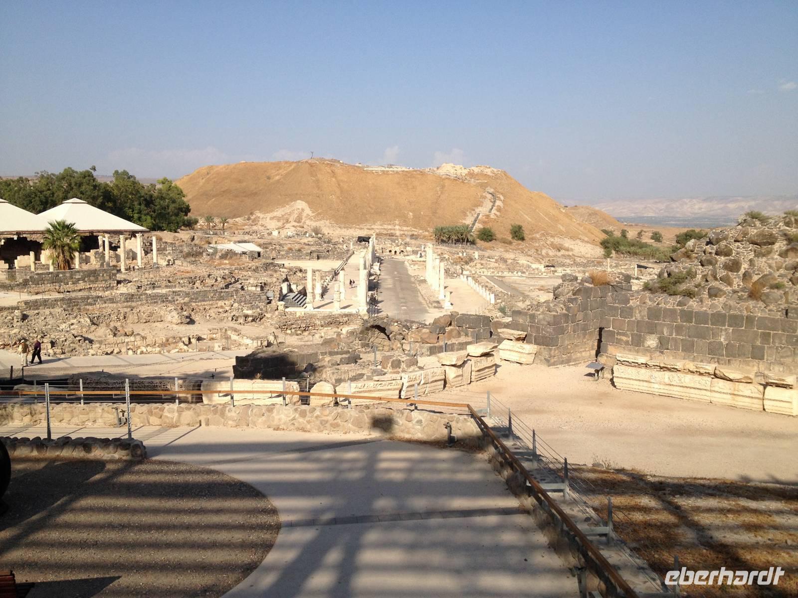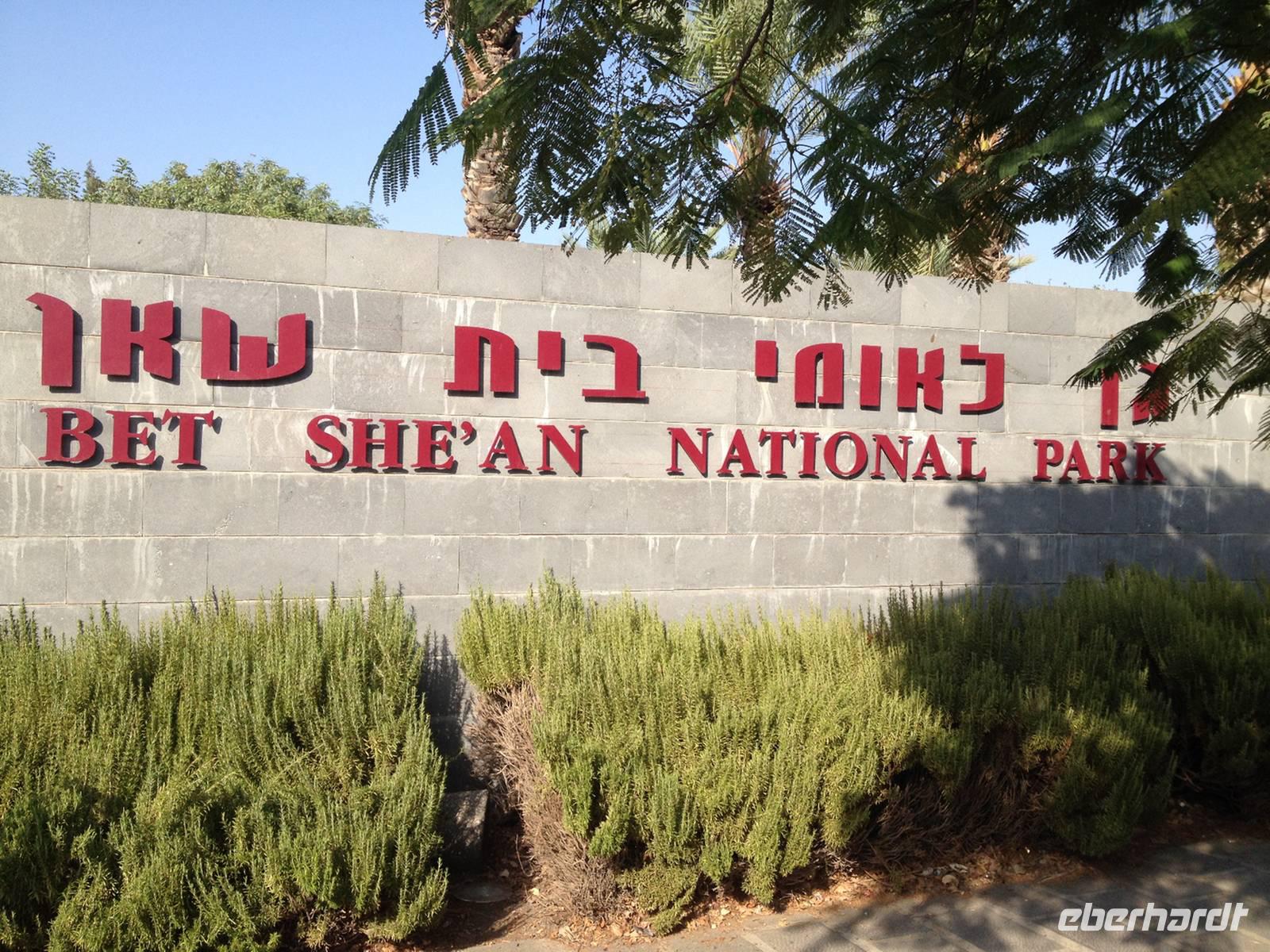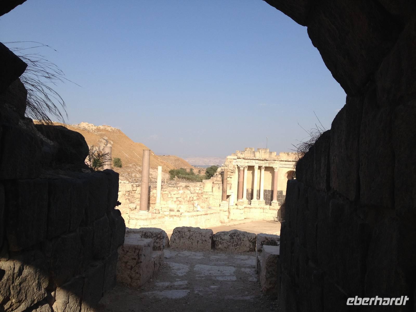Nach der Mittagspause, bei der wir wieder leckeres Shawarma mit Fleisch oder Falafel probierten, reiseten wir in Richtung Beit She'an - Israels wichtigste Ausgrabungsstätte, in der bisher die Überreste von über 20 Städten gefunden wurden. Dies ist der Ort, über den ein jüdisches Sprichwort sagt, wenn das Paradies in Israel liege, dann sei Beit She'an die Eingangspforte. Und genau davon überzeugten wir uns bei einem interessanten Rundgang mit David. Während des Rundgangs mit zahlreichen Geschichten und Anekdoten begeisterten uns die Palladiusstraße, eine prächtige römische Kolonnadenstraße mit der Pflasterung aus Basaltstein, die im Fischgrätenmuster verlegt waren. Weiterhin ließen wir uns von den sehr gut erhaltenen Bauwerken wie das Römische Theater, das Römische Badehaus und natürlich das mächtige Amphitheater beeindrucken.