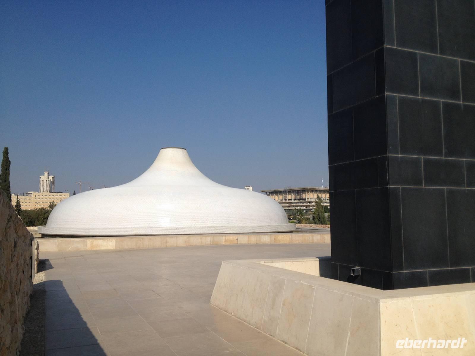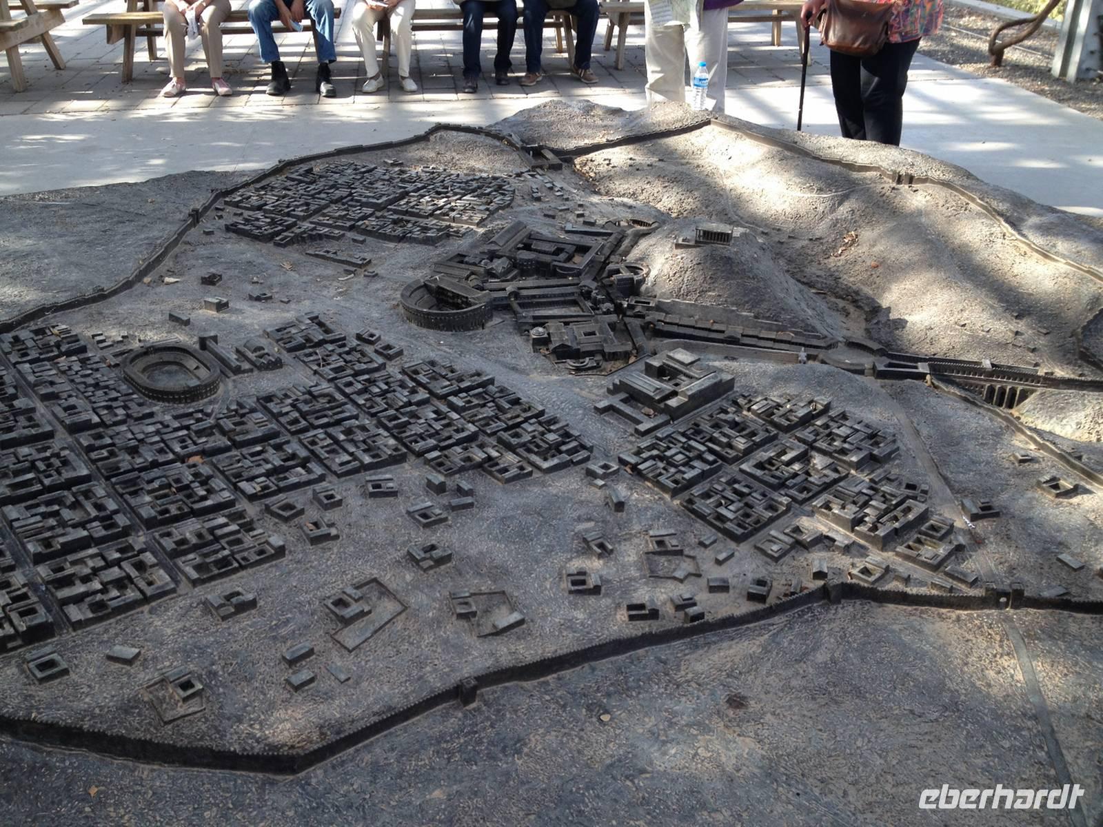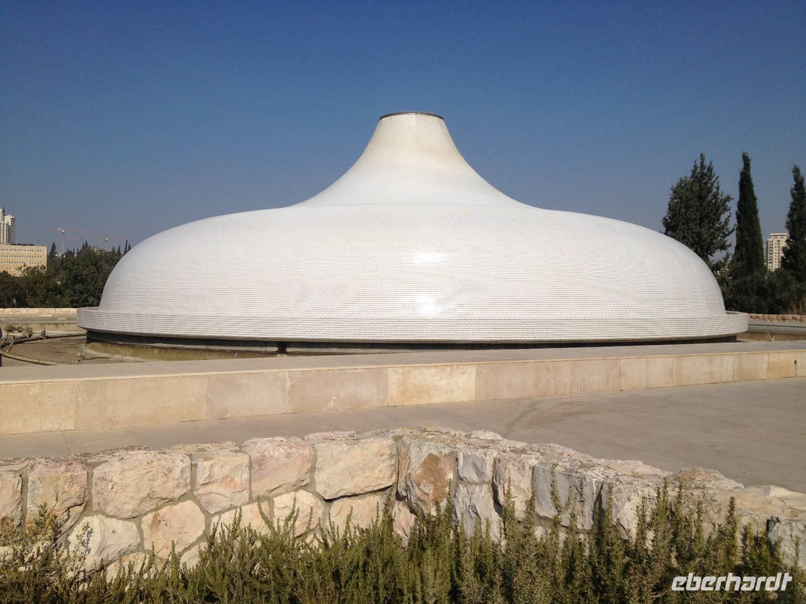 Als ein absolutes Highlight darf das Israel-Museum nicht fehlen. Also machten wir uns auf den Weg dorthin. Schon alleine die Anlage mit mehreren Glas- und Steinpavillons, die sich terrassenförmig über einen sanften Hügel erstrecken, sind eine Augenweide. Das Museum zeigt Archäologisches, Ethnografisches, Judaika sowie klassische und moderne Kunst. Dafür würde man schon alleine einen Tag benötigen. Vielmehr interessierten uns aber das Modell der Stadt Jerusalem in der Zeit der zweiten Tempelperiode und der Schrein des Buches, der sich unter einer markanten, mit weißem Porzellan gedeckten Kuppel befindet. Die Form entspricht den Deckeln jener Terrakottakrüge, in denen die Schriftrollen von Qumran (wir erinnerten uns) gefunden wurden.