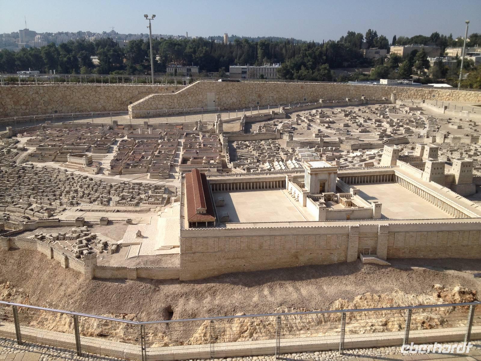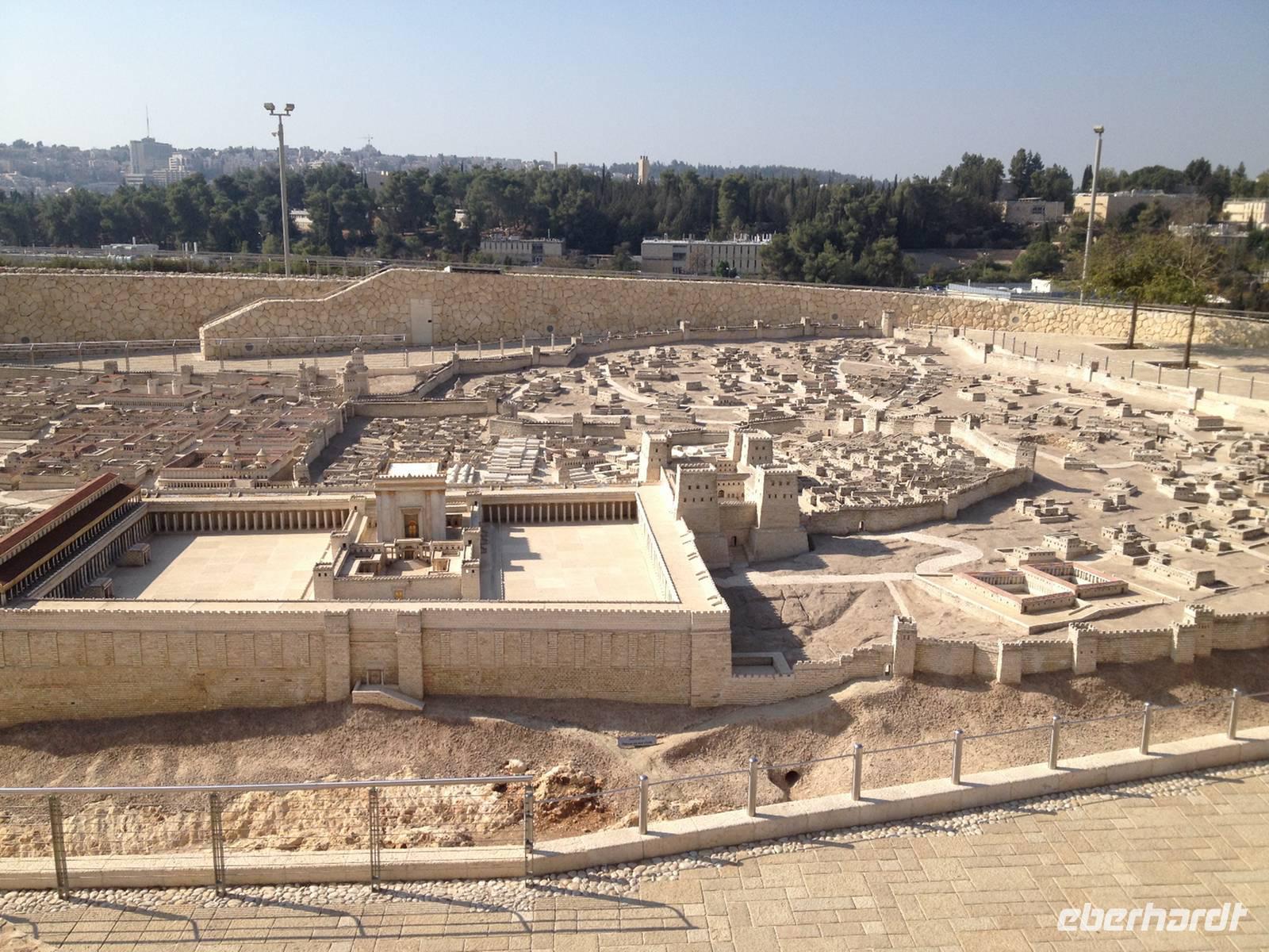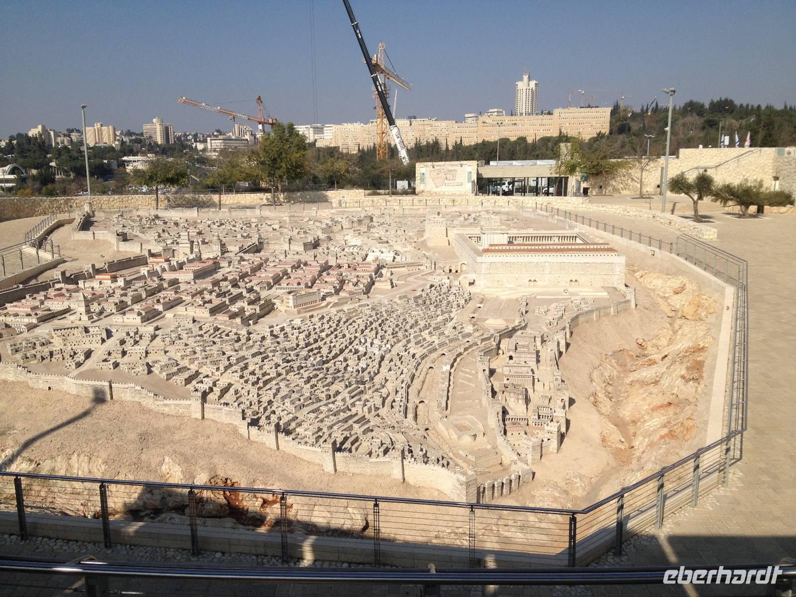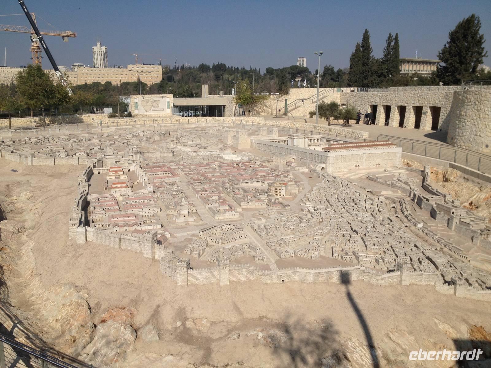 Als ein absolutes Highlight darf das Israel-Museum nicht fehlen. Also machten wir uns auf den Weg dorthin. Schon alleine die Anlage mit mehreren Glas- und Steinpavillons, die sich terrassenförmig über einen sanften Hügel erstrecken, sind eine Augenweide. Das Museum zeigt Archäologisches, Ethnografisches, Judaika sowie klassische und moderne Kunst. Dafür würde man schon alleine einen Tag benötigen. Vielmehr interessierten uns aber das Modell der Stadt Jerusalem in der Zeit der zweiten Tempelperiode und der Schrein des Buches, der sich unter einer markanten, mit weißem Porzellan gedeckten Kuppel befindet. Die Form entspricht den Deckeln jener Terrakottakrüge, in denen die Schriftrollen von Qumran (wir erinnerten uns) gefunden wurden.