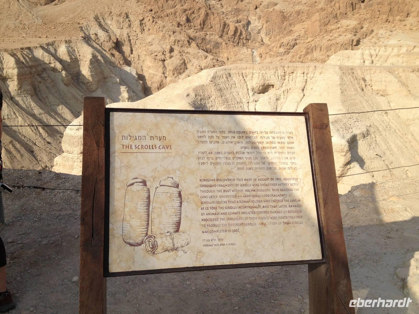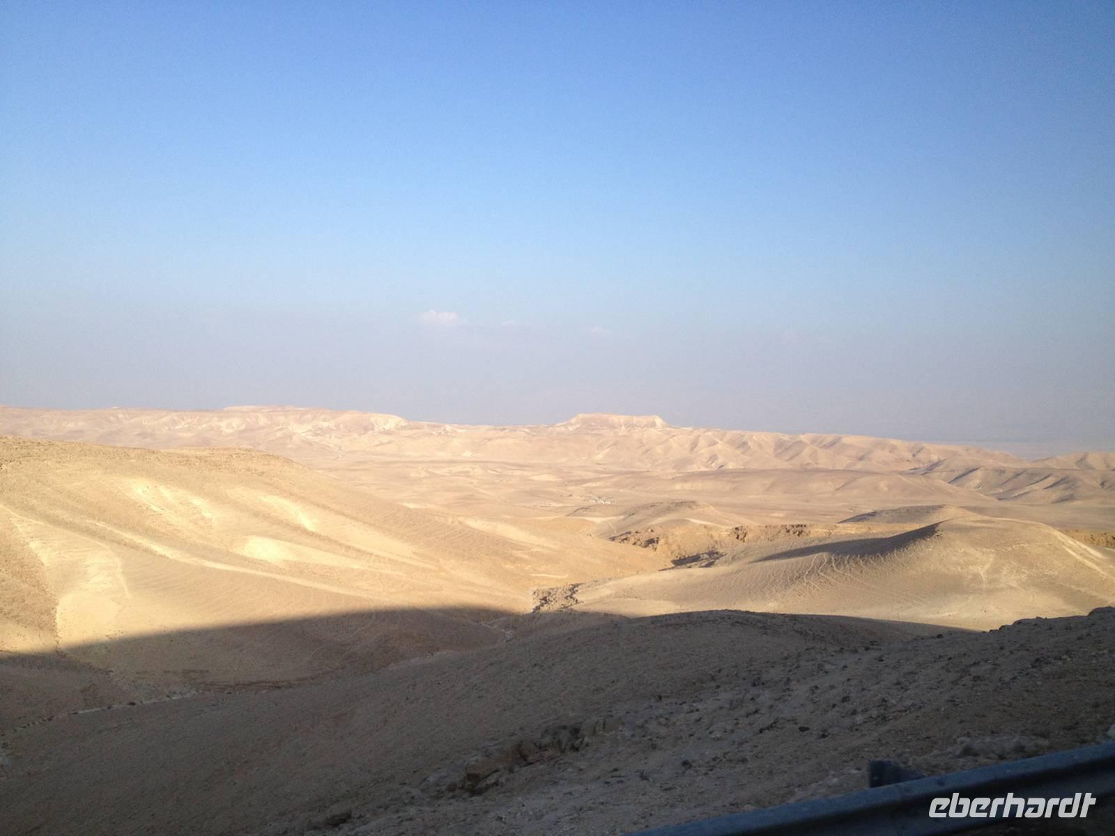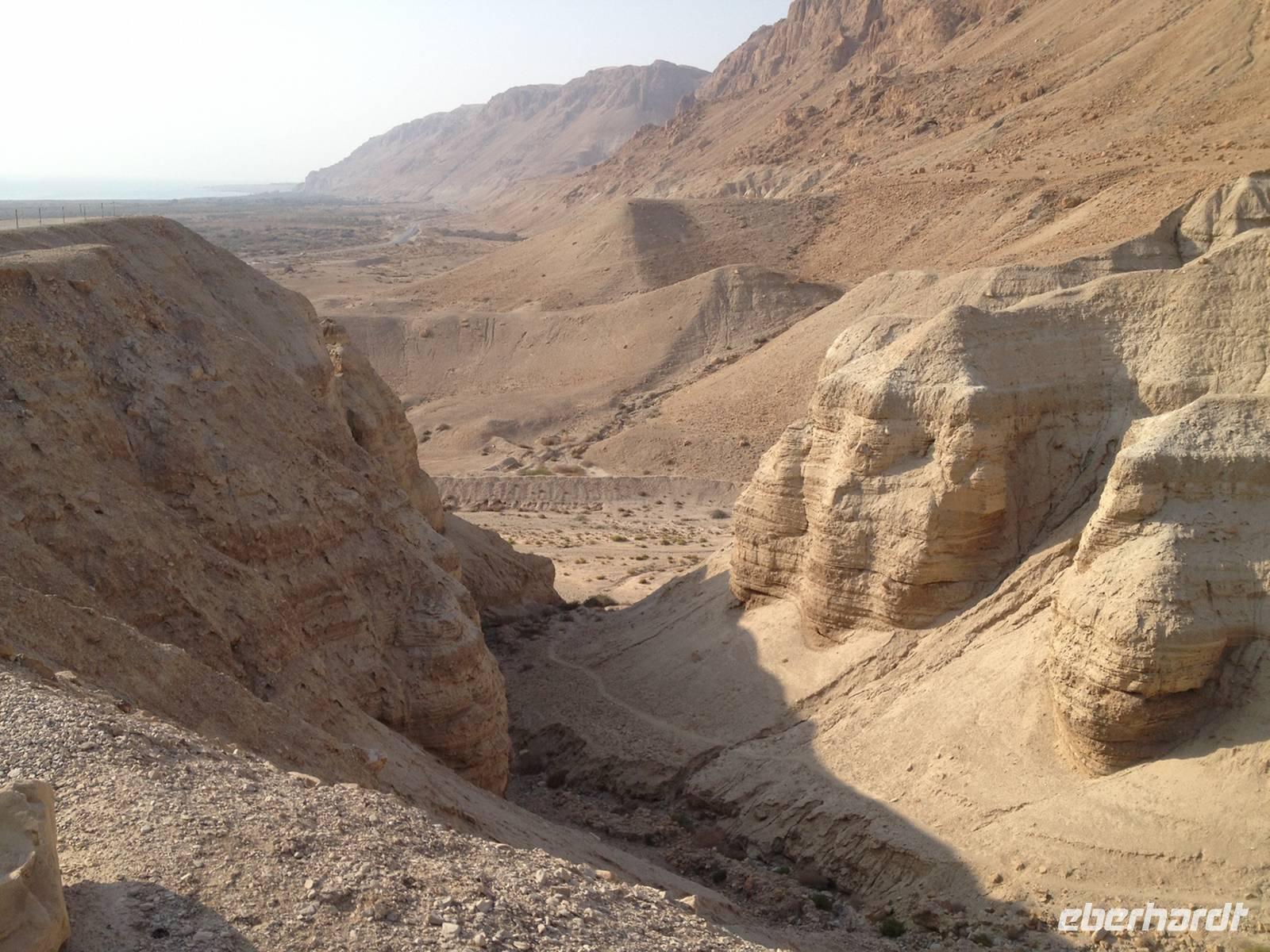 Die judäische Wüste wird von den Bergen Judäas im Westen und dem Toten Meer im Osten begrenzt. Sie ist mit 1.500 Quadratkilometern eine relativ kleine Wüste, beherbergt jedoch viele faszinierende Naturschutzgebiete, historische Orte, Klöster und urzeitliche Panoramen, die sie zu einem aufregenden und einzigartigen Ort machen. Unseren Besichtigungstag begannen wir im kargen Felsgebiet, von zahllosen Abgründen übersäten Qumran. Alles ist von der Sonne verbrannt, kein Grashalm kann und will hier überleben. Und genau hier wurden 1947 die gleichnamigen und weltbekannten Schriftrollen zufällig entdeckt - eine der größten Entdeckungen der Moderne! Hier suchte ein Beduinenjunge nach einem verloren gegangenen Lamm und stieß dabei in einer Höhle auf jene Terrakottakrüge, die die in Leinen gewickelten Pergamentrollen enthielten. Der Fund, dessen Bedeutung niemand abschätzen konnte, wurde kurz danach auf dem Basar in Bethlehem feilgeboten und fand schließlich seinen Weg in die Hände von Archäologen, die einen neuen Zweig der Bibelforschung eröffneten: die Qumran-Forschung.
