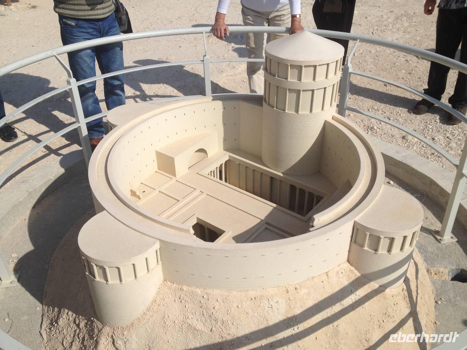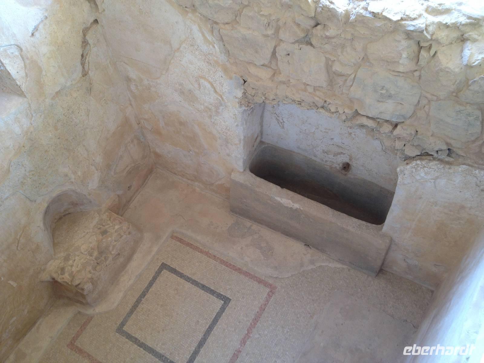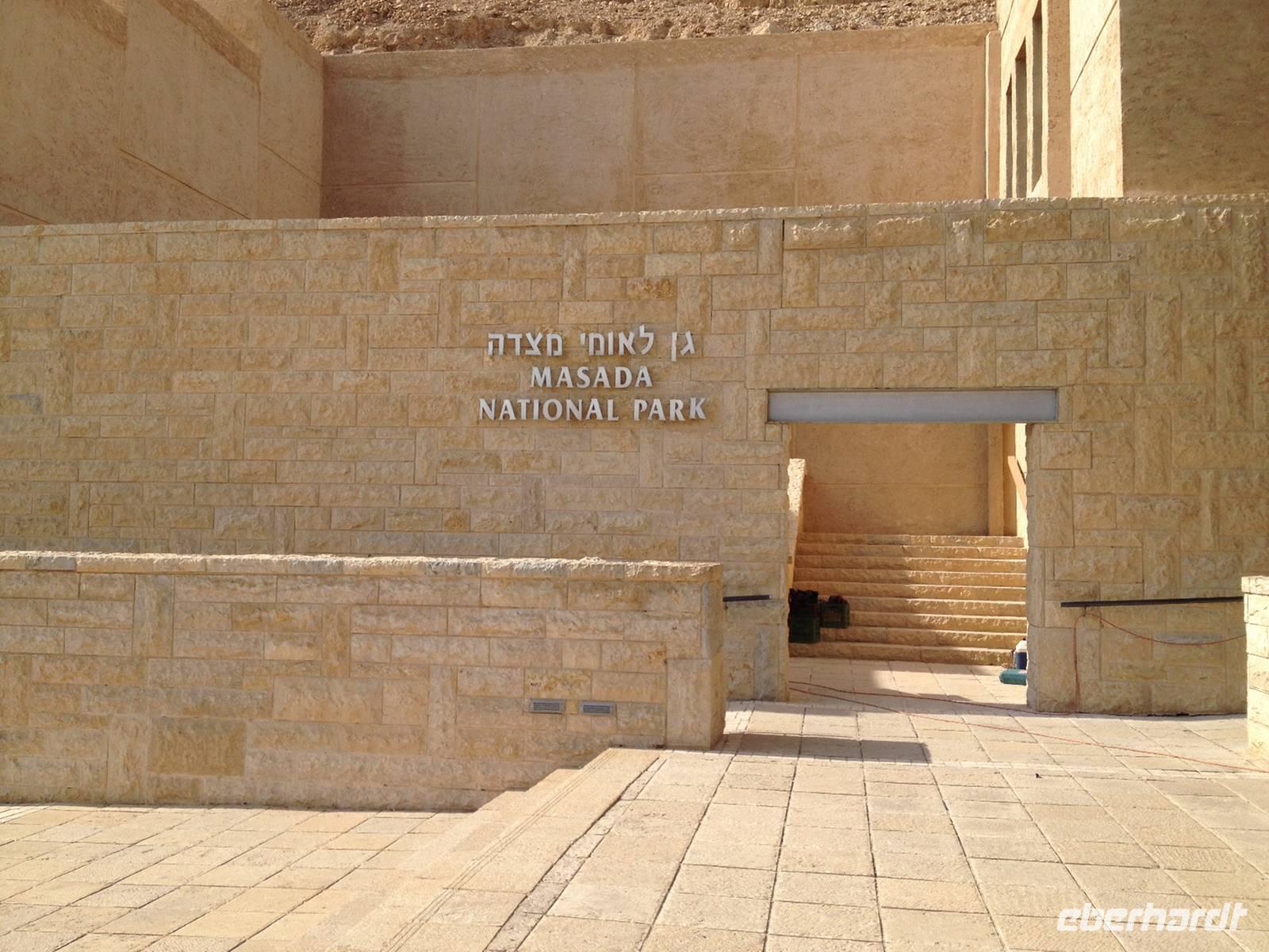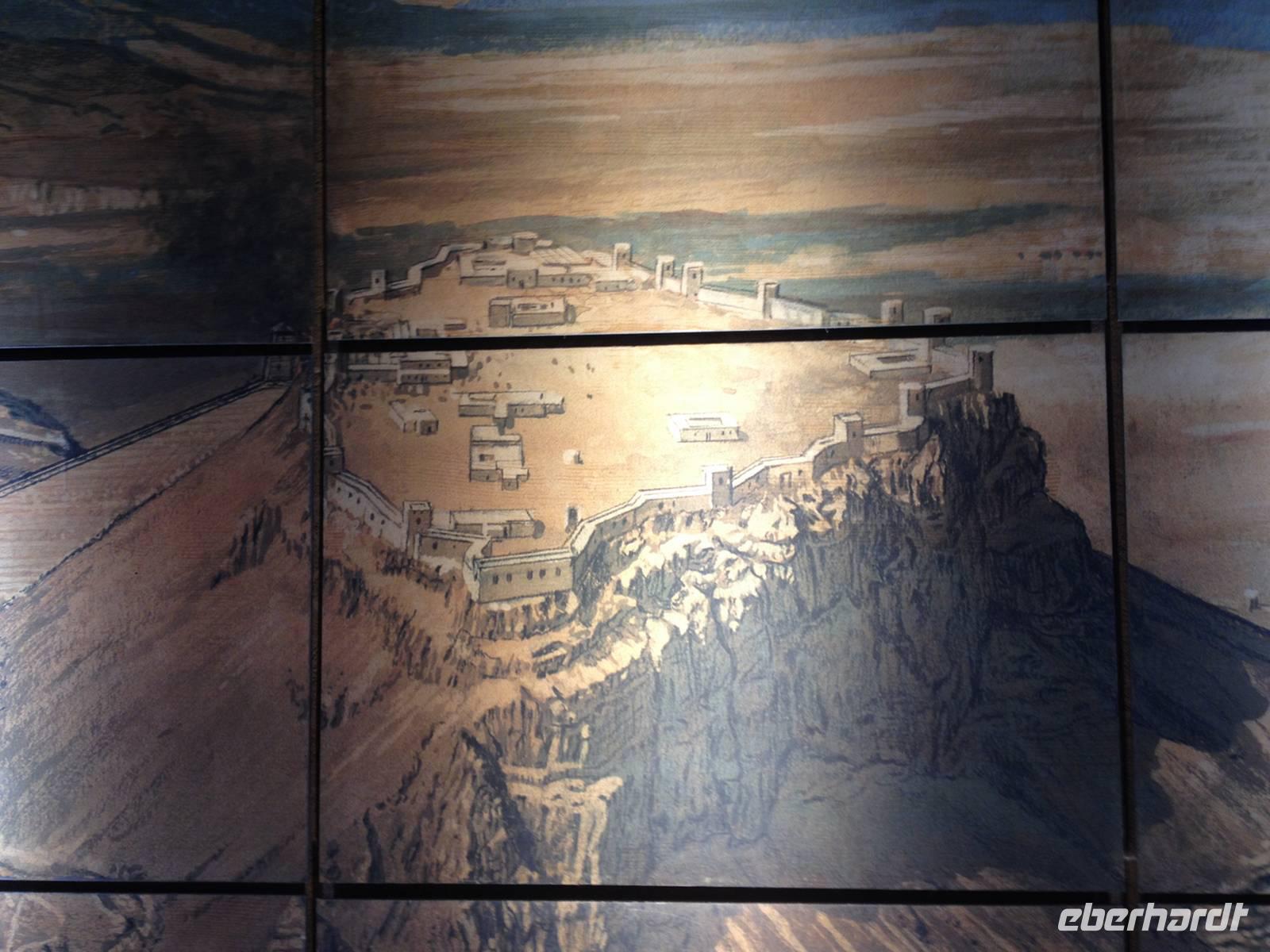 Ab 1951 wurde dann die Siedlung der Essener, die man bis dahin für eine römische Siedlung hielt, systematisch ausgegraben. Dabei fand man das Kloster mit Küche, Hof, Schreibsaal, Speisesaal und allem, was man für ein solch abgeschiedenes Leben brauchte. Mit ausführlichen Erklärungen von David erkundeten wir dieses Areal gemeinsam, bevor wir uns auf den Weg zur weltweit bekannten Felsenfestung Massada machten. Sie ist Israels imposantestes Symbol für Freiheit, Nationalpark und seit 2001 auch UNESCO-Weltkulturerbe. Die berühmte Festung erblickten wir schon von weitem. Auf einem mächtigen Felskliff liegt diese Festung in einer kargen Steinwüste. Ein interessanter Einführungsfilm stimmte uns auf die nächsten Entdeckungen ein. Neben dem Tempelberg in Jerusalem und dem Herodium südlich davon (beides werden wir noch sehen), ist dieses das dritte Zeugnis römischer Monumental-Baukunst, erbaut 37-31 v. Chr. Dieser Ort war von Herodes aus strategischen Gründen gewählt worden. Massada sollte Herodes als Zufluchtsort vor seinen jüdischen Feinden und Kleopatra dienen. Doch weder die eine noch die andere Bedrohung wurde jemals wahr. Herodes war nur ein einziges Mal dort - nicht flüchtend.