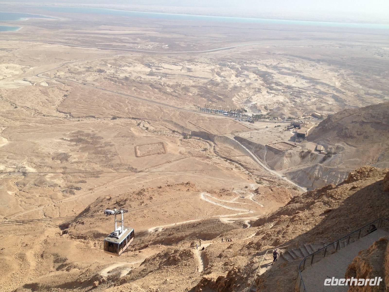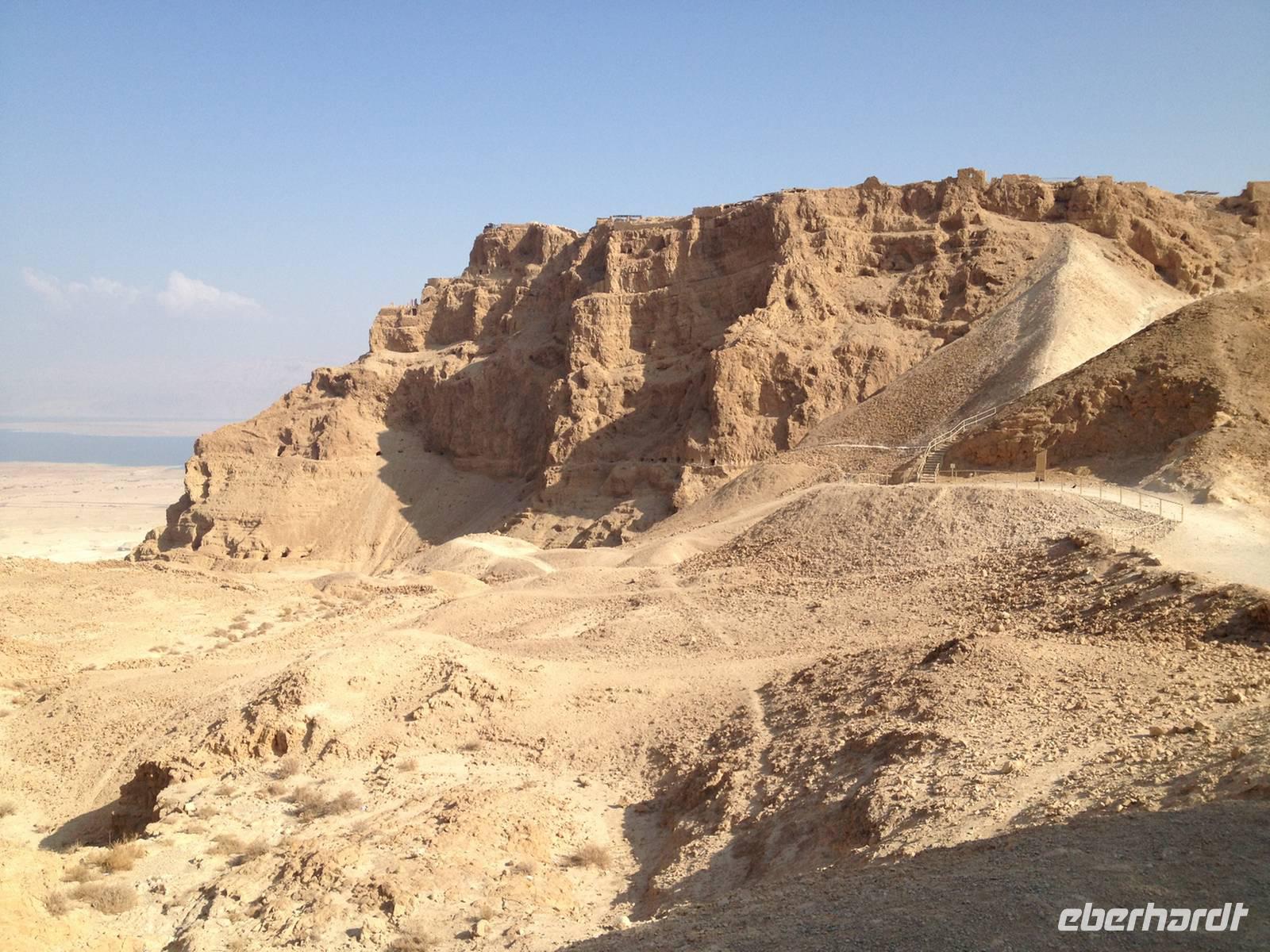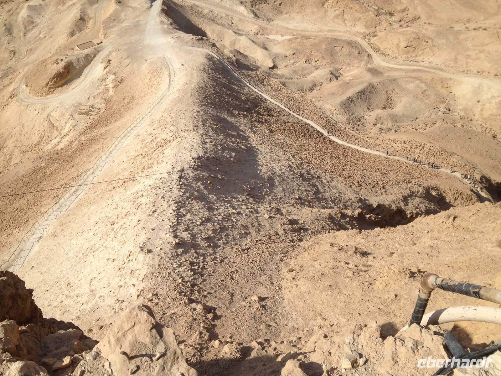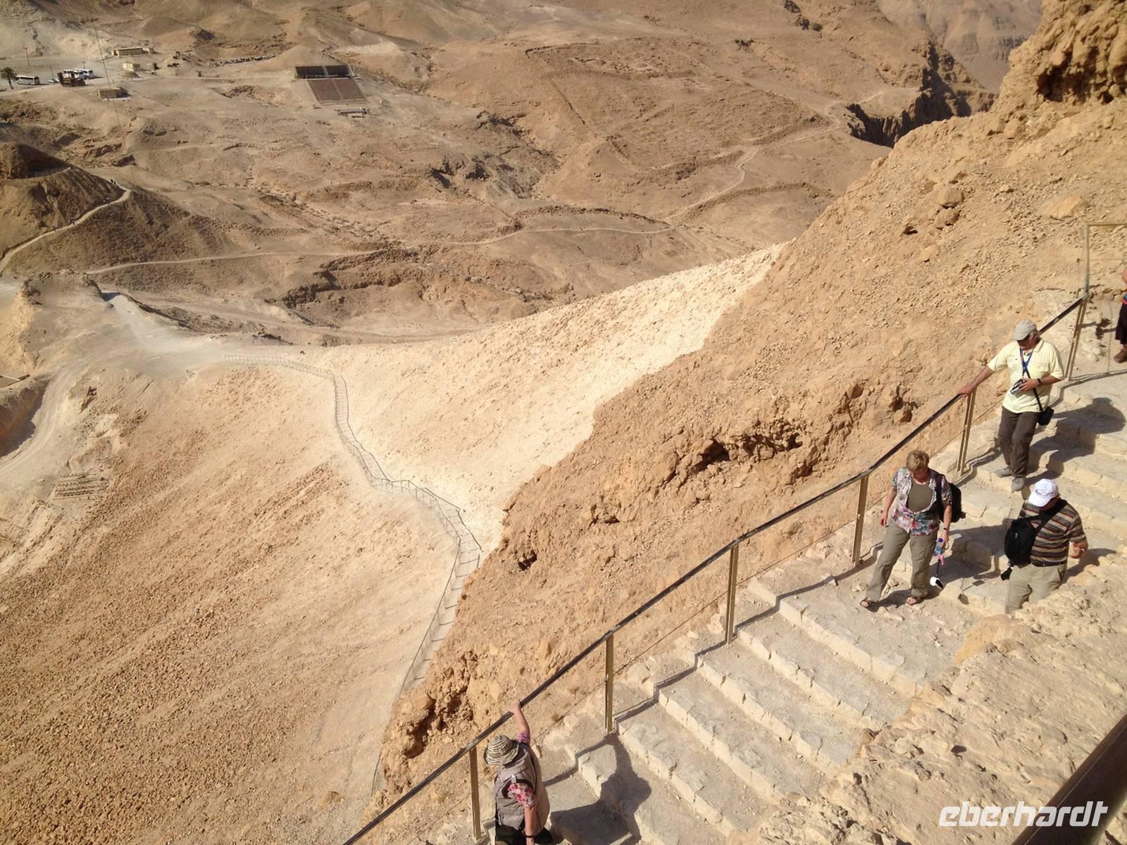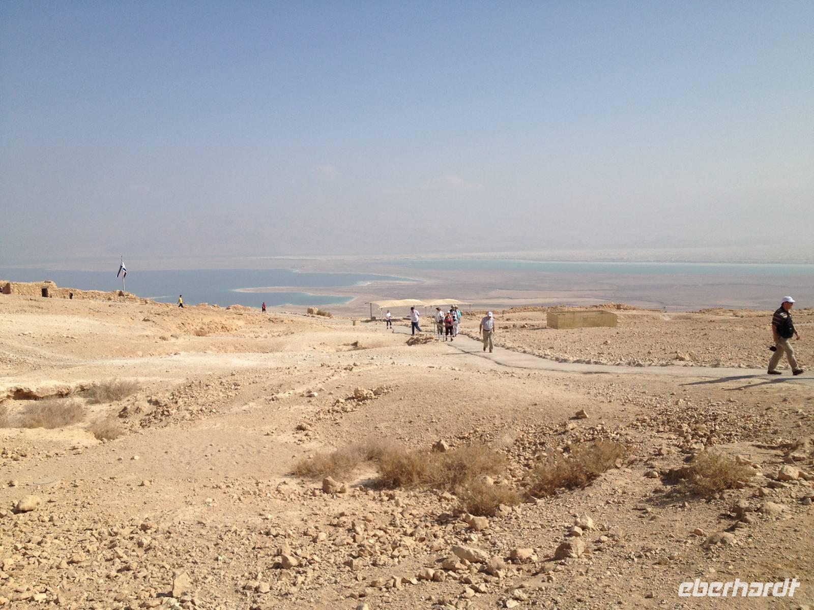Nachdem wir mit der Seilbahn auf das 440 Meter hohe Plateau fuhren, konnten wir uns die Ereignisse, die sich in den Jahren 72 und 73 zutrugen und den Mythos Masada begründen, gleich lebhaft vorstellen. Von hier oben konnte man die ganze Gegend wunderbar überblicken: Ringsum zu Füßen des Bergmassivs sahen wir den Erdwall, der von den Römern als Umzingelung aufgeschüttet wurde. Und wie Perlen auf der Schnur liegen die steinernen Schutzwälle von insgesamt acht Truppenlagern des römischen Statthalters von Judäa, Flavius Silva. Im Westen zeigten sich die zu einer Rampe aufgeschütteten Erdschichten, über die die X. Legion die Festung schließlich stürmte. Und nach unserem Rundgang „stürmten" wir als Eberhardt-Legion die Römische Rampe erneut, um auf der anderen Seite wieder in unseren Bus zu kommen.